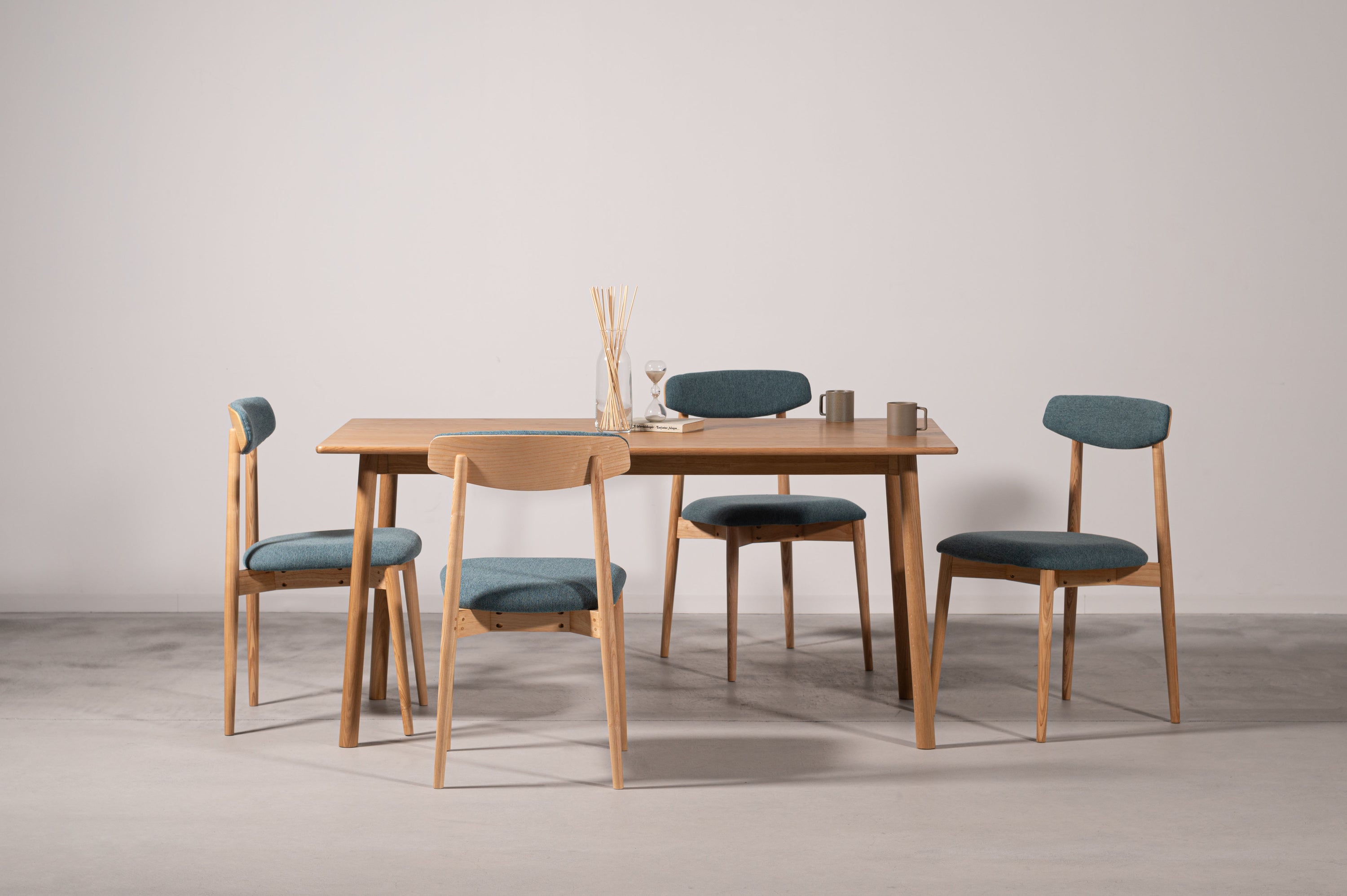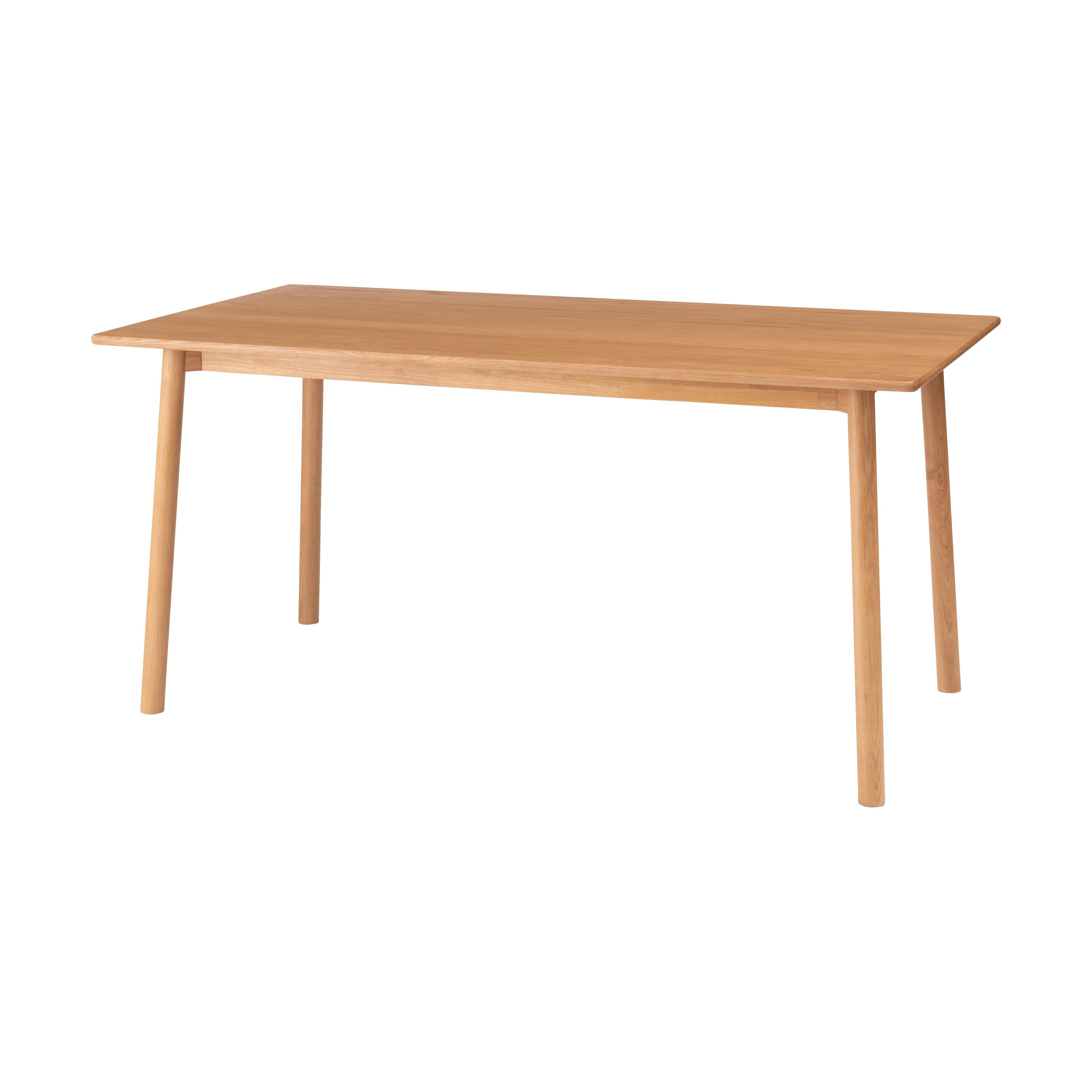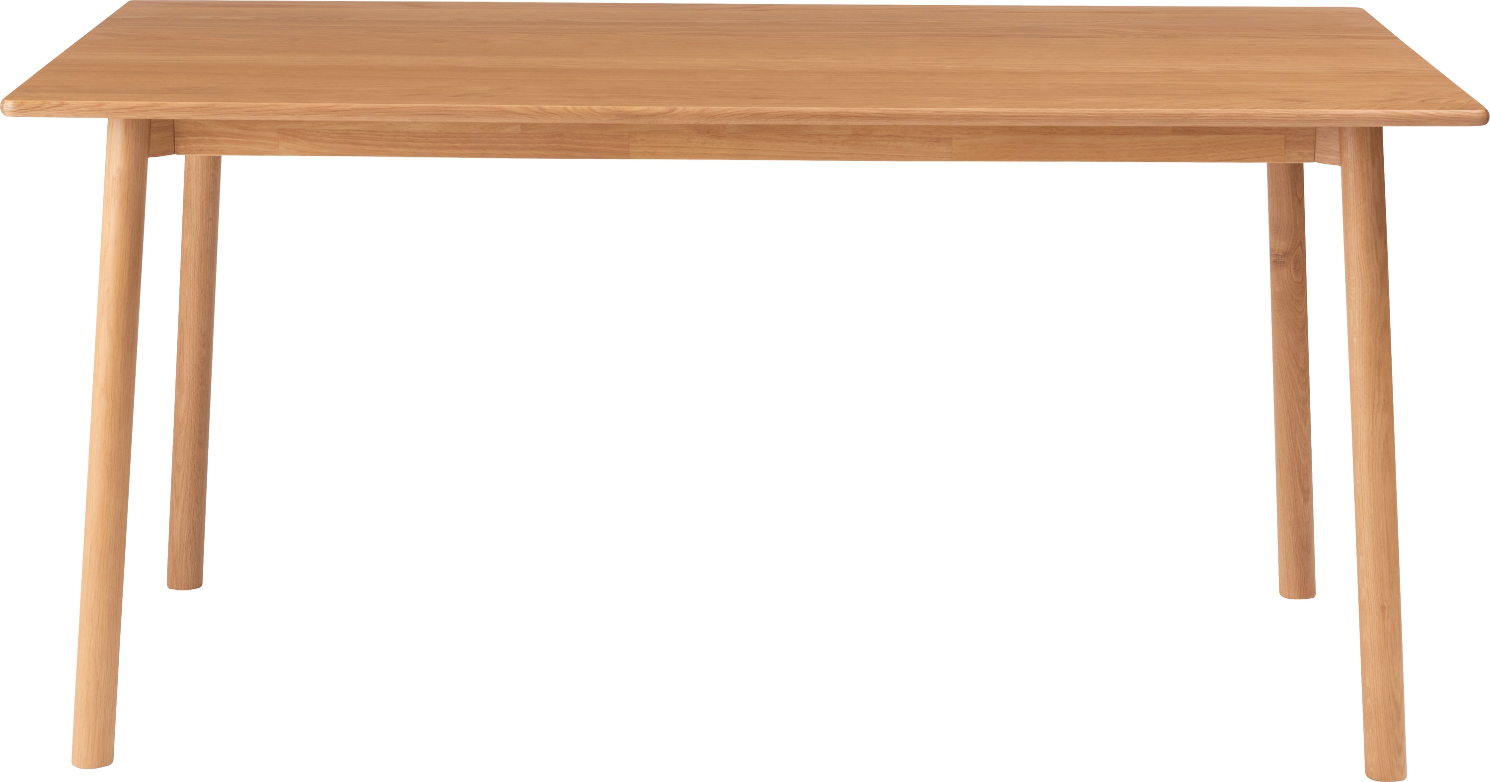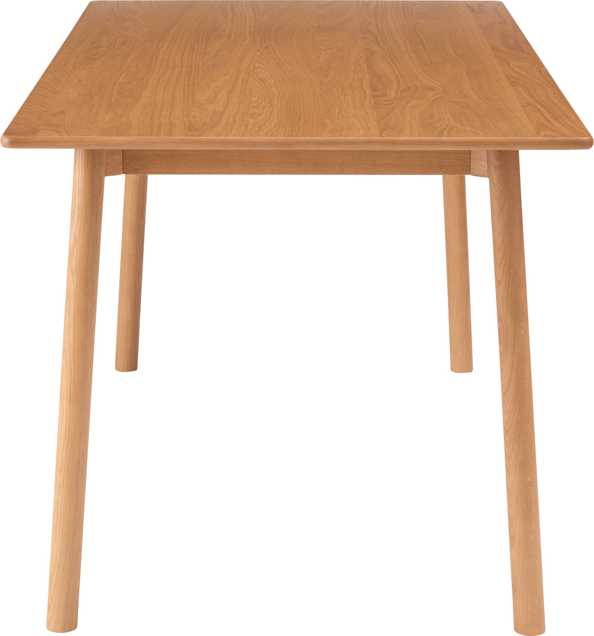 全体的に角をなくし、丸みを帯びたフォルムのダイニングテーブルです。幕板を少し内側に設置し、脚を外側に出すことで、すっきりとした印象と脚間を広く確保できるデザインになっています。少し角をつけて八の字に設計された脚は、垂直脚と比べ、ぐらつきを抑え安定した使い心地を実感することができます。