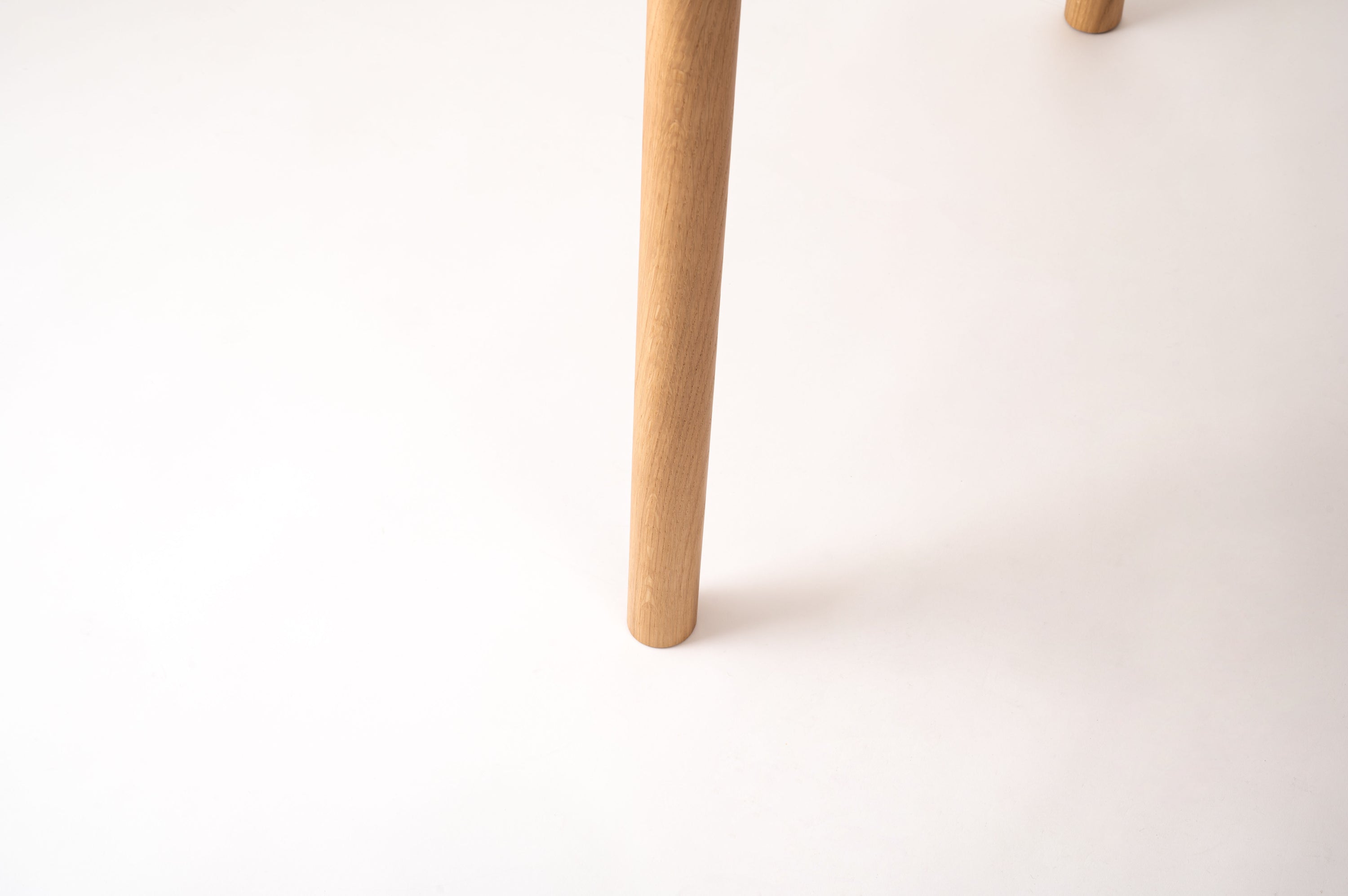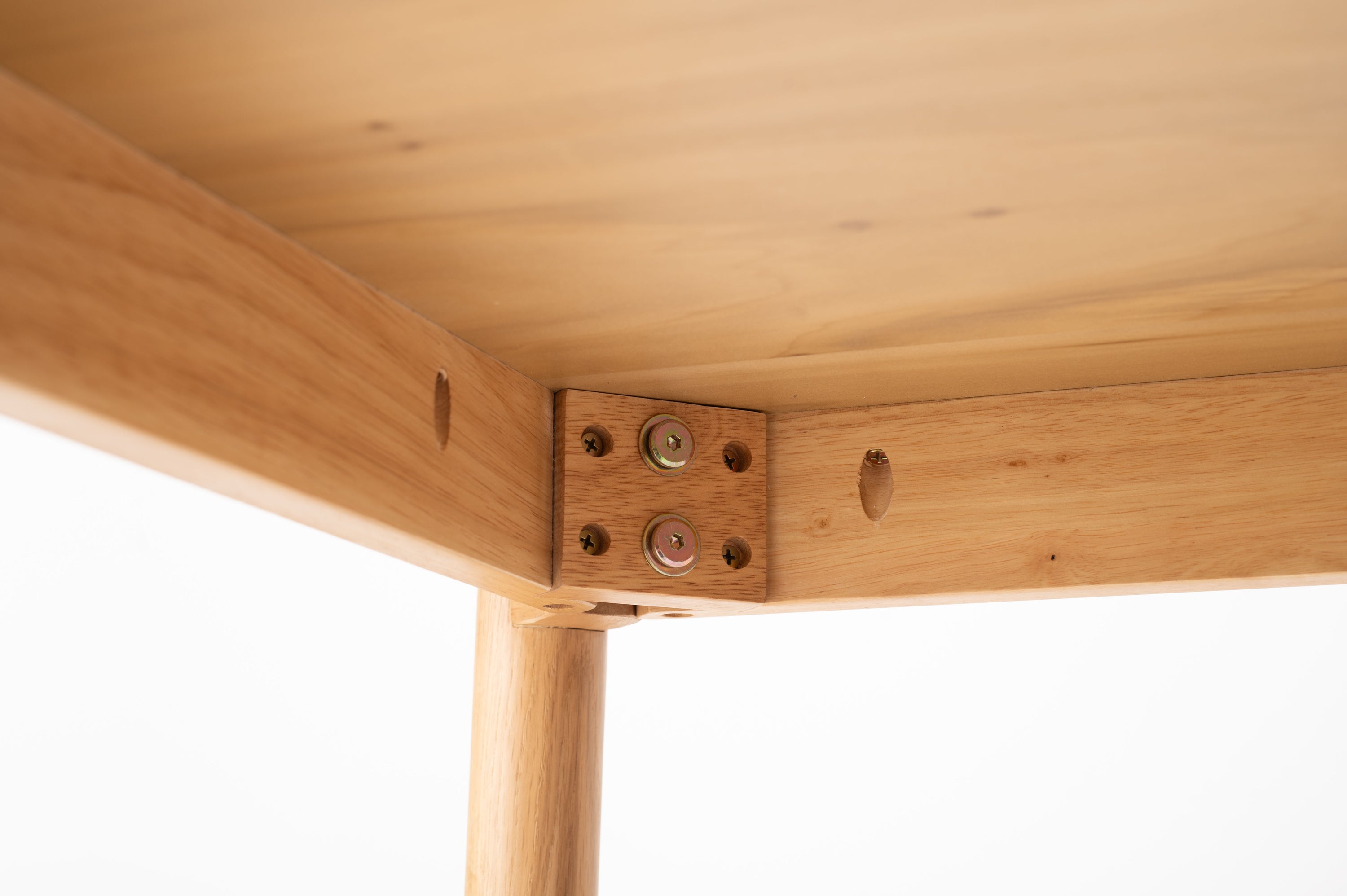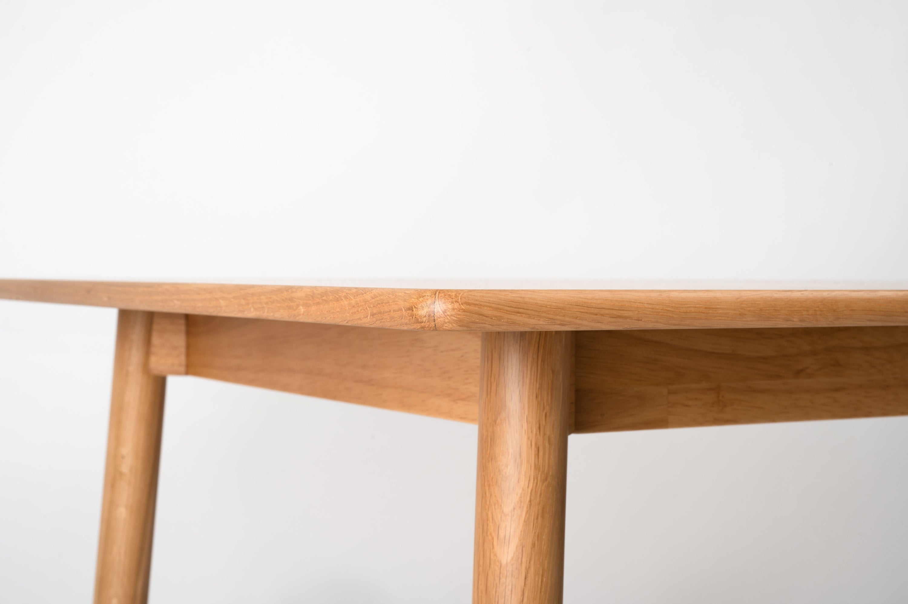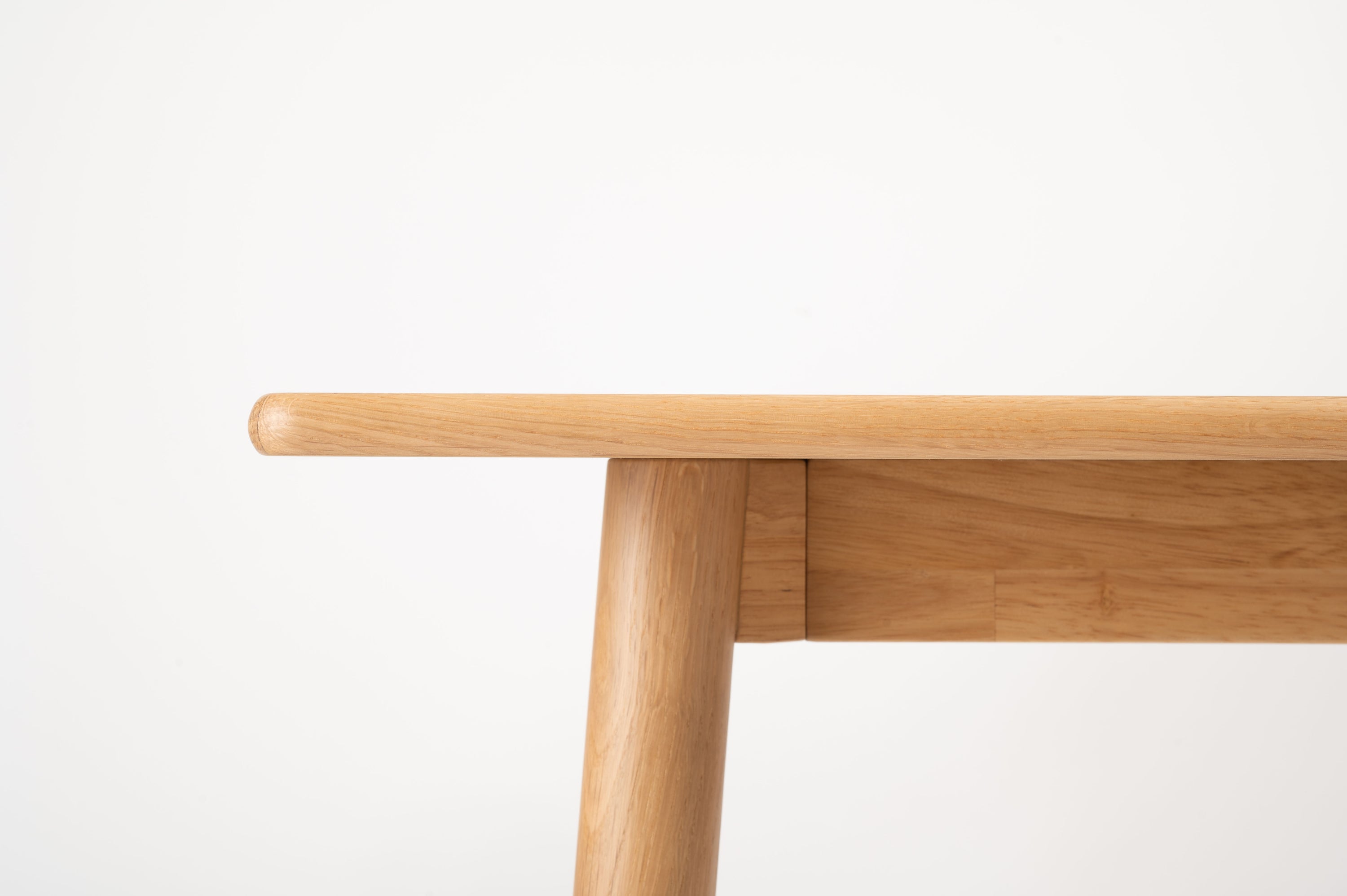 全体的に角をなくし、丸みを帯びたフォルムのダイニングテーブルです。幕板を少し内側に設置し、脚を外側に出すことで、すっきりとした印象と脚間を広く確保できるデザインになっています。少し角をつけて八の字に設計された脚は、垂直脚と比べ、ぐらつきを抑え安定した使い心地を実感することができます。