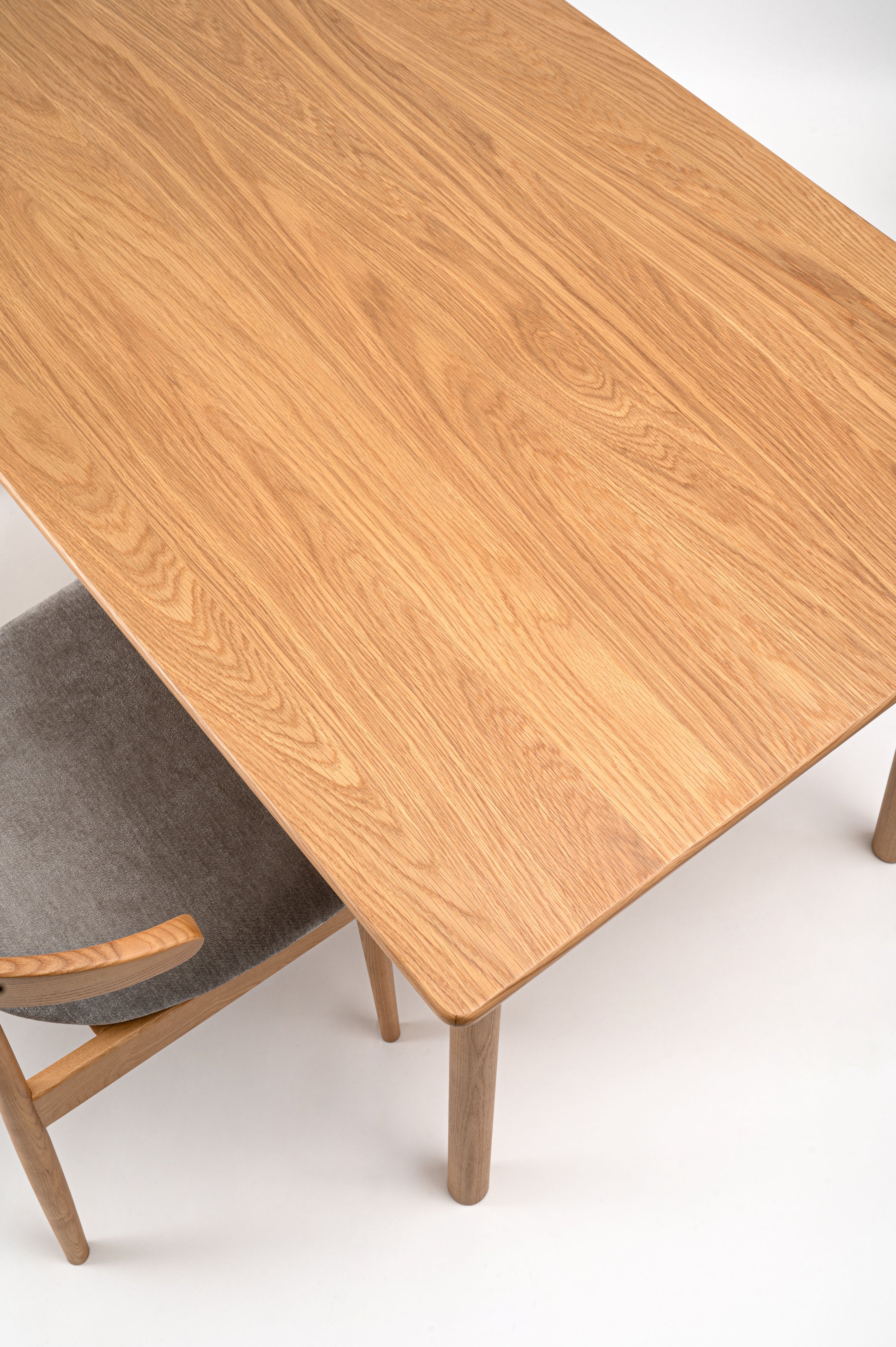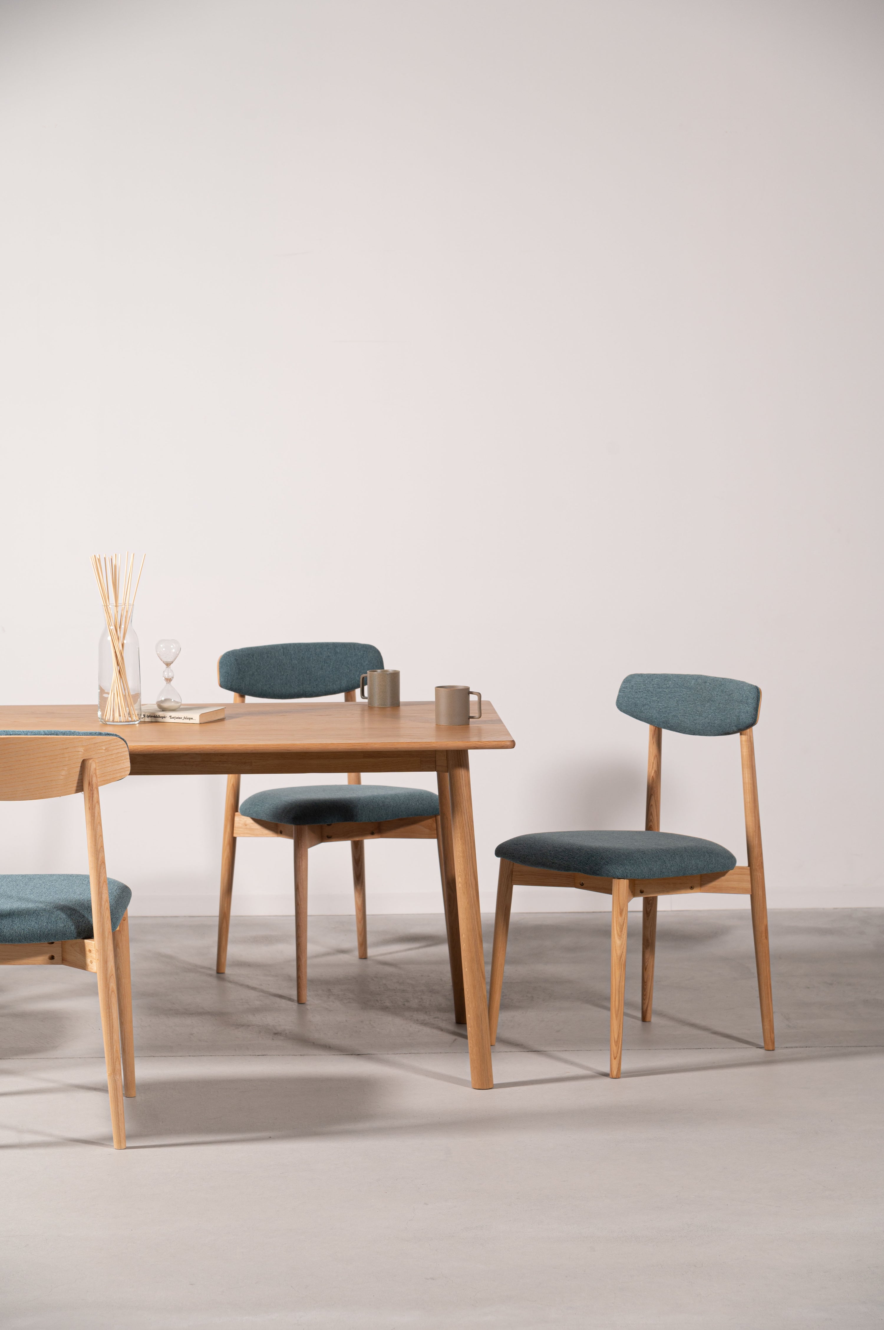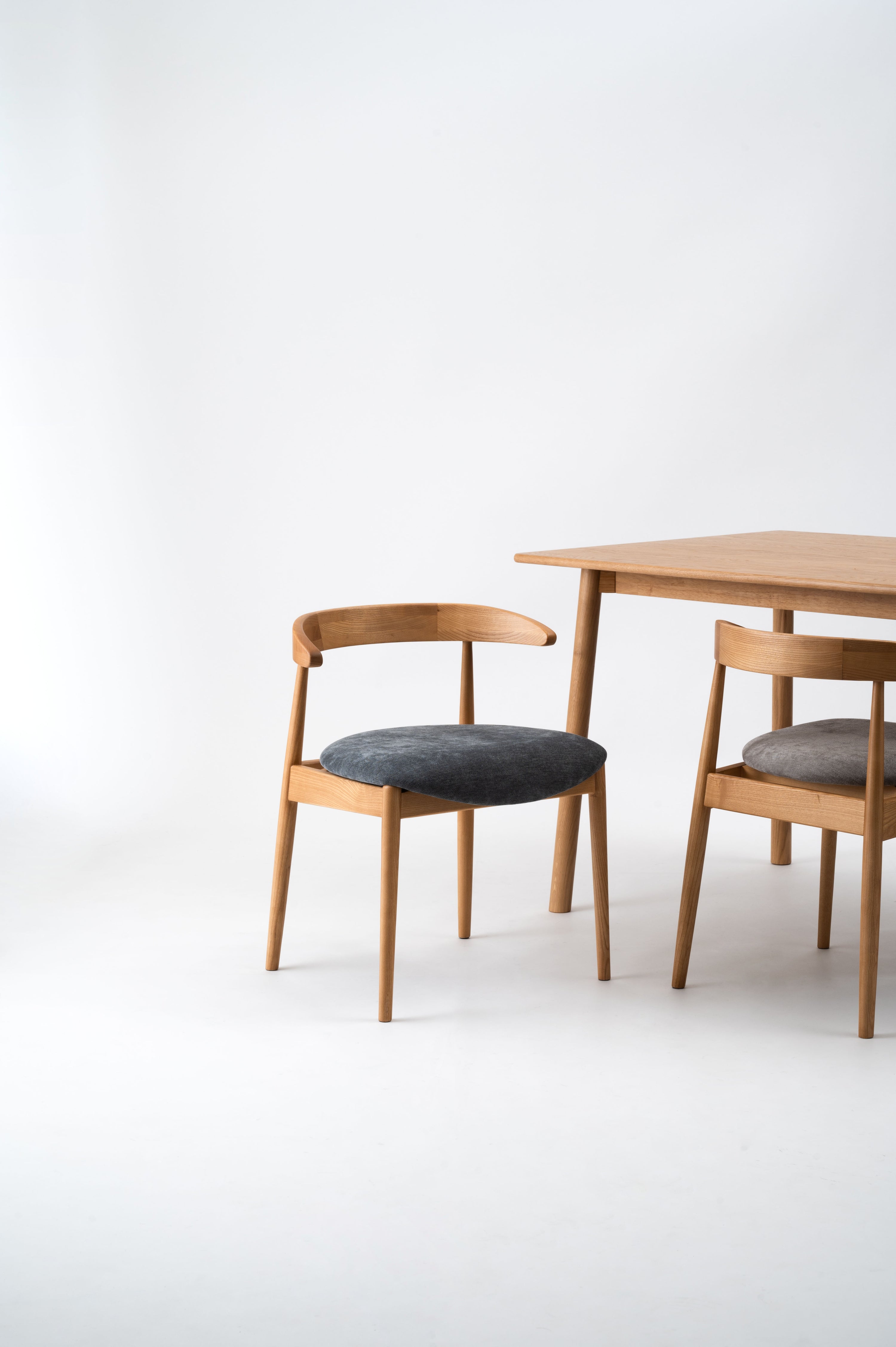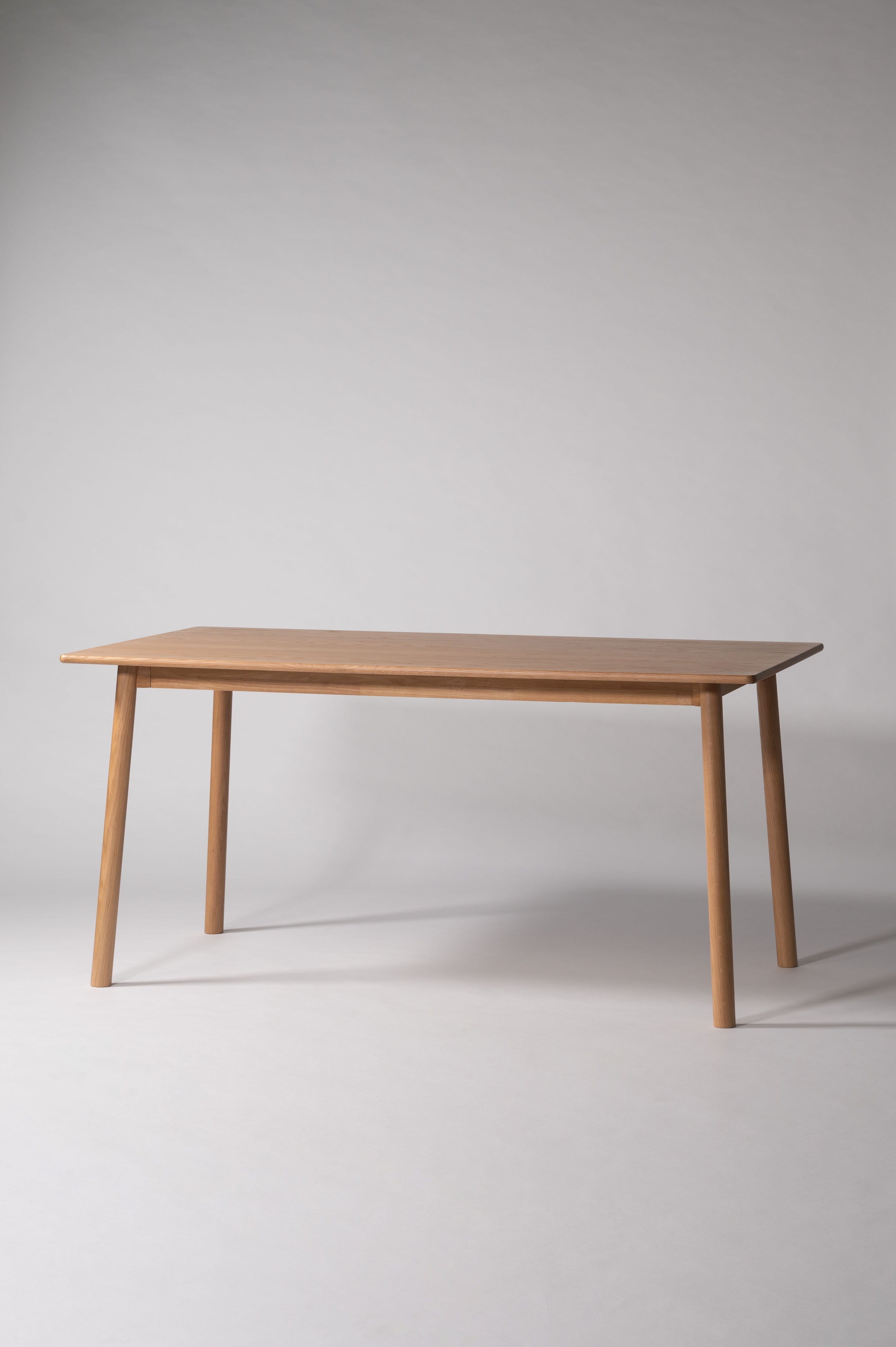 全体的に角をなくし、丸みを帯びたフォルムのダイニングテーブルです。幕板を少し内側に設置し、脚を外側に出すことで、すっきりとした印象と脚間を広く確保できるデザインになっています。少し角をつけて八の字に設計された脚は、垂直脚と比べ、ぐらつきを抑え安定した使い心地を実感することができます。