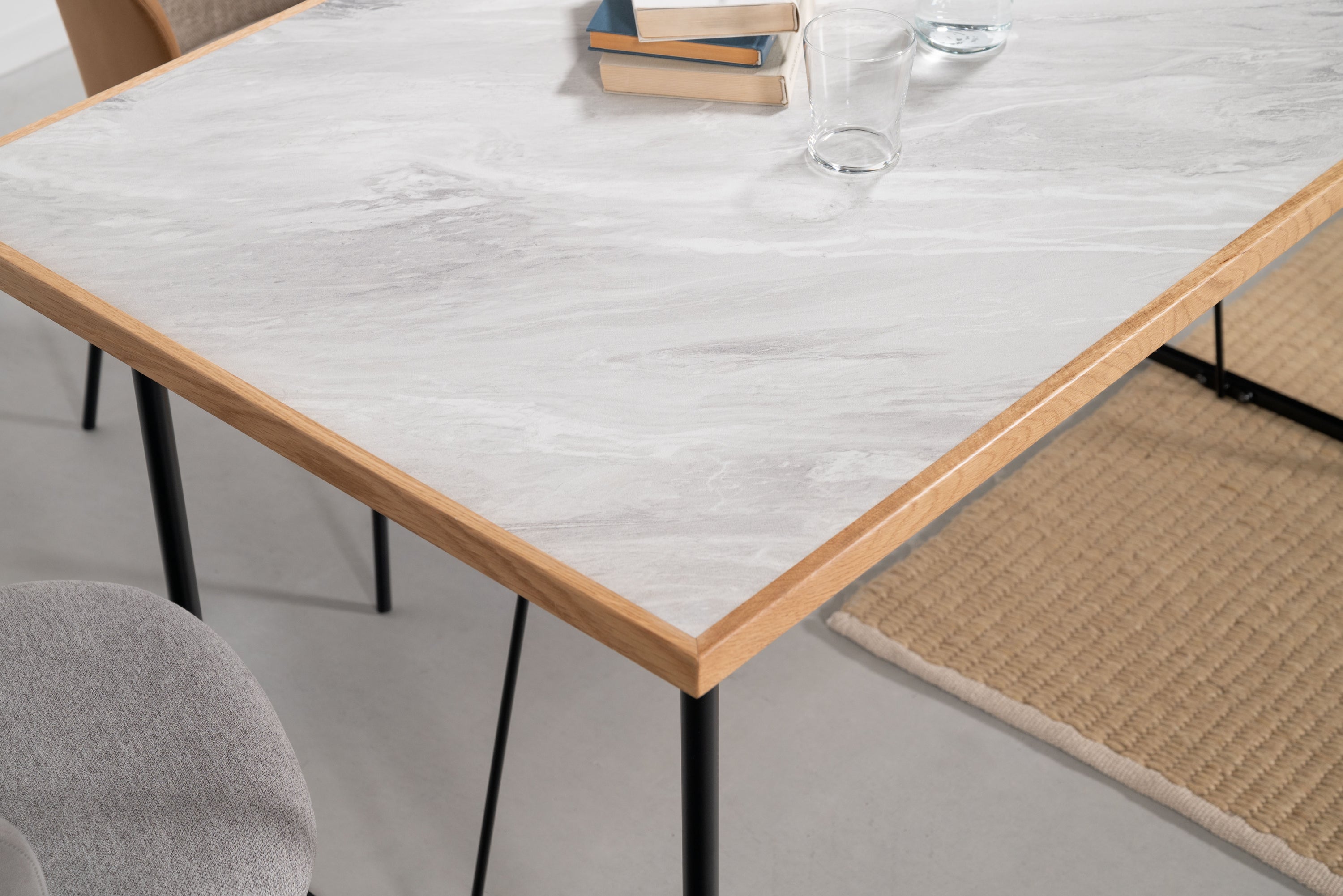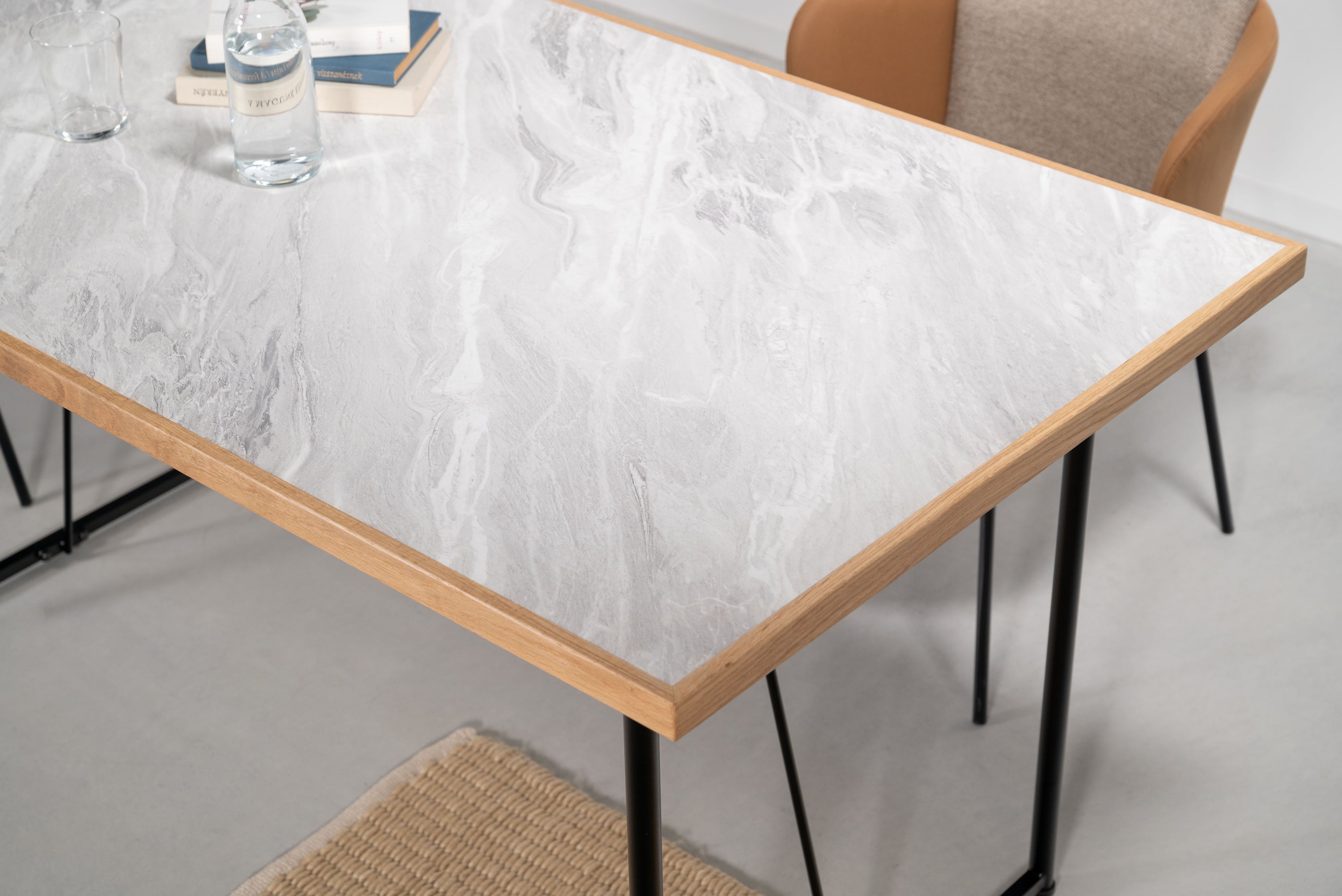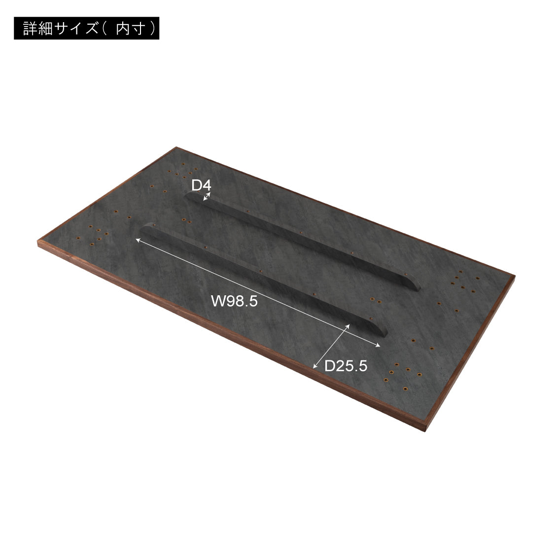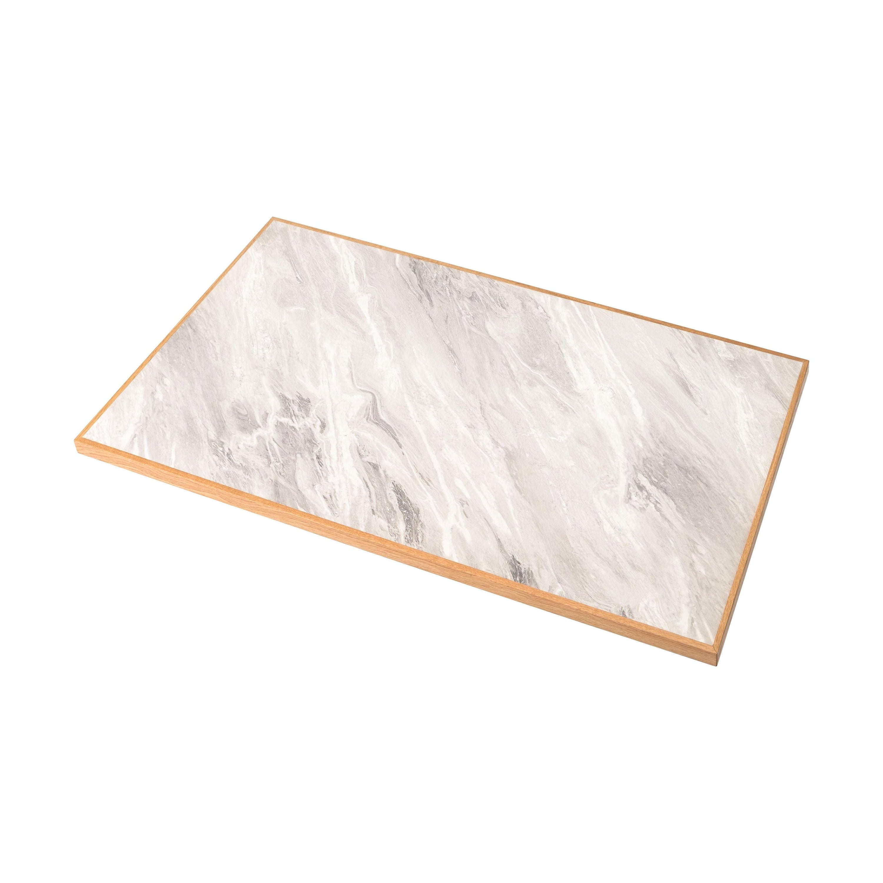 石目調のデザインを施した、シンプルでモダンな雰囲気の天板です。素材には、傷や汚れに強いメラミン化粧繊維板を採用しています。更に、オーク材で周りを縁取る事で、デザイン性が高まりスタイリッシュな雰囲気を演出しています。別売りの商品脚と合わせてカスタマイズをお楽しみください。
