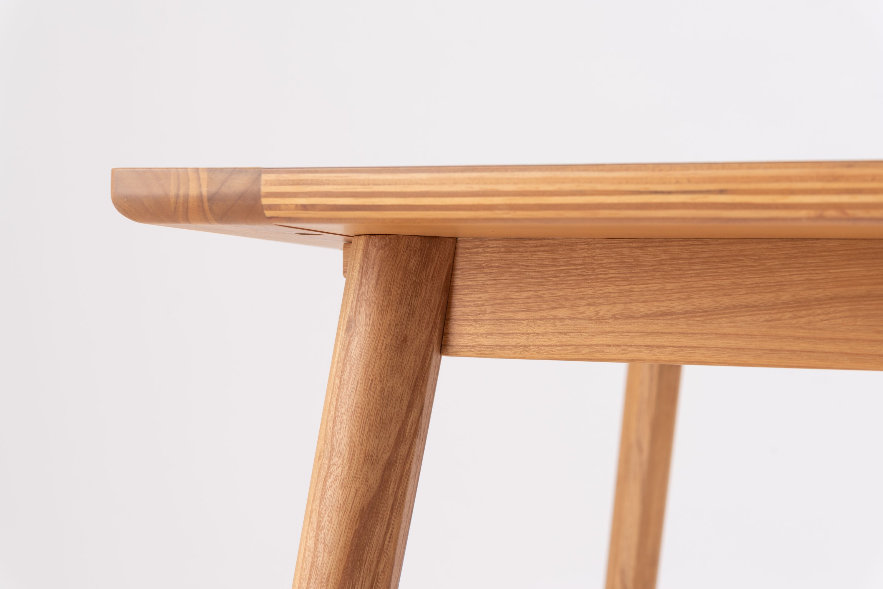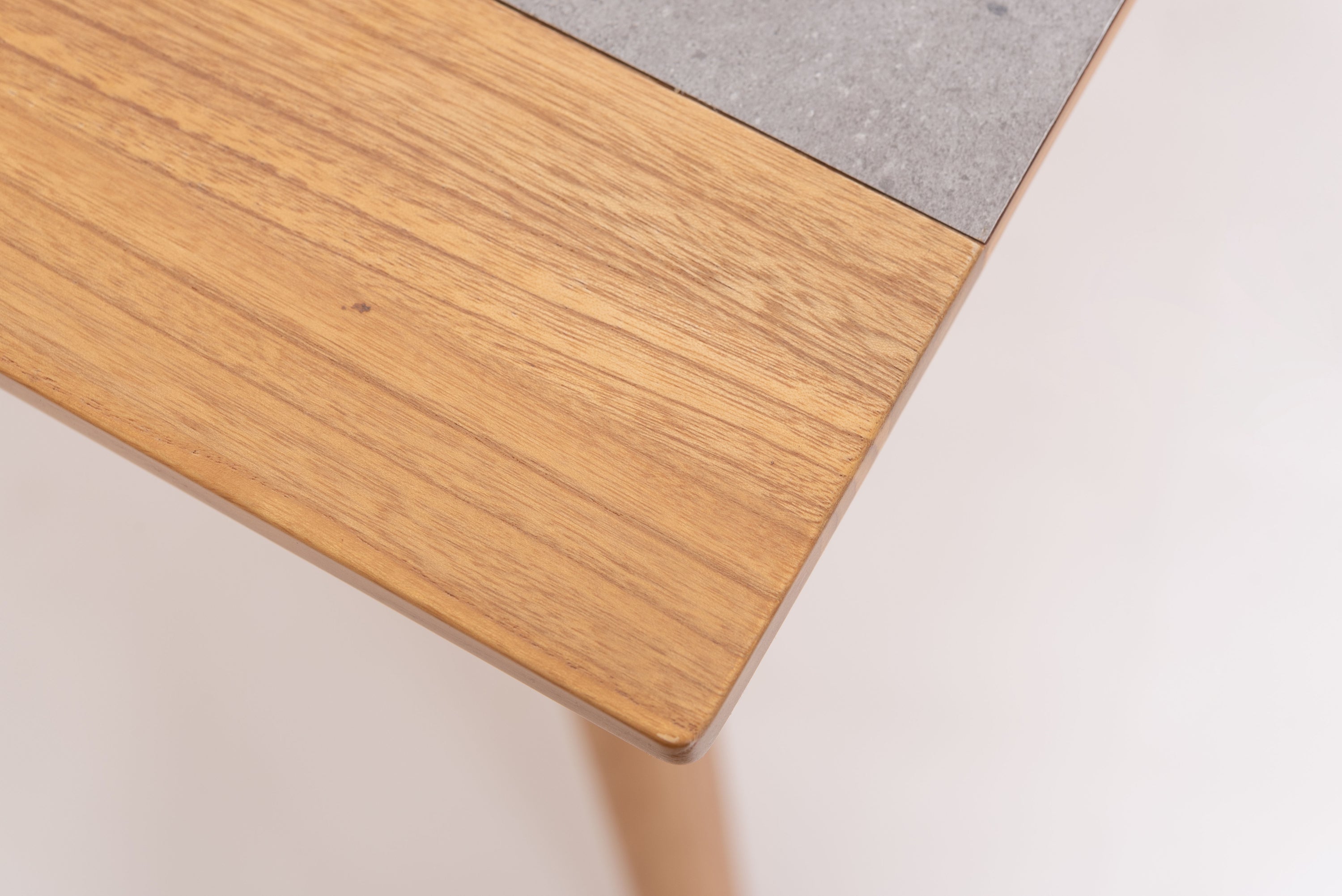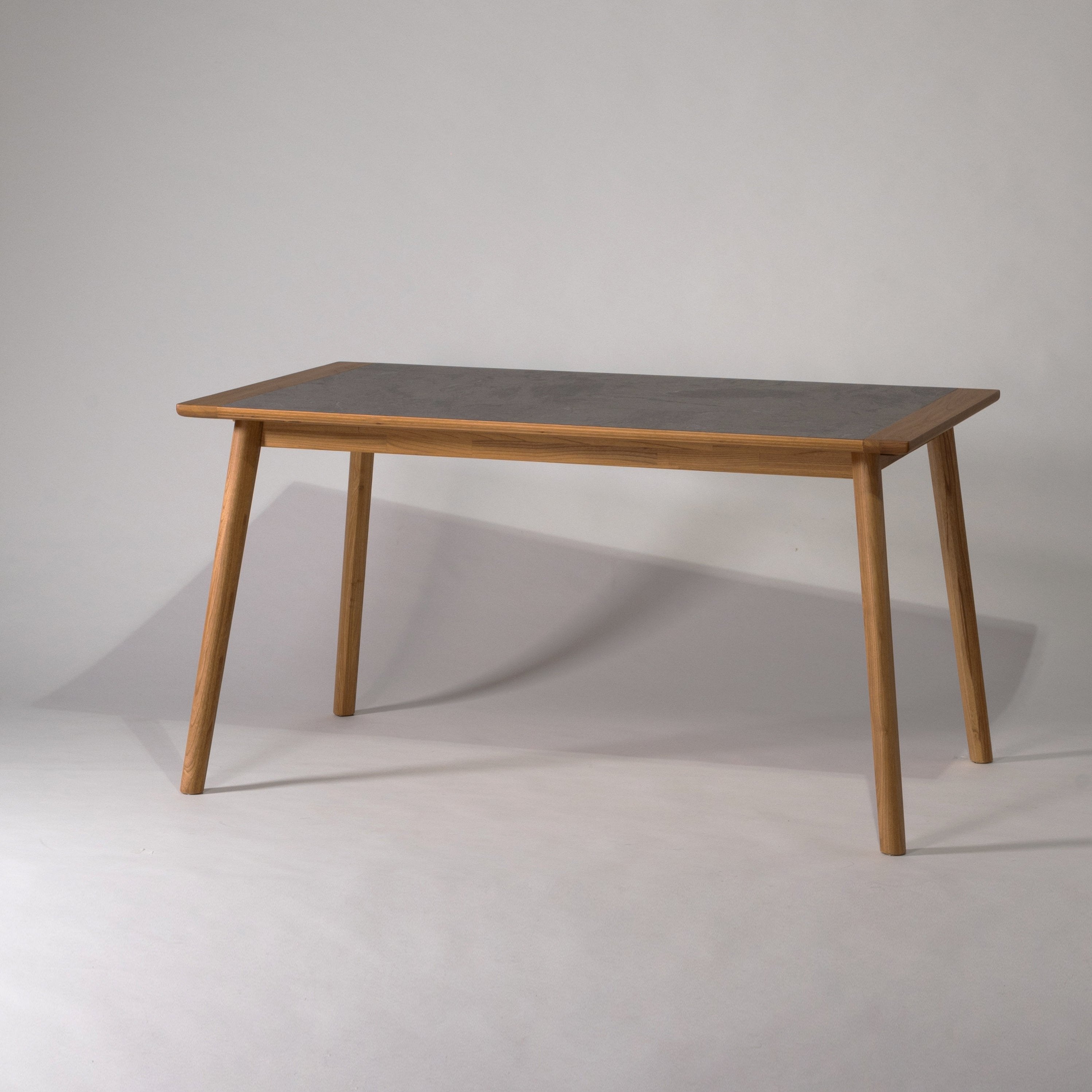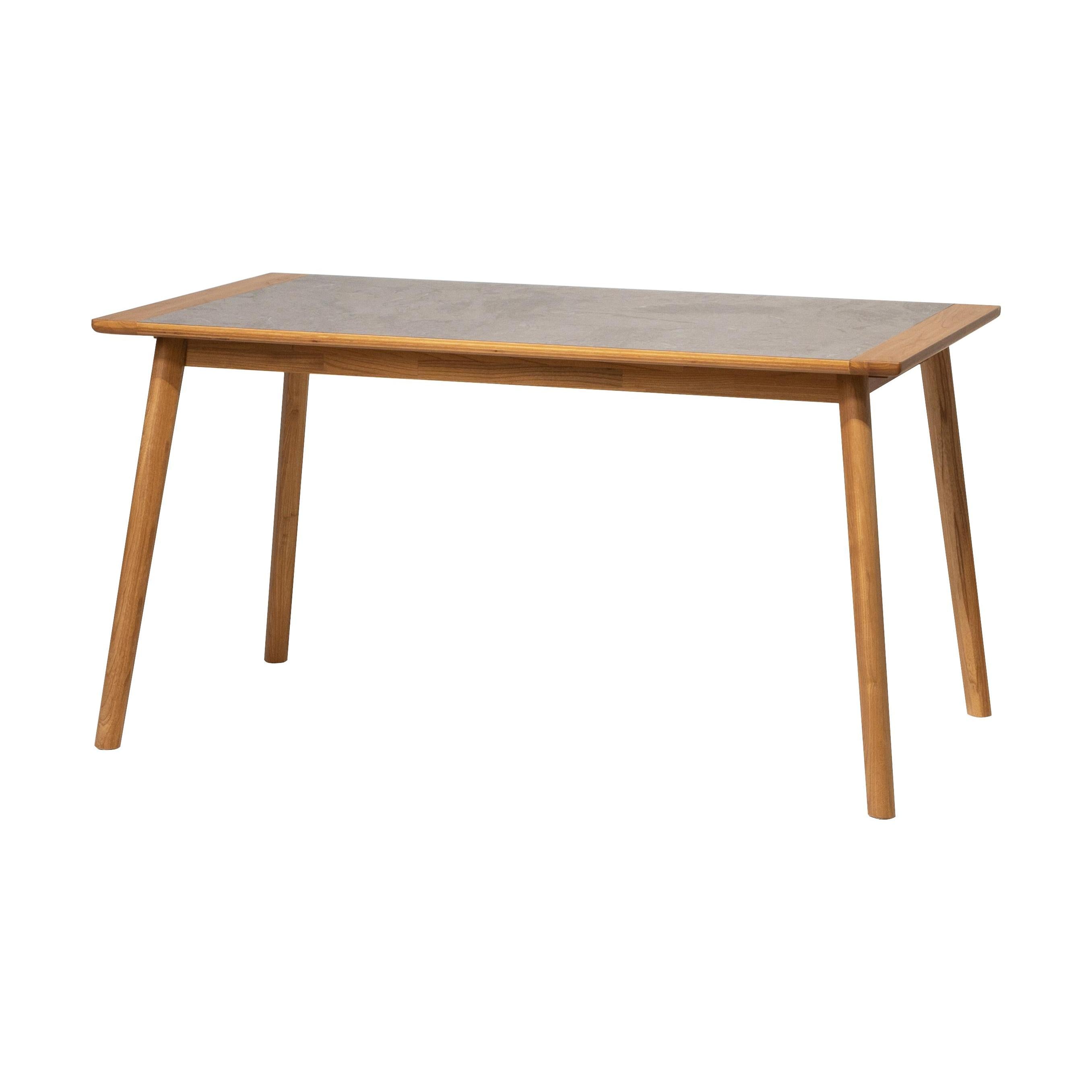 モルタル調の天板に、淡褐色できれいな木目が特徴のスンカイ材を組み合わせたシンプルなフォルムのダイニングテーブルです。長方形タイプは天板の両端にも木材を施し、シンプルながらデザインにもこだわっています。幕板を少し内側に設置し脚を外側に出すことですっきりした印象になり、また脚間を広く確保できています。