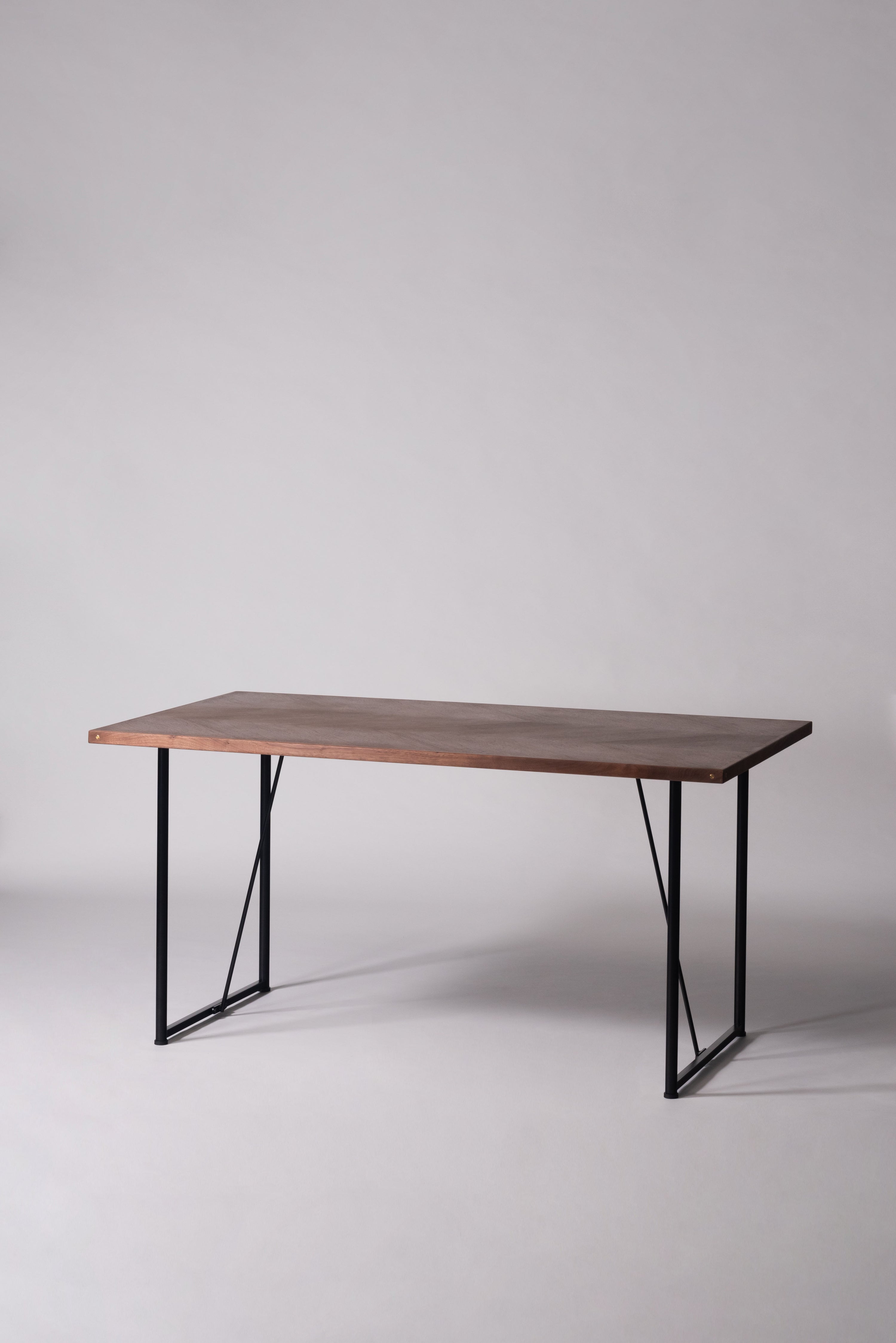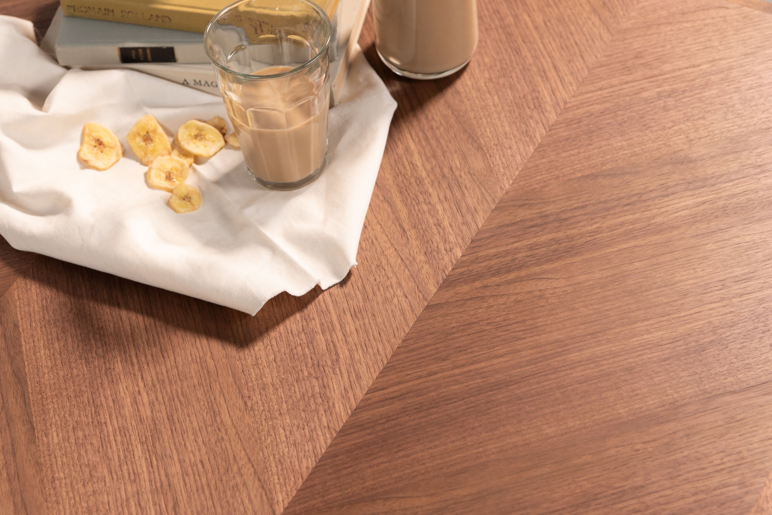 木目の向きを変えて貼り合わせた矢張りデザインが特徴できなテーブル天板です。側面に施した真鍮がアクセントになっています。さまざまなテイストに合わせやすいナチュラルとブラウンの2色展開です。別売りの脚と組み合わせてカスタマイズできます。