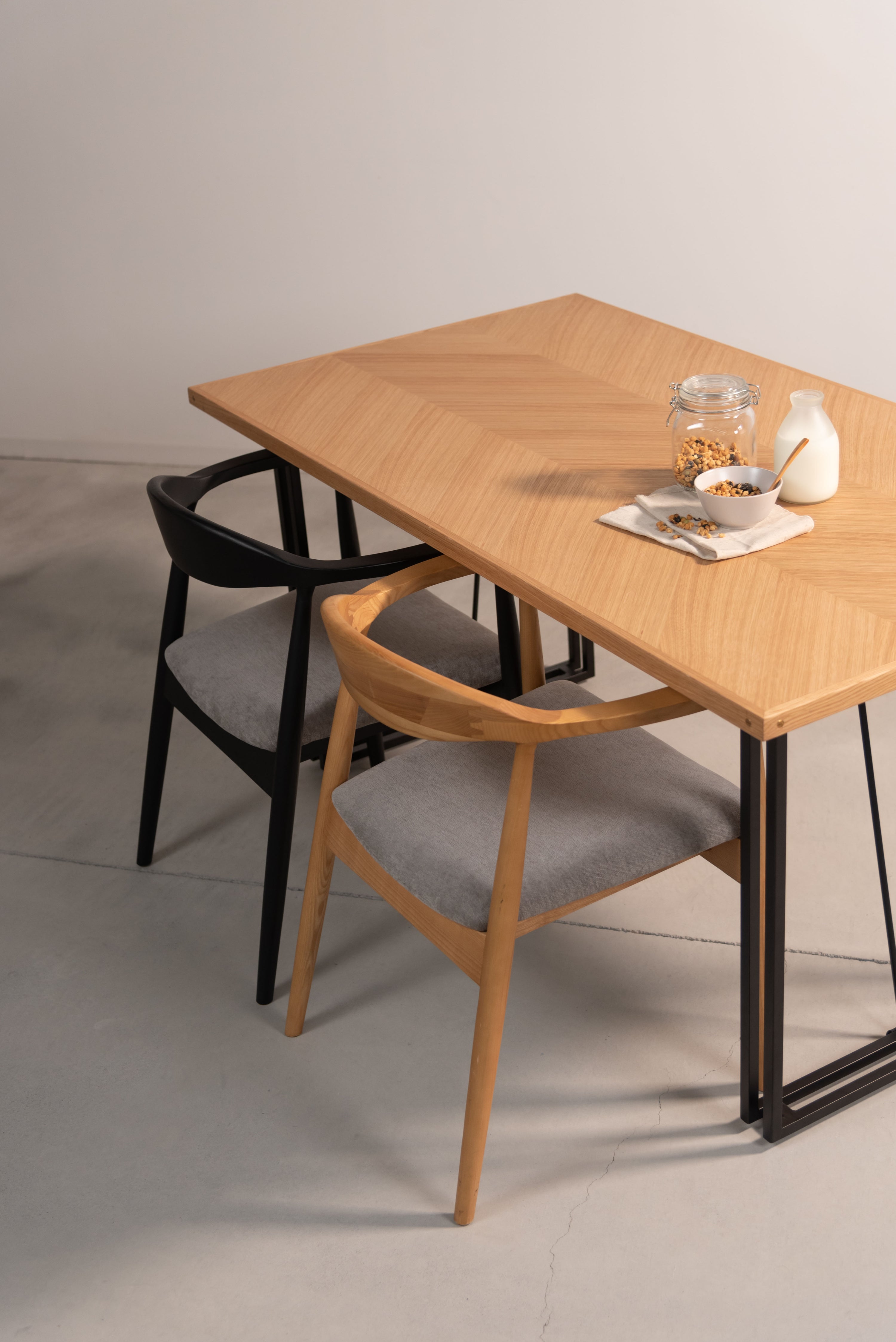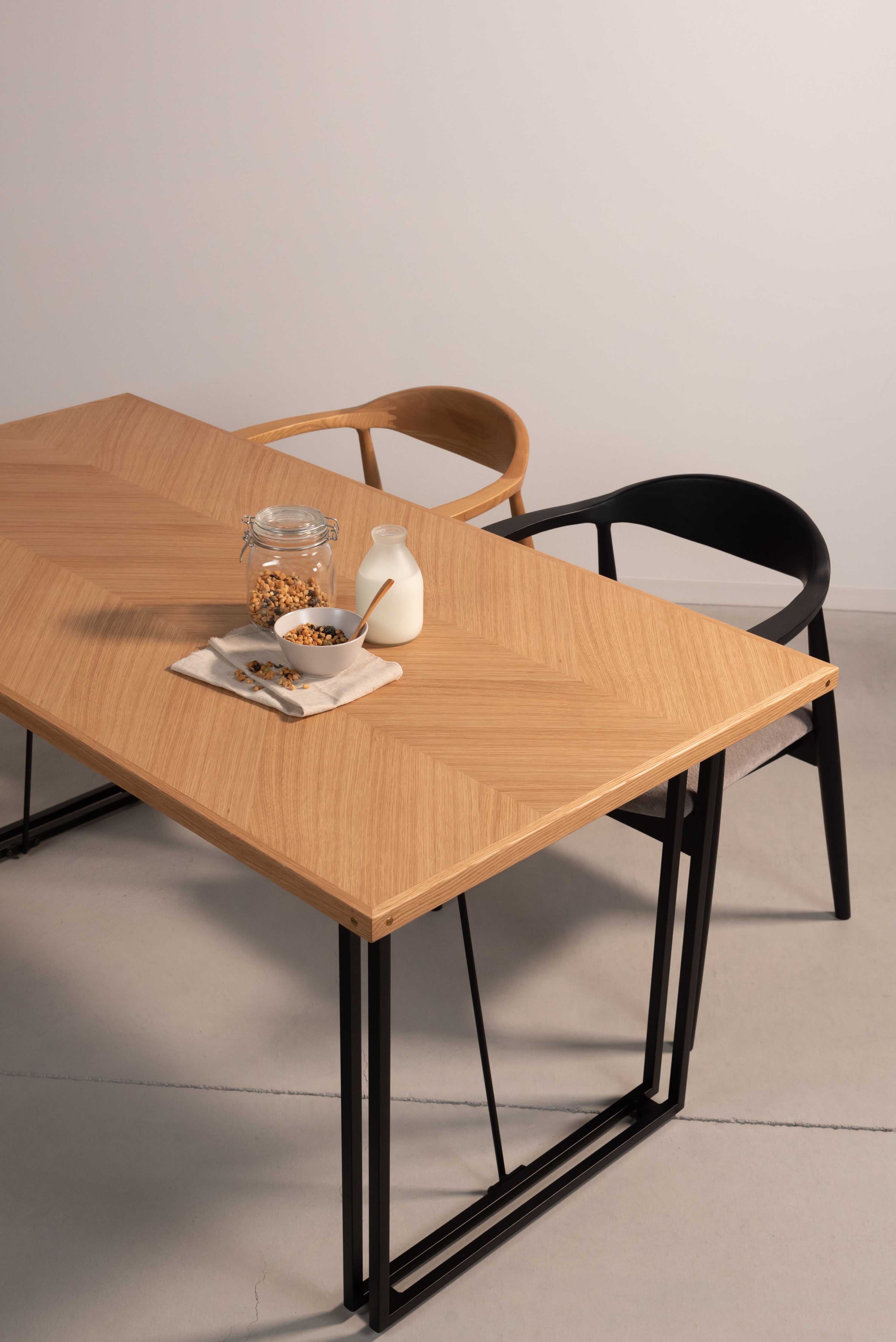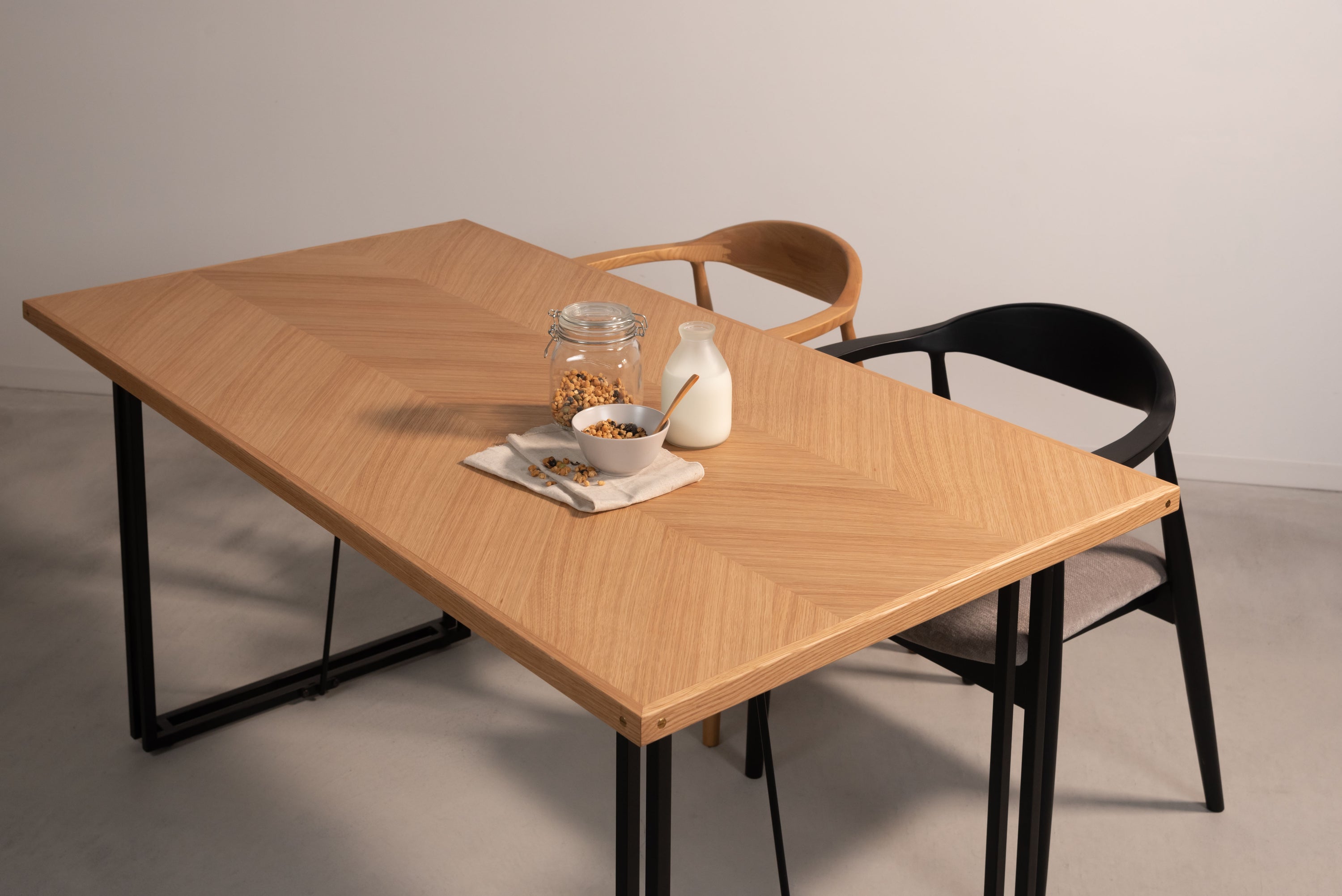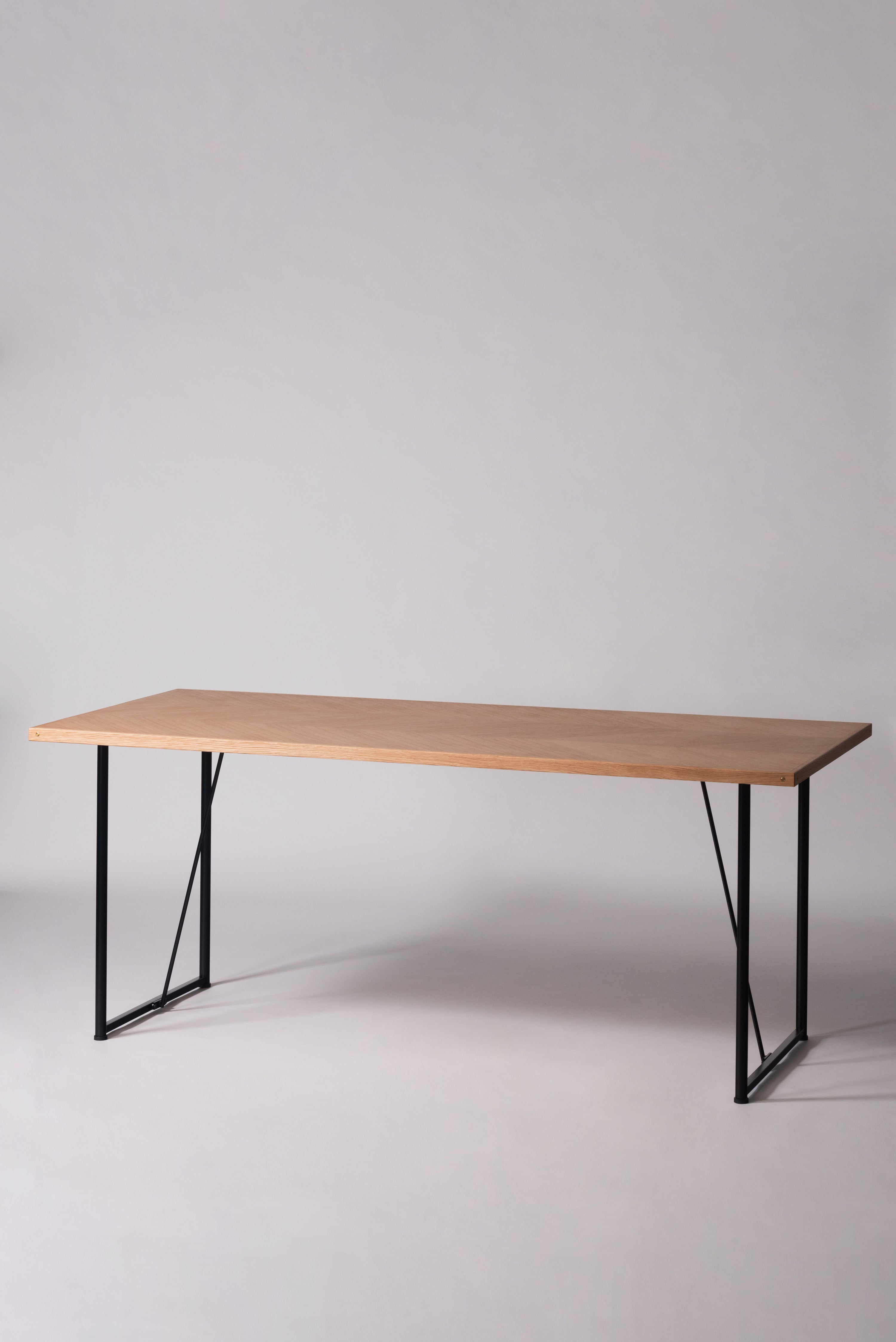 木目の向きを変えて貼り合わせた矢張りデザインが特徴できなテーブル天板です。側面に施した真鍮がアクセントになっています。さまざまなテイストに合わせやすいナチュラルとブラウンの2色展開です。別売りの脚と組み合わせてカスタマイズできます。