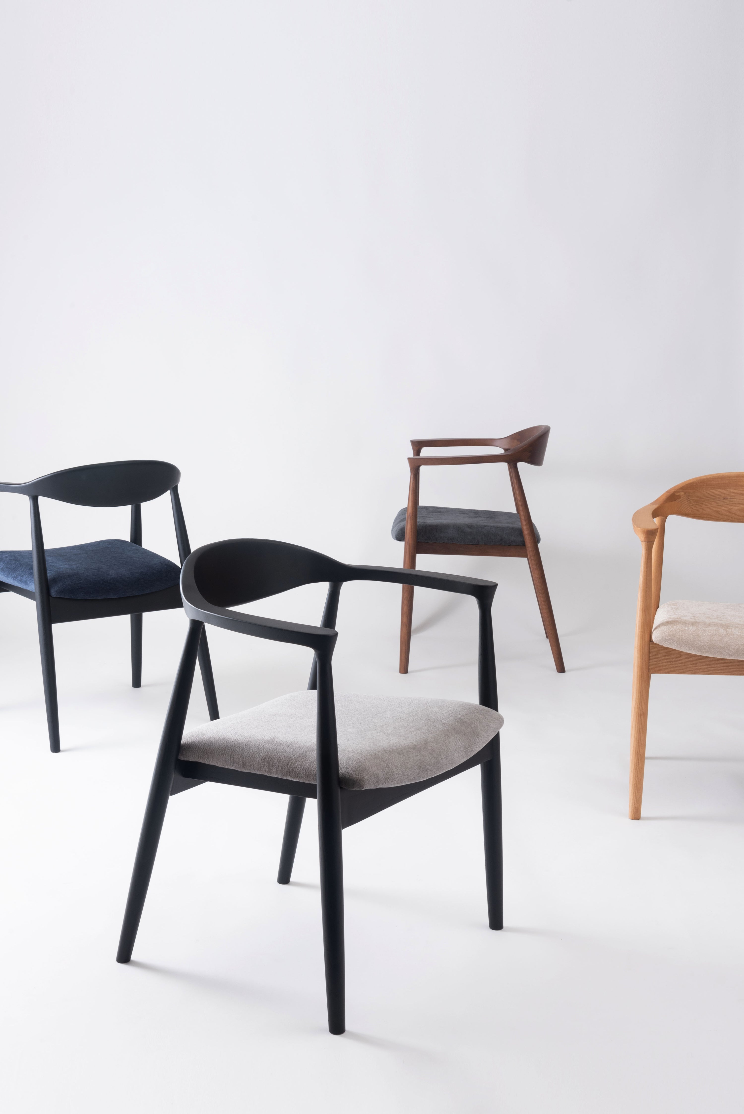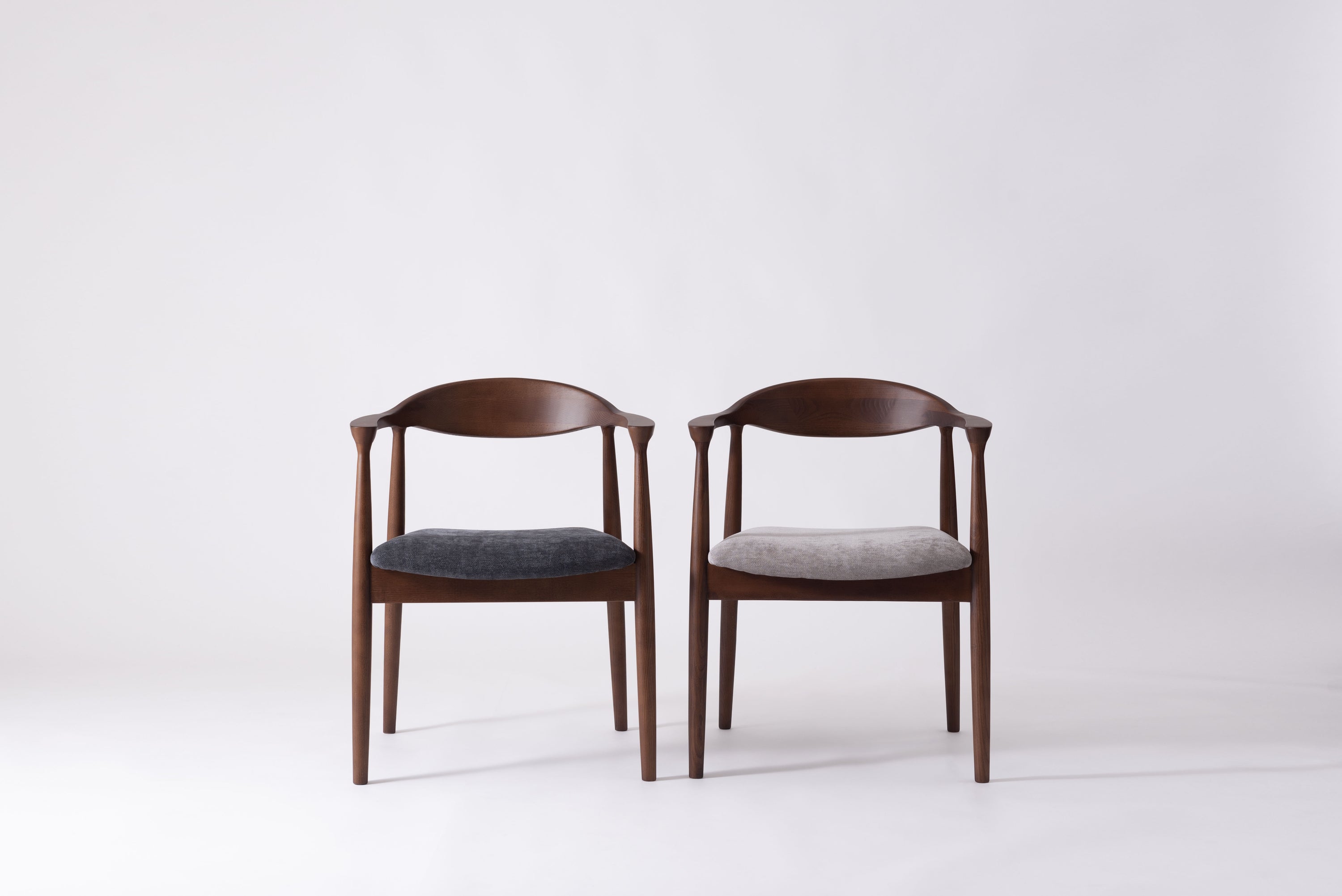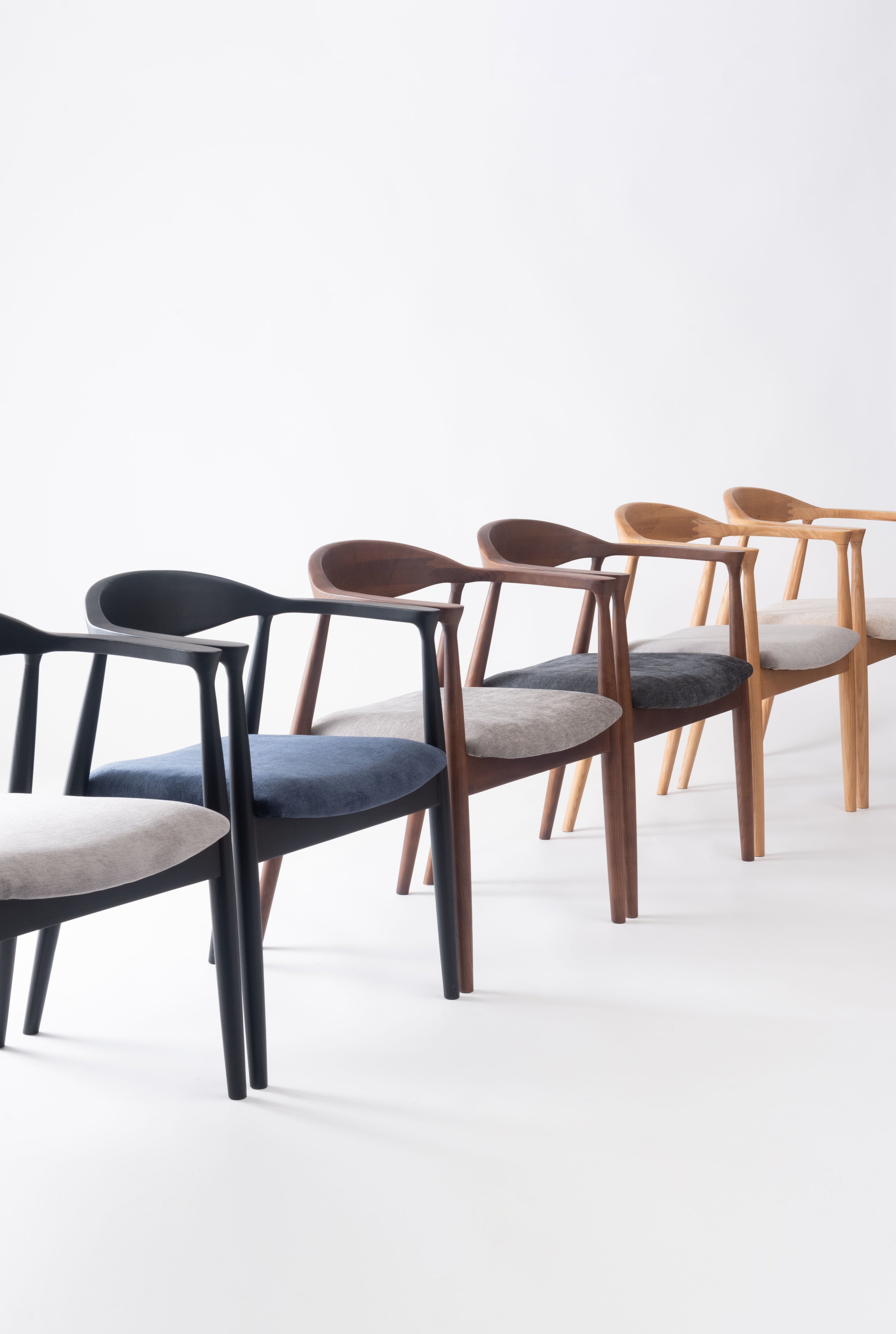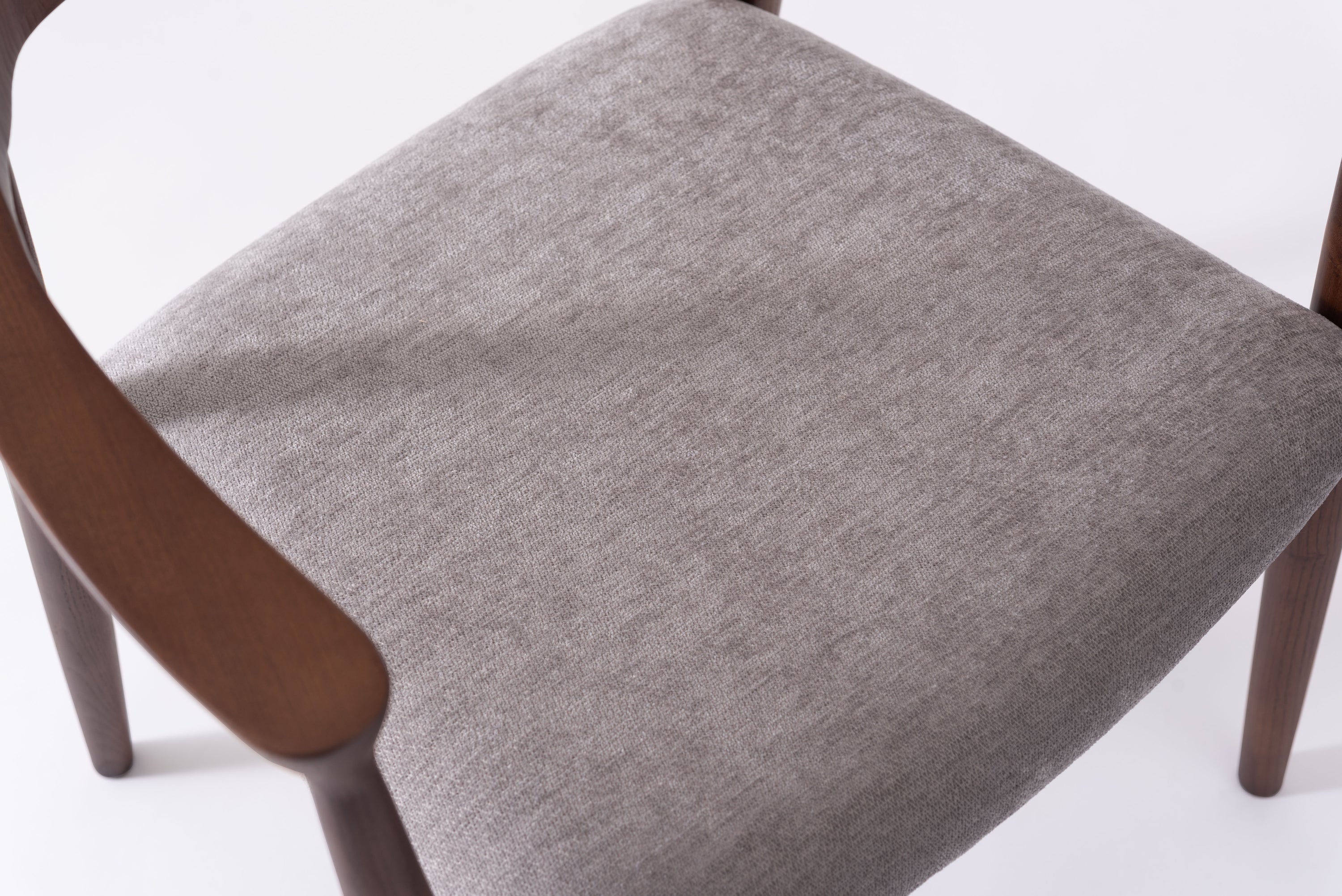背面とアームが美しいアーチを描き、丸みを帯びたフォルムが特徴のチェアです。天然木のあたたかみとファブリックのディテールが相まって、優しい印象を与えてくれます。座面は混色生地で絶妙な色合いが唯一無二でダイニングテーブルと合わせても、一脚でお部屋のアクセントにしても、その存在感を感じられます。