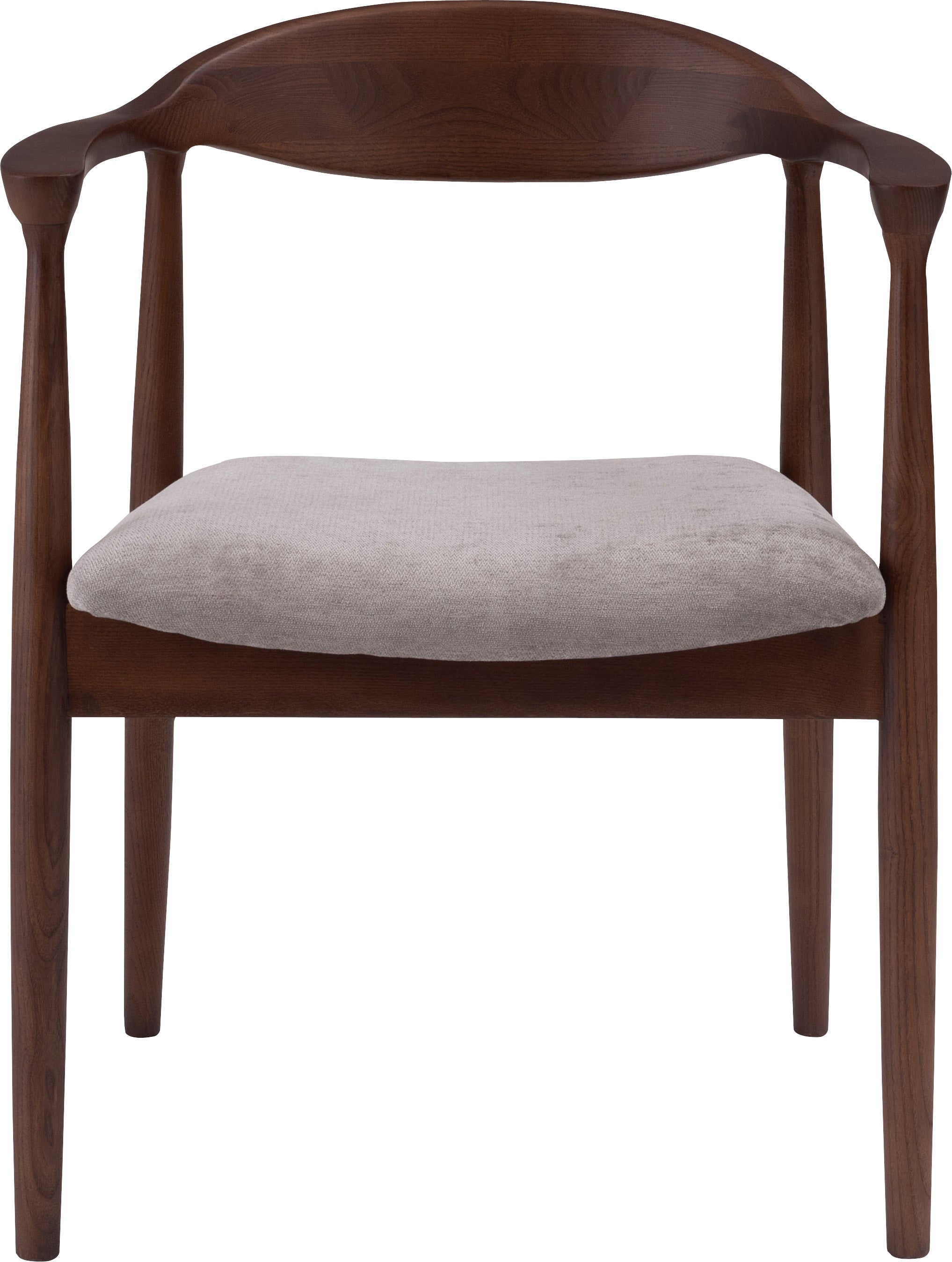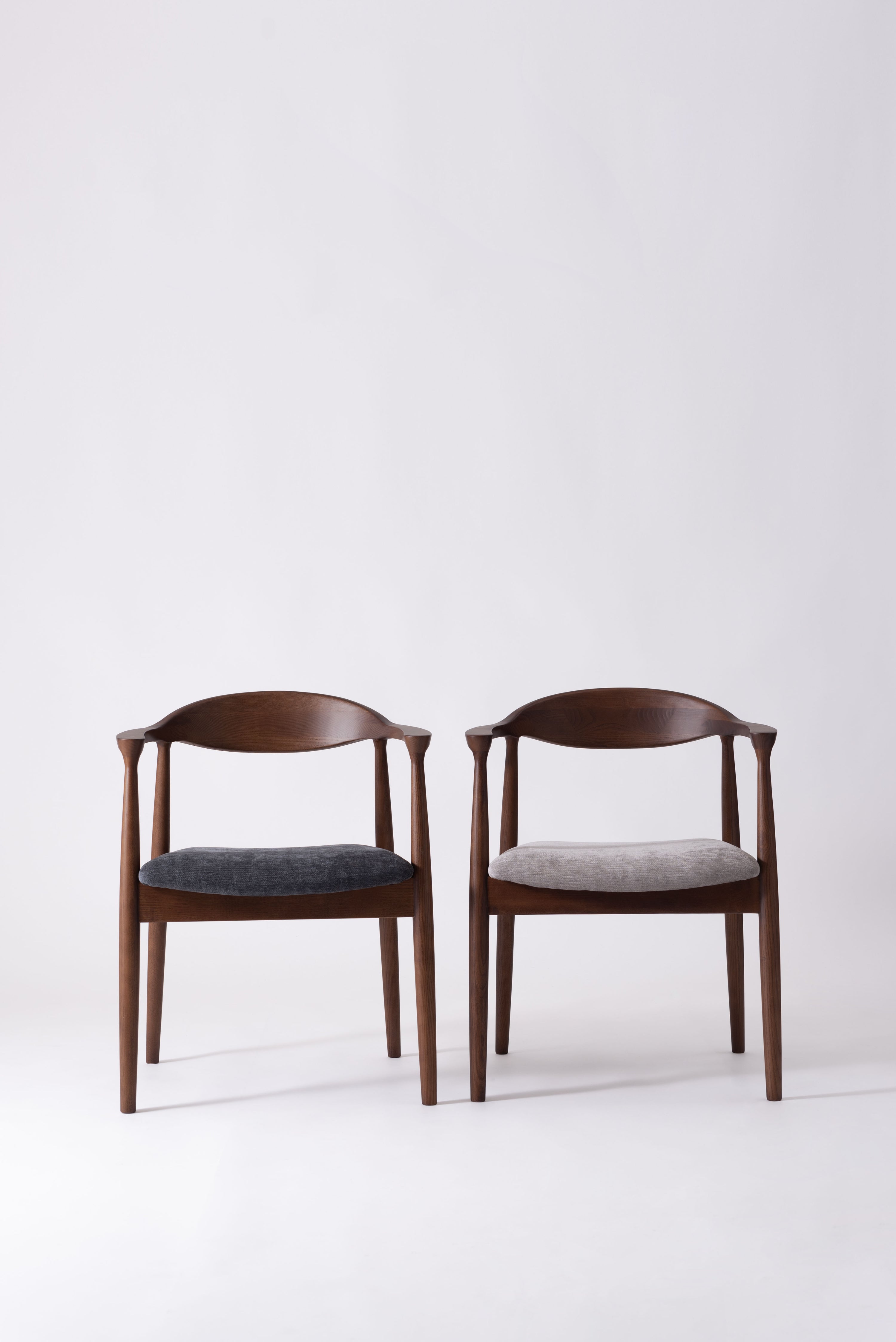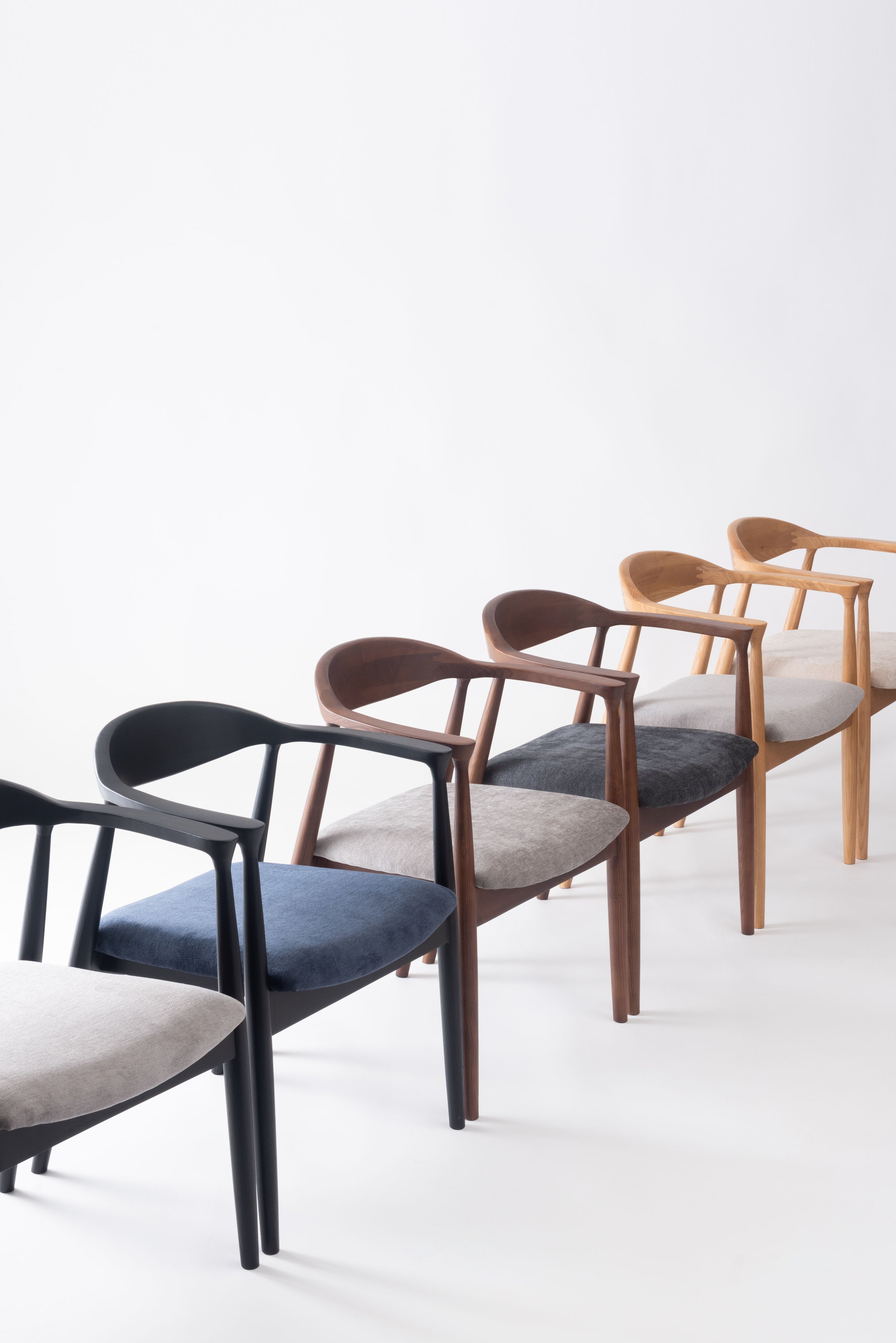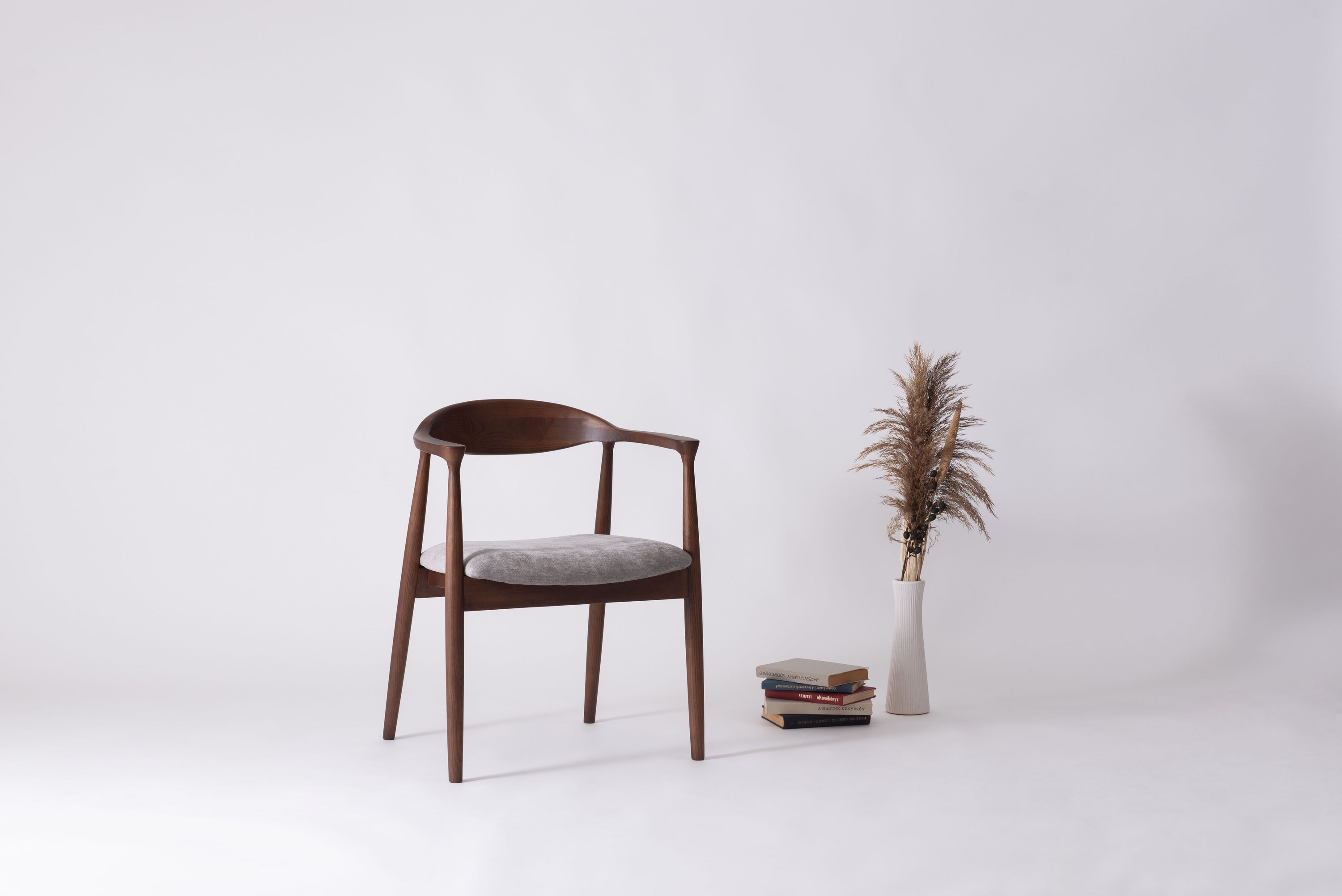 背面とアームが美しいアーチを描き、丸みを帯びたフォルムが特徴のチェアです。天然木のあたたかみとファブリックのディテールが相まって、優しい印象を与えてくれます。座面は混色生地で絶妙な色合いが唯一無二でダイニングテーブルと合わせても、一脚でお部屋のアクセントにしても、その存在感を感じられます。