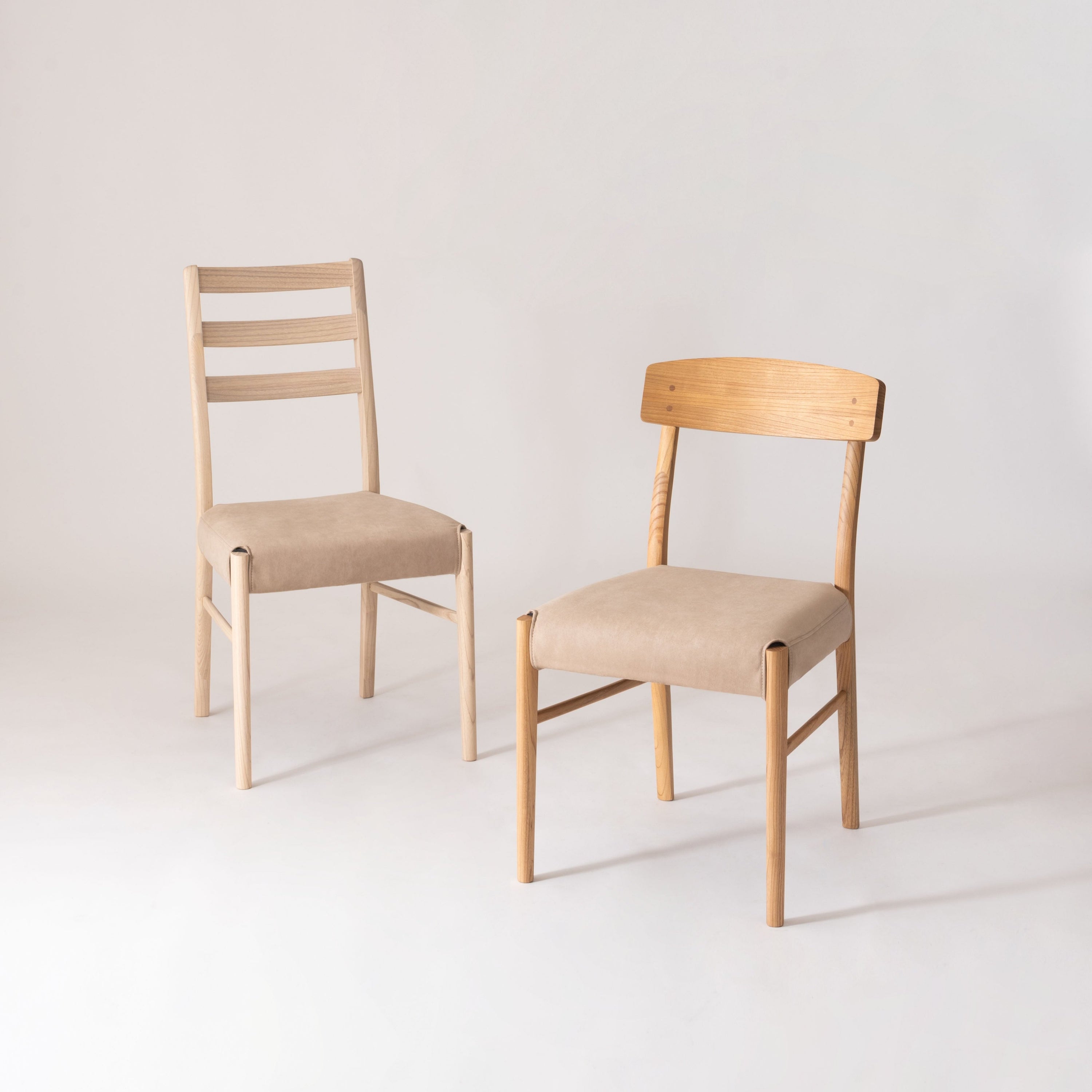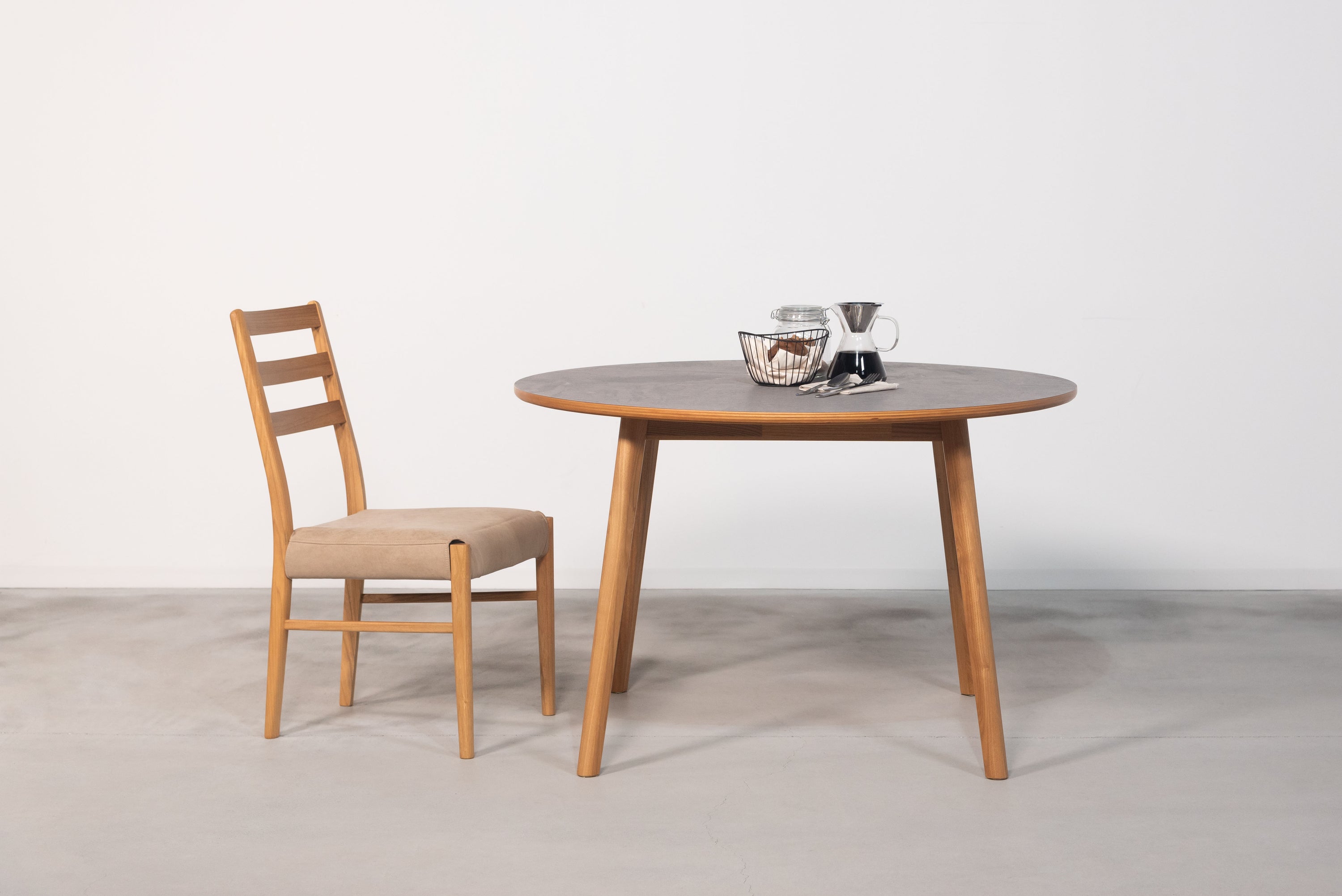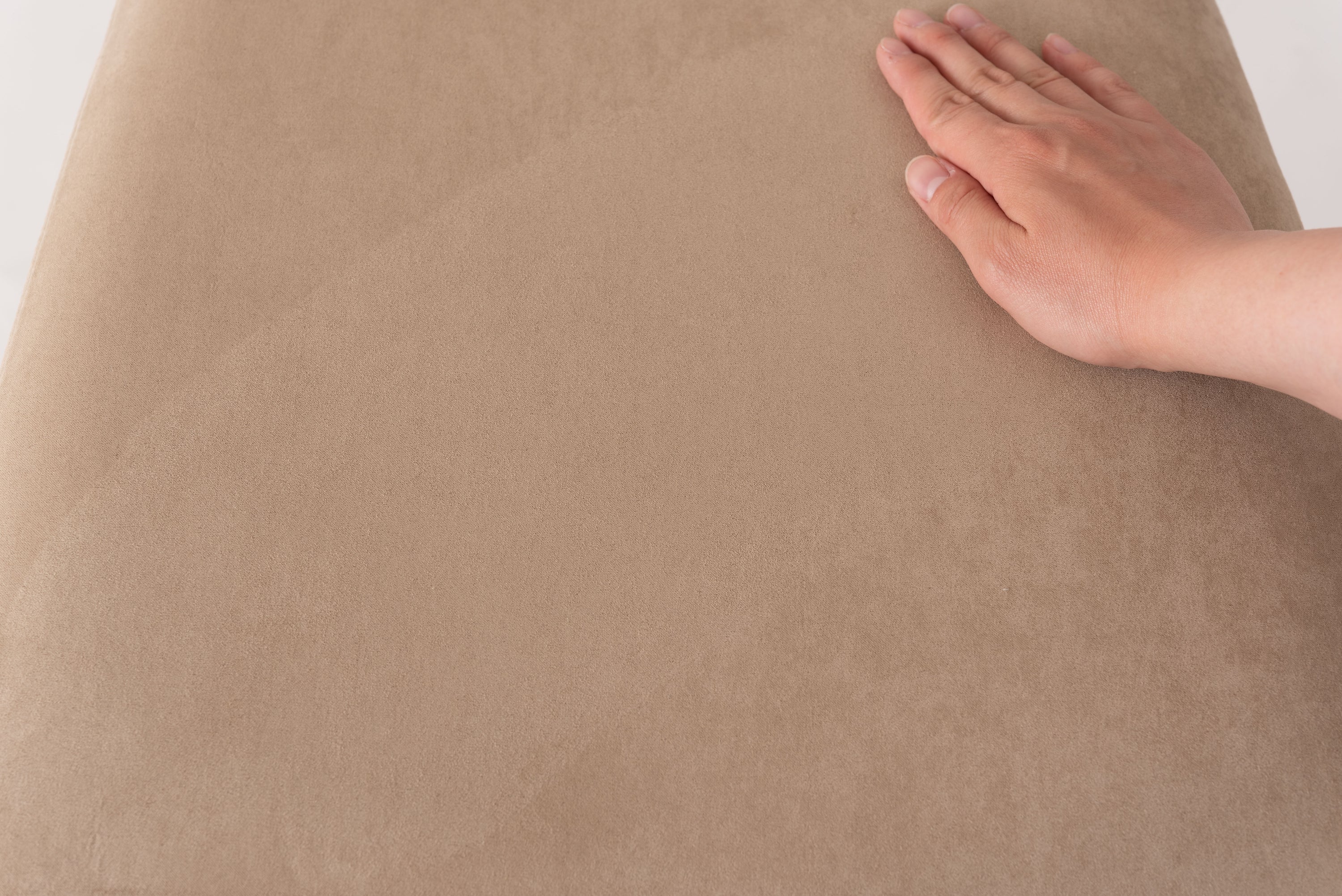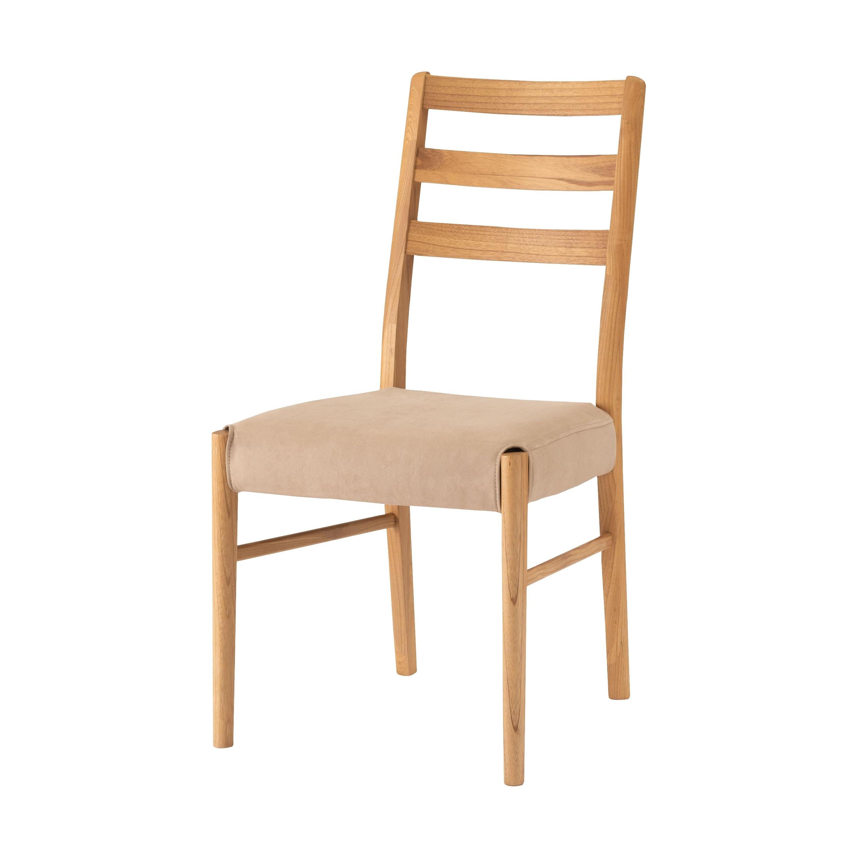 淡褐色できれいな木目が特徴のスンカイ材を使用したダイニングチェアです。座面はカバーリング仕様で、お好みのカラーのチェアカバーを装着してお使いいただけます。全体的に細身でシンプルなフォルムのチェアと、スエード調でやわらかな印象のチェアカバーの相性が良く、色違いで置いてもまとまりの出るような仕上がりです。