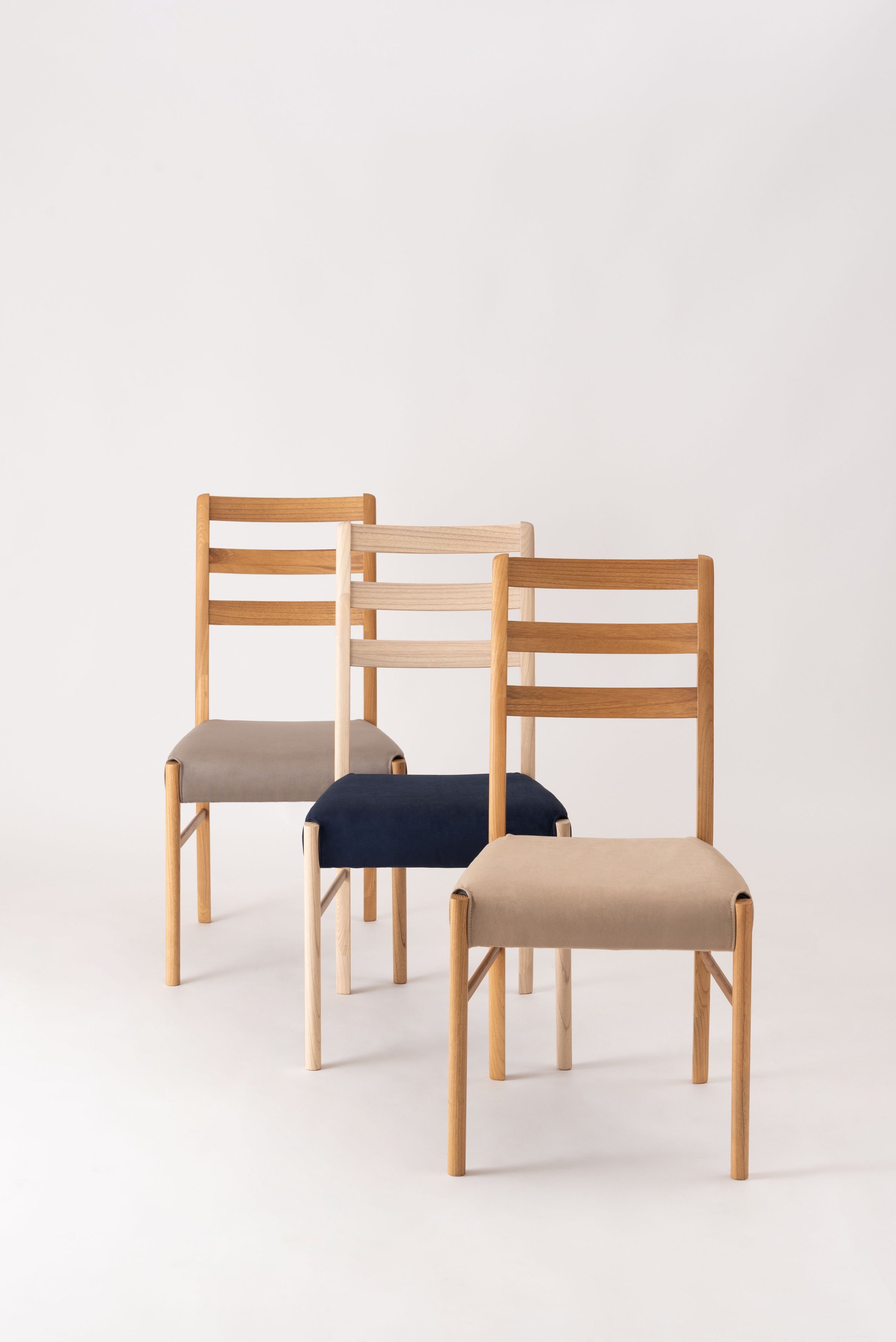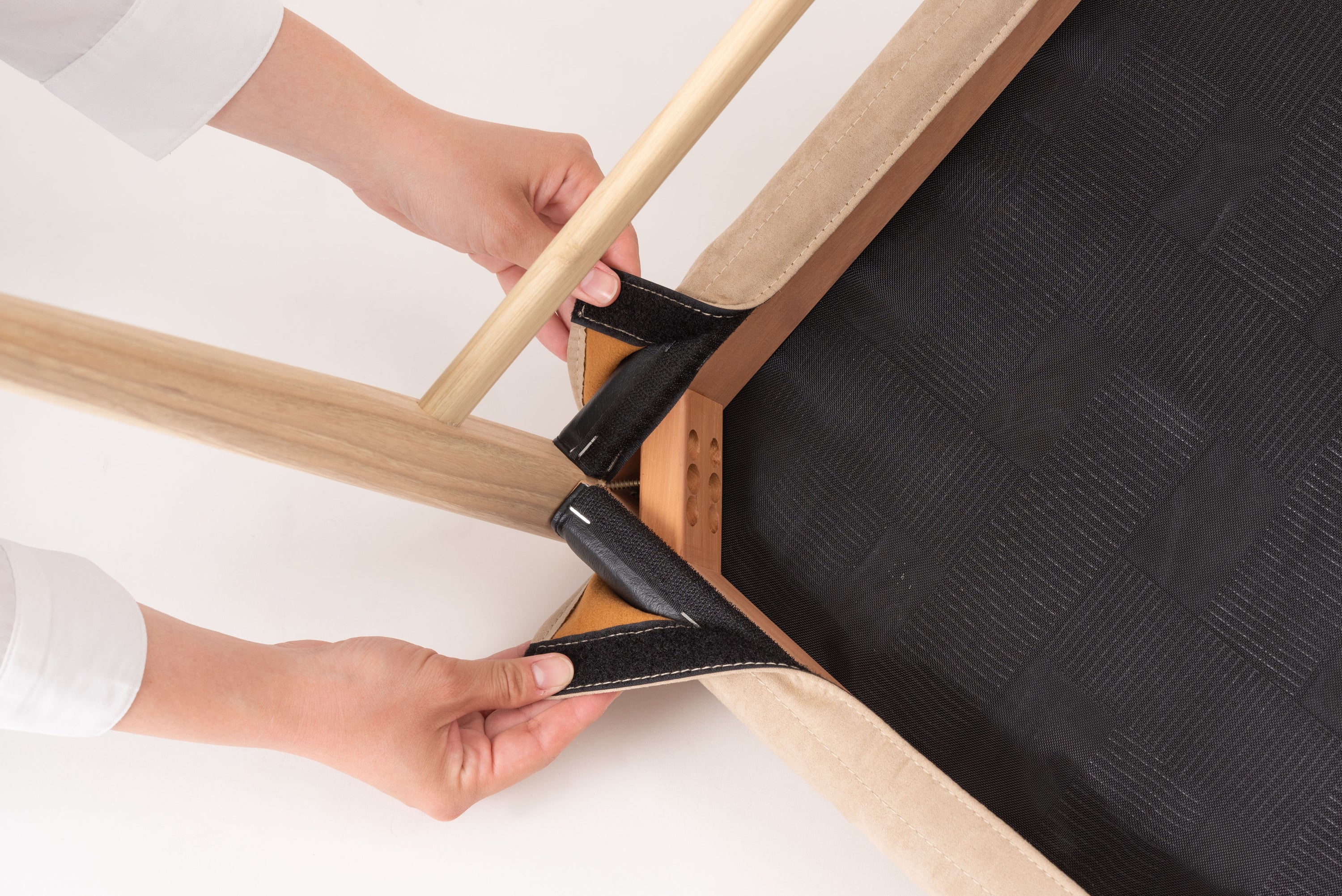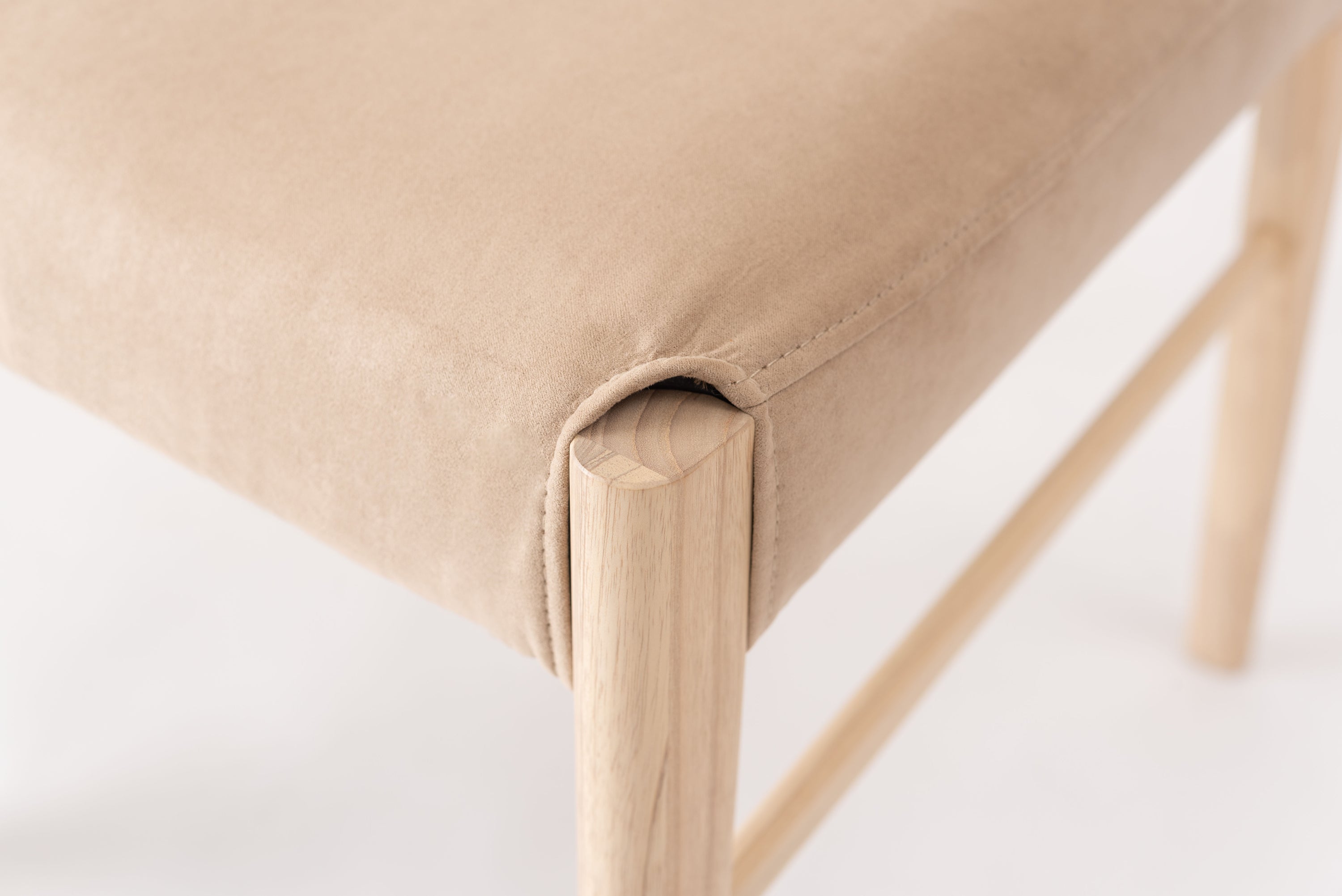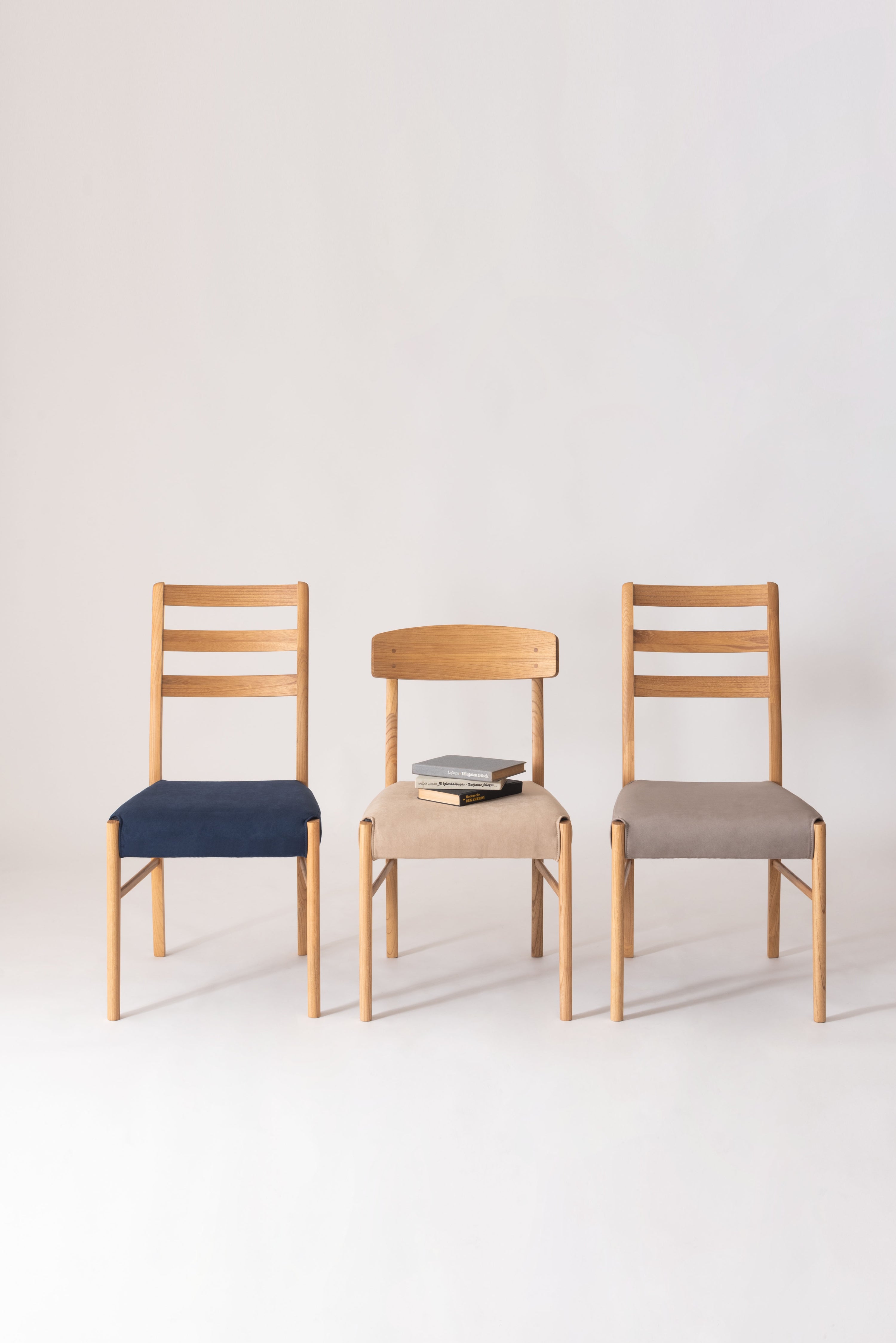 淡褐色できれいな木目が特徴のスンカイ材を使用したダイニングチェアです。座面はカバーリング仕様で、お好みのカラーのチェアカバーを装着してお使いいただけます。全体的に細身でシンプルなフォルムのチェアと、スエード調でやわらかな印象のチェアカバーの相性が良く、色違いで置いてもまとまりの出るような仕上がりです。