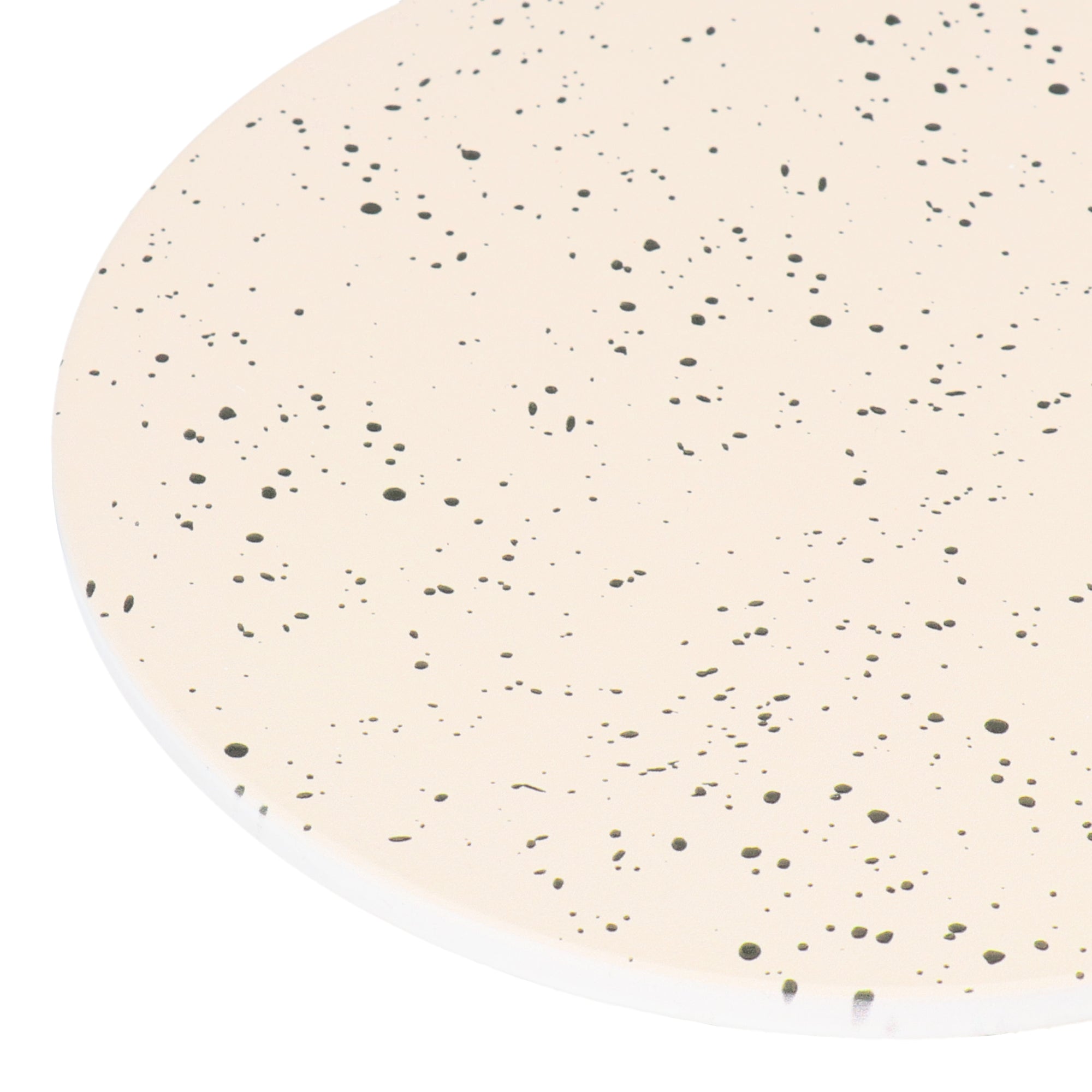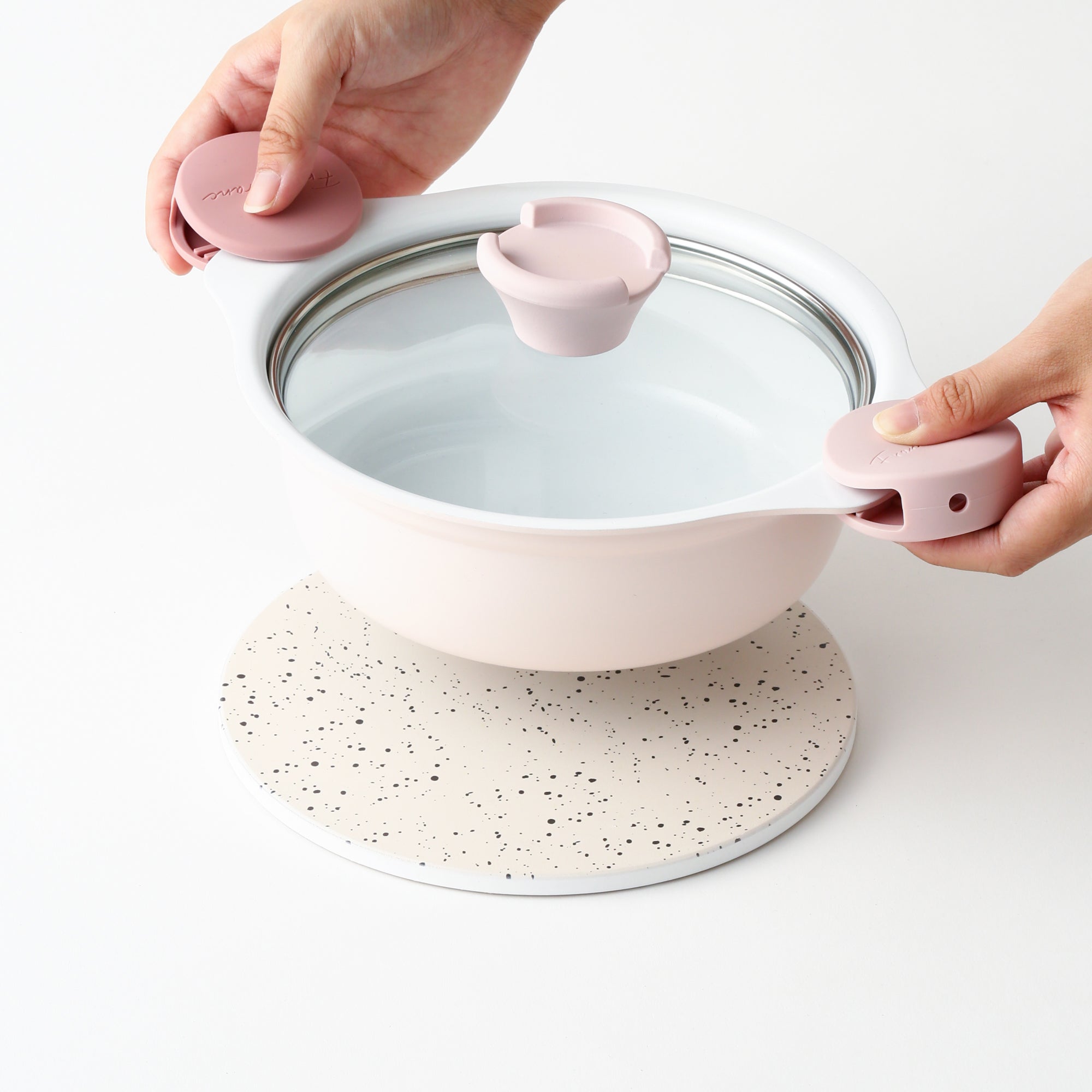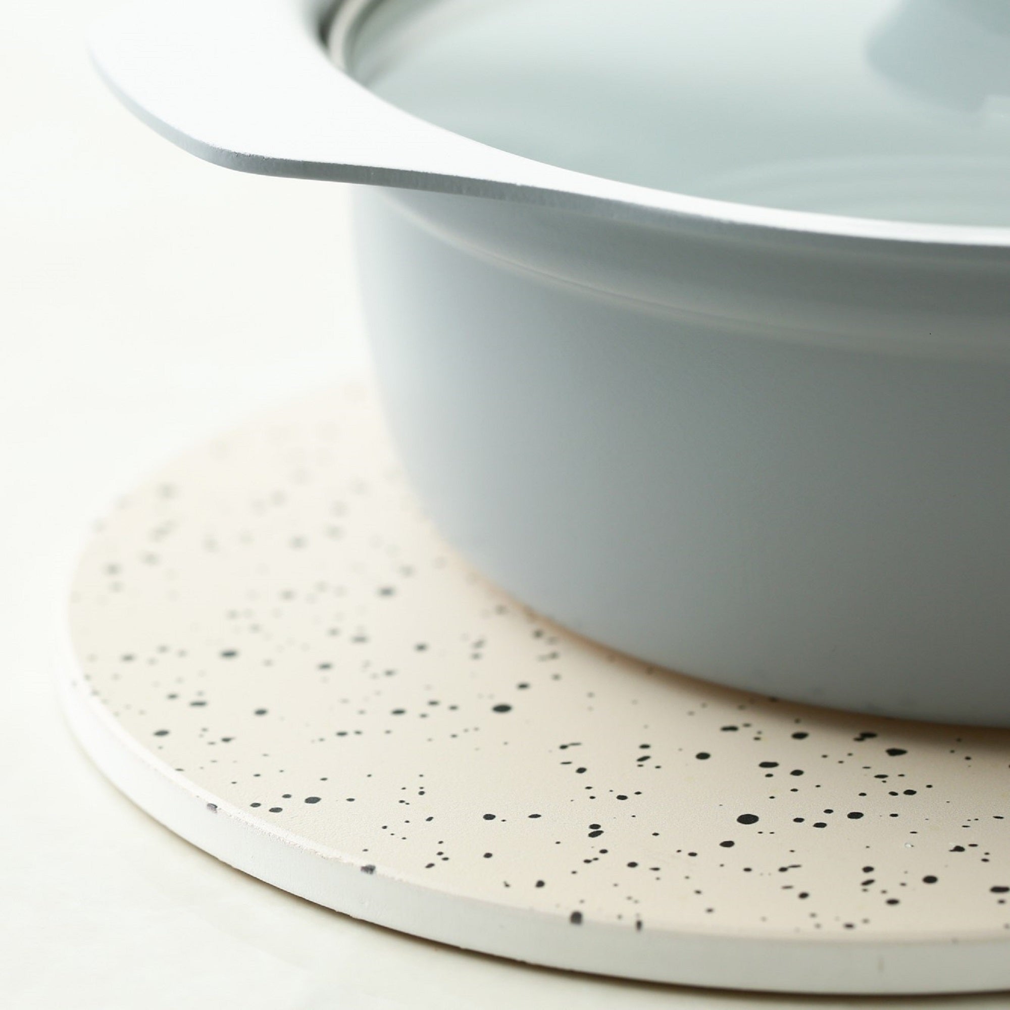 ナチュラルな雰囲気がどんなインテリアにも馴染むおしゃれな鍋敷きです。テーブルなどにキズを付きにくくするため、裏面はコルク素材で仕上げました。コルクとはコルクガシという樹木の皮から作られた天然素材です。ドットの模様が高級感があり、置いているだけで普段の食卓の風景をランクアップさせてくれます。表面にはドロマイトという素材が使われています。ドロマイトとは岩石の一種なので固く、少し重みのある鍋敷きになっています。色はシンプルなだいだい色を基調としています。形は鍋の形に合わせたきれいな円形です。大きさは横20cm、縦20cm、高さ0.8cmと一般的な鍋敷きのサイズです。
