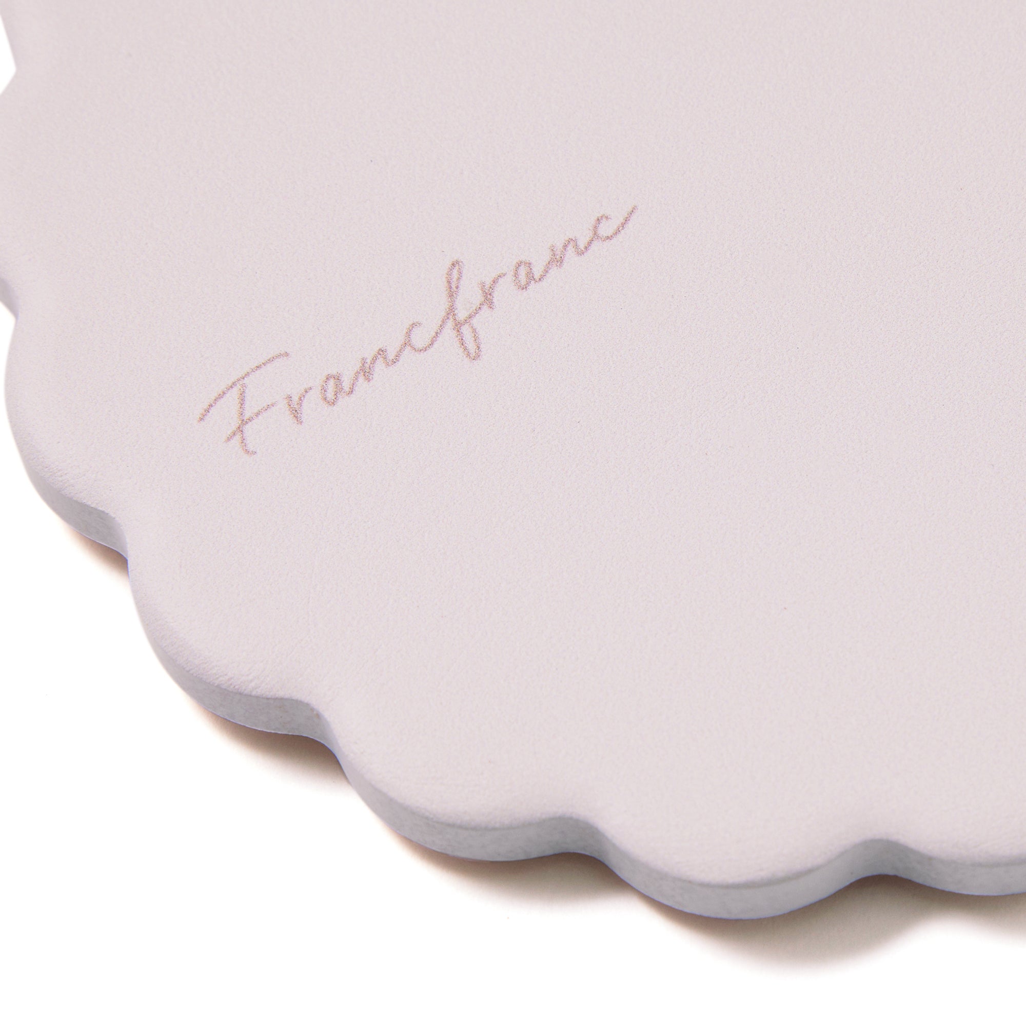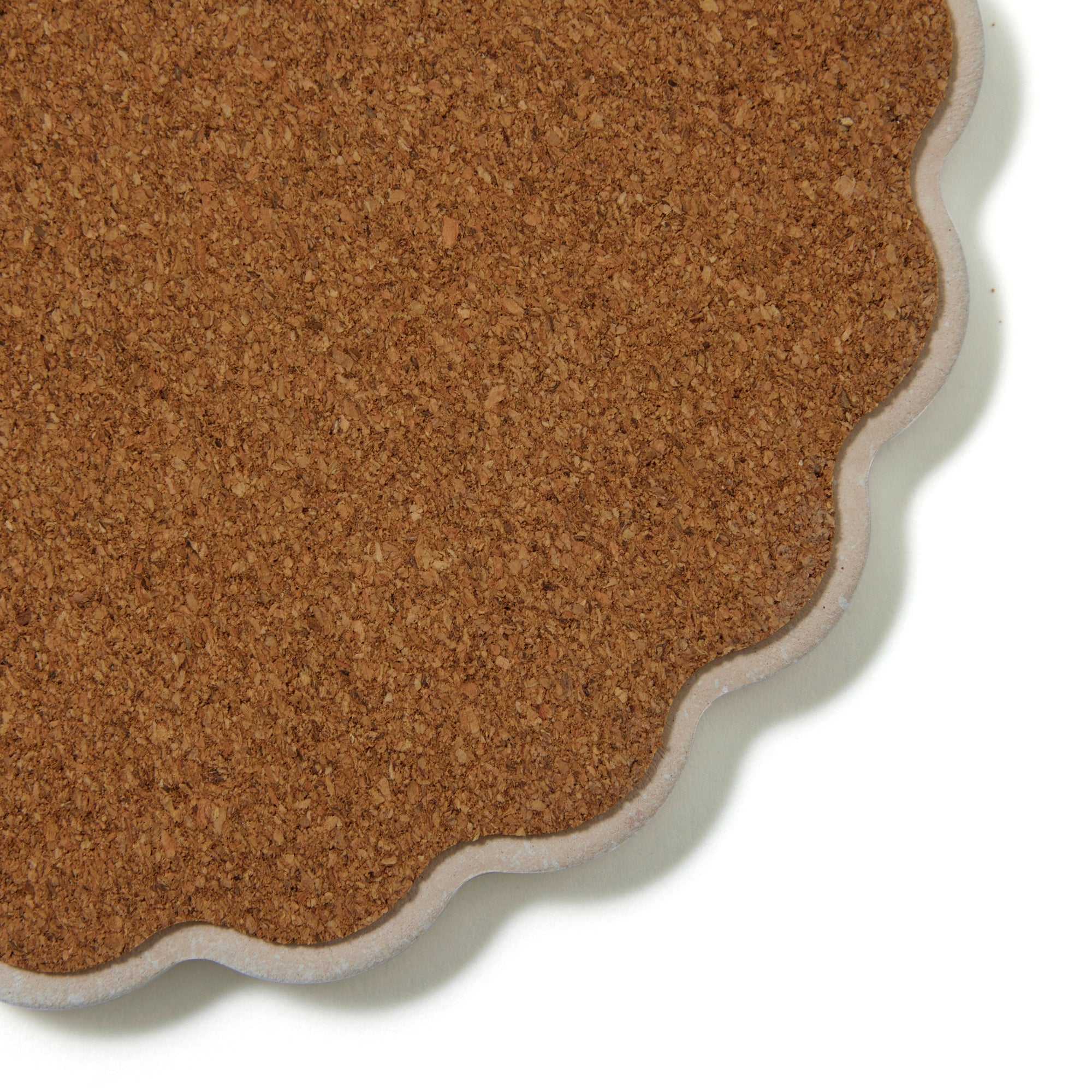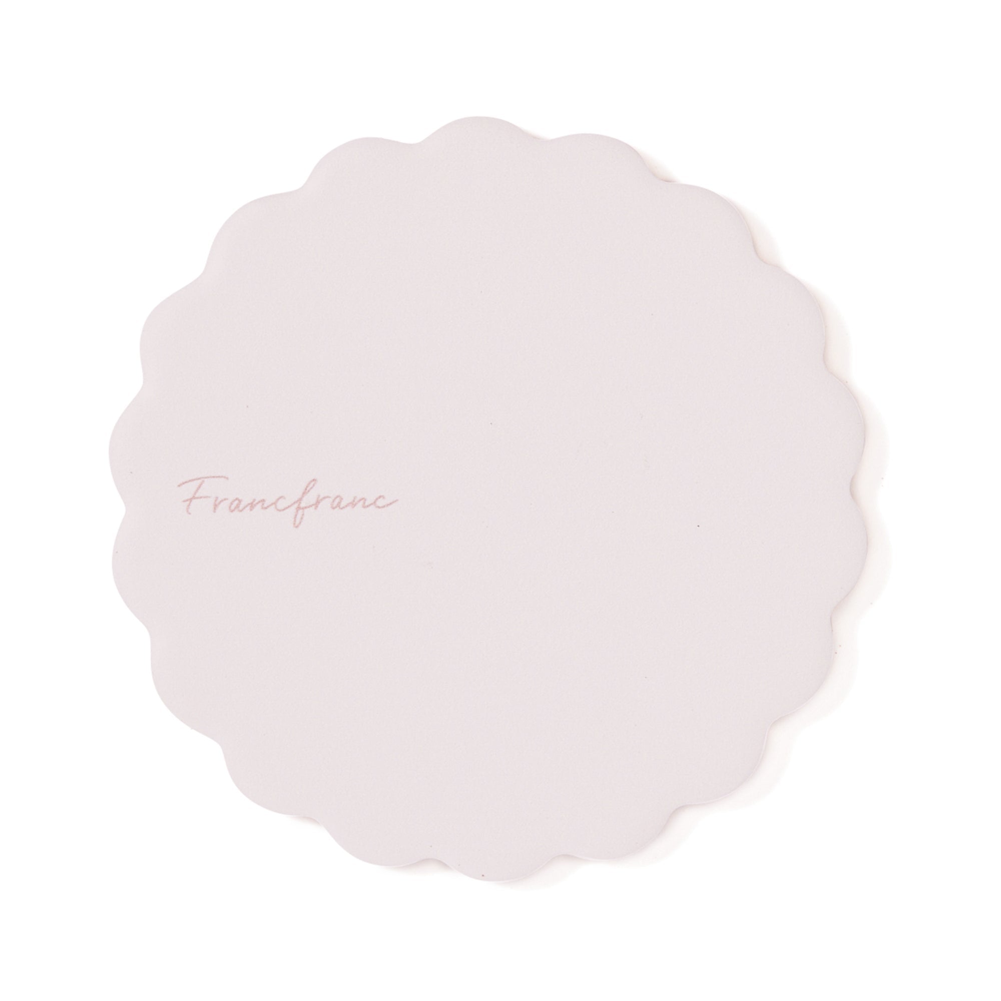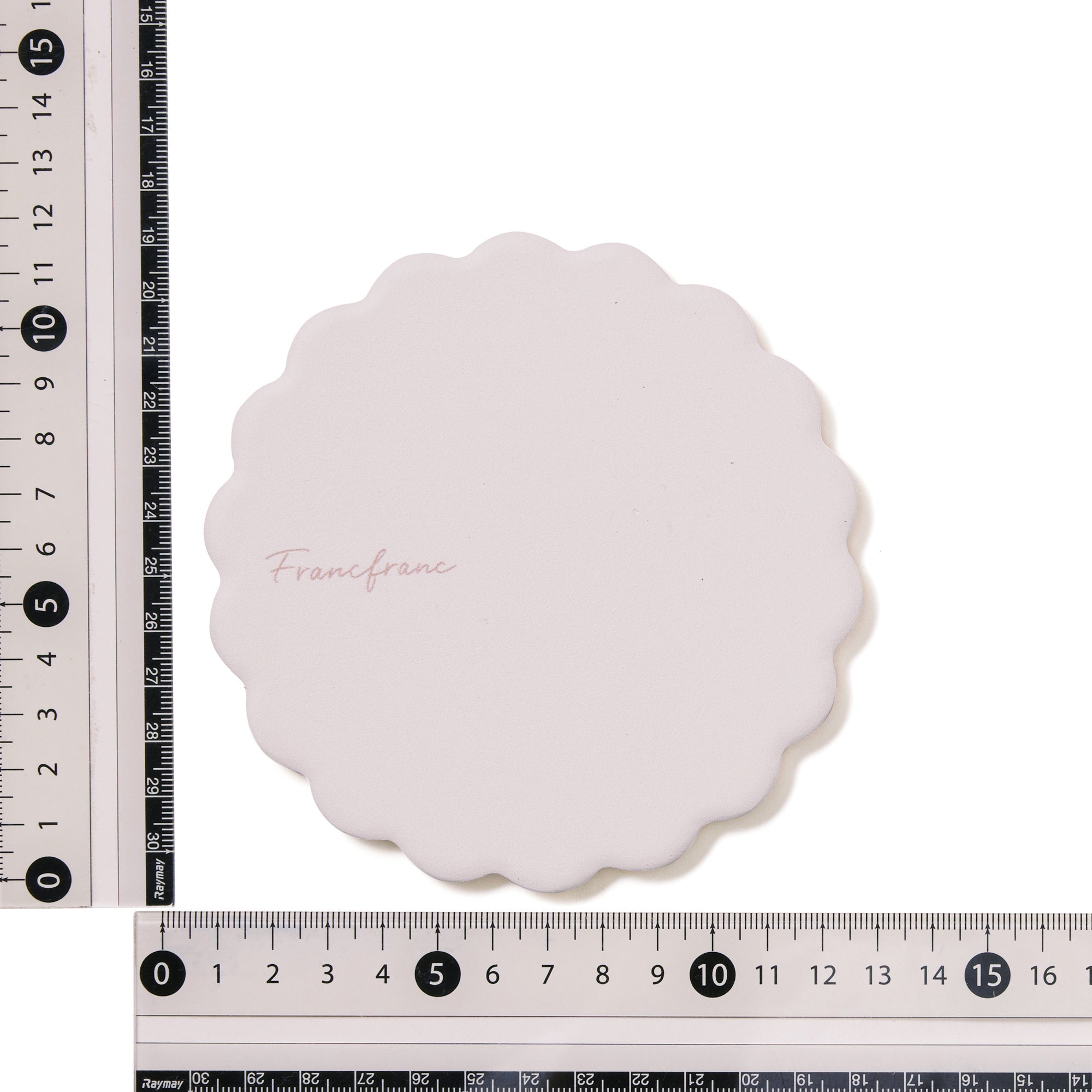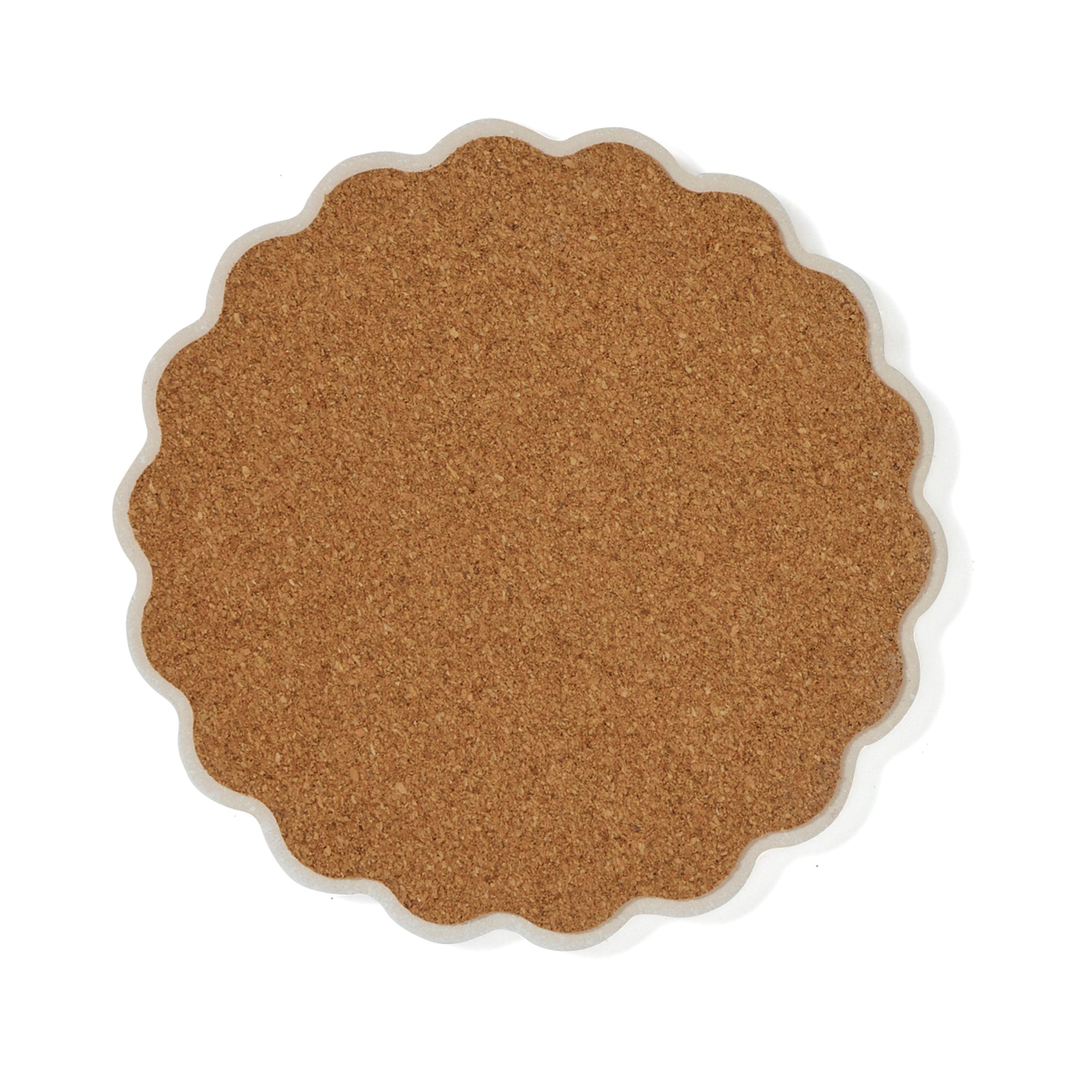かわいらしいフリルの形状にロゴをあしらった食器と合わせやすいトリベットです。テーブルなどにキズを付きにくくするため、裏面はコルク素材で仕上げています。