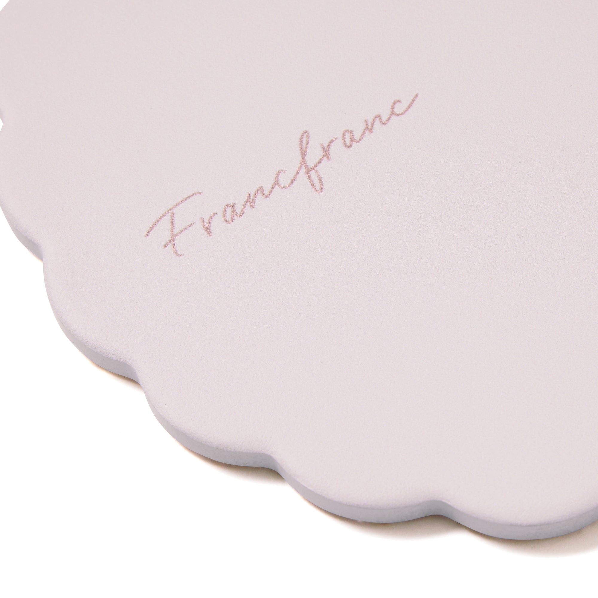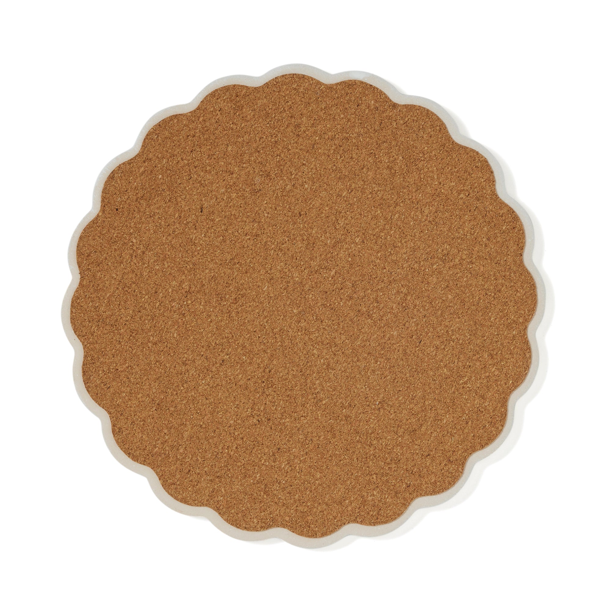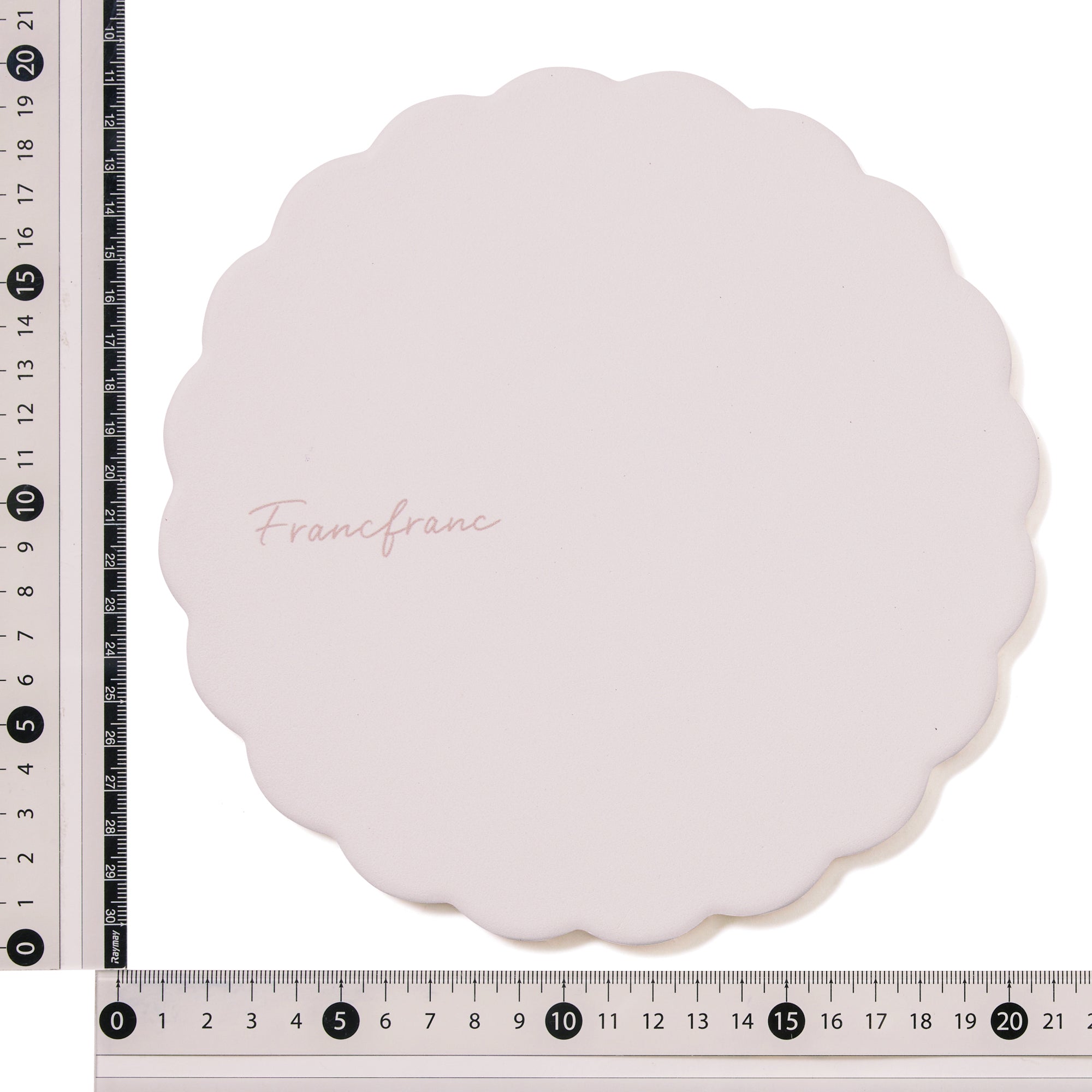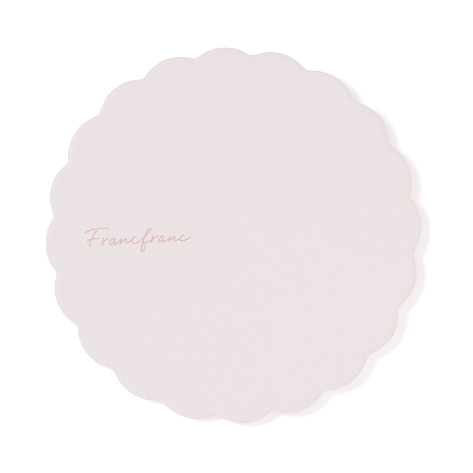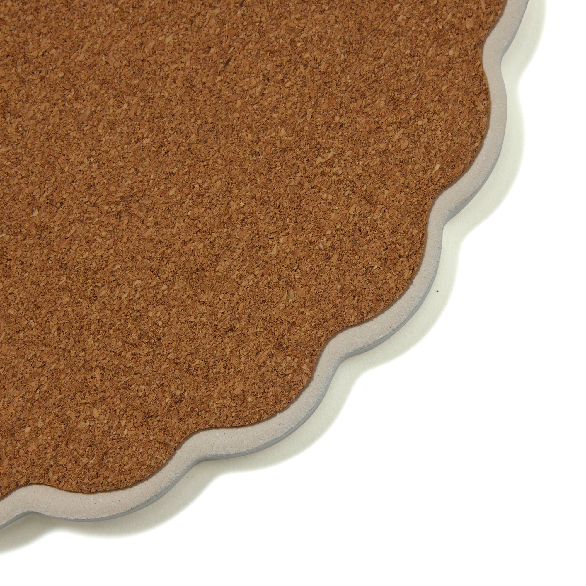 かわいらしいフリルの形状にロゴをあしらった食器と合わせやすいトリベットです。テーブルなどにキズを付きにくくするため、裏面はコルク素材で仕上げています。