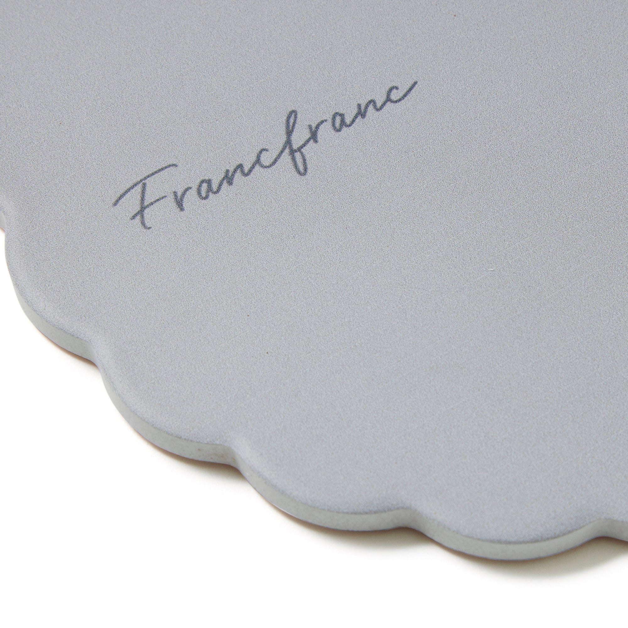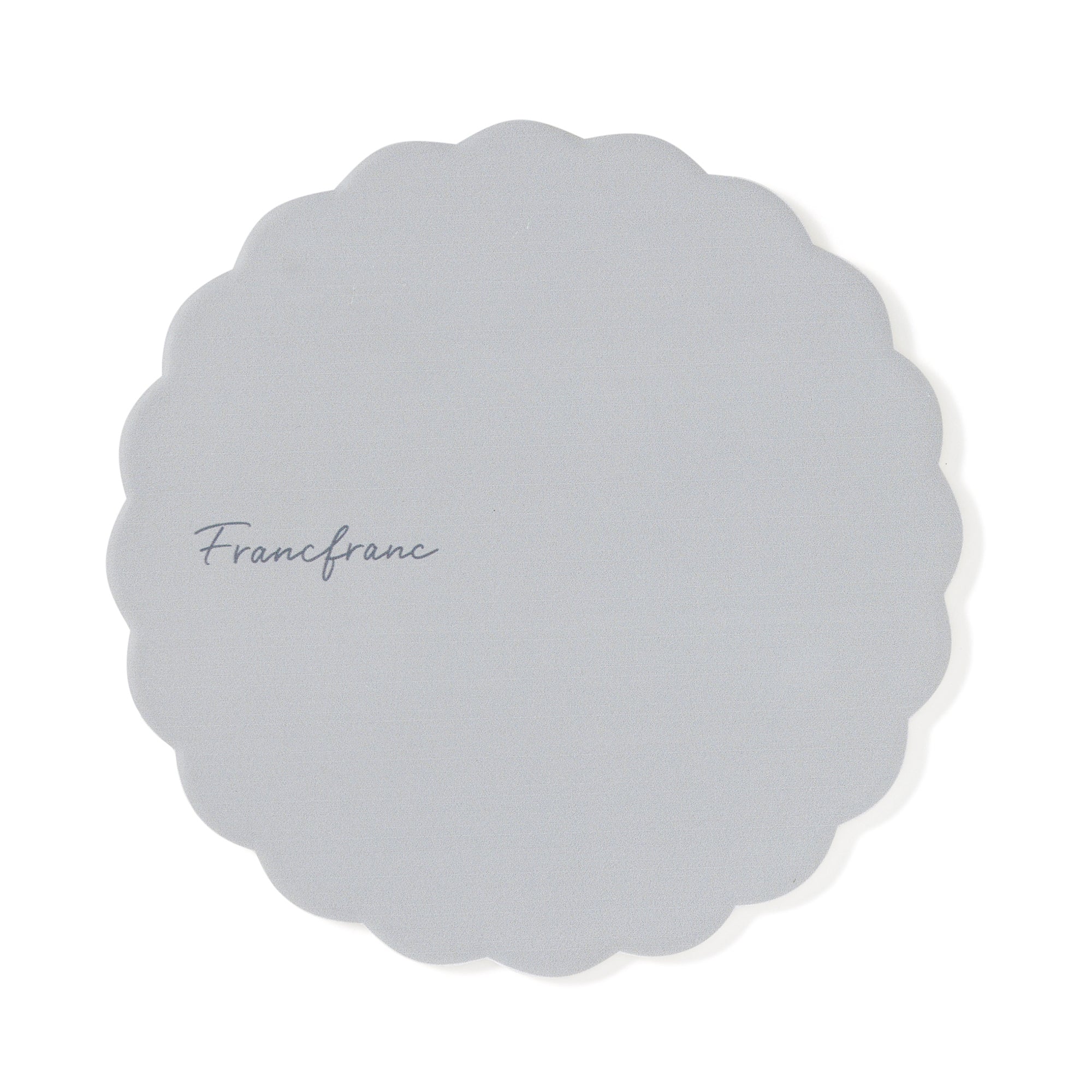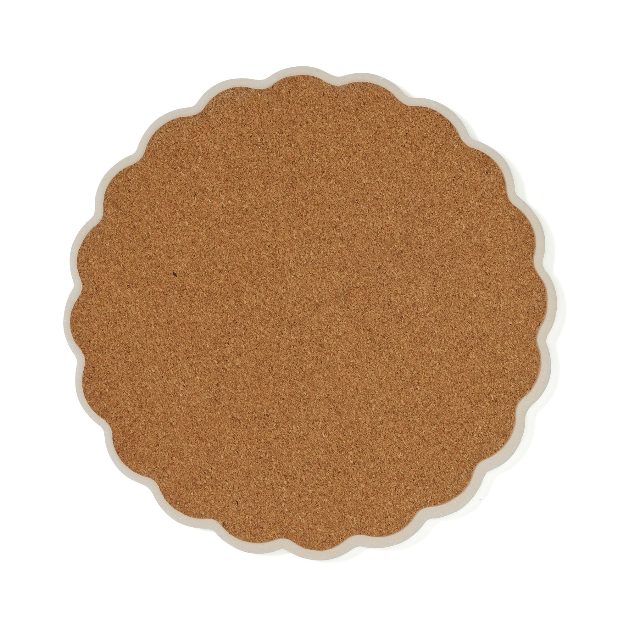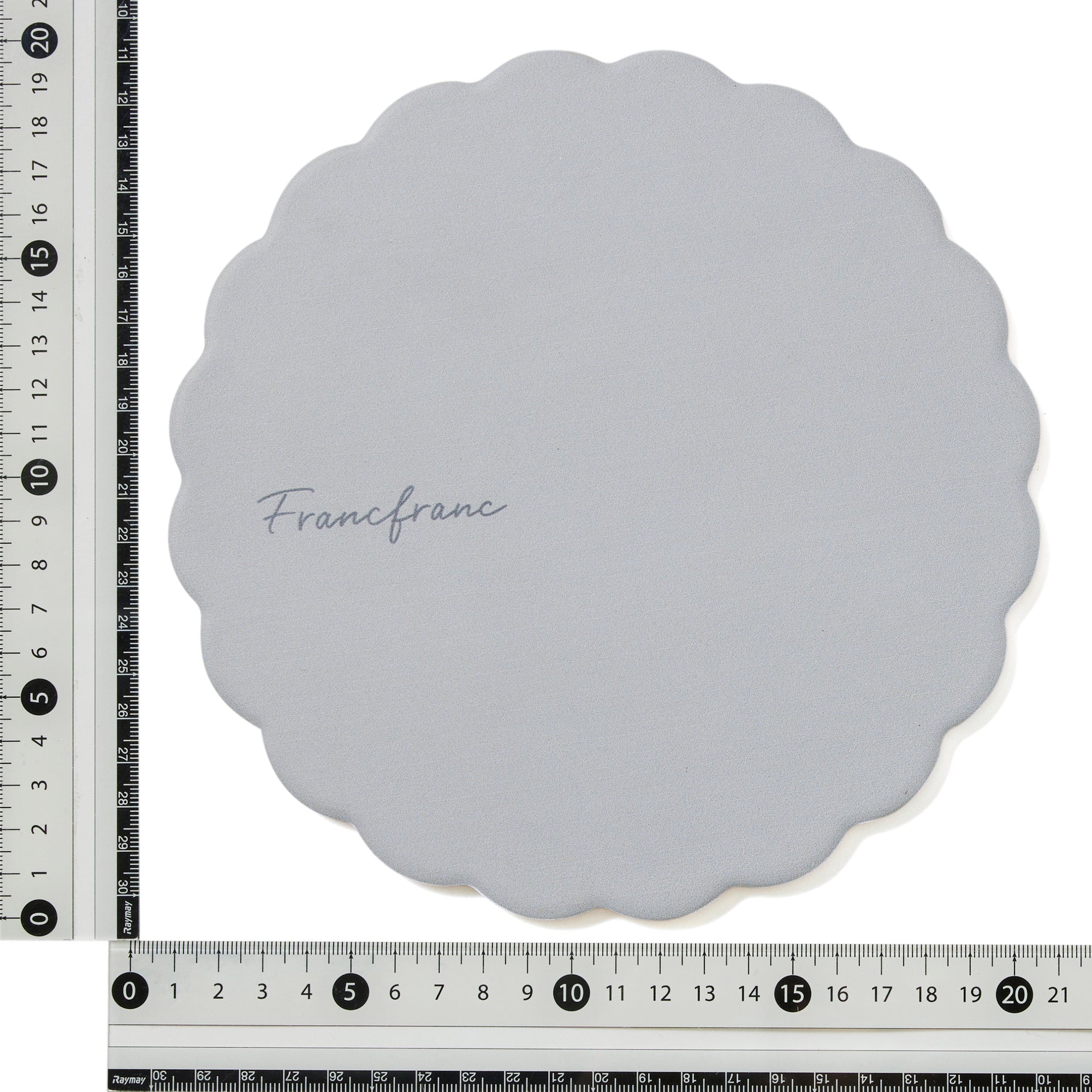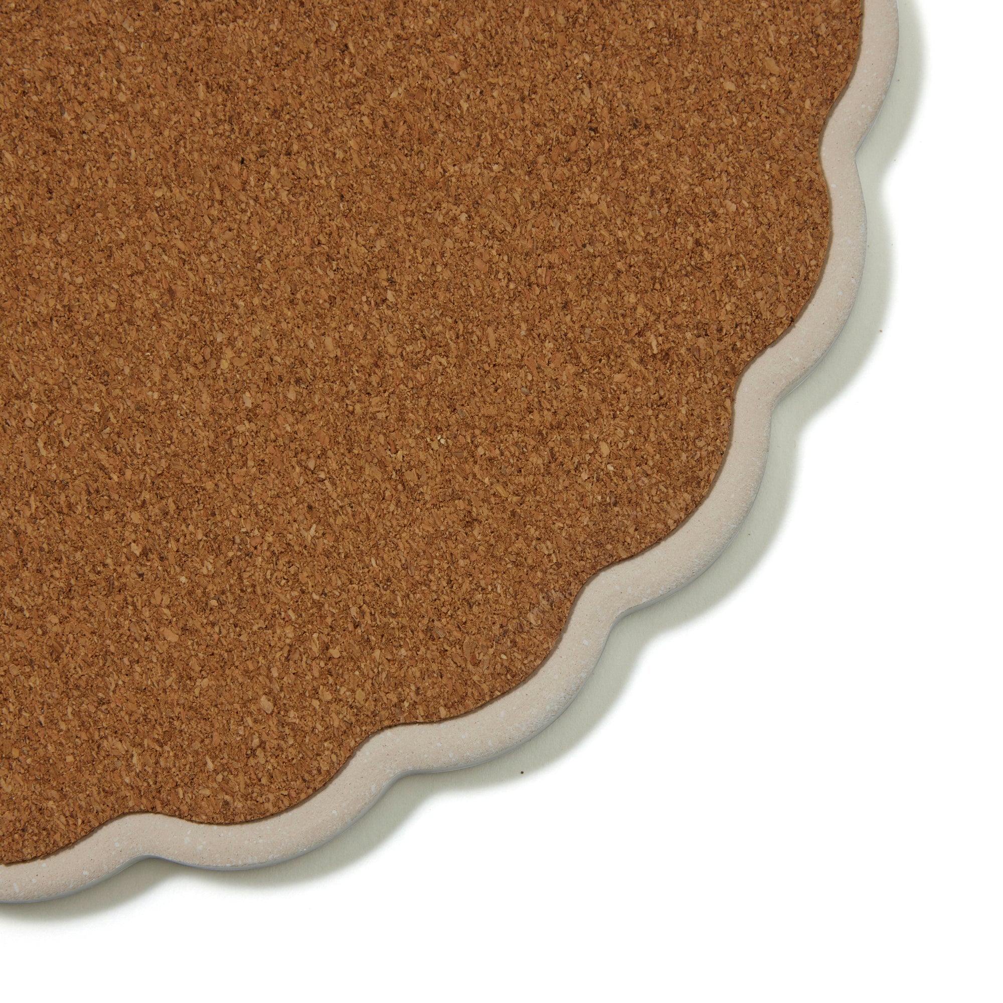 かわいらしいフリルの形状にロゴをあしらった食器と合わせやすいトリベットです。テーブルなどにキズを付きにくくするため、裏面はコルク素材で仕上げています。