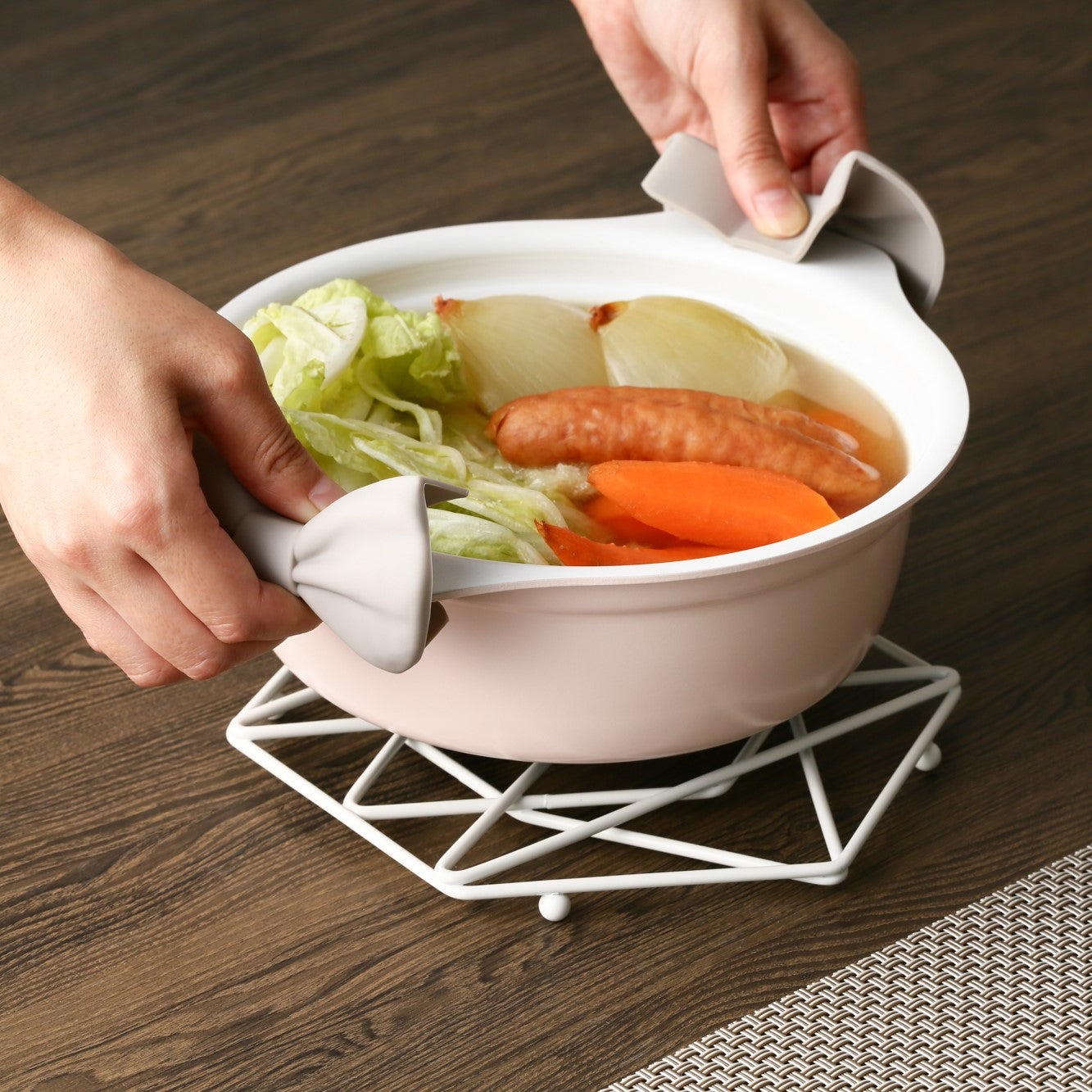 Francfrancらしいモチーフがフェミニンなシリコン製のなべつかみ2個セットです。熱いお皿はもちろん両手鍋にも使用できます。シリコン素材のため、薄手ながら熱さも伝わりにくく、持ちやすいのが特徴です。フックなどにかけられるように、穴が開いています。