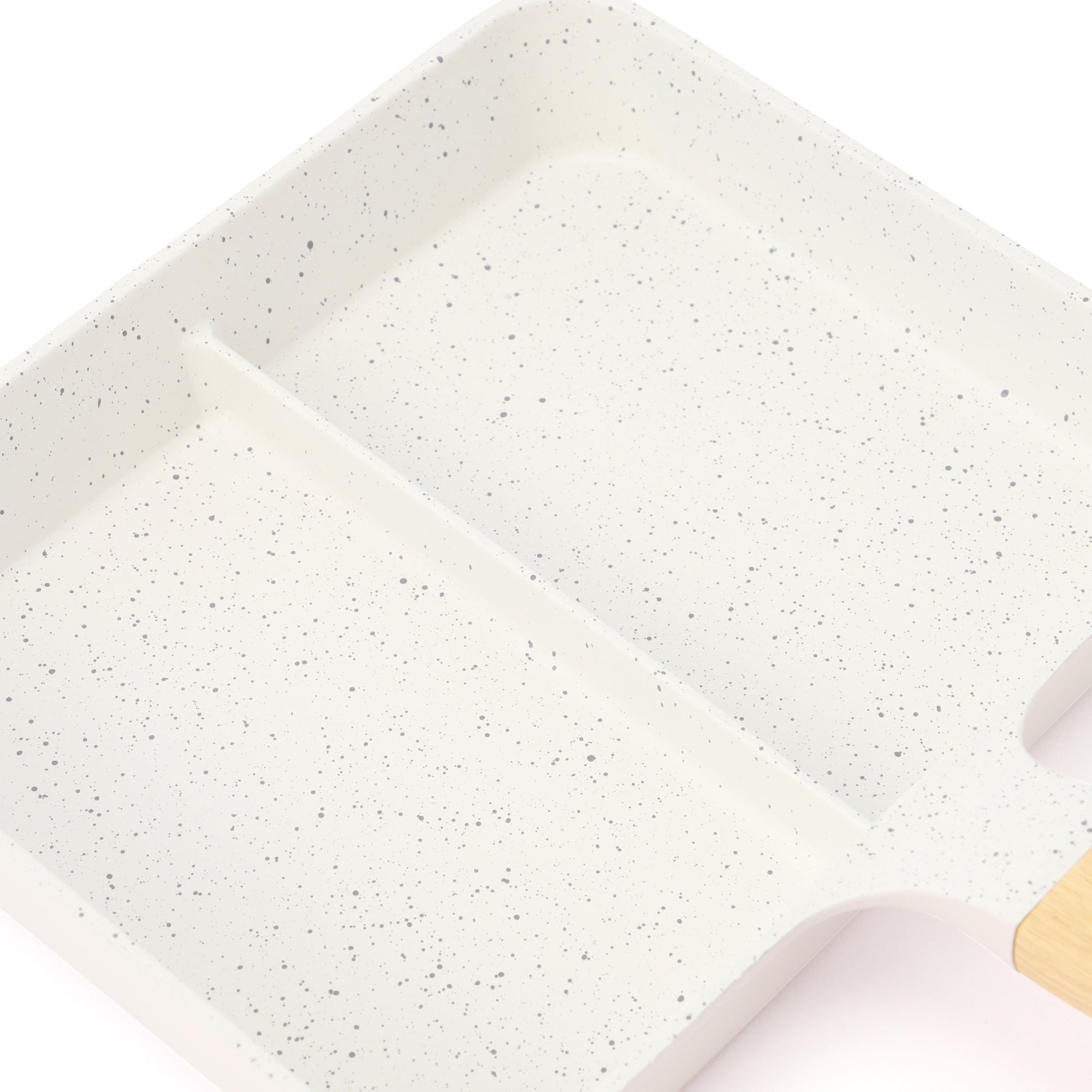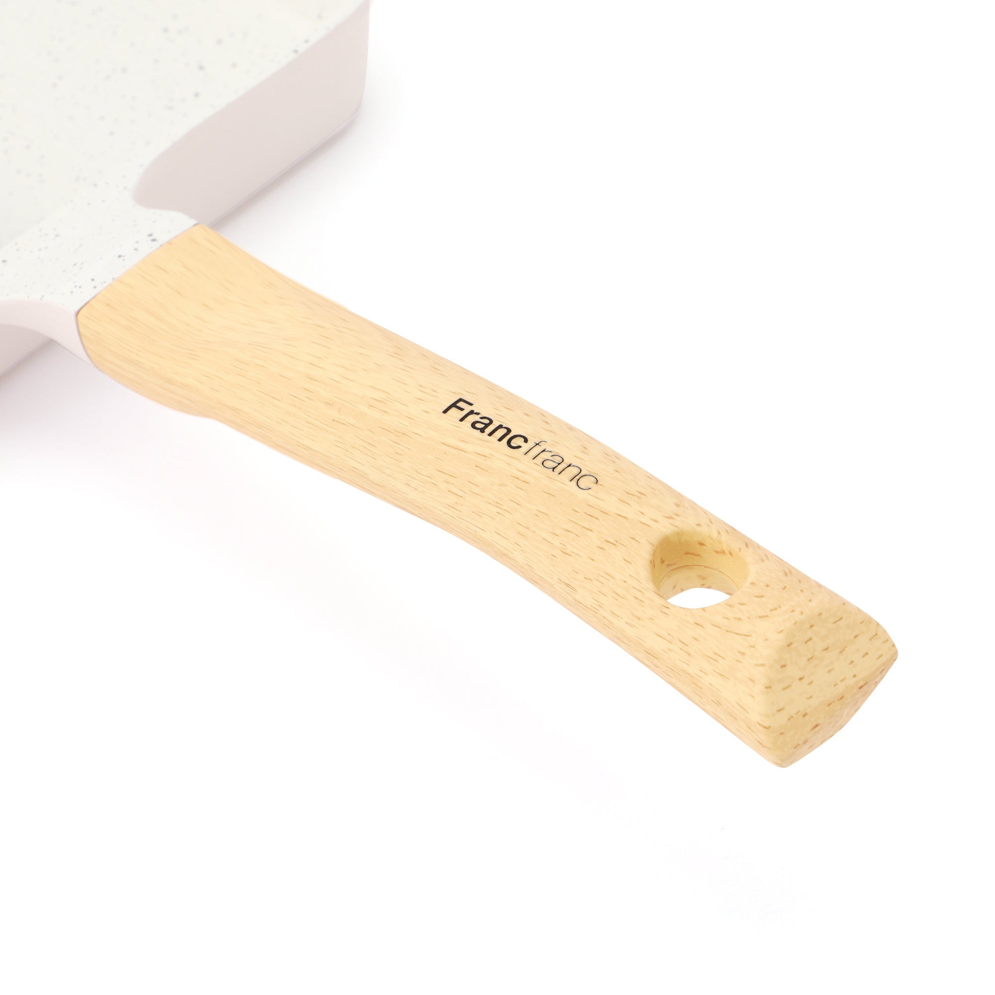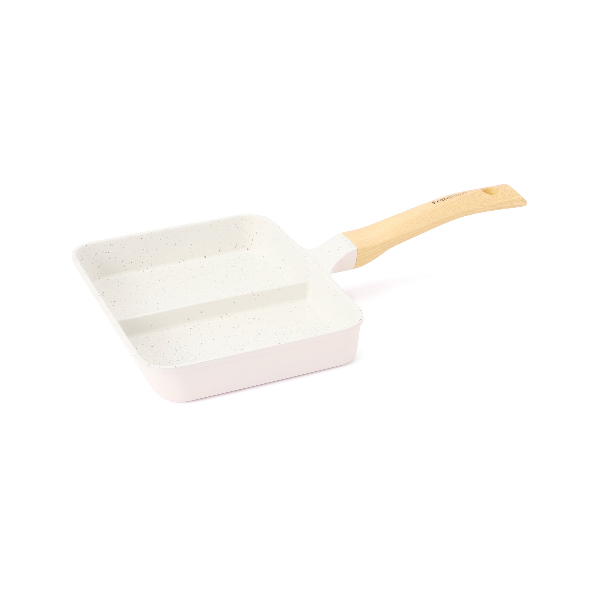 IH・直火対応の仕切り付きのフライパンです。ナチュラルなアイボリーにドット模様を施したトレンド感あるカラーリングでキッチンにもなじみやすいデザインです。仕切りが付いているので2つの調理が同時にでき、忙しい朝の時短調理や味付けを変えて調理したいときに便利なフライパンです。IH・直火どちらも使用可能です。※持ち手部分は天然木を使用しているため、個体差がございます。