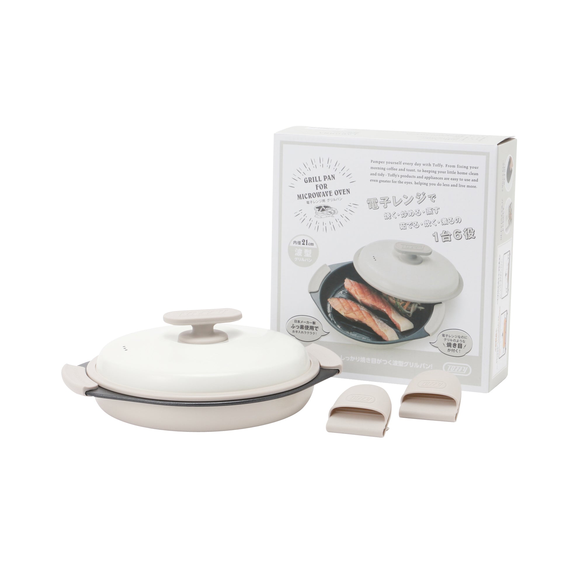 1台6役の電子レンジ調理専用グリルパンです。 電子レンジに入れるだけ。焼く、炒める、蒸す、茹でる、炊く、煮るなどの調理がこれ一台で可能です。 グリル調理をしたような焼き目がつく波型プレートを採用し、余分な脂も落ちてヘルシー。 焦げ具合や火加減を気にしなくてよいほったらかし調理で、美味しく料理ができちゃいます。 ふっ素樹脂加工でお手入れもらくらく。シリコーンミトン2個、さまざまなアレンジ料理が記載されたレシピブック付きなのも嬉しいポイントです。