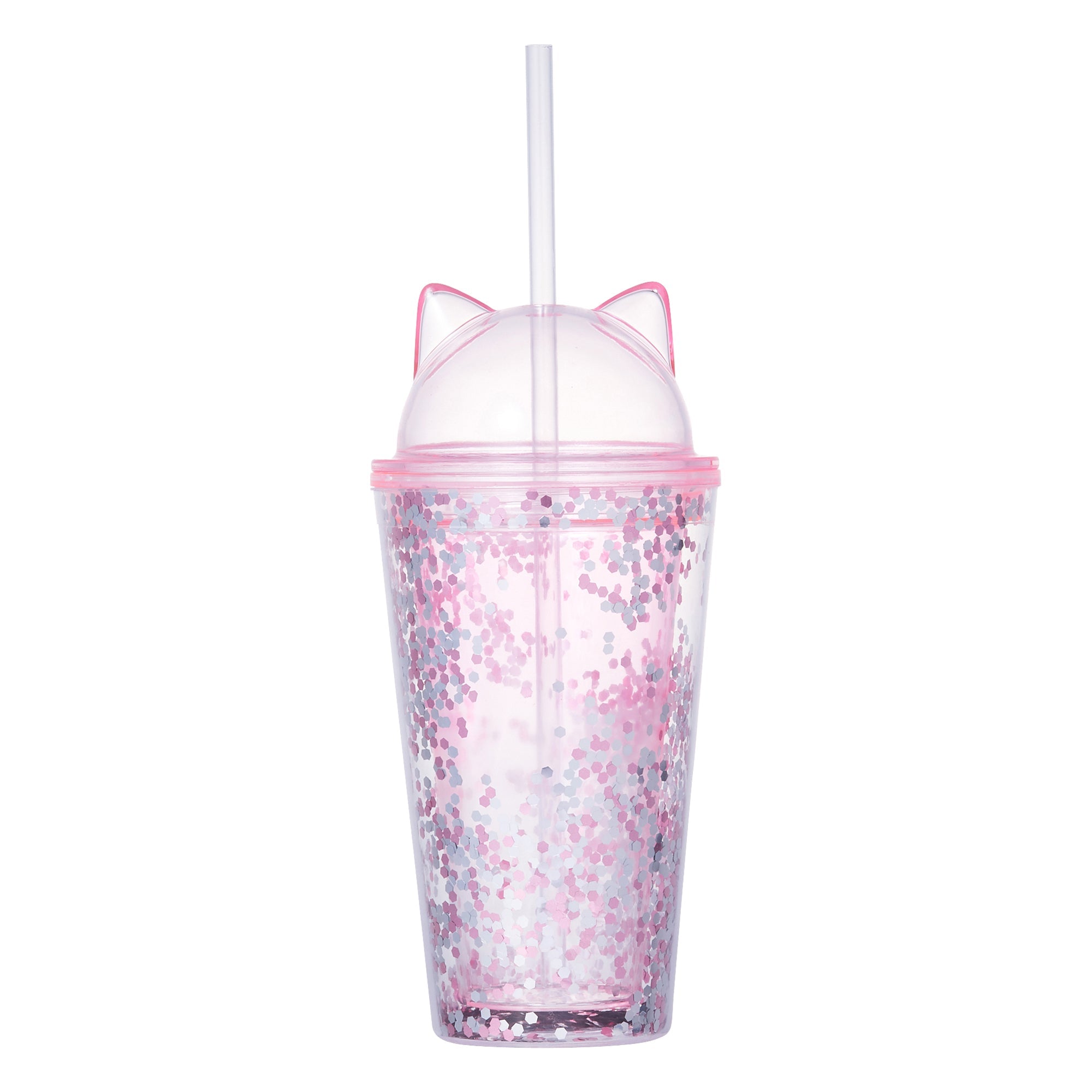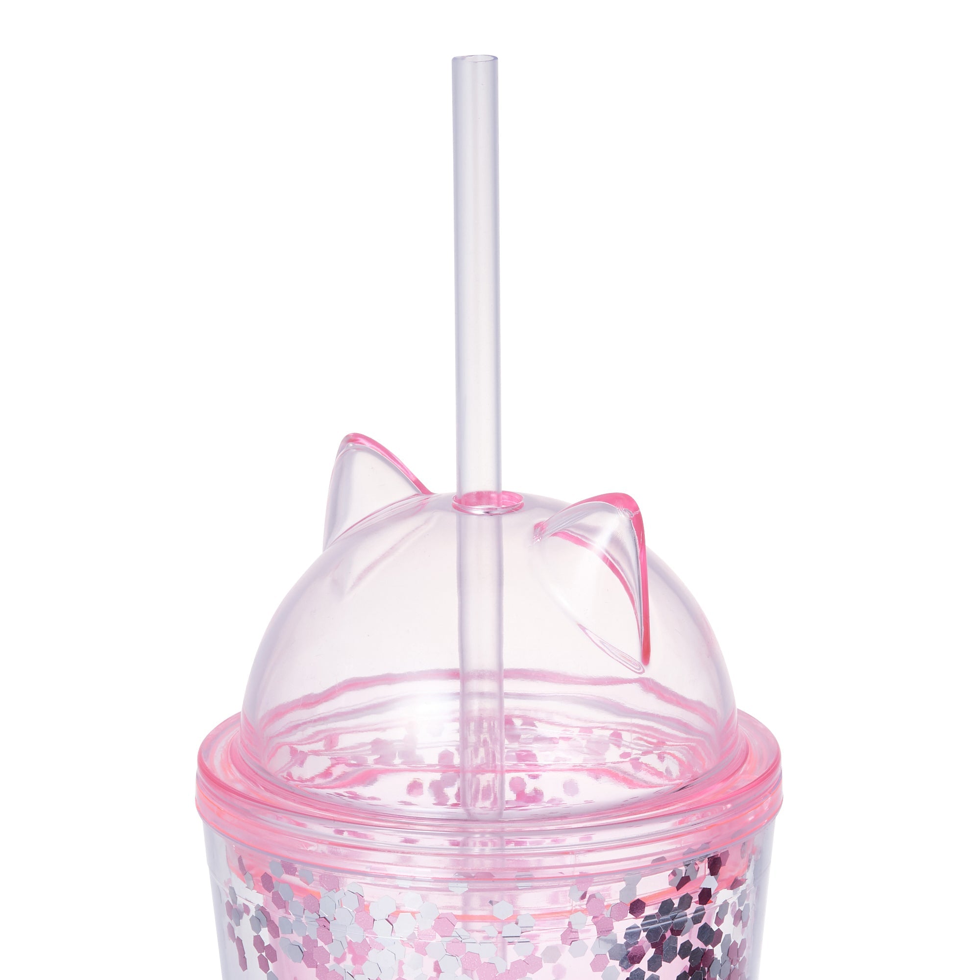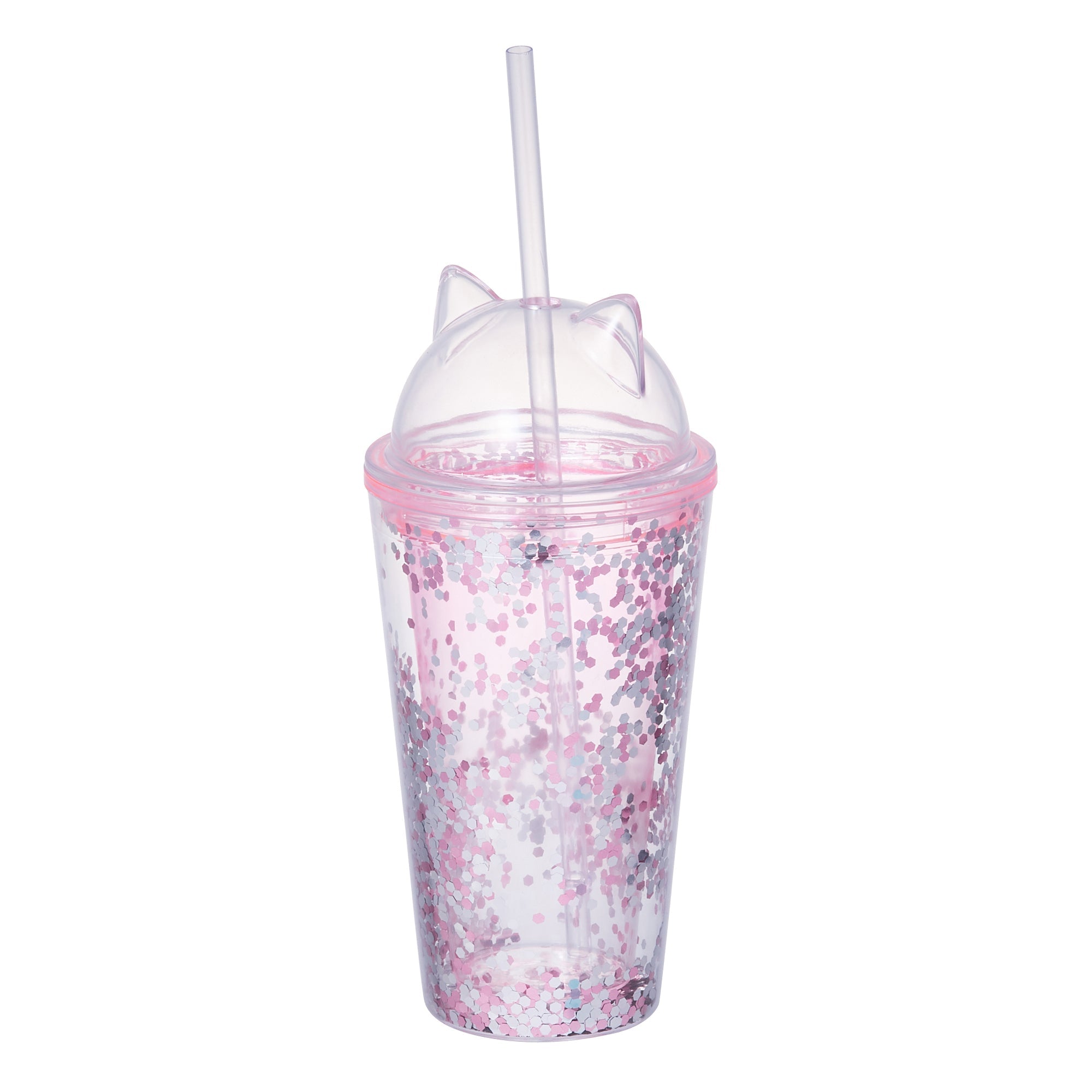 パンチのあるキラキラなデザインがフォトジェニックなドリンクタンブラーです。ドリンクがたっぷり入るサイズ感とちょうどよい太さのストロー付きで、使いやすいのも魅力です。夏らしいチアフルなテイストがホームパーティーやピクニックなど仲間と楽しむシーンを盛り上げてくれます。見た目にも涼しげな透明タイプに、散りばめられたポップで華やかな六角形のラメがきらりと映えます。色付きの飲み物やカットフルーツなどを入れると、一気にリゾート気分になれます。お求めやすい価格帯なので、ご自宅用にはもちろん、ちょっとしたギフトにもおすすめです。丸みのあるキャットモチーフの蓋がとっても愛らしいデザインです。おうちピクニックやご近所のお散歩、キャンプやフェスなどのレジャーシーンまで、持つだけで手もとがパッと映えてハッピーな気分を味わえます。