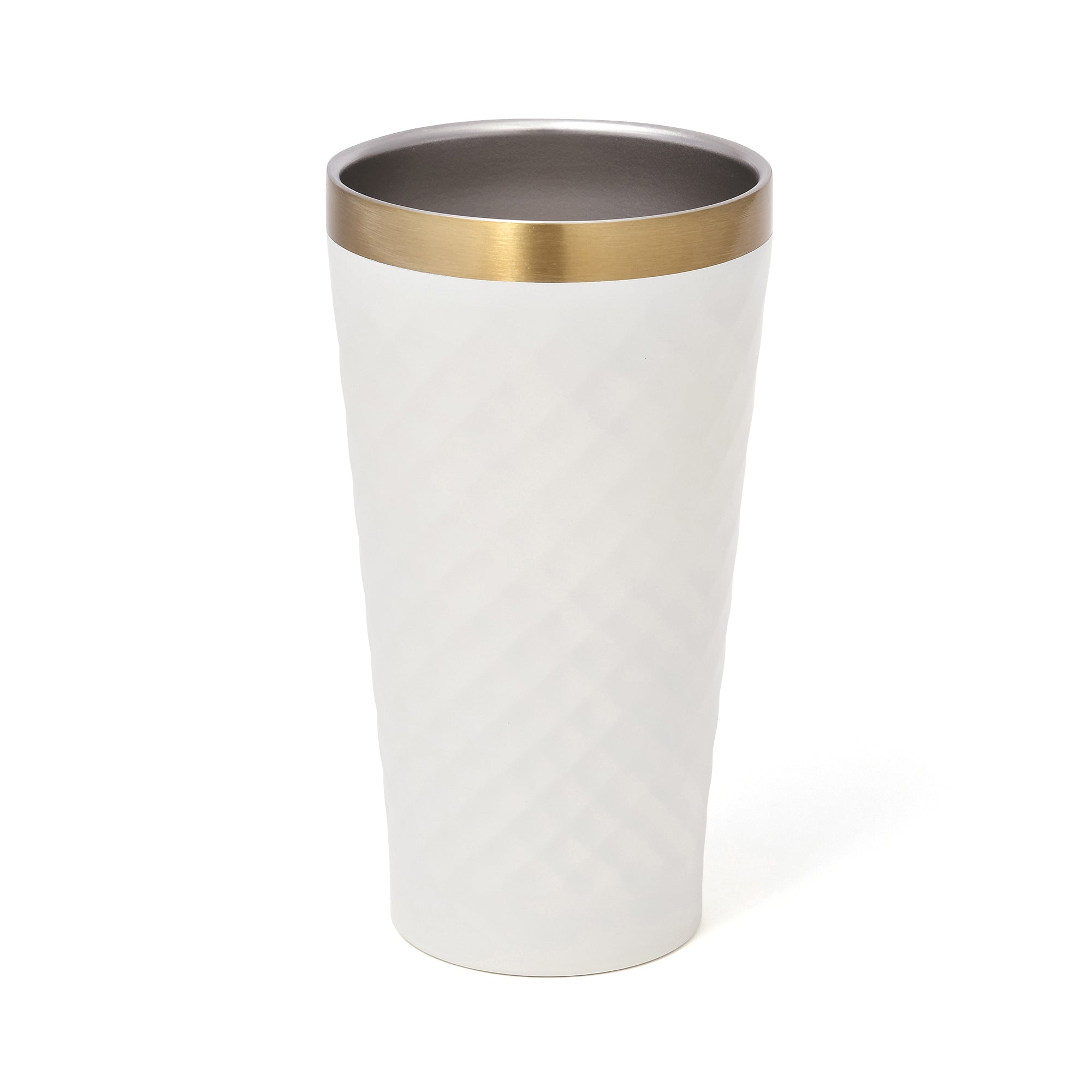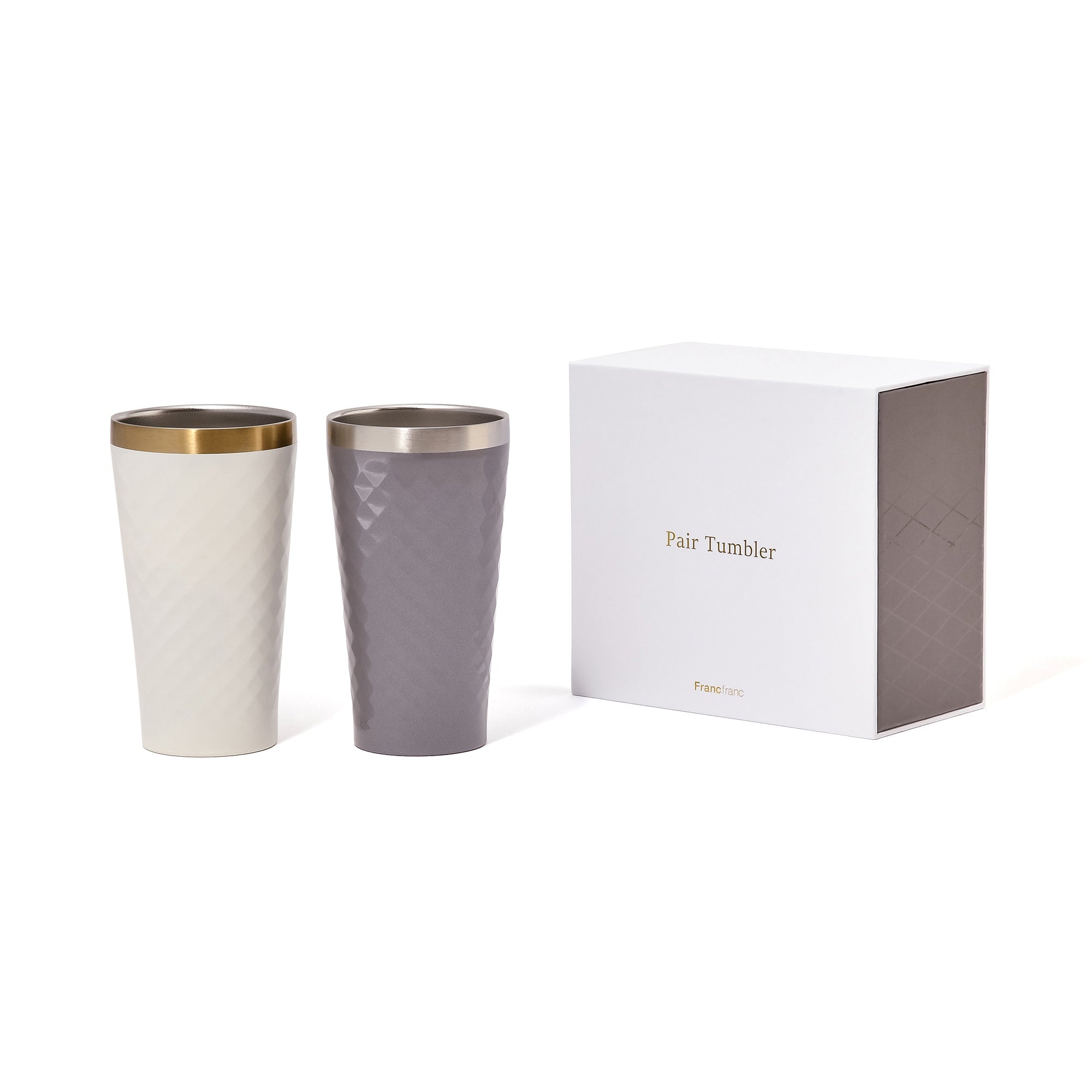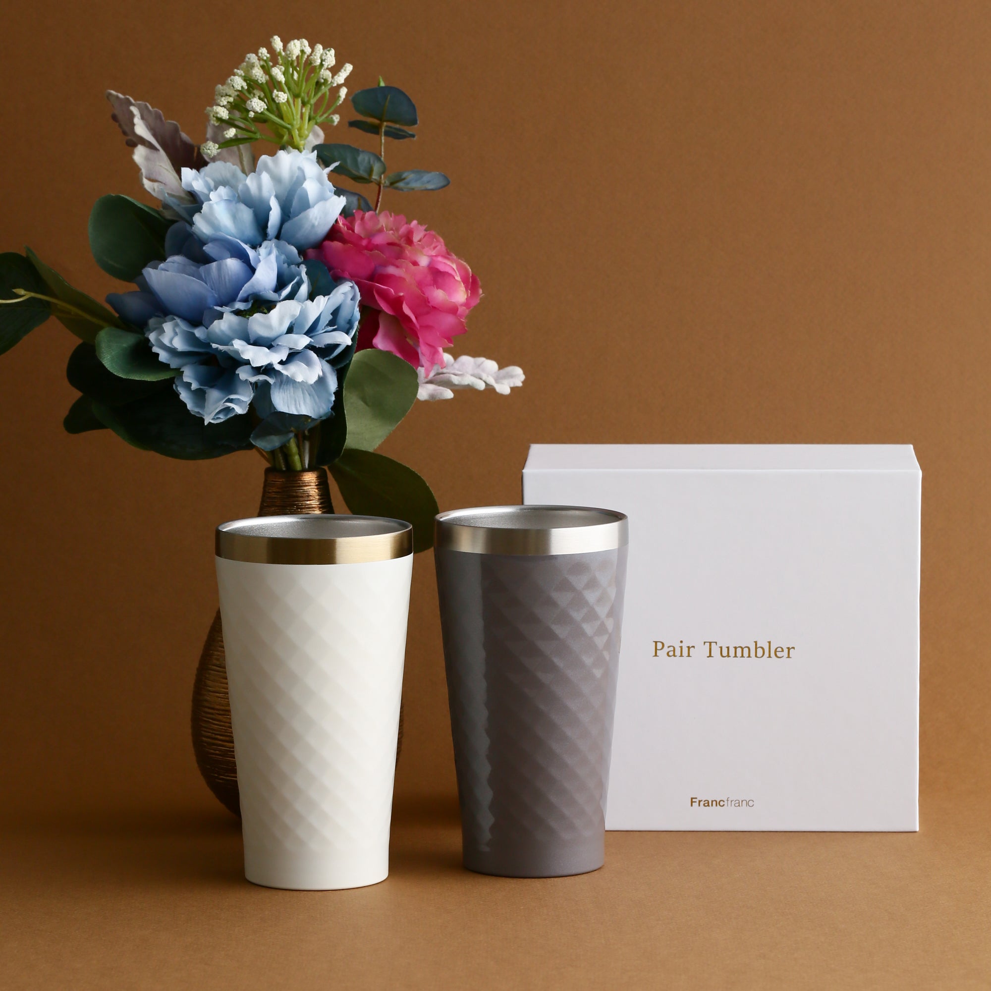 高級感のあるボックス入りでギフトにぴったりなペアのステンレスタンブラーです。贈る方に合わせて選んでいただけるよう、3テイストご用意しました。ホワイトとグレーの2色でそれぞれの飲み口にゴールドとシルバーのパイピングを施し、高級感ある仕上がりになっています。本体にはひし形格子状の模様が立体的に施され、光が当たった時の光沢感がポイントになっています。保冷、保温効果が高い真空2重構造で、飲みごろの温度を長くキープできます。また、断熱性に優れているので、冷たい飲み物を入れても結露が出ず、熱い飲み物を入れても持ちやすい構造です。お揃いのセラミックのシリーズとセットでのギフトもおすすめ。