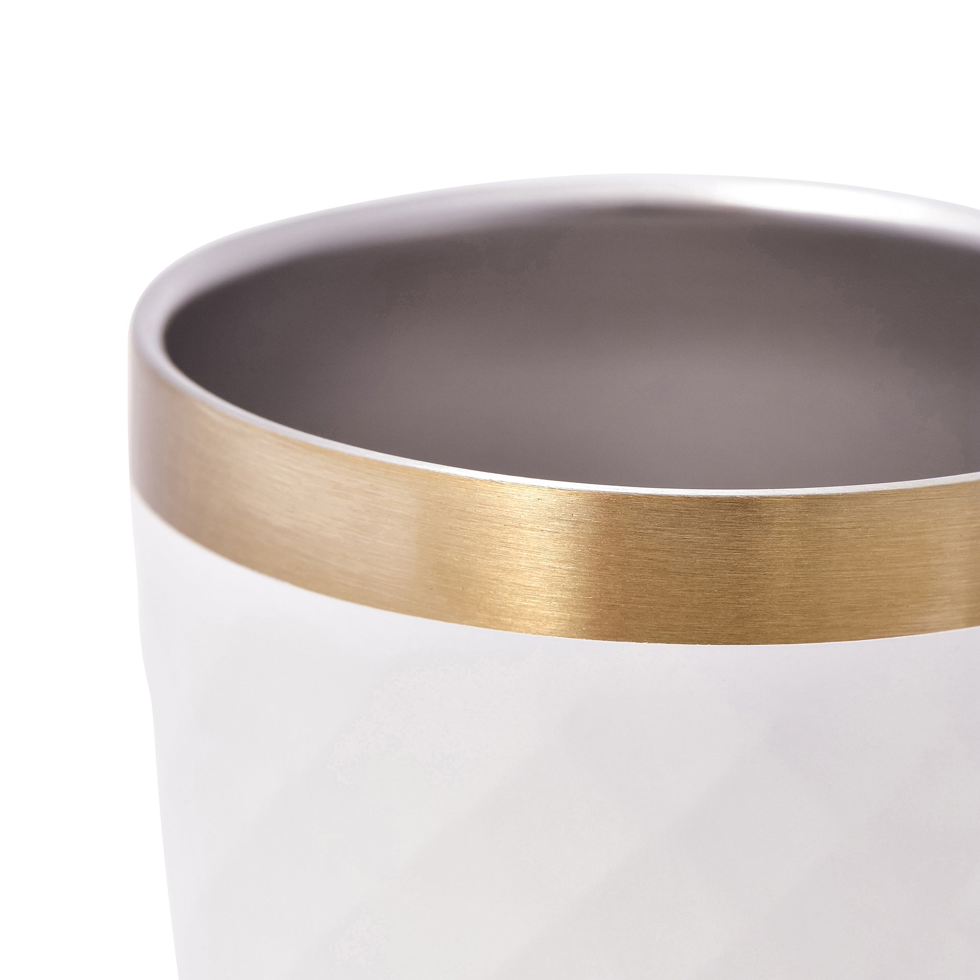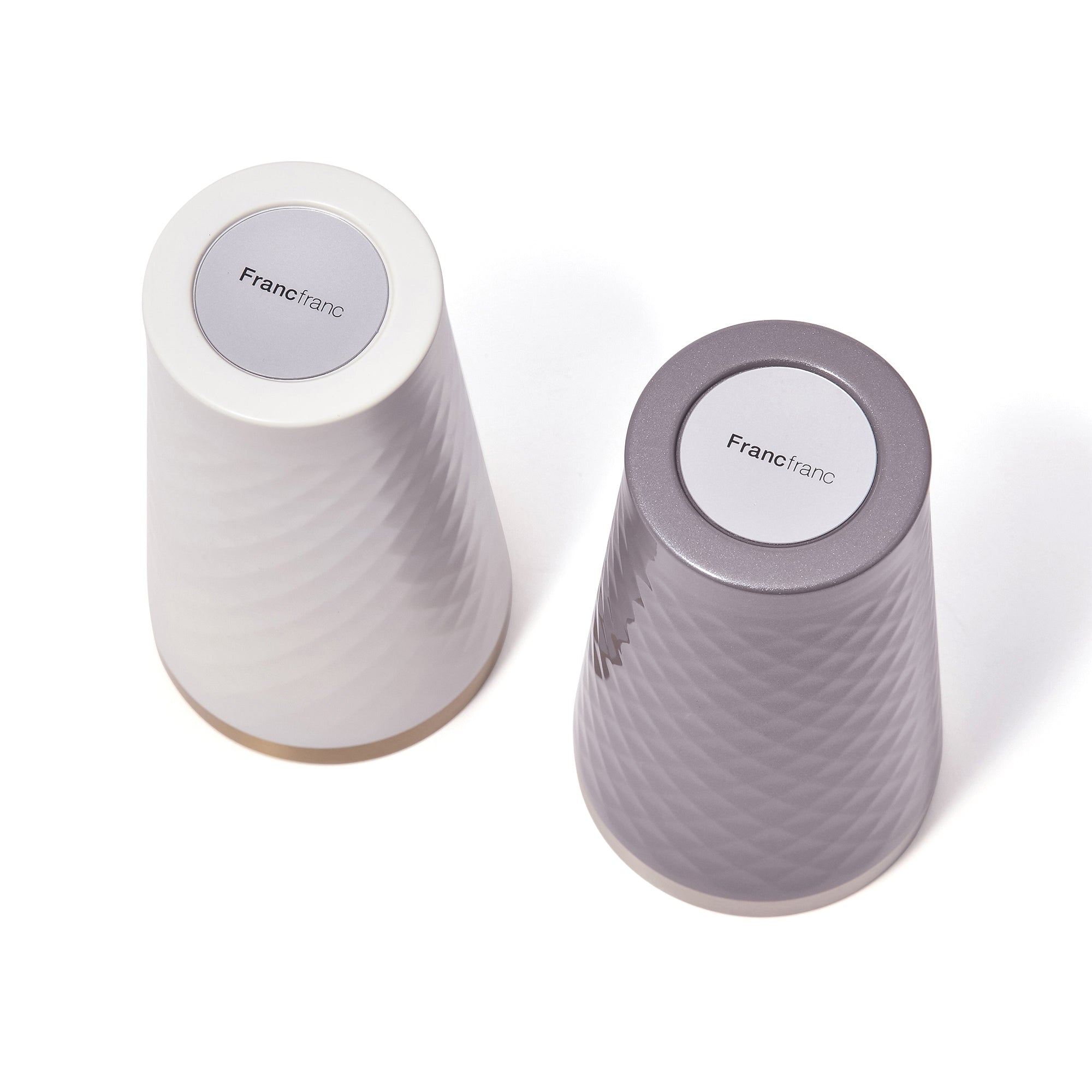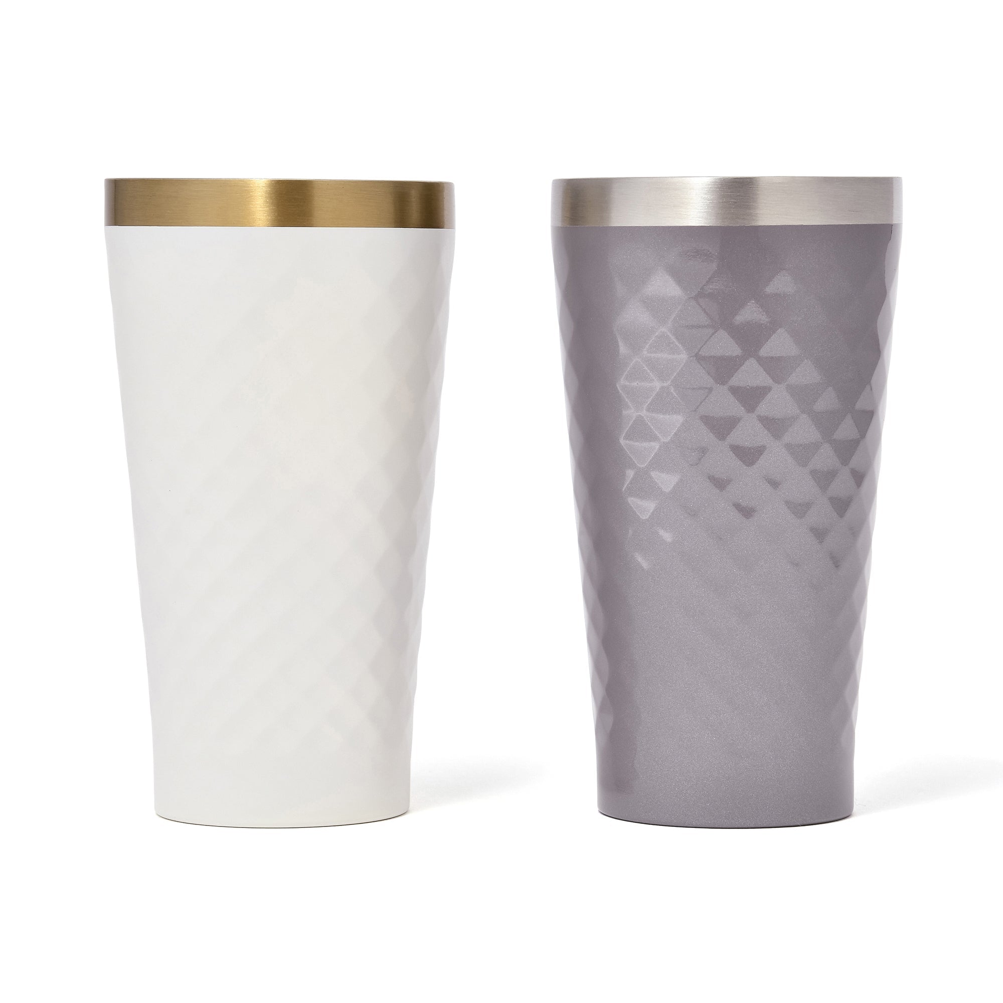 高級感のあるボックス入りでギフトにぴったりなペアのステンレスタンブラーです。贈る方に合わせて選んでいただけるよう、3テイストご用意しました。ホワイトとグレーの2色でそれぞれの飲み口にゴールドとシルバーのパイピングを施し、高級感ある仕上がりになっています。本体にはひし形格子状の模様が立体的に施され、光が当たった時の光沢感がポイントになっています。保冷、保温効果が高い真空2重構造で、飲みごろの温度を長くキープできます。また、断熱性に優れているので、冷たい飲み物を入れても結露が出ず、熱い飲み物を入れても持ちやすい構造です。お揃いのセラミックのシリーズとセットでのギフトもおすすめ。