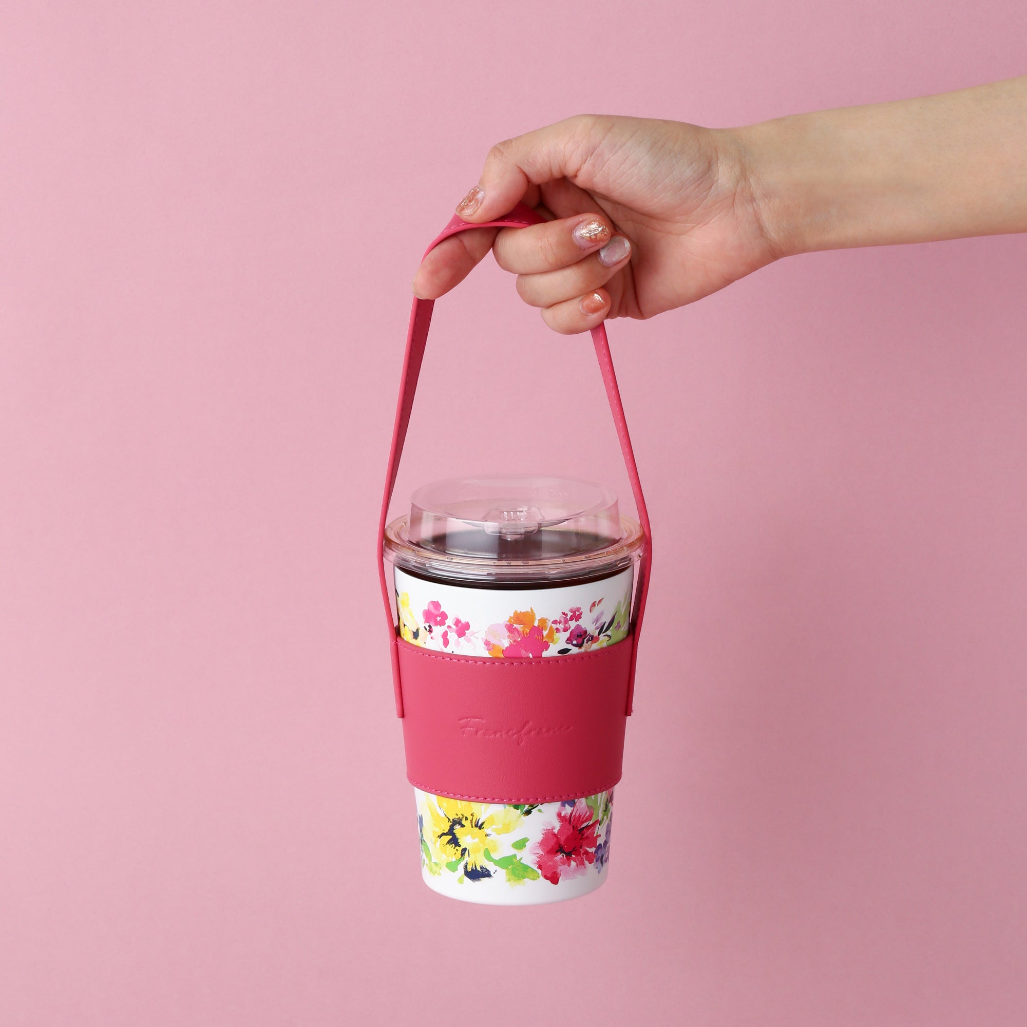 人気のコンビニコーヒーカバーに専用のフタとハンドル付きスリーブがついたセットが登場です。持ち運びの際に両手があくよう、腕にかけて持ち歩けるハンドルつきのスリーブが便利です。フタをつけると直接飲み物を入れる際に飲みやすくなる他、保温効果も高まります。ステンレスカップは従来通り、保温・保冷効果のある真空二重構造です。アイスのレギュラーサイズ/ラージサイズ(カップによってはホットのラージサイズ)がぴったり入ります。(※各コンビニのカップサイズによって異なります。)レギュラーサイズはすこし底が浮きますが、保冷効果はほぼ同じです。オフィスや車、ご自宅でドリンクを飲む際、長時間のみごろをキープできるほか、結露も防げるのでデスクが水浸しになることもありません。