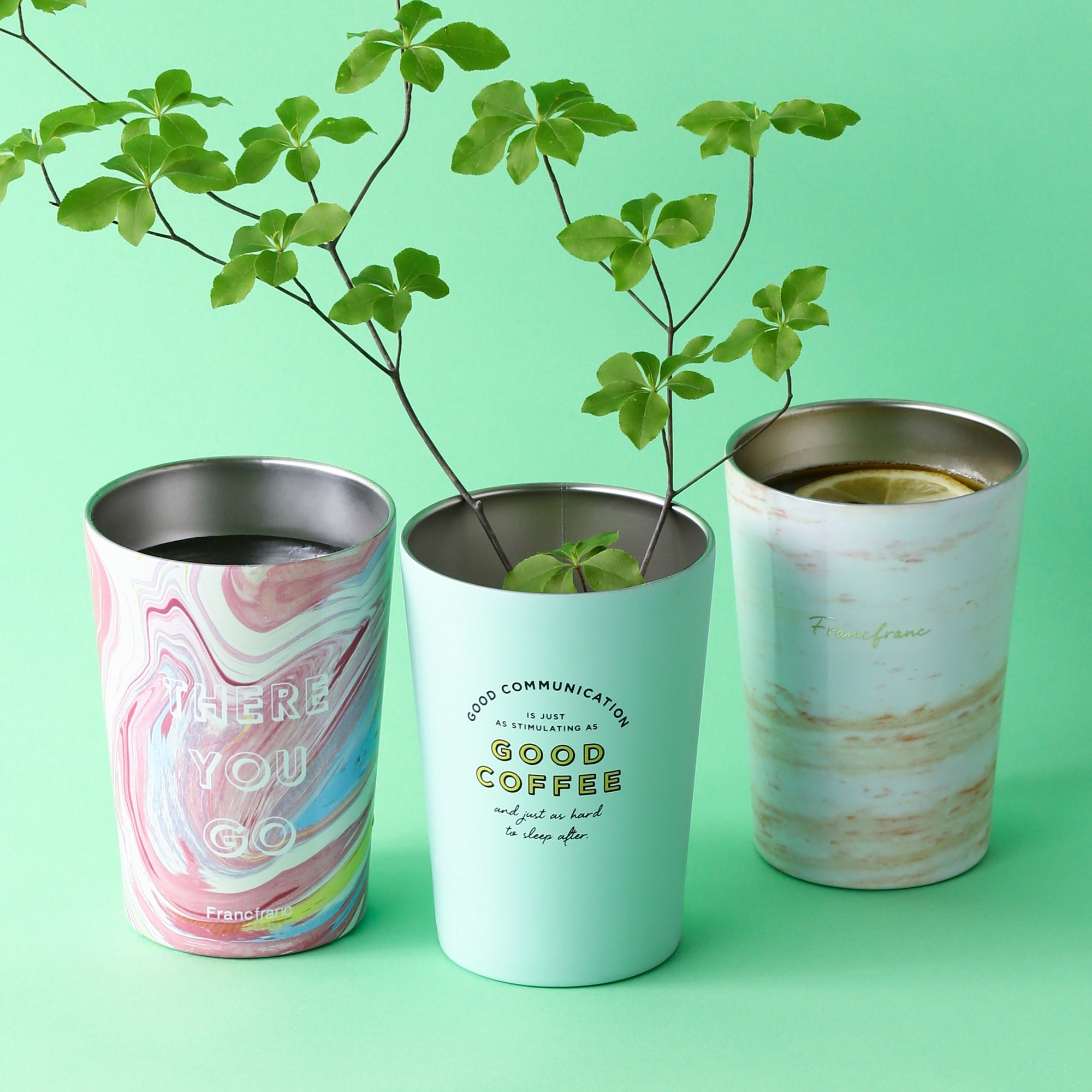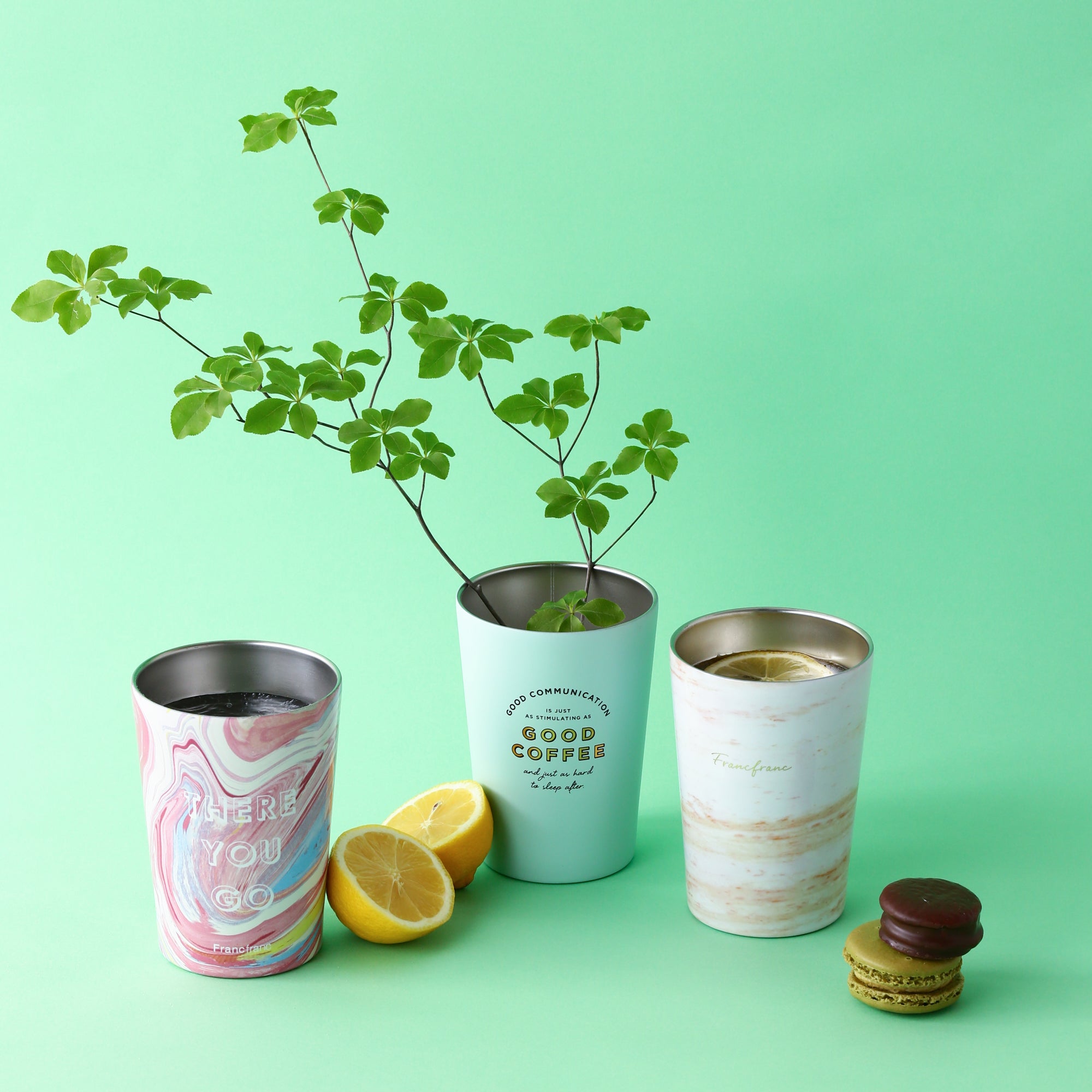 テイクアウトしたドリンクやコンビニコーヒーなどを、カップごと入れられる真空二重構造のステンレスカップに新柄登場です。アイスのレギュラーサイズ/ラージサイズ(カップによってはホットのラージサイズ)がぴったり入ります。(※各コンビニのカップサイズによって異なります。)レギュラーサイズはすこし底が浮きますが、保冷効果はほぼ同じです。オフィスや車、ご自宅でドリンクを飲む際、長時間のみごろをキープできるほか、結露も防げるのでデスクが水浸しになることもありません。もちろん直接飲み物を入れてもお使いいただけます。