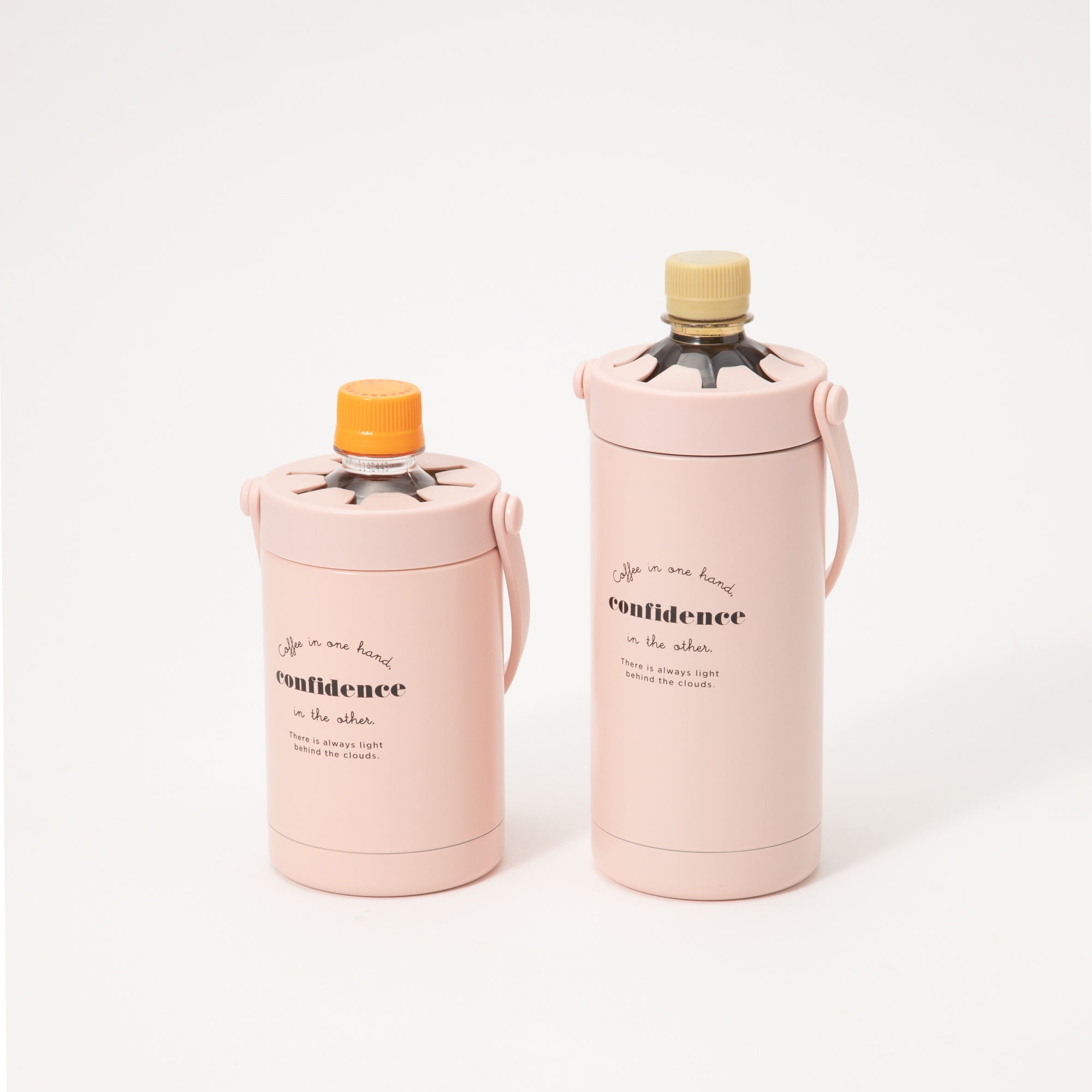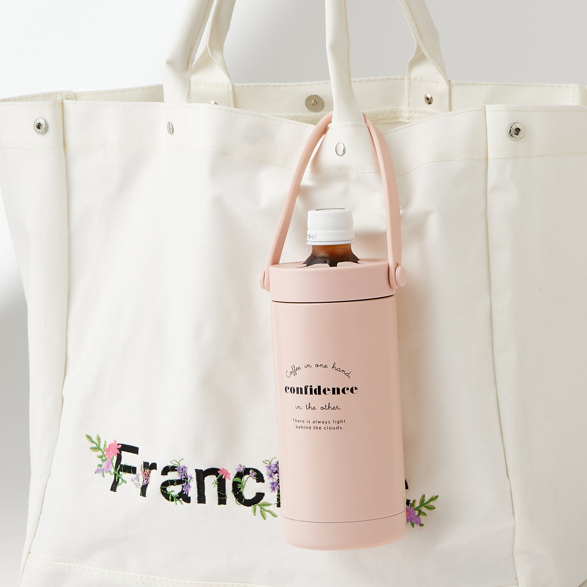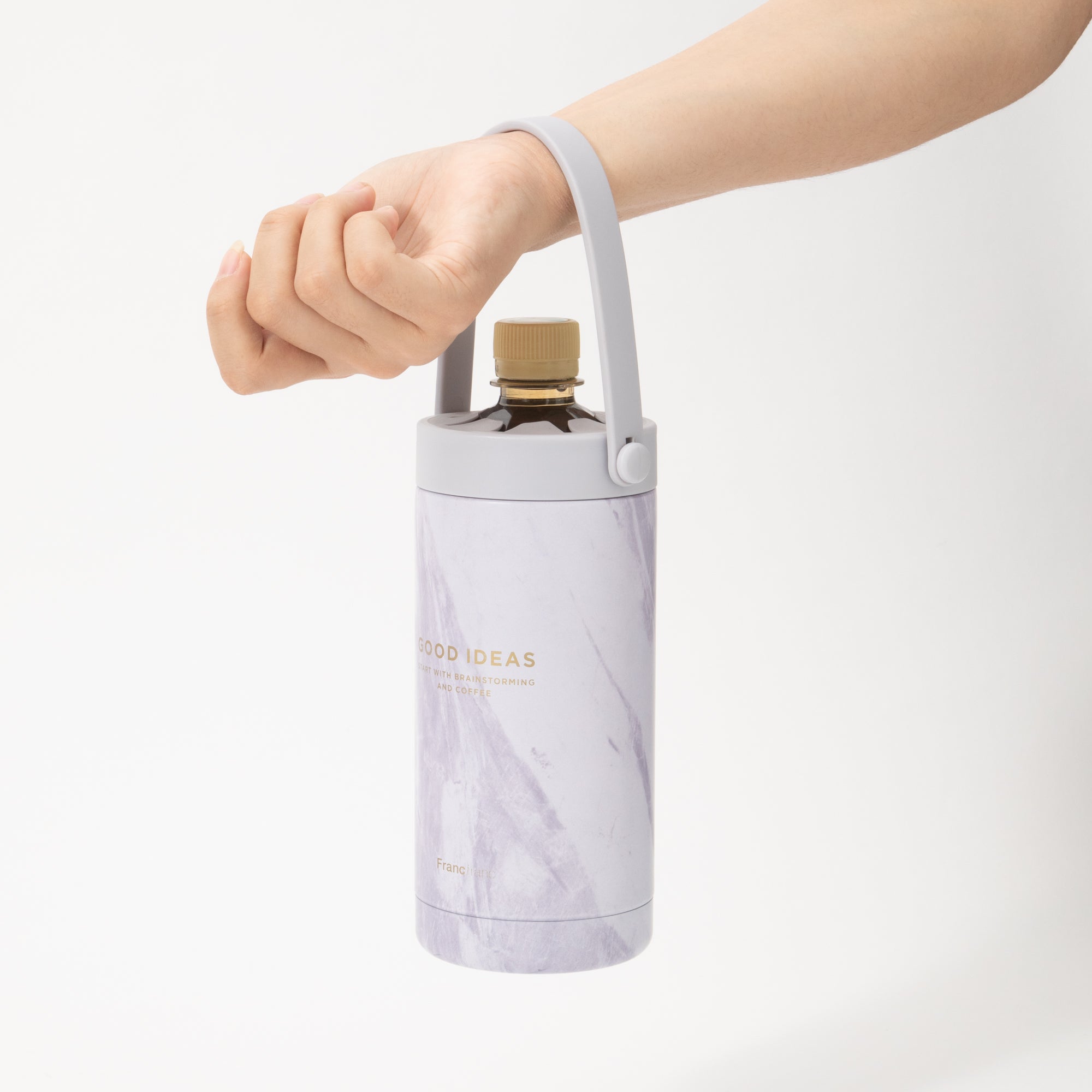 ペットボトルをそのまま入れるだけでひんやり感を長時間キープしてくれる、真空二重構造のペットボトルホルダーです。結露を防げるのでデスクが水滴で水浸しになることもありません。フタ部分がペットボトルのずれを防ぎ、ホルダーにセットしたままスムーズに飲むことができるのもポイントです。ハンドルつきで持ち運びに便利だからアウトドアでも大活躍。ハンドルは取り外せるので、バッグに付けることも可能です。バッグの中でスペースを取りがちなドリンクを外側に付けることでバッグを広々使うことができます。様々なシーンでひんやりドリンクとFrancfrancらしいスタイリッシュなデザインをお楽しみください。
