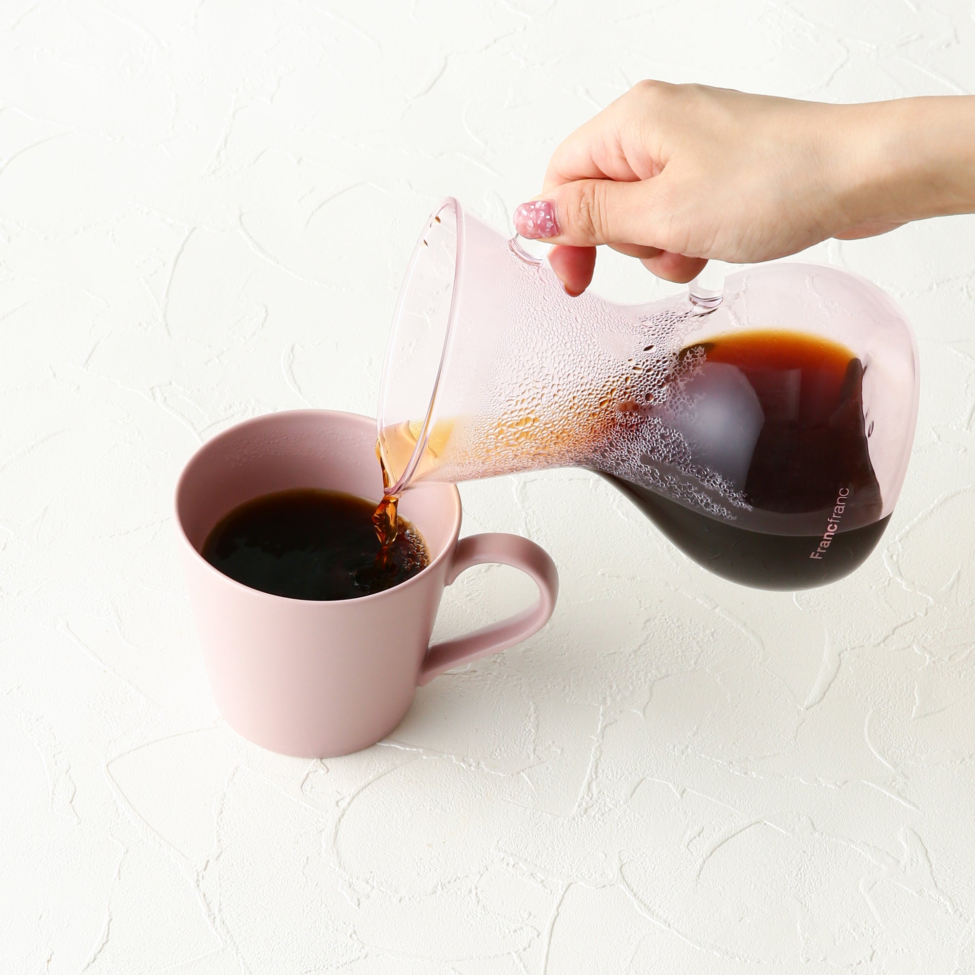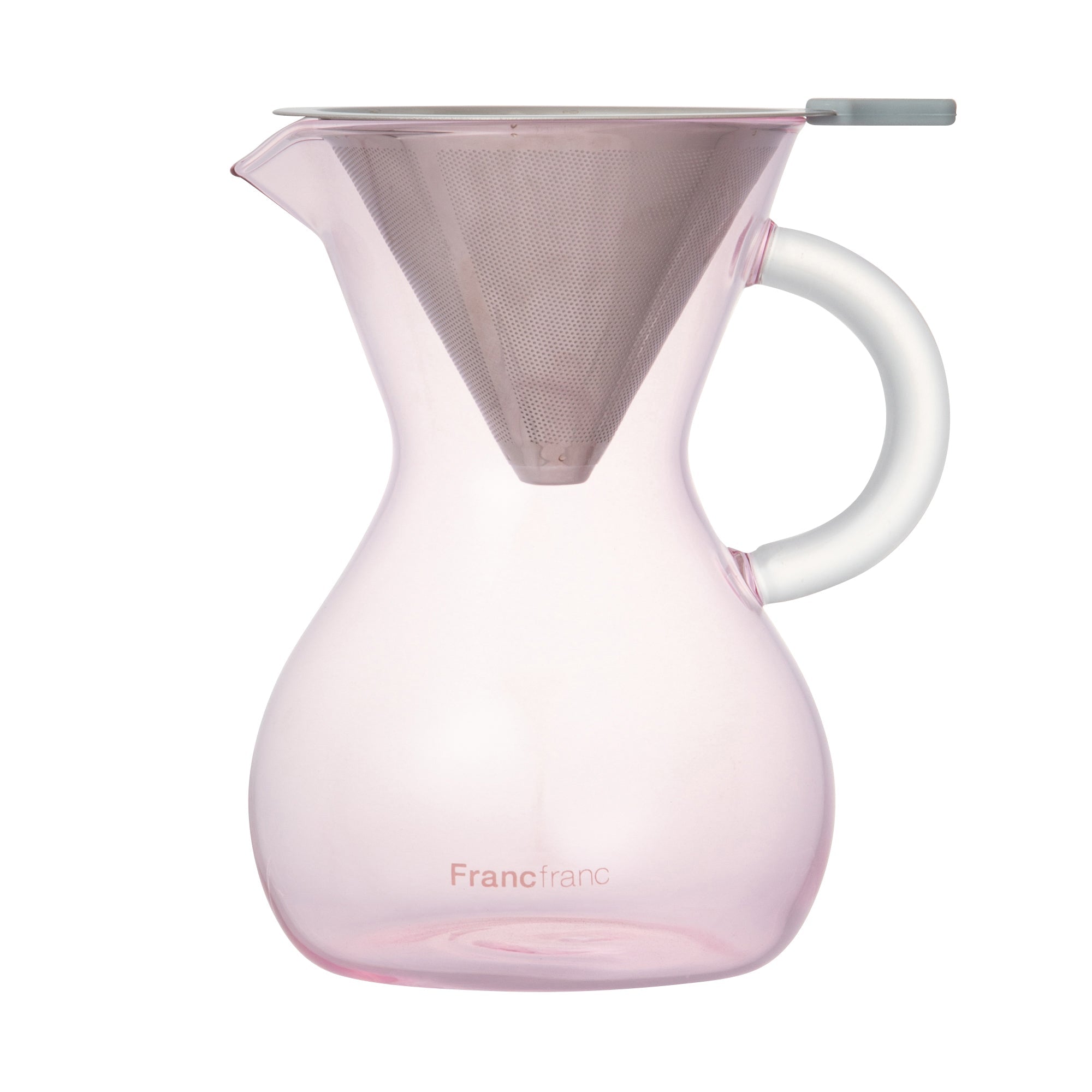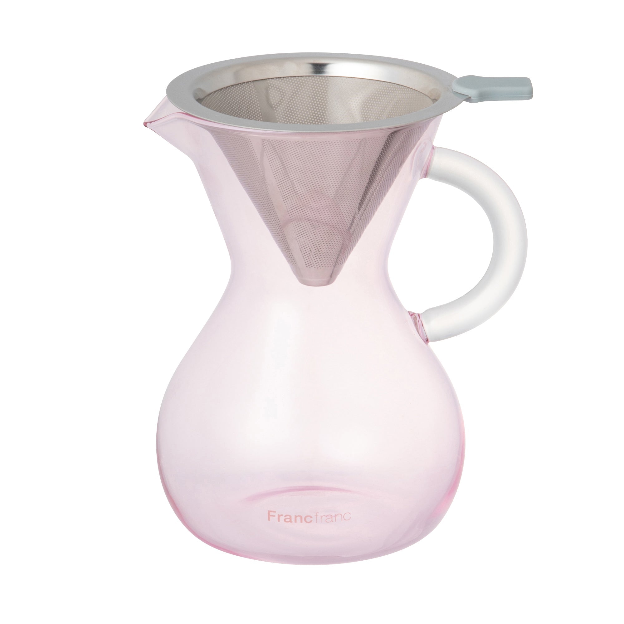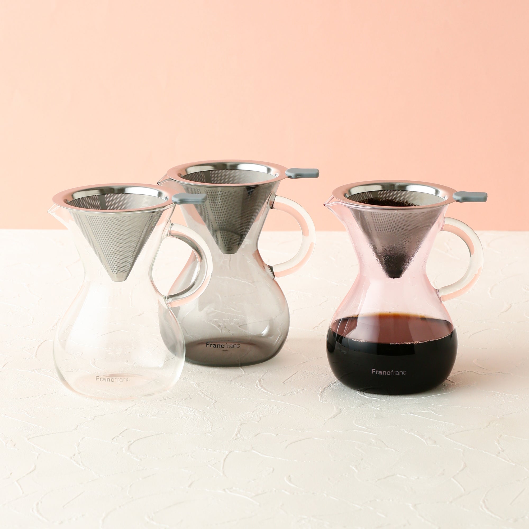 ガラスのサーバーとステンレス製ドリッパーのセットです。ステンレスフィルターは使用後に洗うことで何度でも繰り返し使用できます。ゴミが出ないためエコで、フィルターを買う手間がないのもメリット。金属ならではのスタイリッシュなデザインもポイントです。ペーパーフィルターと異なりコーヒーの油分がそのまま抽出されるので、豆の旨味やコクをダイレクトに味わえます。しっかりとした味わいが好きな方におすすめです。カラーグラスとの組み合わせがポイントです。サーバーにはさりげなくFrancfrancのロゴをあしらいました。サーバー単体でピッチャー代わりに使うこともできます。