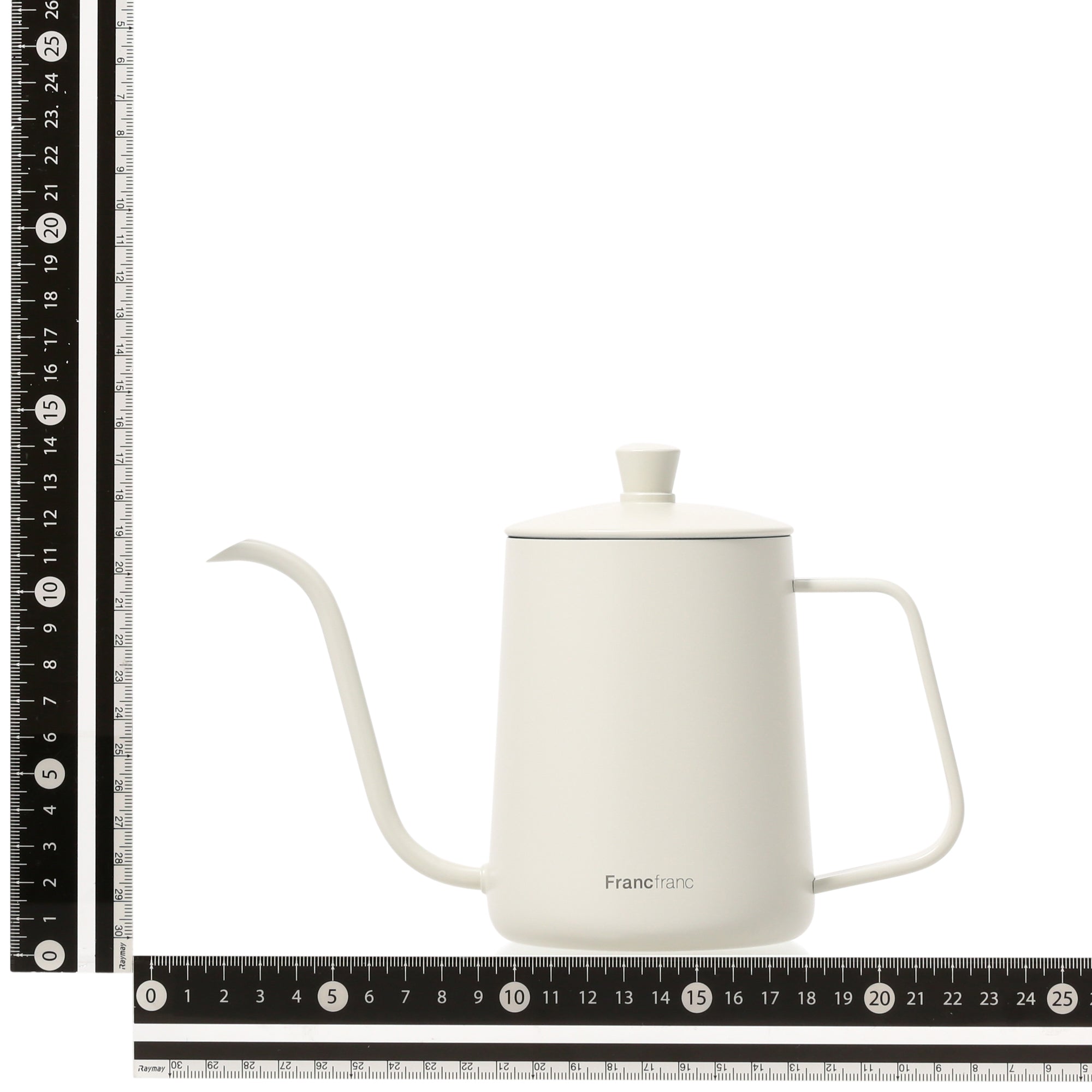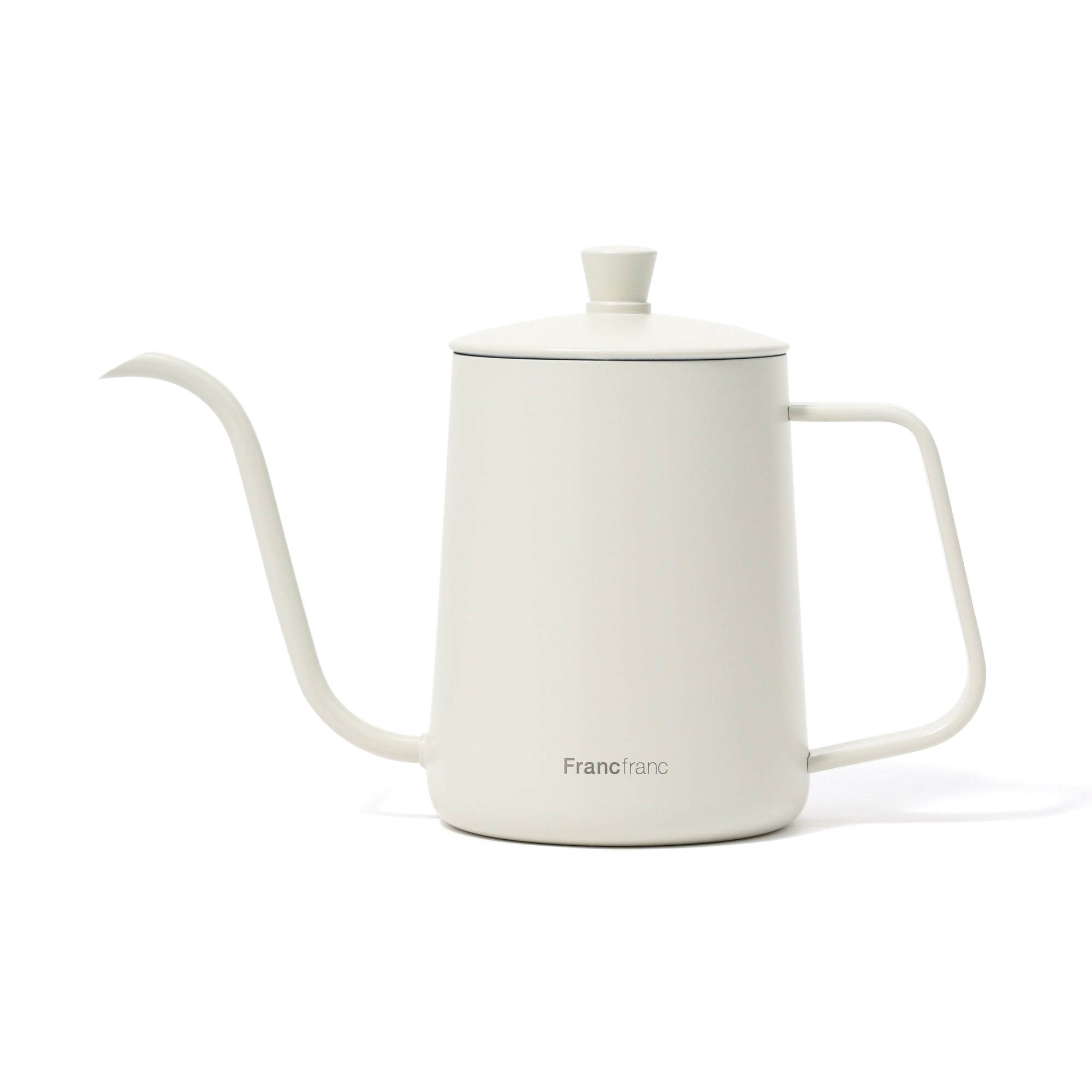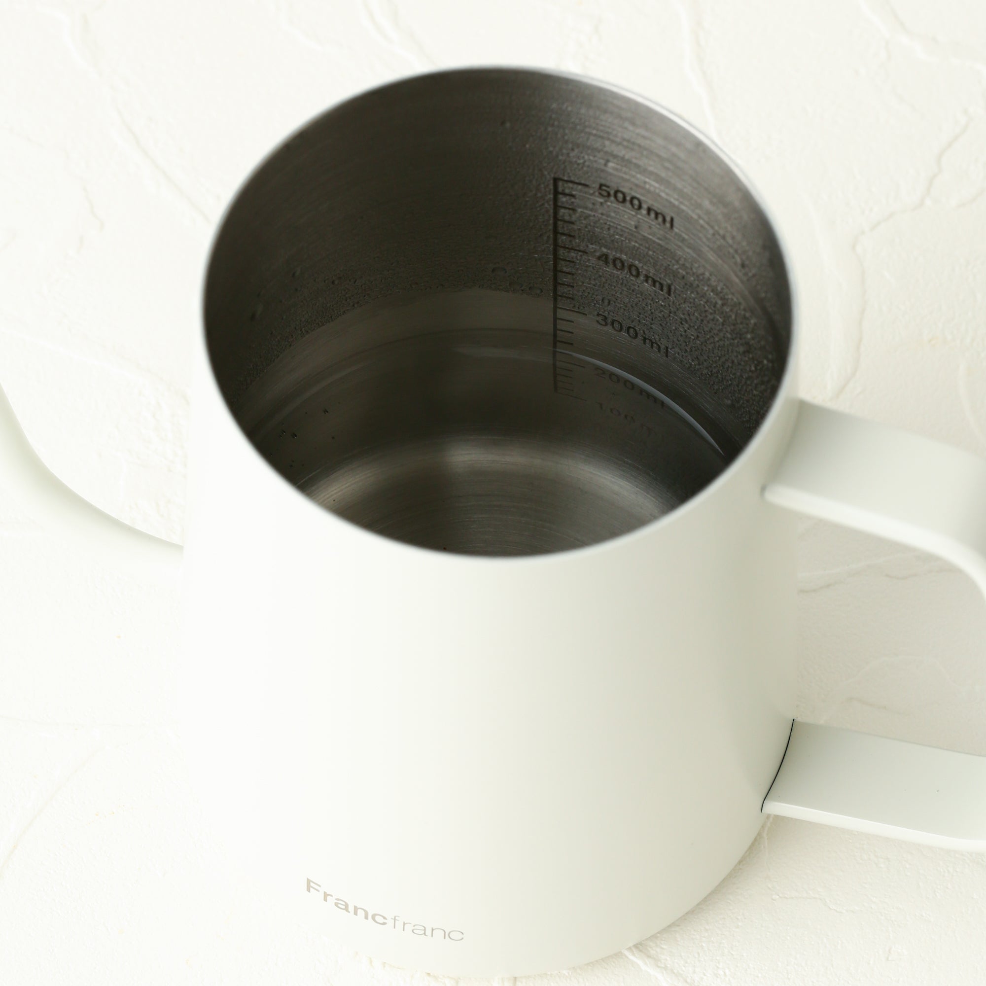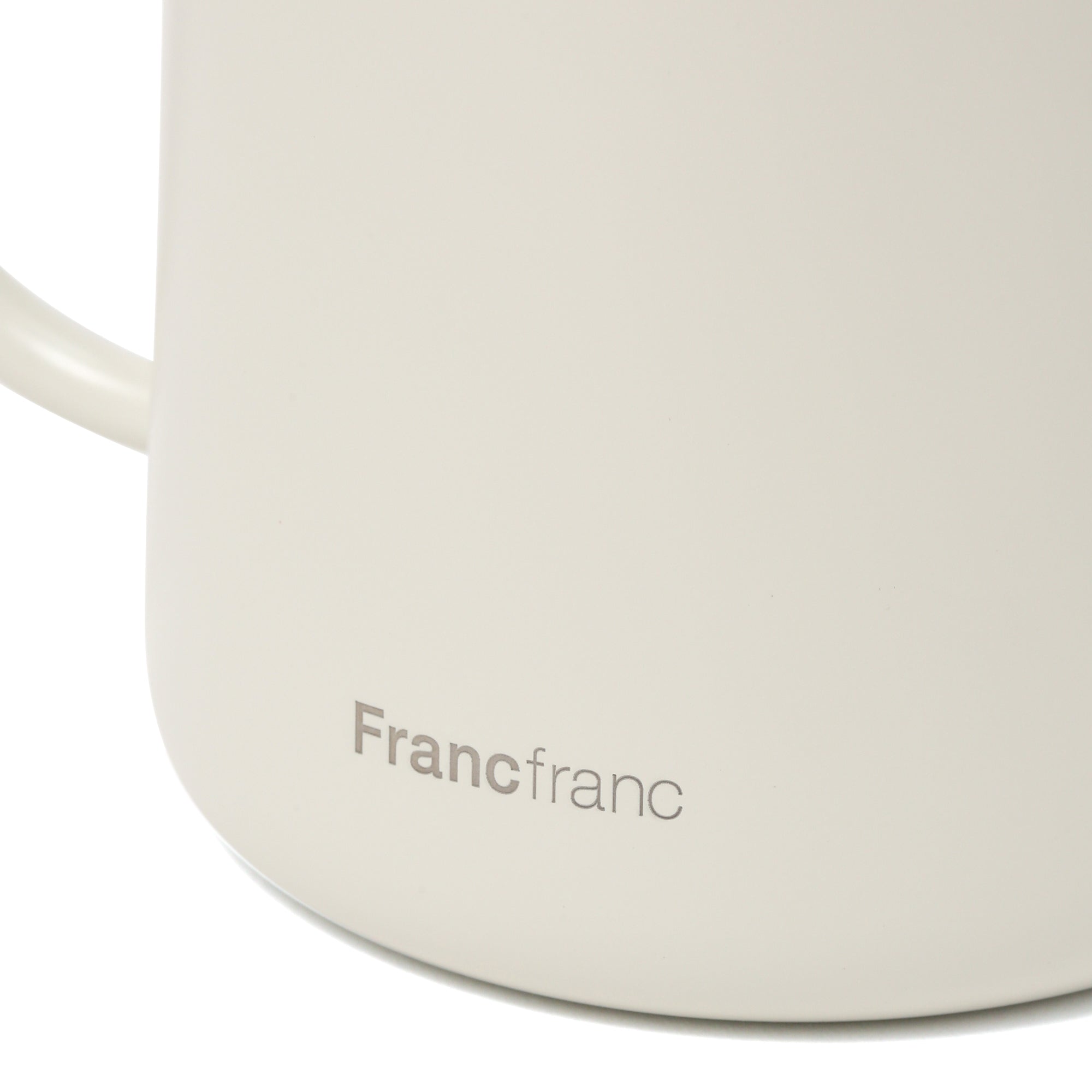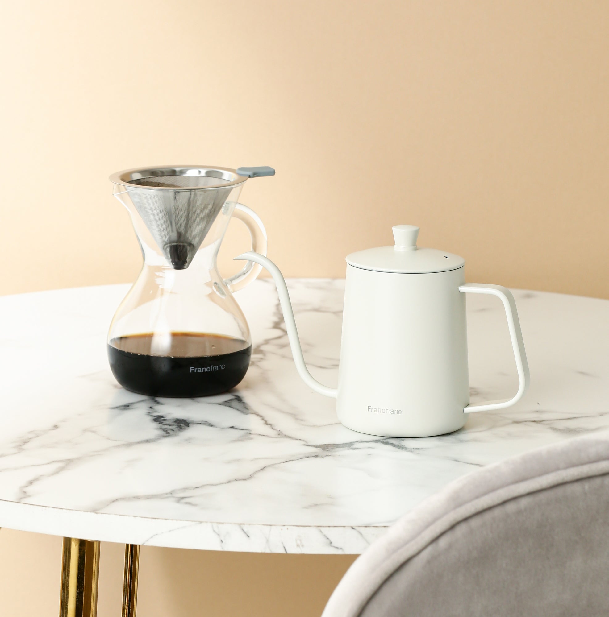 おうちでおいしいコーヒーのある暮らしを始めたい方におすすめ。ハンドドリップで簡単にコーヒーを淹れられる、細口ドリップポットです。ネックの太さが一定になった細口タイプなので、一定の湯量でゆっくりとお湯を注ぐことができ、初心者の方でもムラなく安定した味のコーヒーを淹れられます。内側には目盛がついているため適切な湯量を測ることができます。お持ちのケトルでお湯を沸かしてからこのポットに入れ替えるとちょうど適温になり、すぐにドリップを始められるのも便利です。持ち手は指が4本入るように大きめなので持ちやすく、本体は熱くなるので誤って触ってしまわないよう火傷防止にもなる設計です。フタ付きなので温度を逃がしにくくホコリやごみが入りません。また通気口がついているのでお湯をスムーズに注ぐことができます。さりげなくFrancfrancのロゴがおしゃれなポイントです。ステンレスのフィルターを使ってハンドドリップすることで、コーヒーの油分がそのまま抽出され、豆の旨味やコクを逃がさずに味わえます。コーヒー好きの方へのセットでプレゼントするのもおすすめです。ハンドドリップは泡の膨らみやコーヒーの香りを感じながら、コーヒーを淹れる時間は大切なリラックスタイムに。