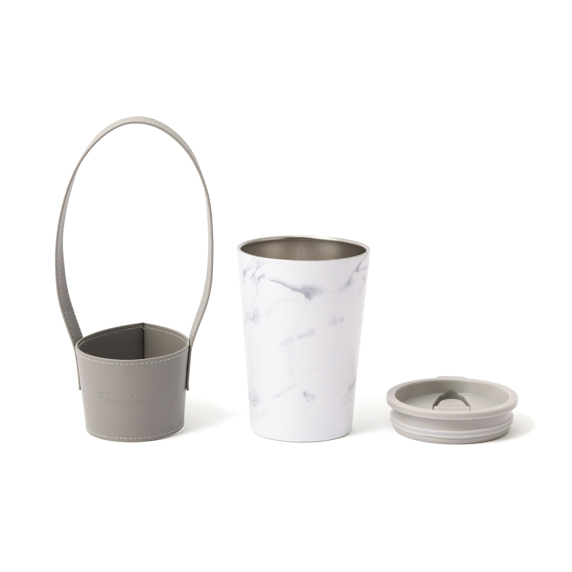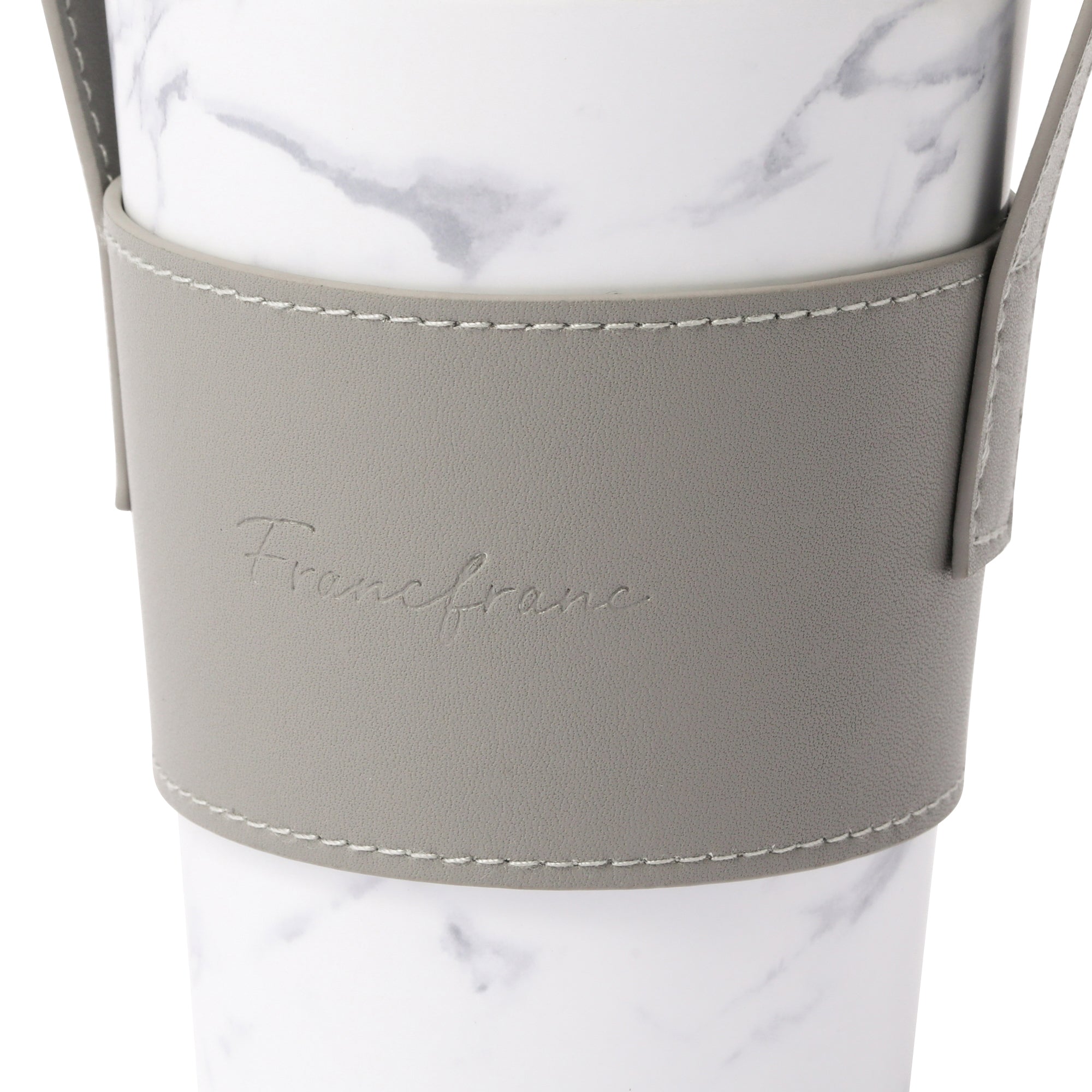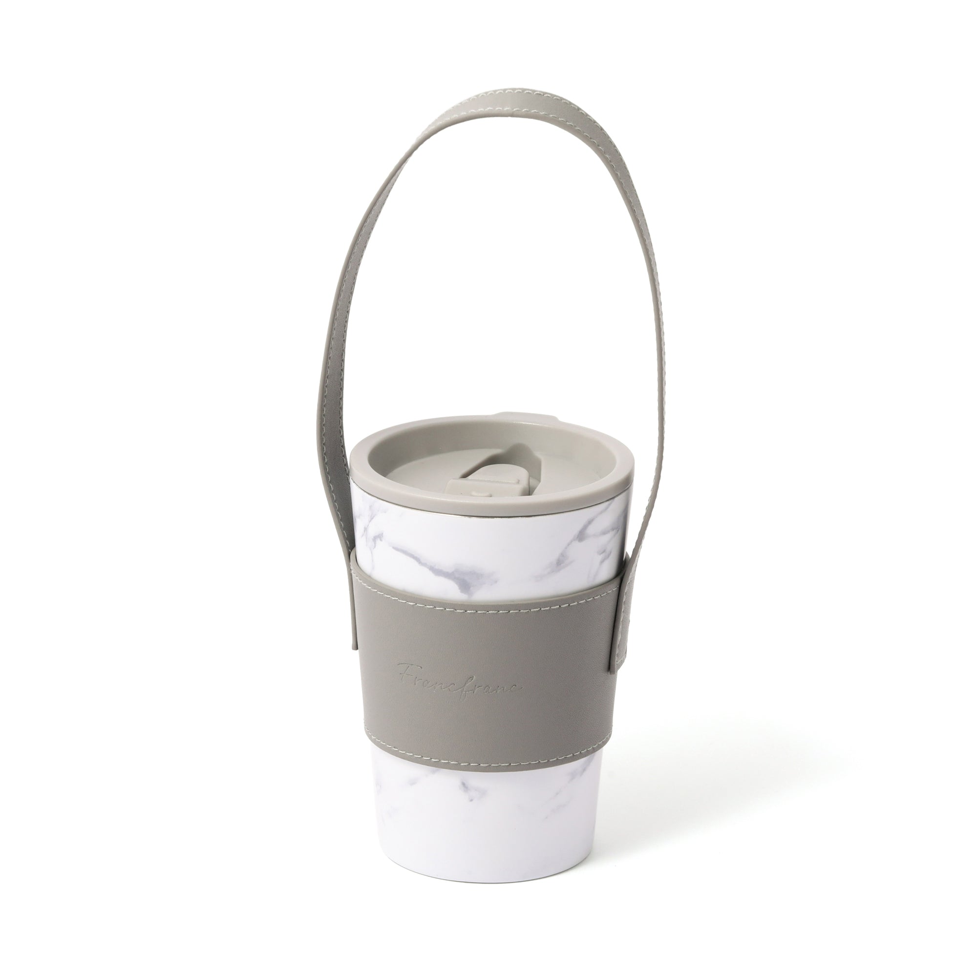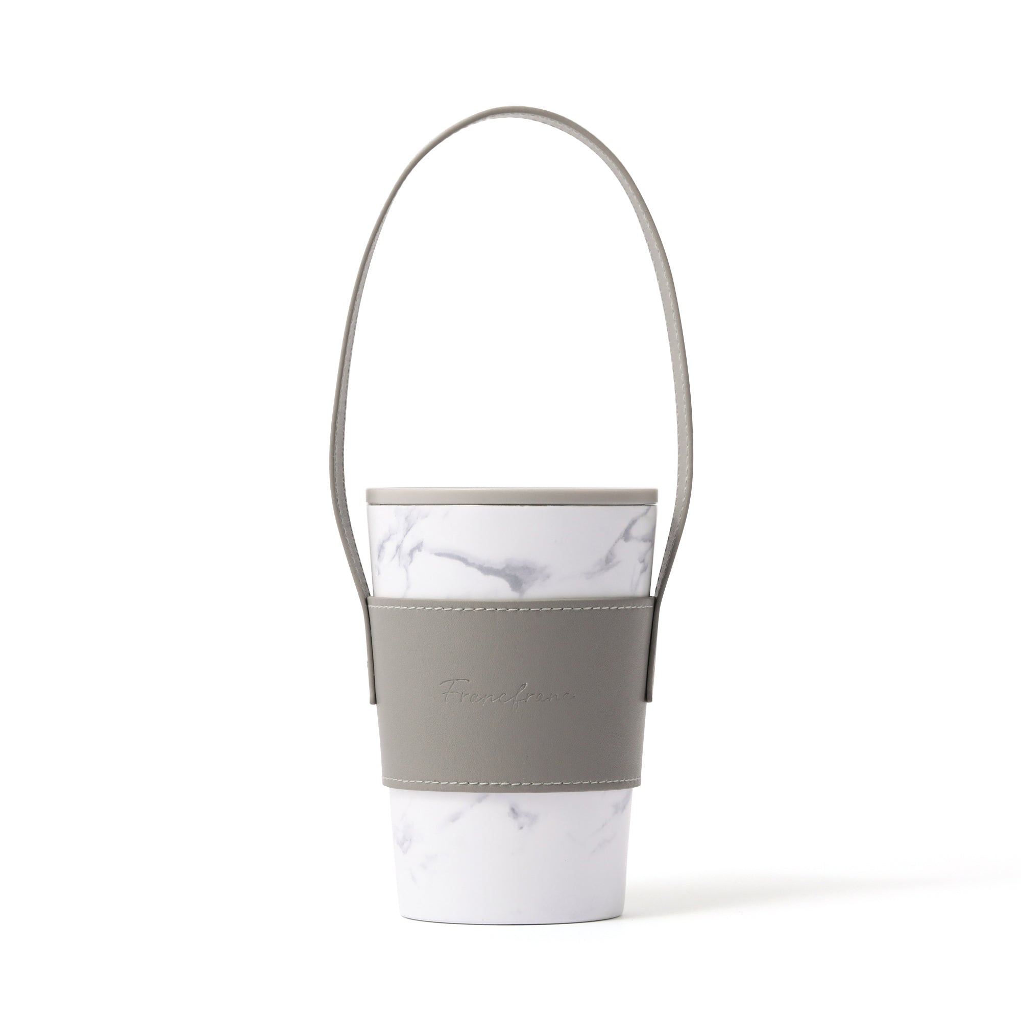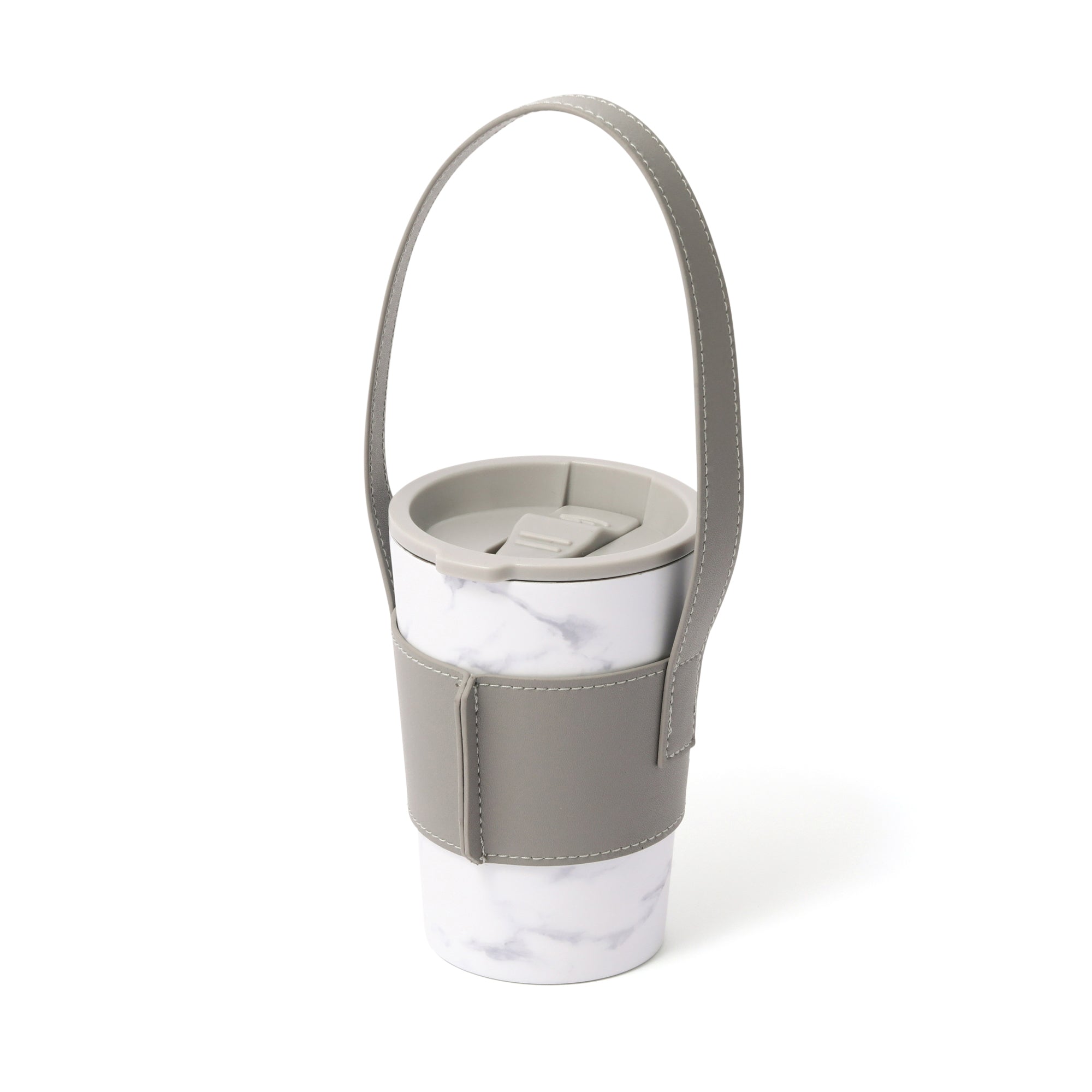 人気のコンビニコーヒーカバーに専用のフタとハンドル付きスリーブがついたセットです。 ハンドル付きスリーブを腕に掛ければ両手が空くので持ち運びに大変便利です。 フタをつけると直接飲み物を入れる際に飲みやすくなるほか、保温効果も高まります。 ステンレスカップは保温保冷効果のある真空二重構造で、アイスのレギュラー・ラージサイズが入ります。レギュラーサイズを入れた場合は少し底が浮きますが保冷効果はほぼ変わりません。カップの種類によってはホットのラージサイズにも対応可能です。(※各コンビニのカップによって異なります。) オフィスや車、ご自宅でドリンクを飲む際に長時間のみごろをキープできるほか、結露も防げるのでデスクが水浸しになることもありません。 ホワイト系の大理石柄がエレガントで高級感たっぷりです。