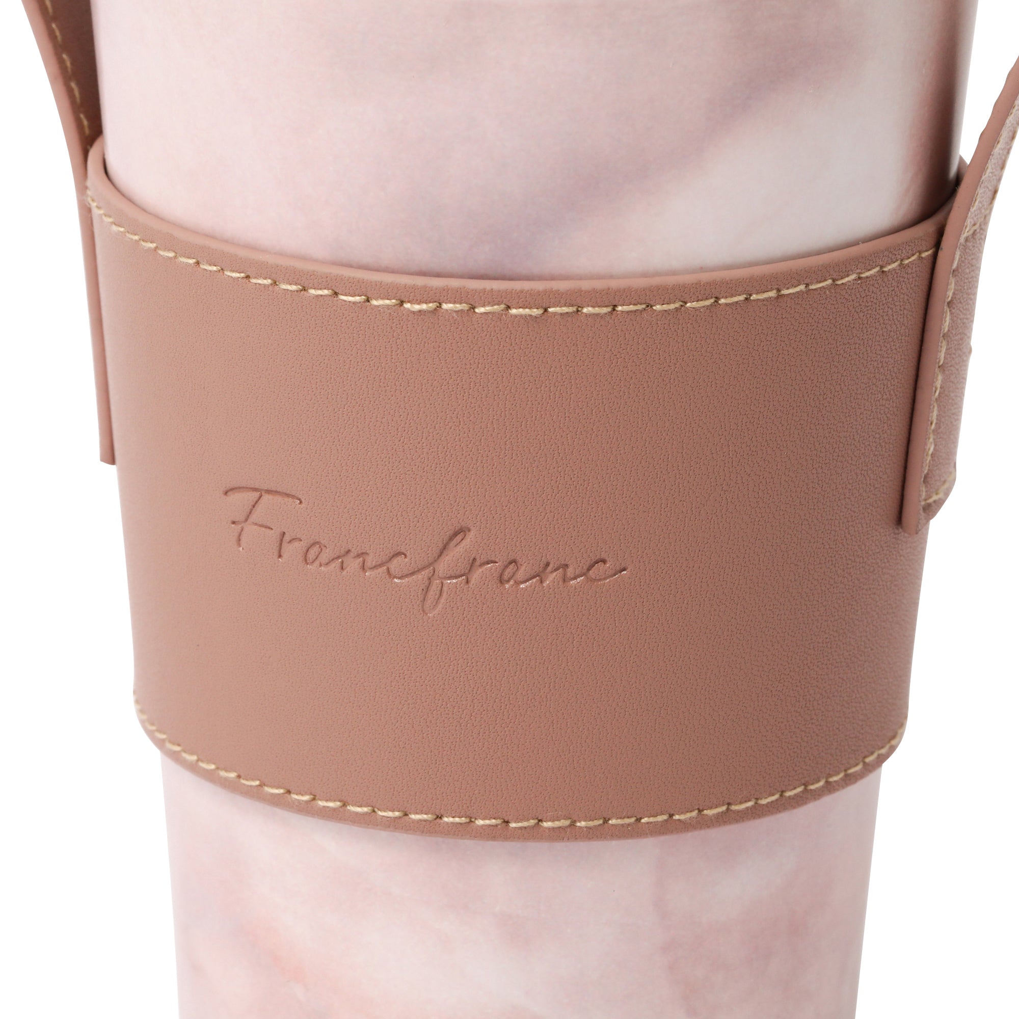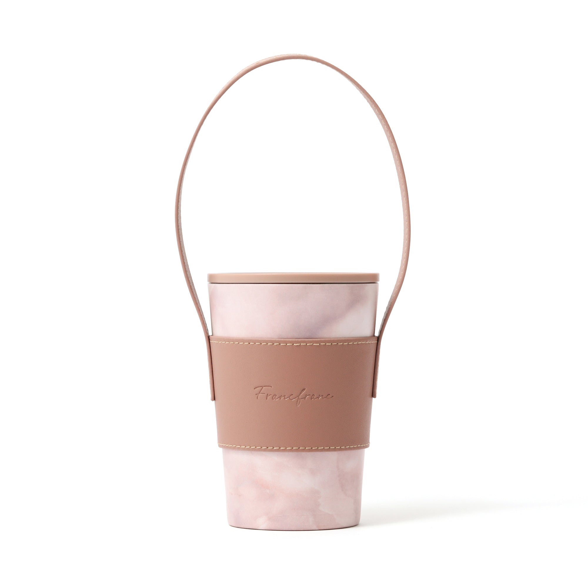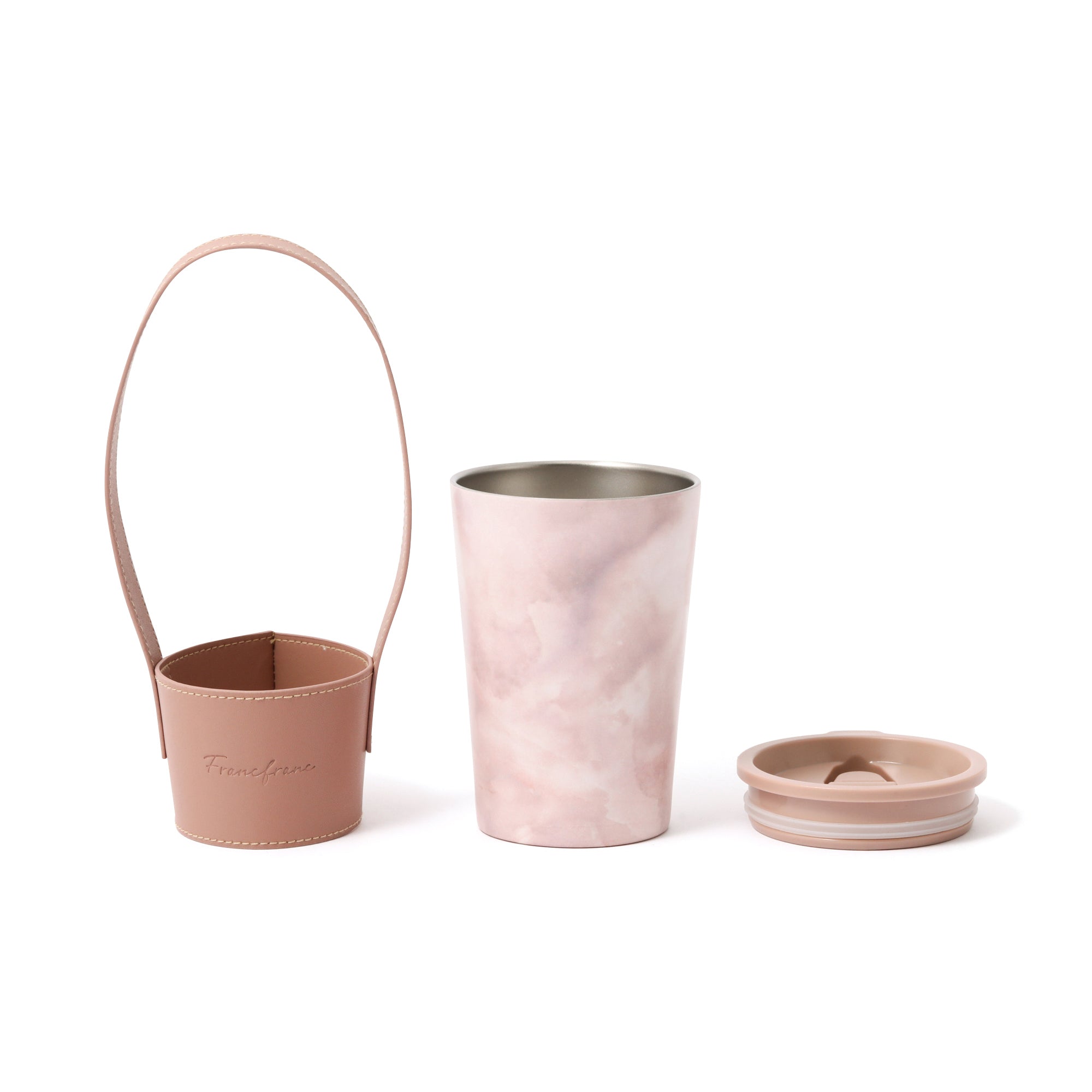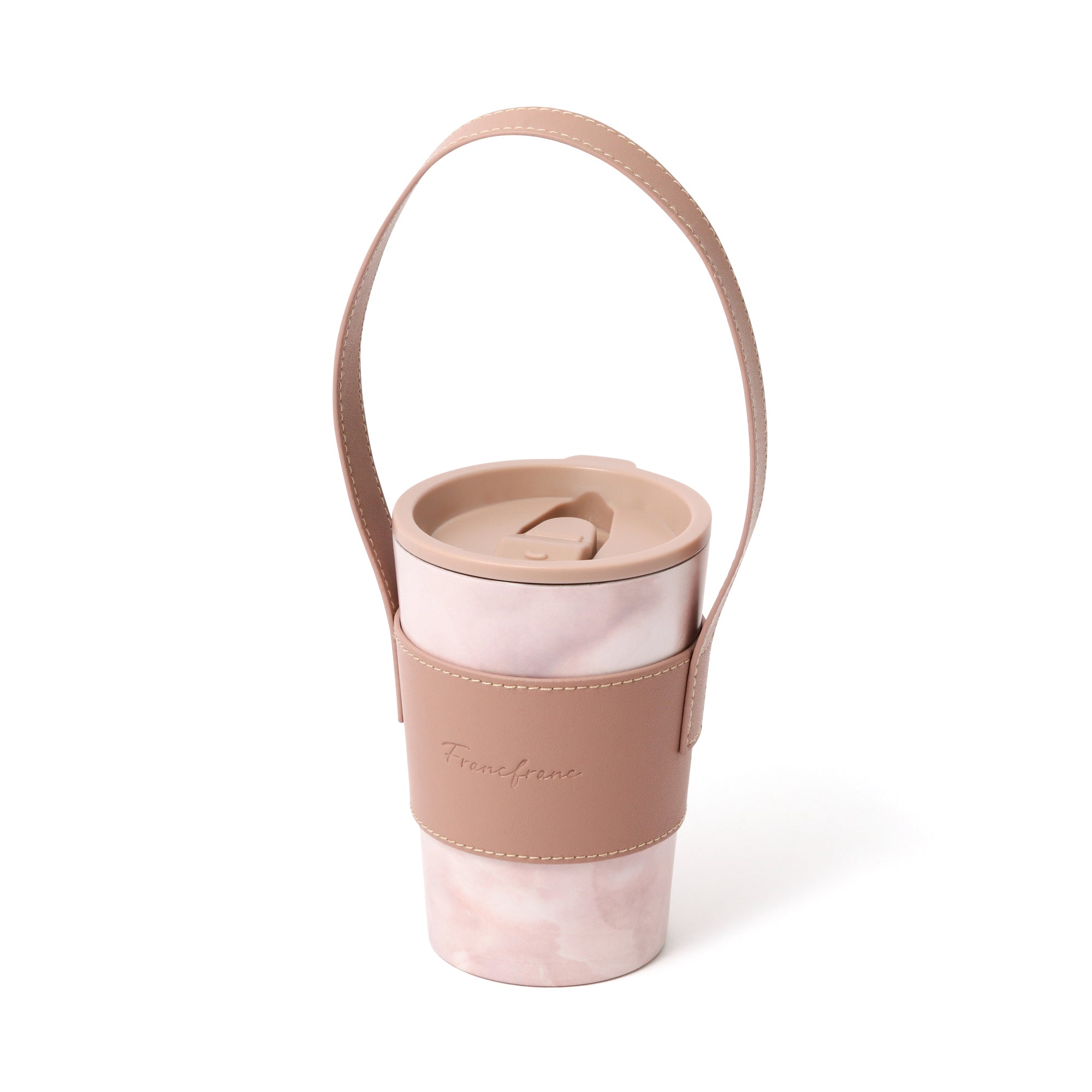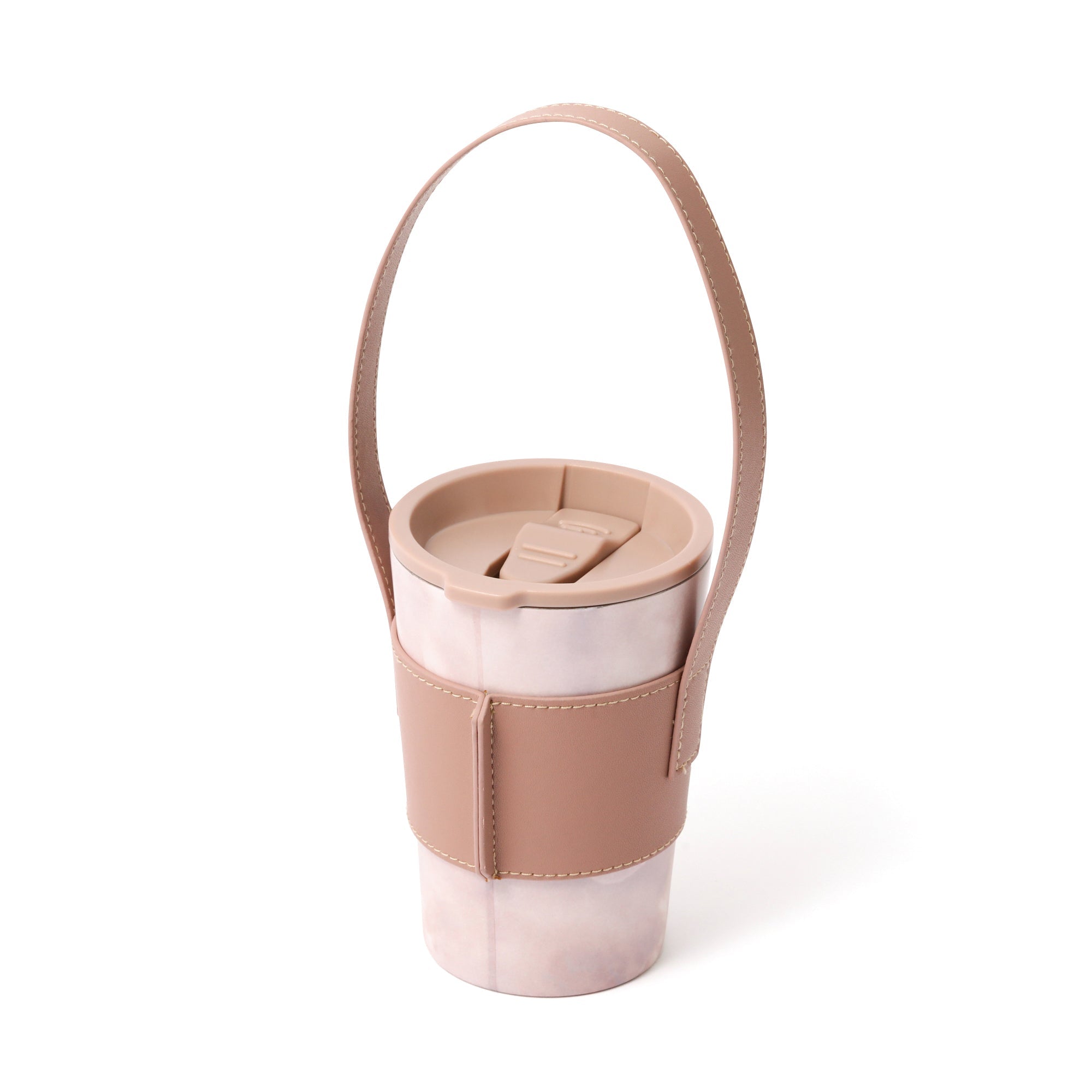 人気のコンビニコーヒーカバーに専用のフタとハンドル付きスリーブがついたセットです。 ハンドル付きスリーブを腕に掛ければ両手が空くので持ち運びに大変便利です。 フタをつけると直接飲み物を入れる際に飲みやすくなるほか、保温効果も高まります。 ステンレスカップは保温保冷効果のある真空二重構造で、アイスのレギュラー・ラージサイズが入ります。レギュラーサイズを入れた場合は少し底が浮きますが保冷効果はほぼ変わりません。カップの種類によってはホットのラージサイズにも対応可能です。(※各コンビニのカップによって異なります。) オフィスや車、ご自宅でドリンクを飲む際に長時間のみごろをキープできるほか、結露も防げるのでデスクが水浸しになることもありません。 ナチュラルな大理石柄が普段使いにぴったりです。
