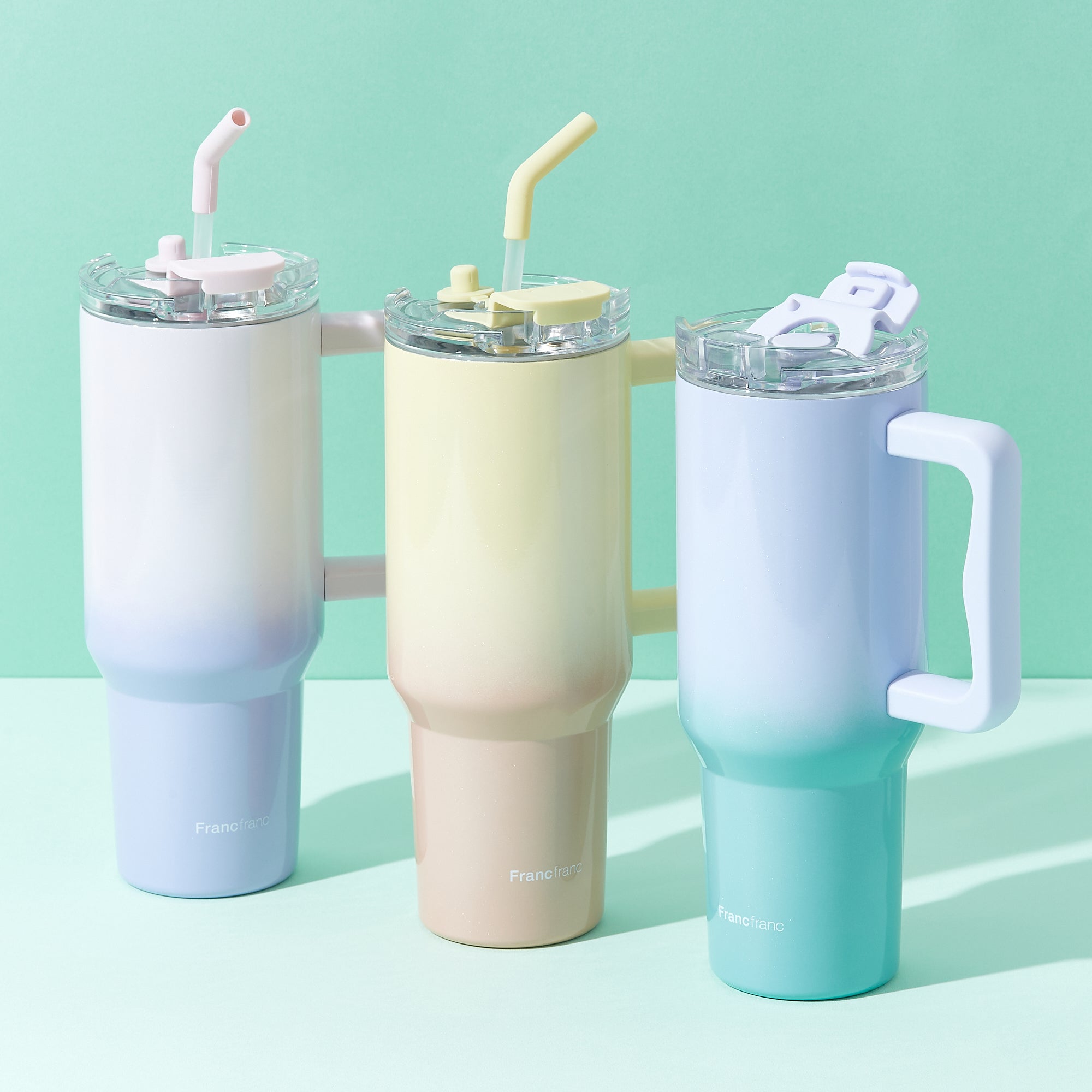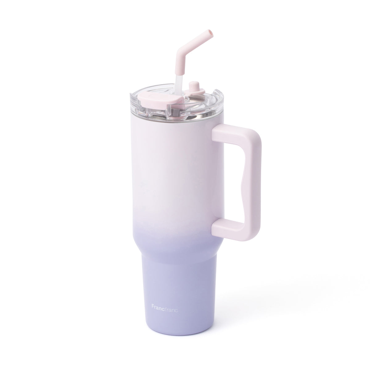 グラデーションカラーが目を引く、大型ステンレスマグです。1.1Lのたっぷり大容量。飲みごろ温度をキープしてくれるから長時間のホームシアターのお供にぴったりです。ストロー付きなのでドラマや映画から目を離さず飲むことができるのも嬉しいポイント。他にもフェイスパック時の水分補給にもおすすめです。直飲みも可能な2WAYタイプだから使用シーンに合わせてお使いいただけます。フタにはパッキンもついており、逆さにしなければストローをつけた状態でもある程度の持ち運びが可能。近所のジムにそのまま持って行ったり、キャンプなどでも活躍します。底部分は少しすぼまっているので、車のドリンクホルダーに入れてドライブのお供にもおすすめです。※一部車種や市販のドリンクホルダーの種類によっては入らないことがあります。