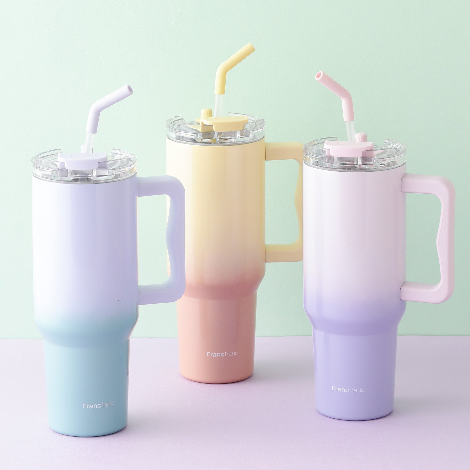 グラデーションカラーが目を引く、大型ステンレスマグです。1.1Lのたっぷり大容量。飲みごろ温度をキープしてくれるから長時間のホームシアターのお供にぴったりです。ストロー付きなのでドラマや映画から目を離さず飲むことができるのも嬉しいポイント。他にもフェイスパック時の水分補給にもおすすめです。直飲みも可能な2WAYタイプだから使用シーンに合わせてお使いいただけます。フタにはパッキンもついており、逆さにしなければストローをつけた状態でもある程度の持ち運びが可能。近所のジムにそのまま持って行ったり、キャンプなどでも活躍します。底部分は少しすぼまっているので、車のドリンクホルダーに入れてドライブのお供にもおすすめです。※一部車種や市販のドリンクホルダーの種類によっては入らないことがあります。