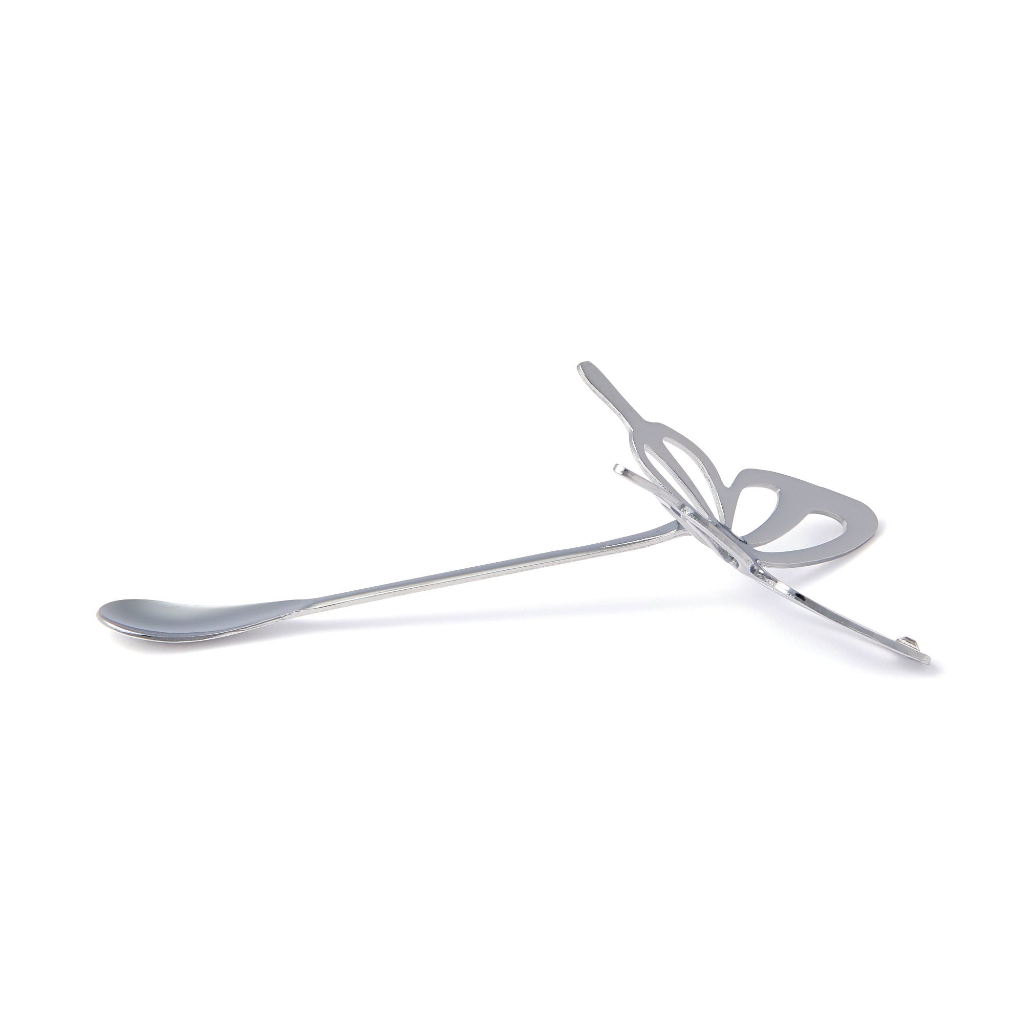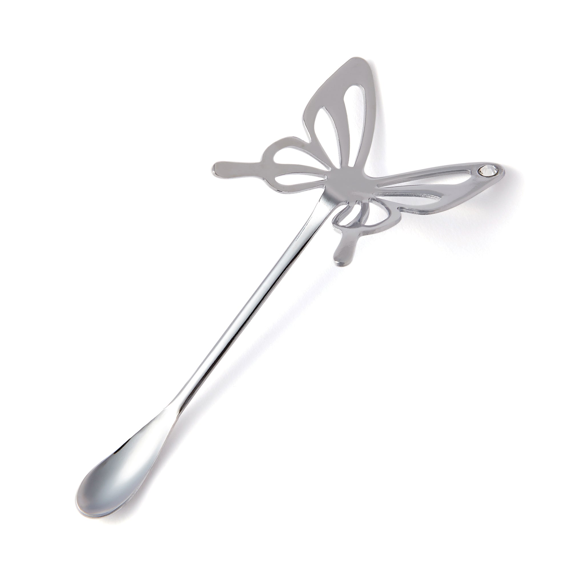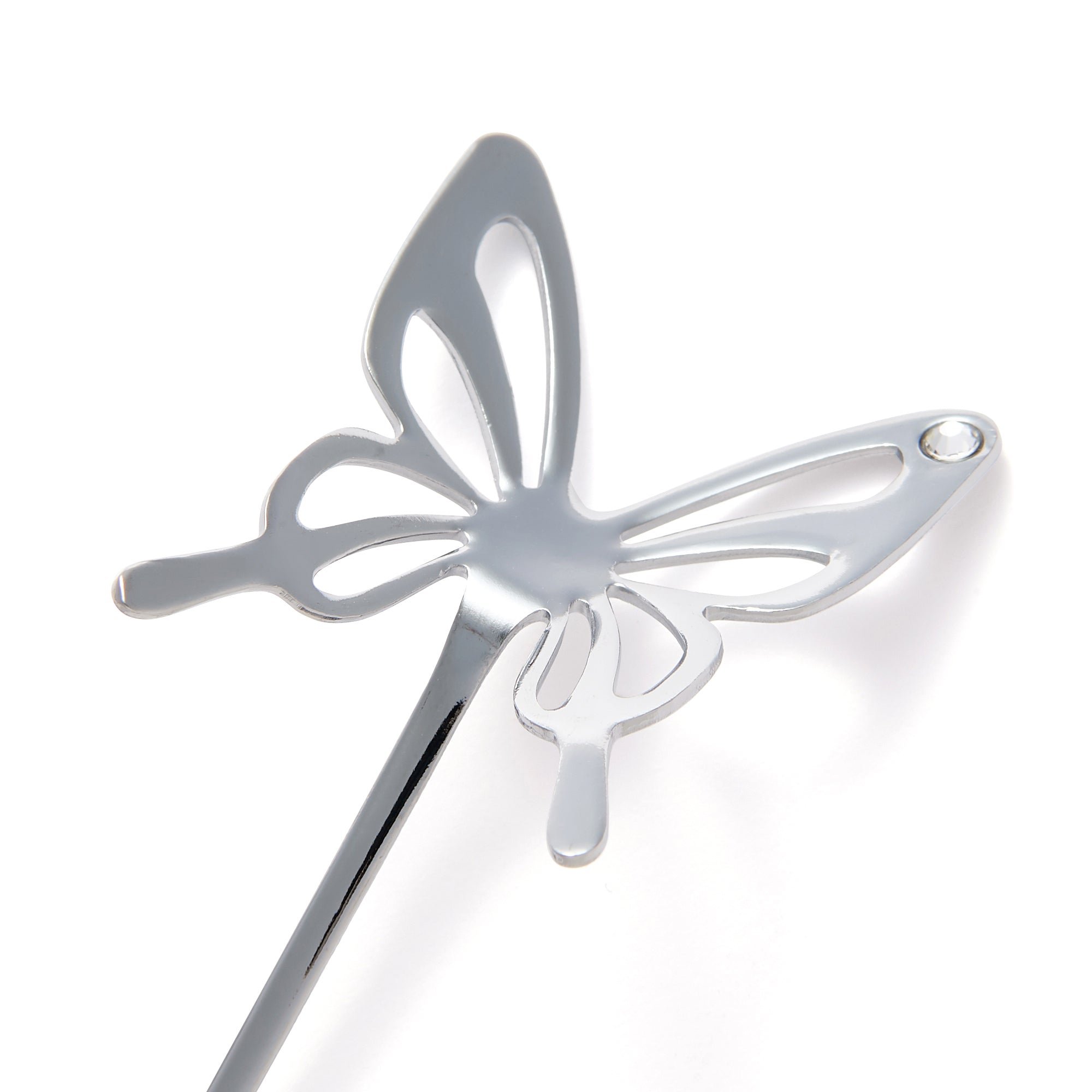 お酒の席にちょっとした遊び心をプラスした、蝶のモチーフのマドラーです。コップのふちにかけると、まるで舞い降りてきた蝶が羽を休めているように見えます。アゲハ蝶を思わせるエレガントなフォルムが美しく、右の羽に輝くクリスタルガラスをアクセントに加えました。マグカップやタンブラーなどにバタフライピックをプラスすれば、おうちカフェもパッとおしゃれなティータイムに。また、友人を招いてマドラー付きのドリンクをおもてなしすればティータイムの会話も弾みます。小ぶりで華やかなマドラーは友人へのプチギフトにも。ささやかな気持ちをプレゼントしたいときに最適です。贈答用のティーセットやマグカップのセットにバタフライマドラーをあわせてプレゼントすれば、相手にもさらに喜ばれます。バタフライマドラーはドリンクマドラーだけでなく、インテリアのディスプレイや、デコレーションピックとしてもご活用いただけます。花を生けたグラスのワンポイントにマドラーを添えて飾ると、華やかなフラワーアレンジが完成。シルバーの蝶のモチーフが、小物やアクセサリー、コーナー全体を魅力的に引き立ててくれます。フォトジェニックなマドラーは、写真のシェアやSNSにもお楽しみください。