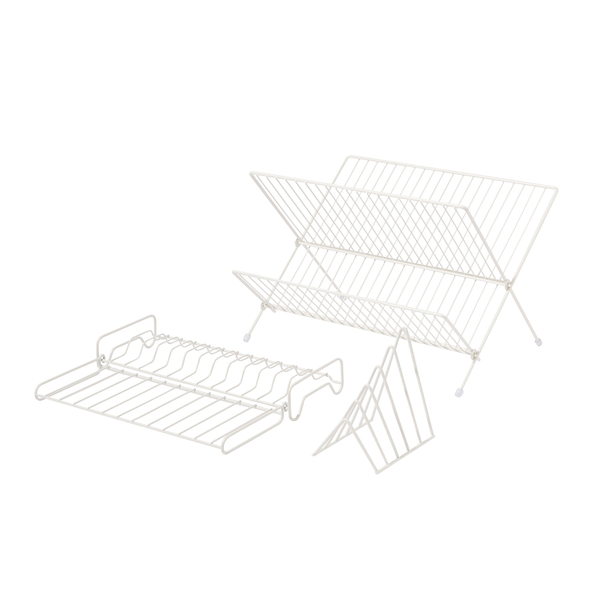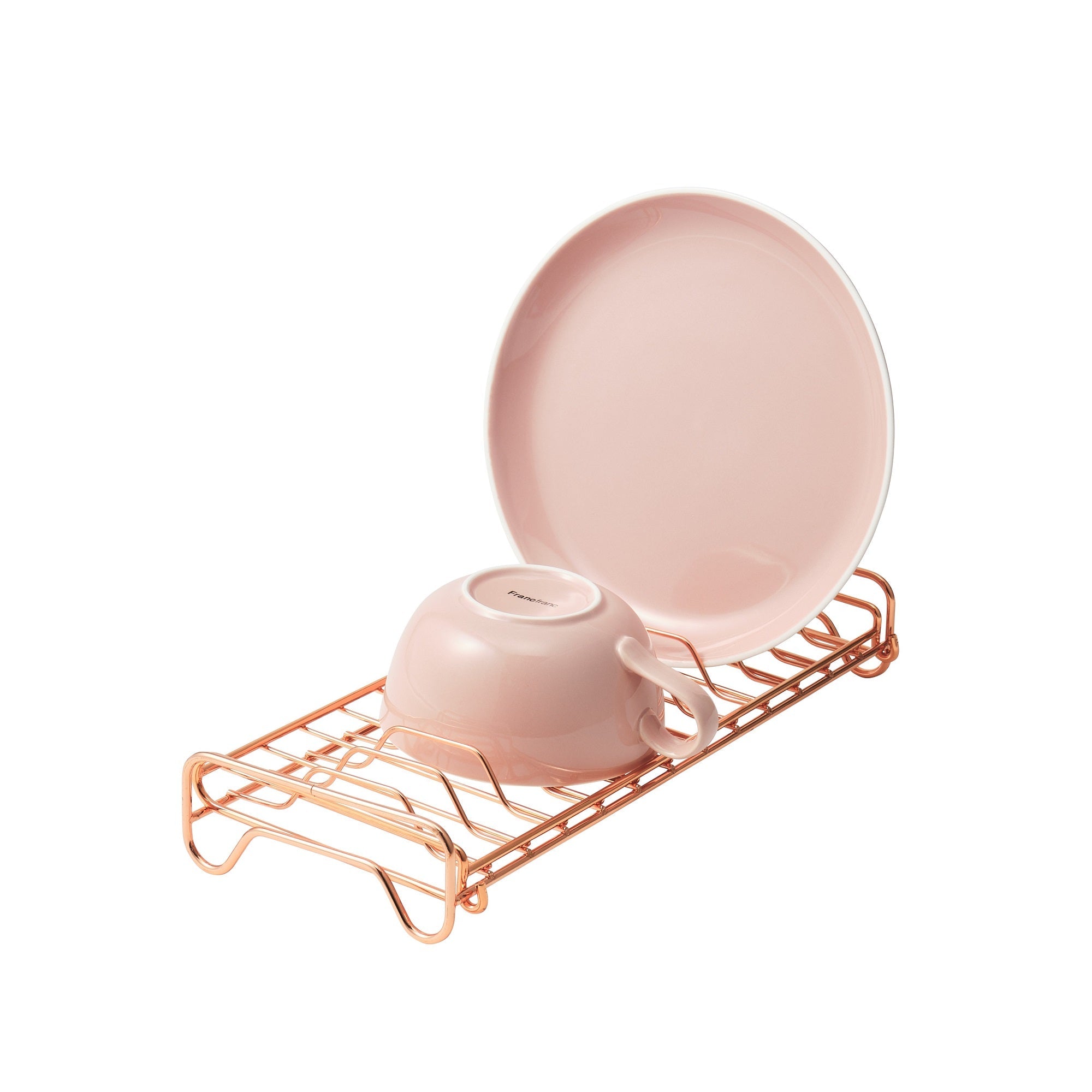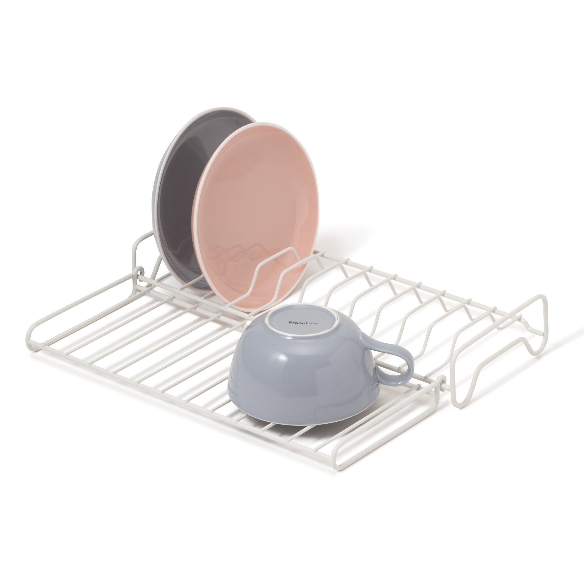 広げてもたたんでもお使いいただける便利なディッシュラックです。プレートが立てられるラックと、コップやボウルを置けるラックに分かれています。洗い物が少ないときは半分にたためられるので省スペースで作業が可能です。たたんだ状態でもプレート類を立てられ機能的。吸水性の高いマイクロファイバー製のディッシュクロスを下に敷けば、食器の水滴を吸い取ってくれるのでおすすめです。最大13枚立てられますが、プレートのサイズやデザインに合わせ枚数は調整してください。コンパクトなラックは、新生活を始められる方にもぴったり。一人暮らし用のキッチンにも使いやすい便利なアイテムです。清潔感のあるホワイトカラーは、どんなキッチンにも合わせやすいのもポイント。シンプルなキッチン空間にしたい方や、ナチュラルな雰囲気が好きな方にもおすすめです。ホワイトのほかに、ゴールドとコッパーがあり、上品で華やかな色合いが特徴。シリーズ展開のキッチンアイテムとトータルで素敵にコーディネートいただけます。キッチンの広さや、お持ちの食器の種類によって自由に組み合わせられるのは嬉しいですね。Francfrancのアイテムを使って、自分好みのキッチン空間を作りましょう。