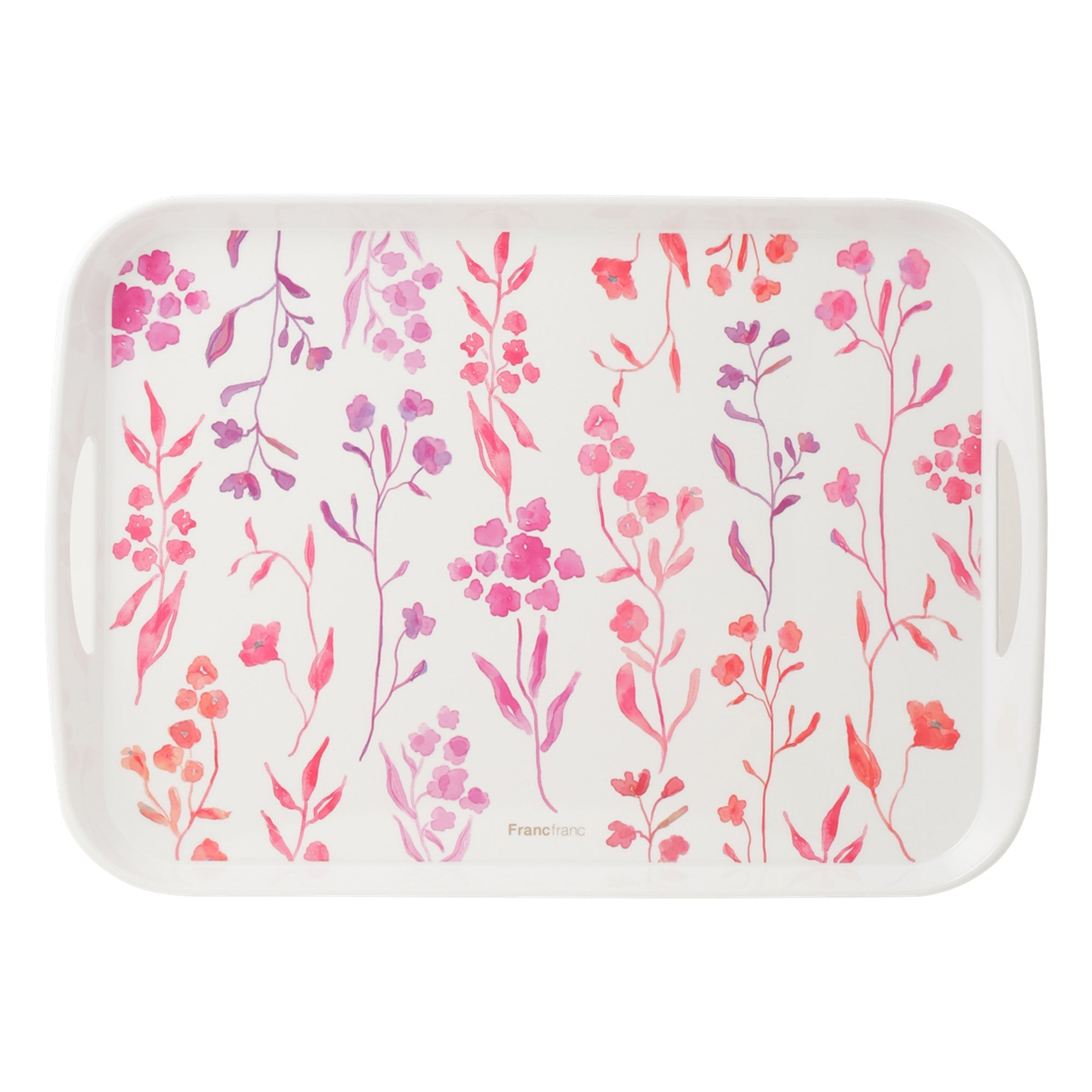 食事の際のトレーとしても、物を運ぶ用途でもご使用できるメラミントレー。樹脂製のため軽くて割れにくく、お子様がいる家庭でも使いやすいアイテム。積み重ねて収納することも可能です。Francfrancのロゴにはゴールドを使用しています。
