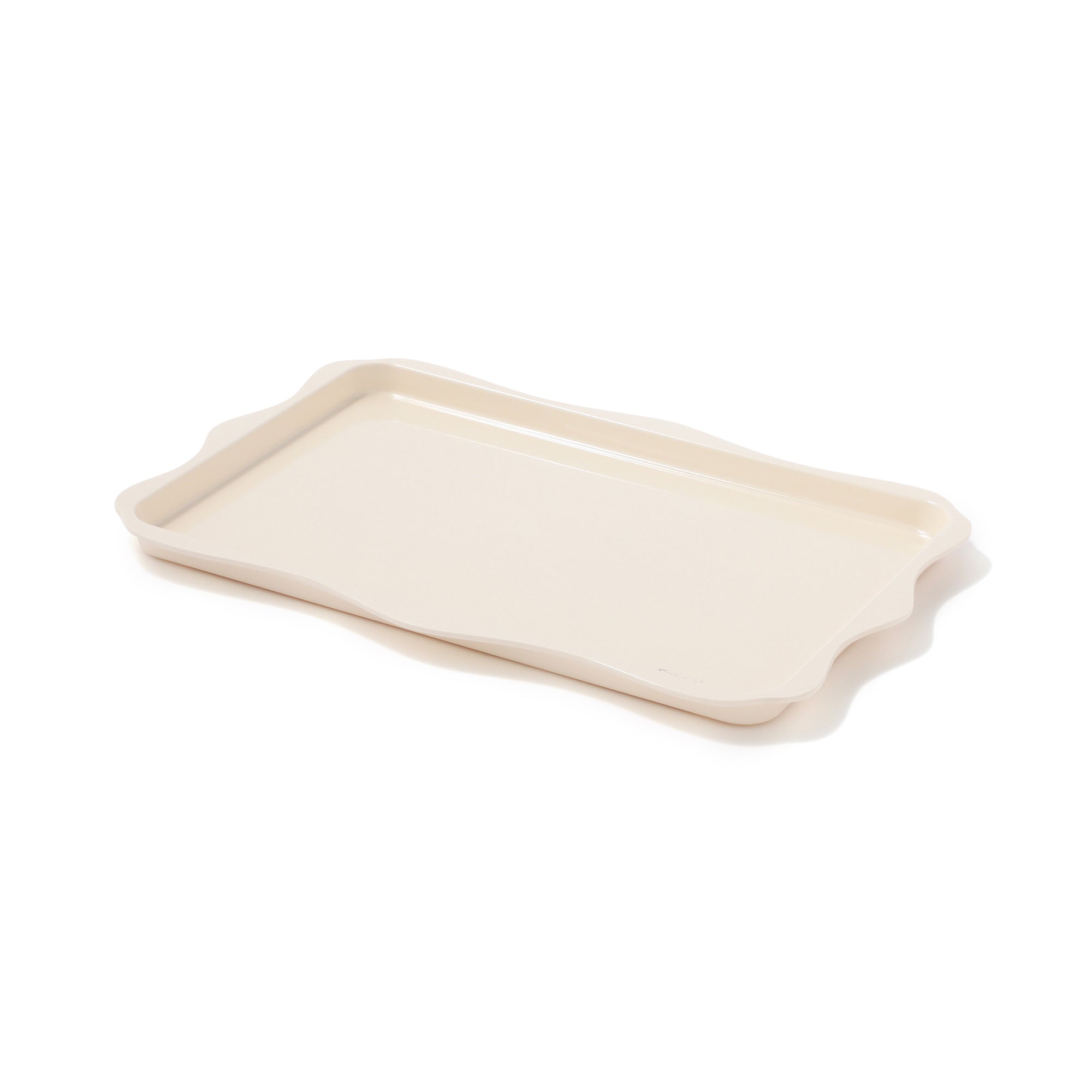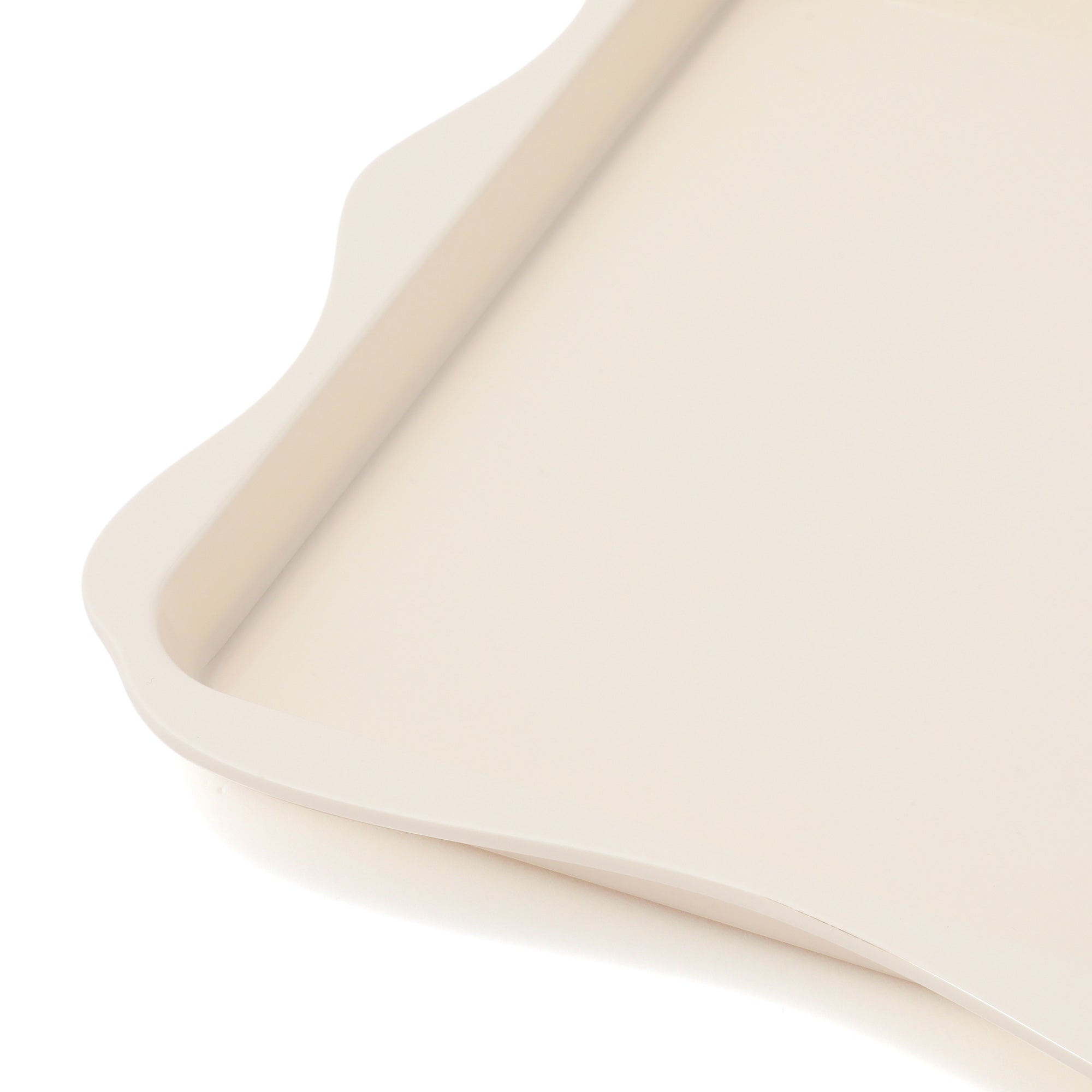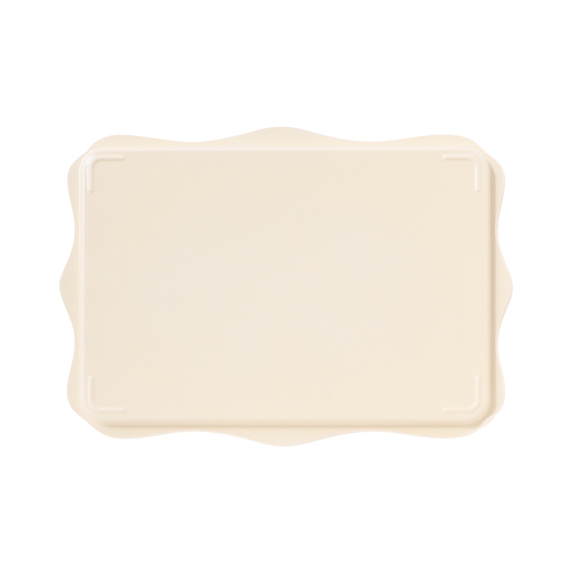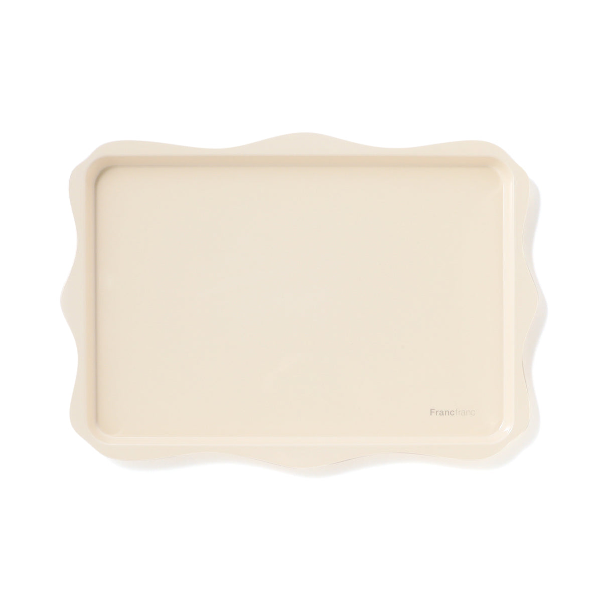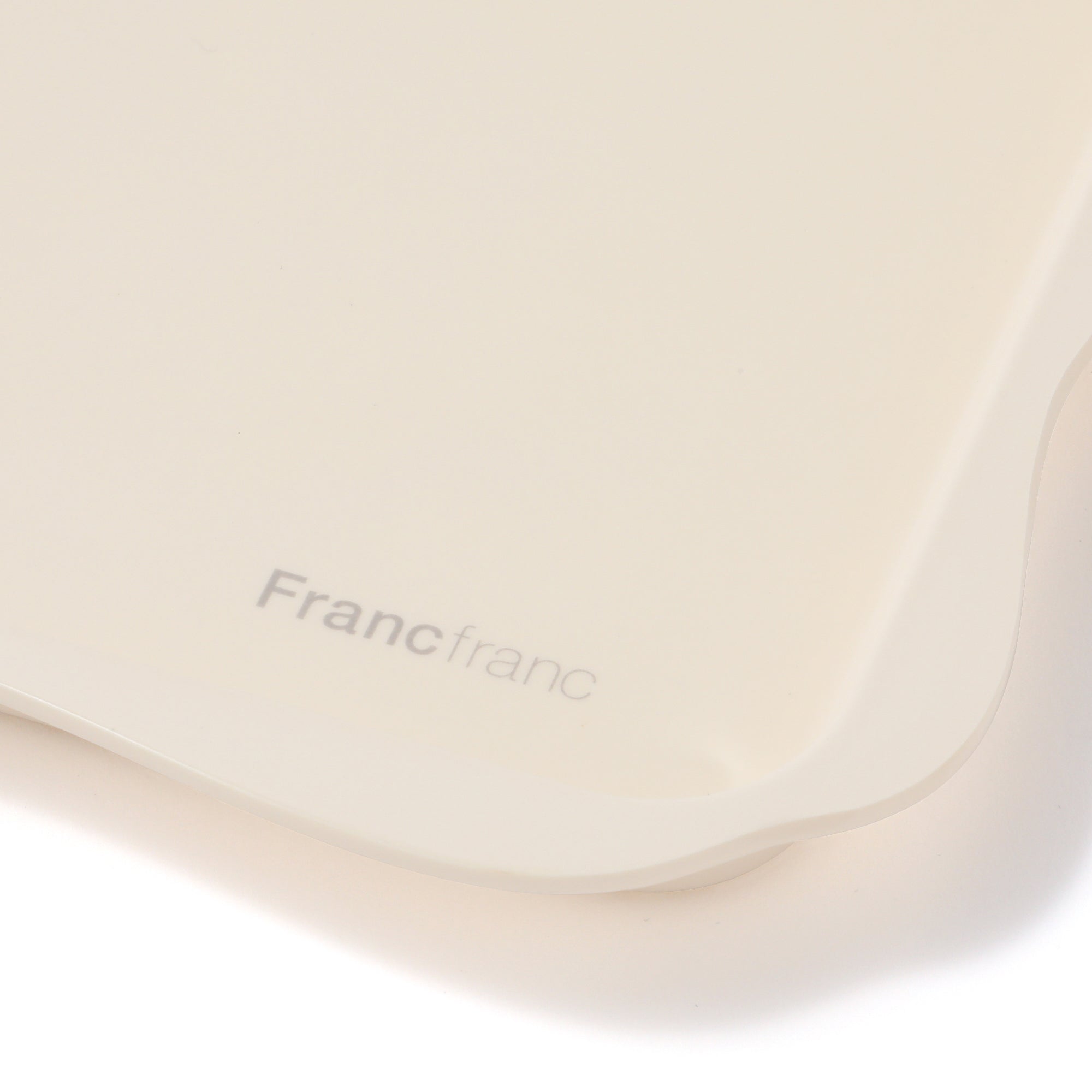 フチのフリルがかわいらしいメラミントレーです。光沢のある表面にFrancfrancのロゴプリントが入ったシンプルなデザイン。キッチンからダイニングに運んで、そのまま食事ができます。