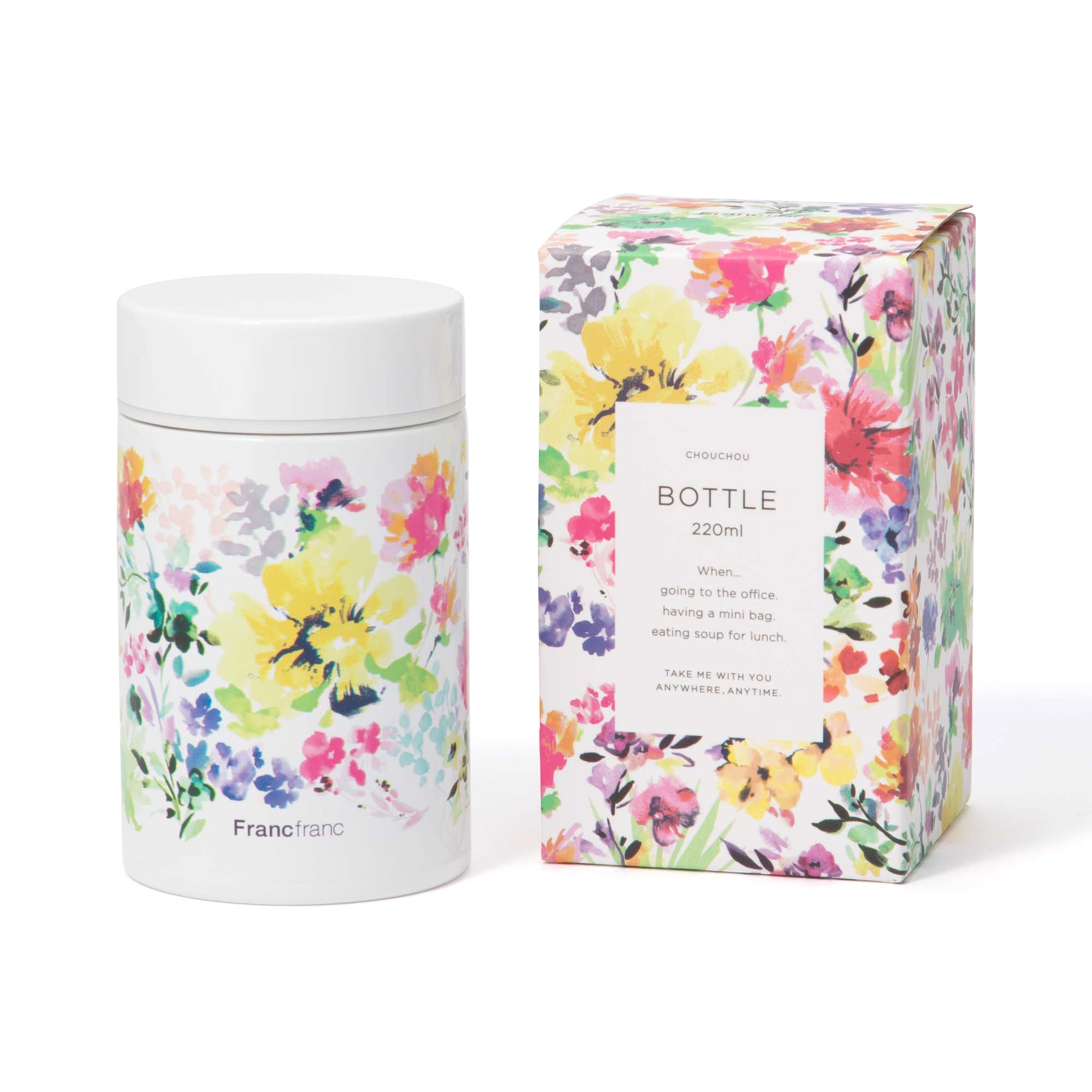 Francfrancらしいカラーがかわいい小さめサイズのステンレスボトルです。ミニバッグやランチバッグにもすっぽり収まるサイズ感。お茶やコーヒーなどのお飲み物はもちろん、粉末タイプのスープやお味噌汁を飲むのにもピッタリのサイズです。真空二重構造で飲み物の保温・保冷効果があり、飲みごろを長時間キープしてくれます。スープなどを入れても、汚れが付きにくくて落としやすいミラー加工を内部に施しました。ボトルと同じパッケージデザインでギフトにもおすすめのアイテムです。