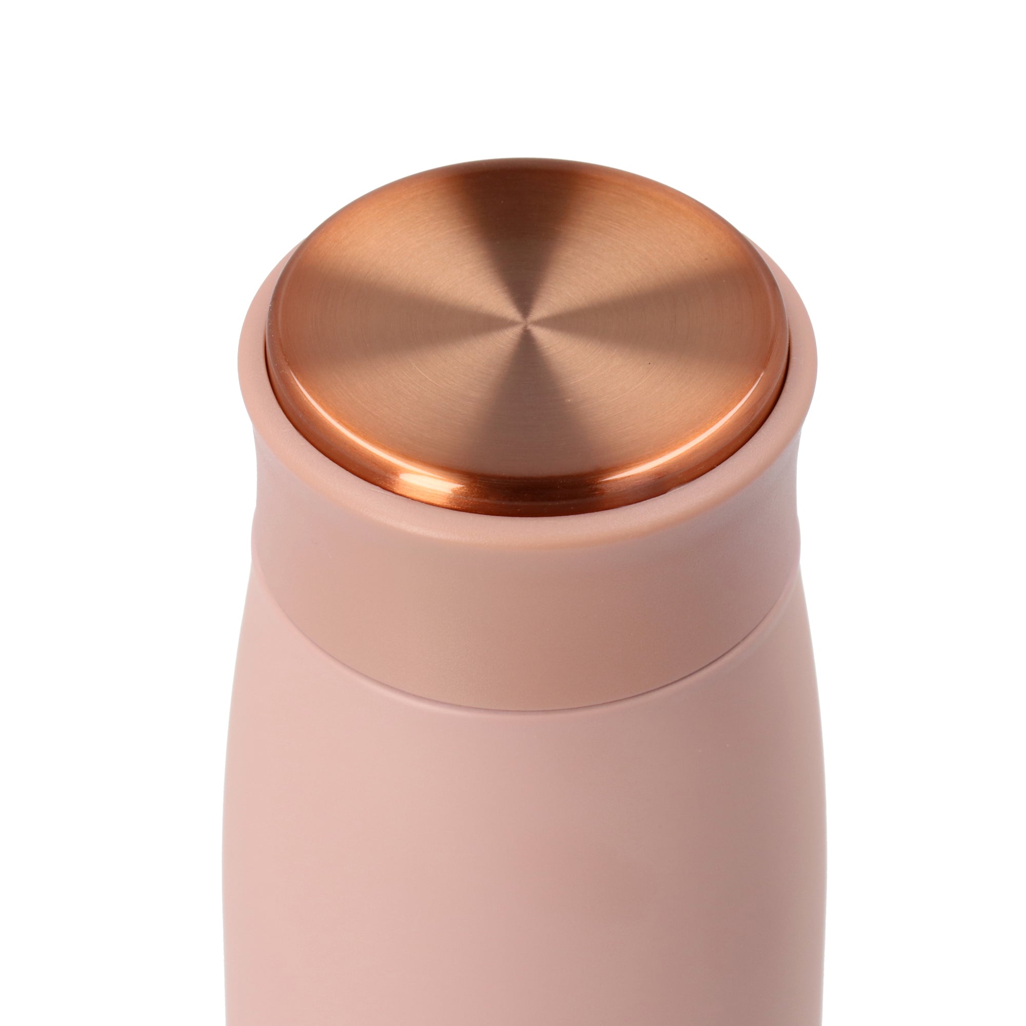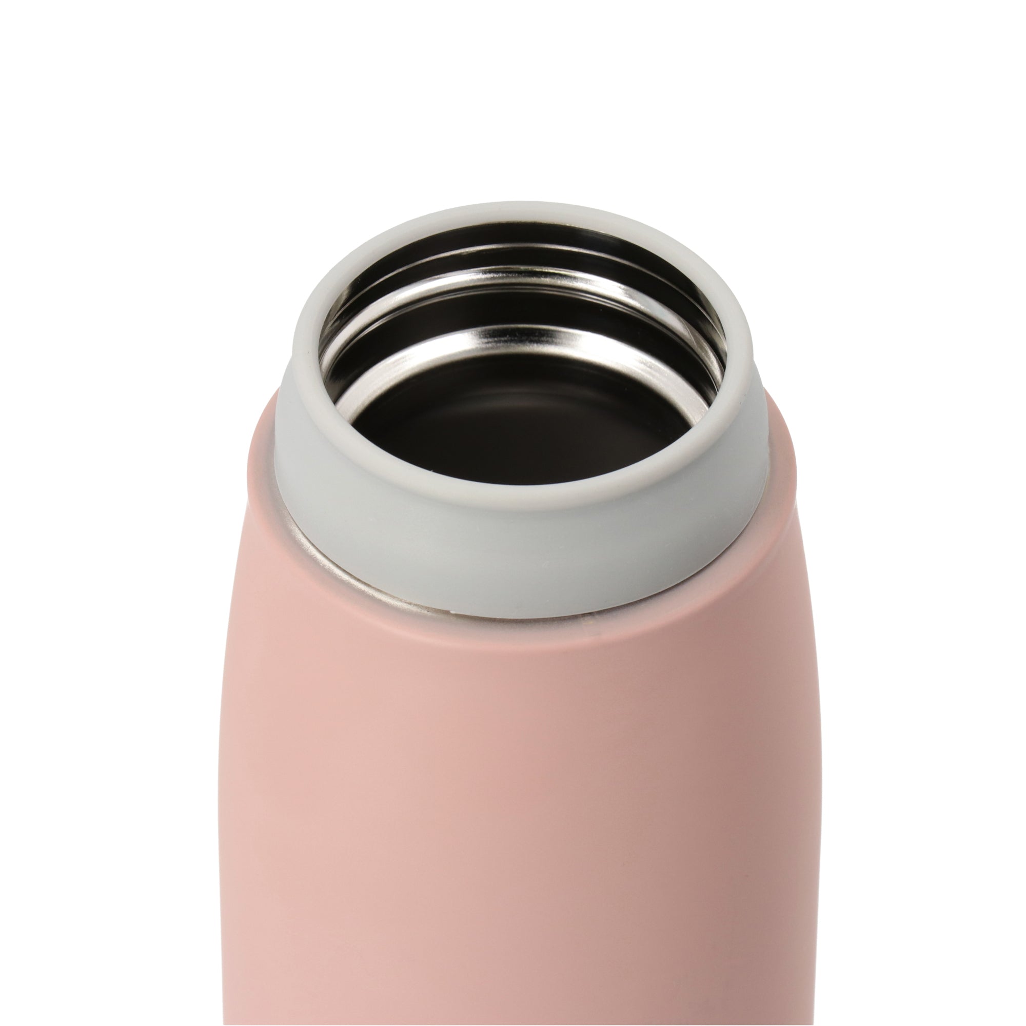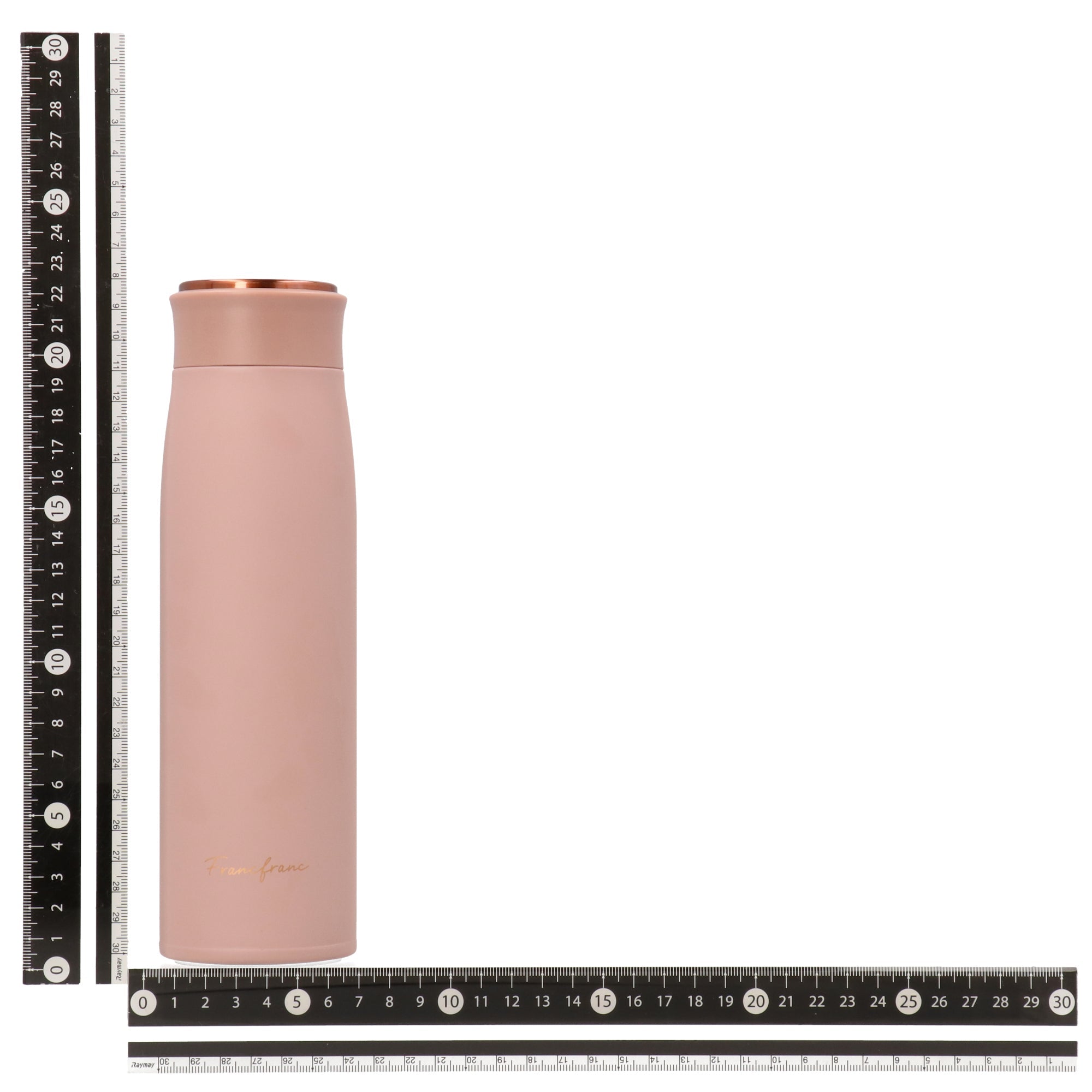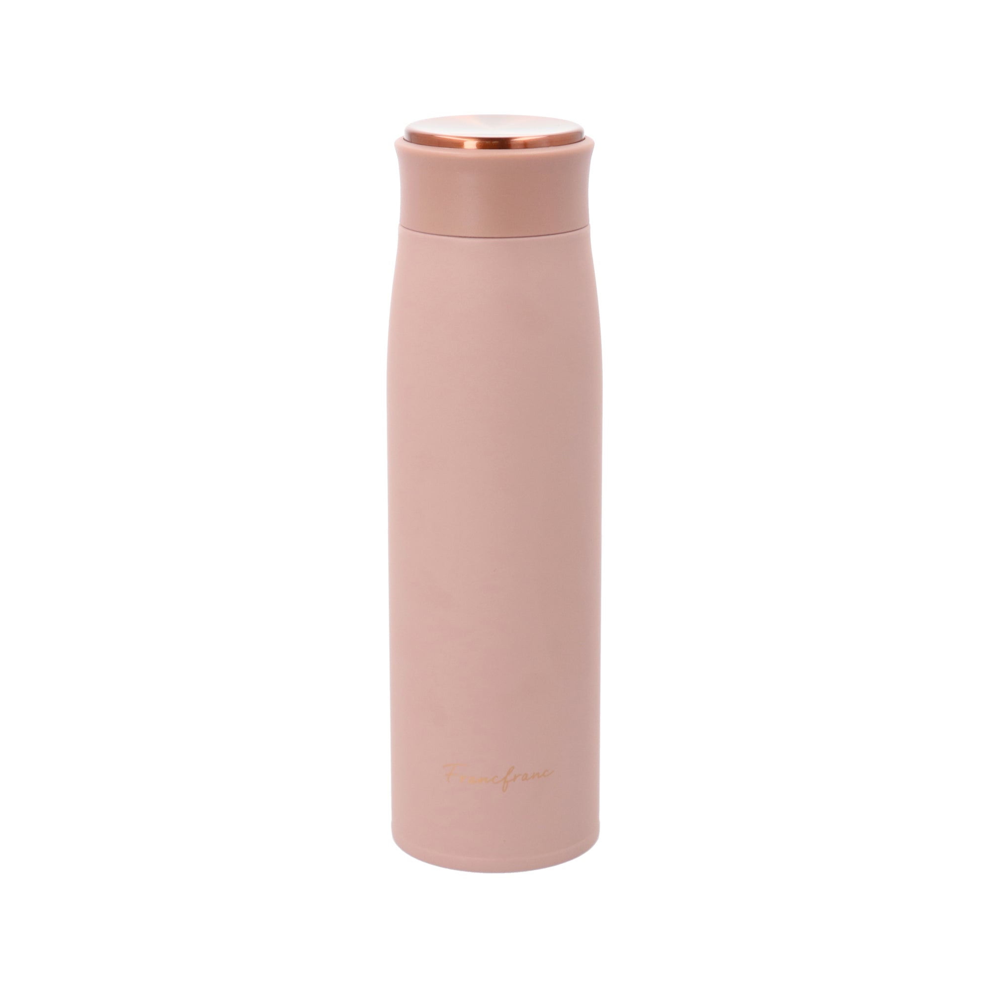 マットな質感にメタリックのツヤ感が映えるエレガントな印象のステンレスボトルです。225gと軽量なので、持ち運びにも便利です。十分な量の飲み物を入れられる500mlサイズです。真空二重構造になっており、飲み物の保温保冷が可能です。フタを外してすぐ飲める直飲みタイプで、飲み口にはカバーをつけているので、優しい口当たりです。底面にはシリコン製のフットパッドが付いているので、オフィスのデスクでも静かに置けます。