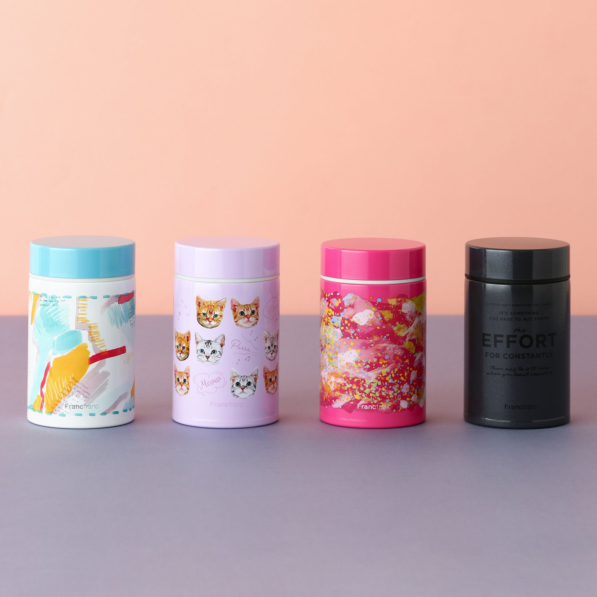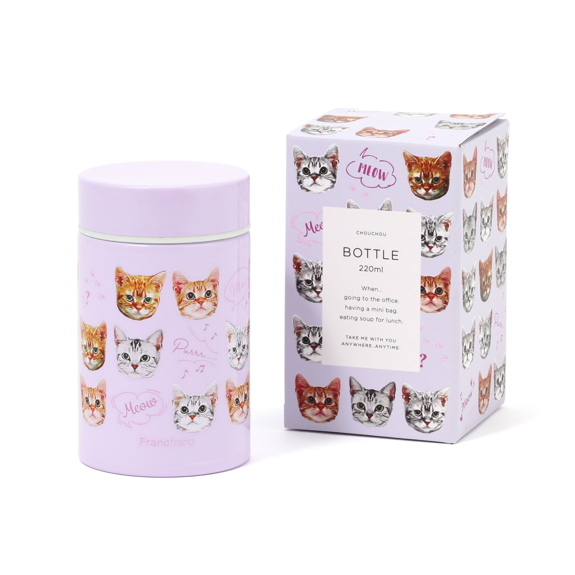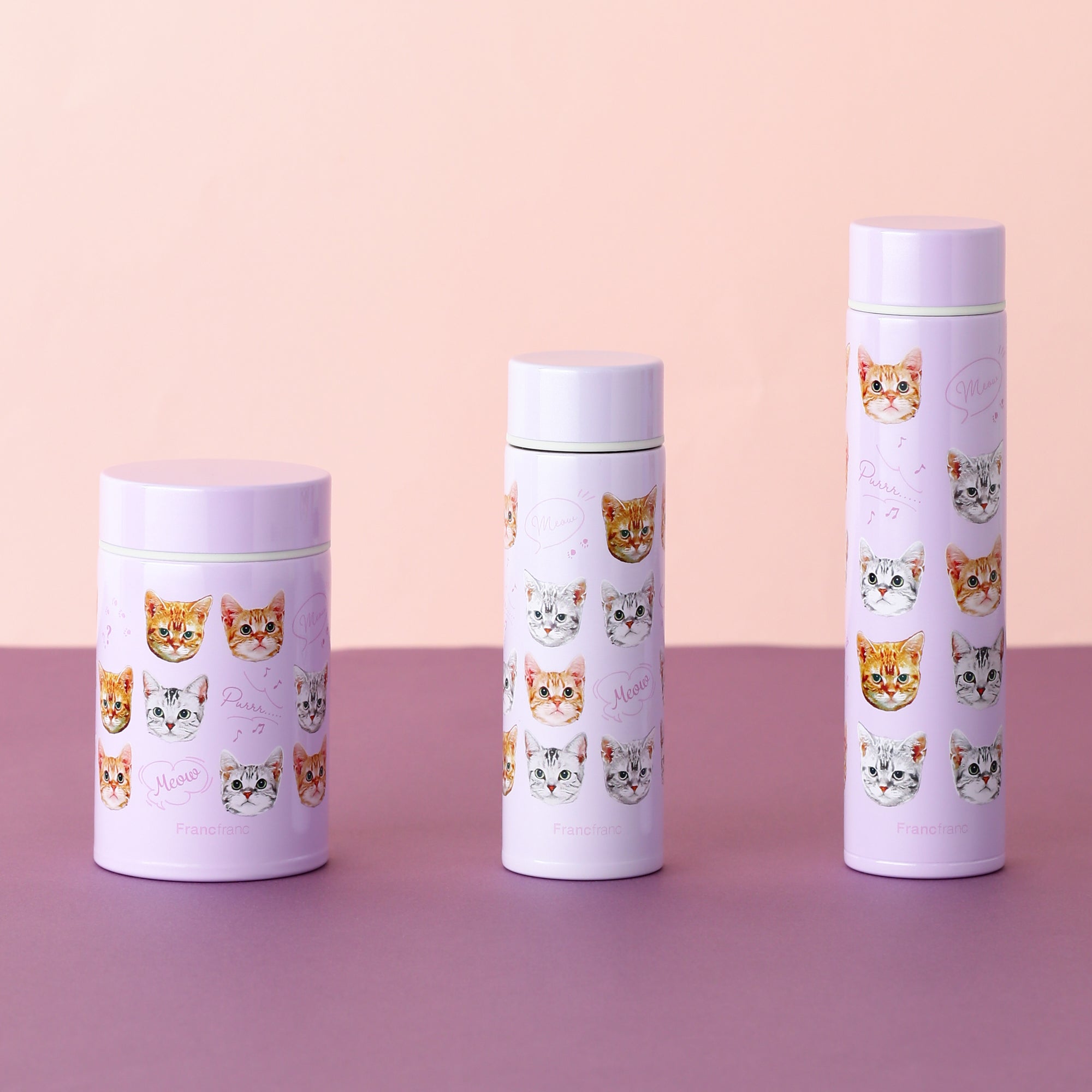 Francfrancらしい華やかなプリントがかわいい小さめサイズのステンレスボトルです。真空二重構造で飲み物の保温・保冷効果があり、飲みごろを長時間キープしてくれます。ミニバッグやランチバッグにすっぽり収まる小さめサイズのほか、かわいい極小サイズと少し高さのあるスリムサイズもご用意しています。鮮やかでおしゃれな柄や単色にロゴをのせたデザインなど豊富なバリエーションです。お茶やコーヒーなどの飲み物はもちろん、粉末タイプのスープやお味噌汁を飲むのにもぴったりです。蓋は取り外しができるため、洗いやすい点もポイントです。底面が広く、テーブルなどに置いたときにも安定感があります。色の濃い液体を入れても汚れが付きにくく落としやすいミラー加工を内側に施しました。愛くるしい猫とニュアンス感のあるロゴがとってもかわいいです。間口が広いため、具材スープも入れやいです。デイリーからお出かけ、ピクニックまでさまざまなシーンに持ち運びやすい便利なサイズ感です。ボトルとお揃いの柄をあしらったキュートなボックス入りで、ギフトにもおすすめです。