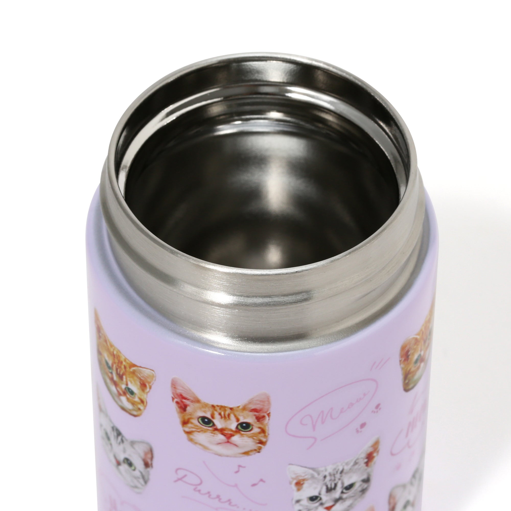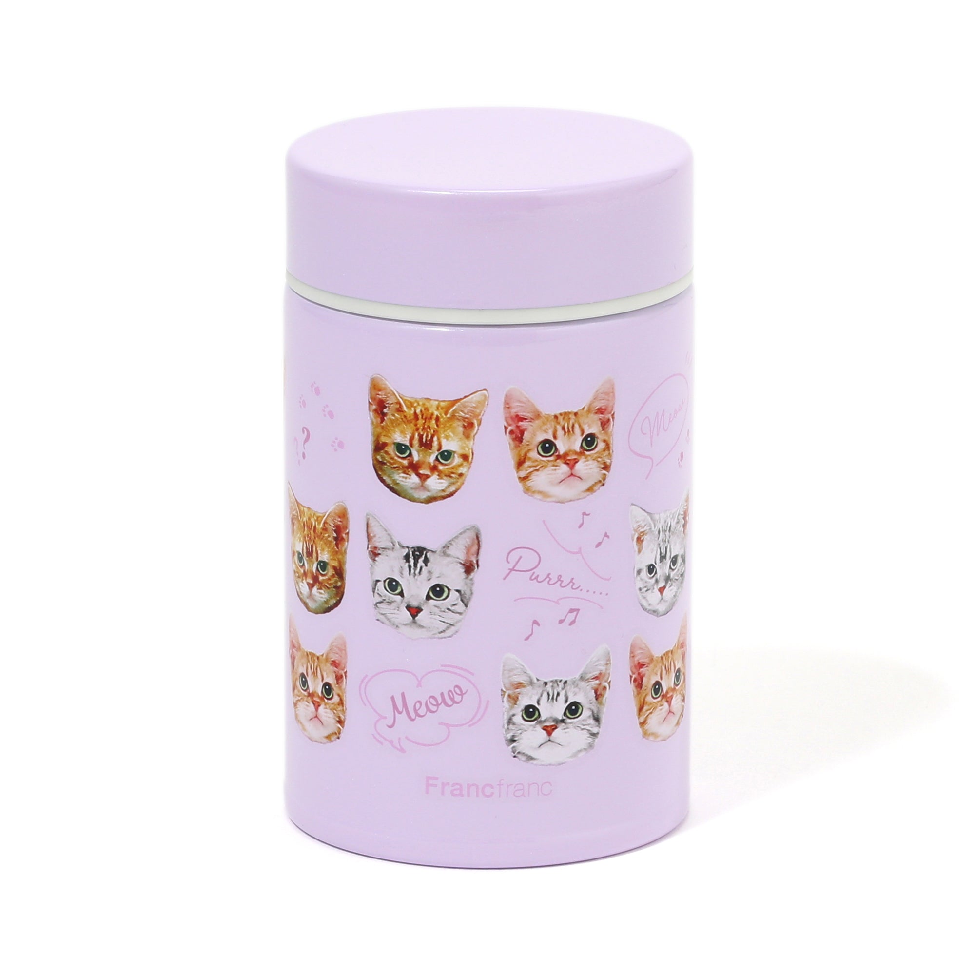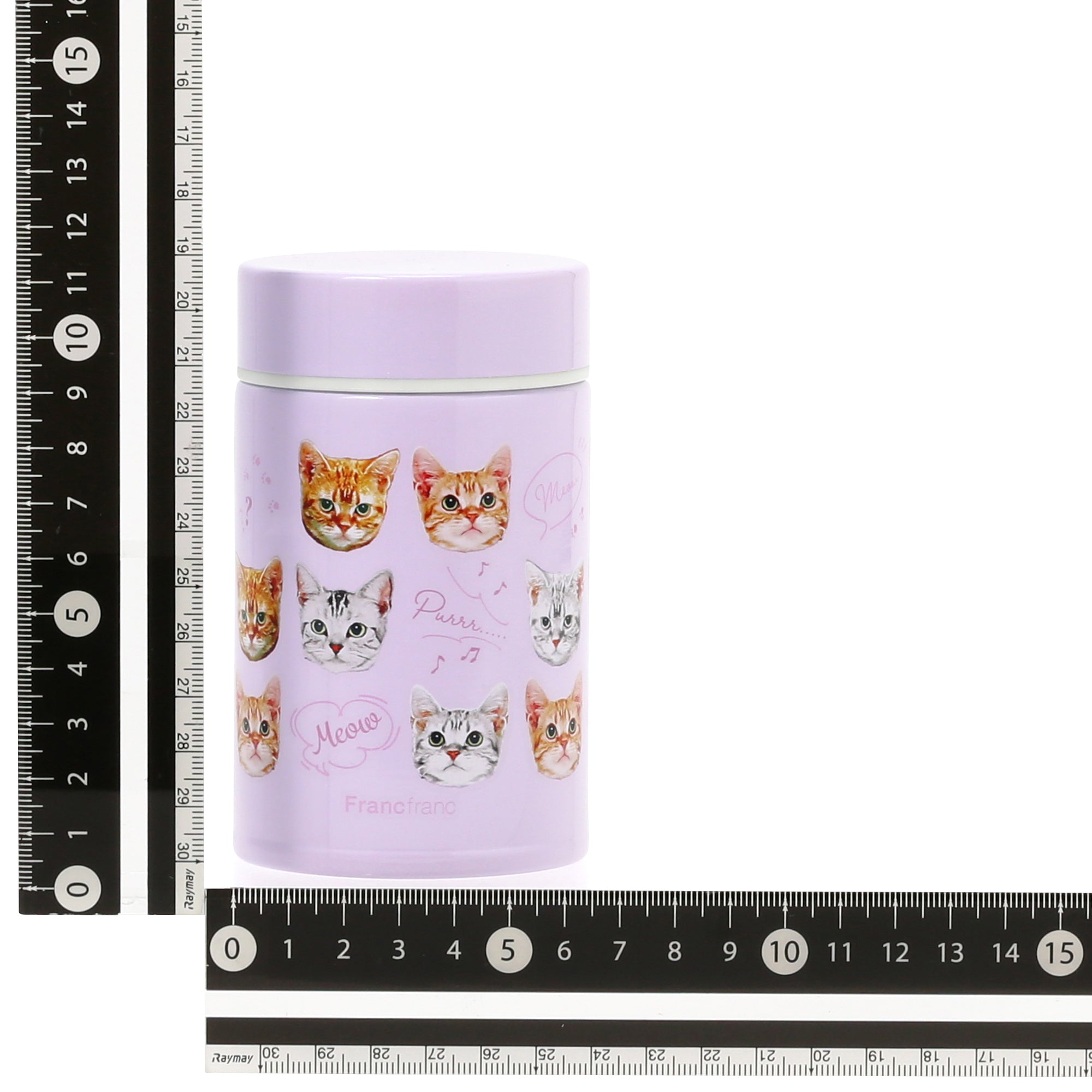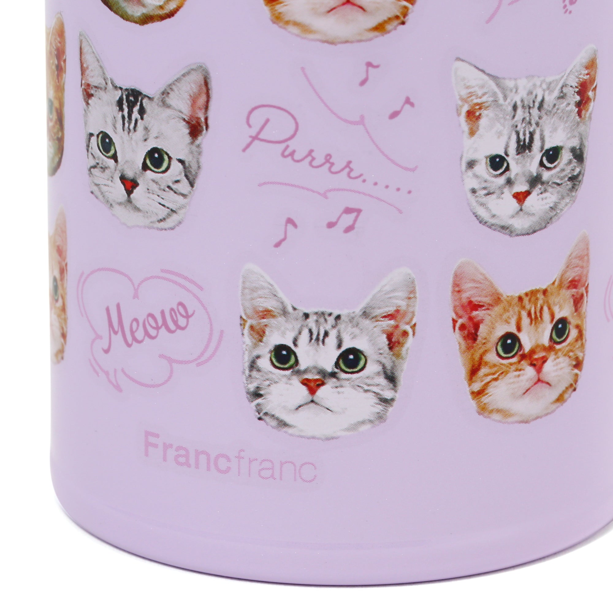 Francfrancらしい華やかなプリントがかわいい小さめサイズのステンレスボトルです。真空二重構造で飲み物の保温・保冷効果があり、飲みごろを長時間キープしてくれます。ミニバッグやランチバッグにすっぽり収まる小さめサイズのほか、かわいい極小サイズと少し高さのあるスリムサイズもご用意しています。鮮やかでおしゃれな柄や単色にロゴをのせたデザインなど豊富なバリエーションです。お茶やコーヒーなどの飲み物はもちろん、粉末タイプのスープやお味噌汁を飲むのにもぴったりです。蓋は取り外しができるため、洗いやすい点もポイントです。底面が広く、テーブルなどに置いたときにも安定感があります。色の濃い液体を入れても汚れが付きにくく落としやすいミラー加工を内側に施しました。愛くるしい猫とニュアンス感のあるロゴがとってもかわいいです。間口が広いため、具材スープも入れやいです。デイリーからお出かけ、ピクニックまでさまざまなシーンに持ち運びやすい便利なサイズ感です。ボトルとお揃いの柄をあしらったキュートなボックス入りで、ギフトにもおすすめです。