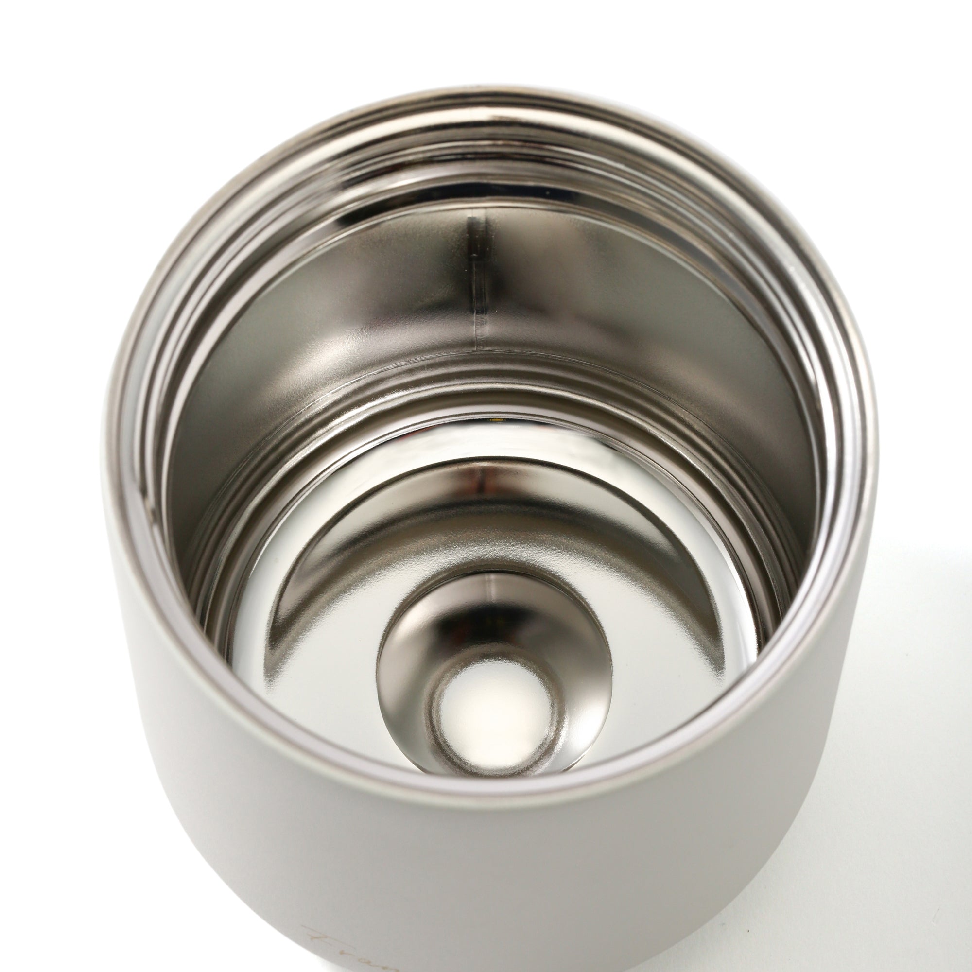 マットな質感の本体とメタリックなフタのコントラストが目を引く、スタイリッシュなスープジャーです。具沢山スープを入れておにぎりにプラスすればランチにちょうどよいサイズ。真空二重構造になっており、保温保冷が可能です(保温:56℃以上6時間・保冷:11℃以下6時間)。内側には汚れを落としやすいミラー加工を施してお手入れをスムーズに。底面には滑り止めもついていて機能性も抜群です。持ち運びに便利な巾着がセットになっています。