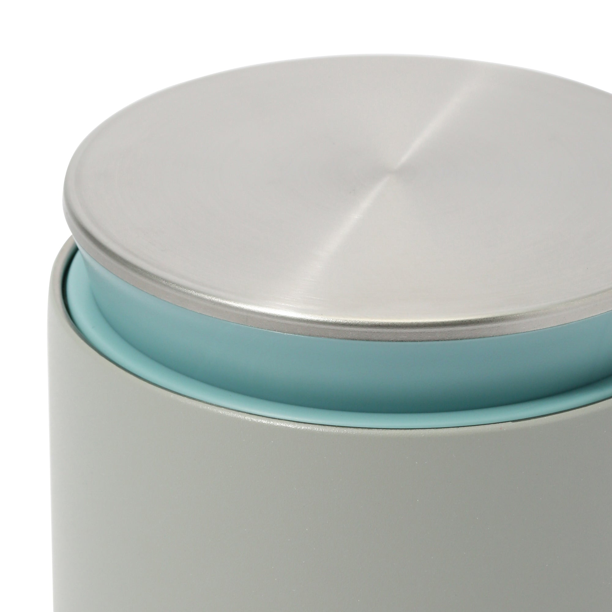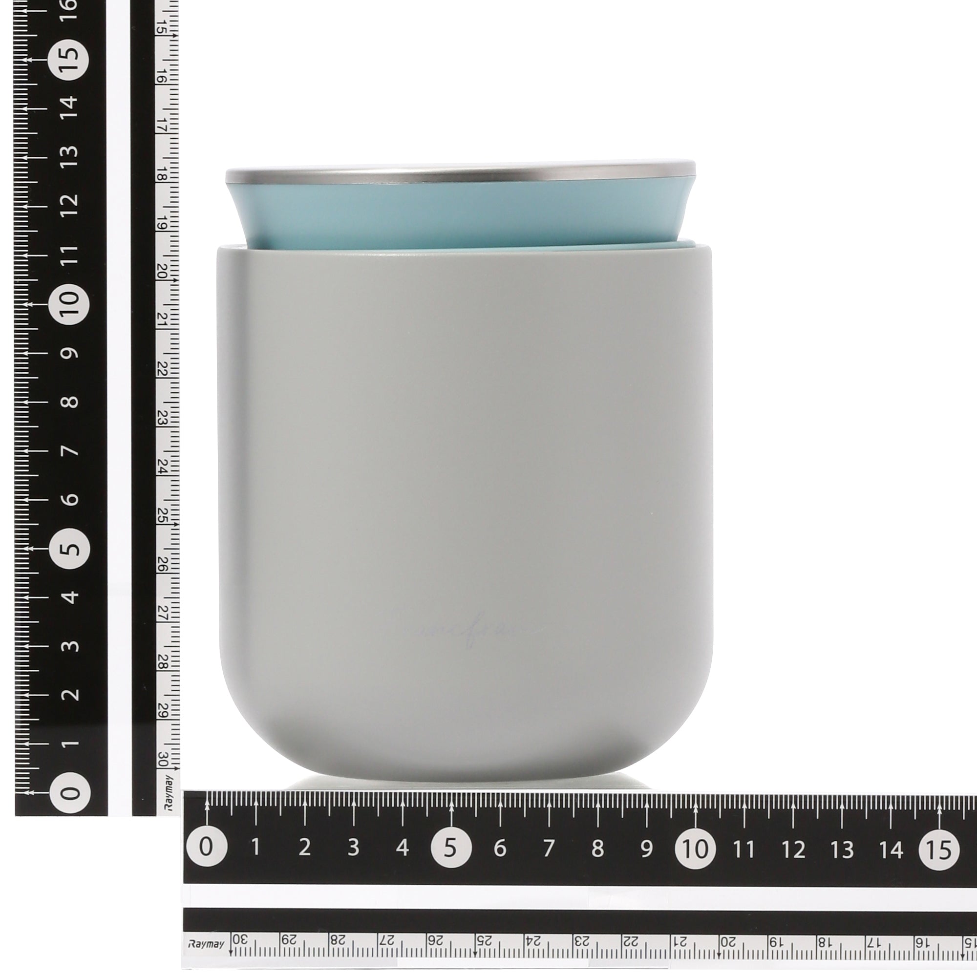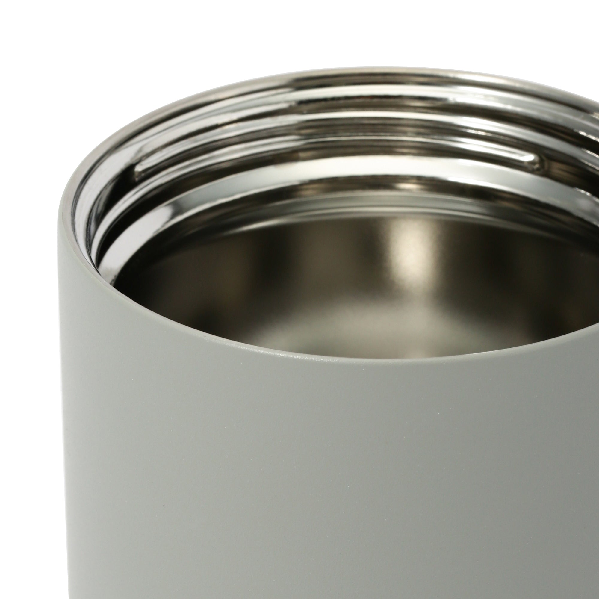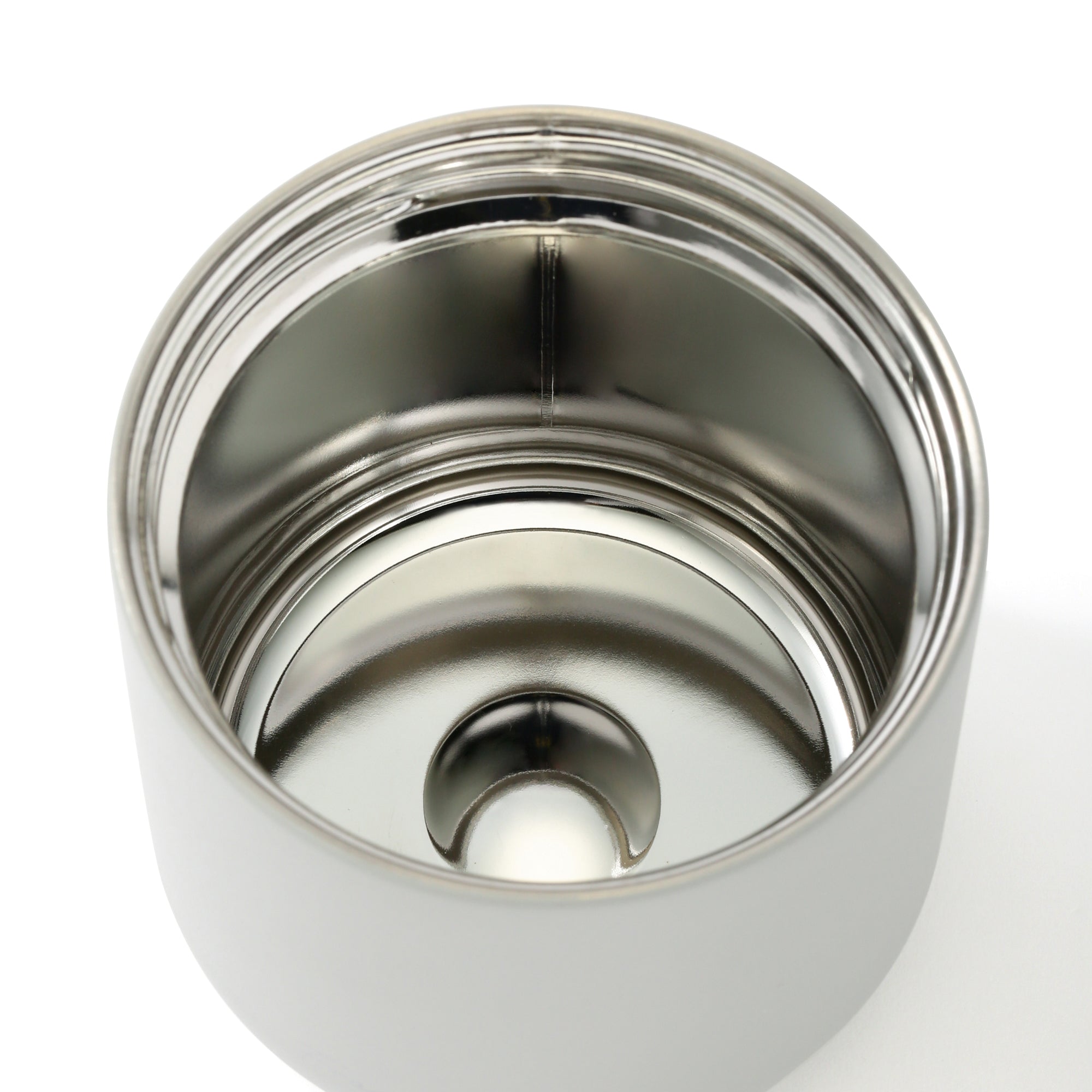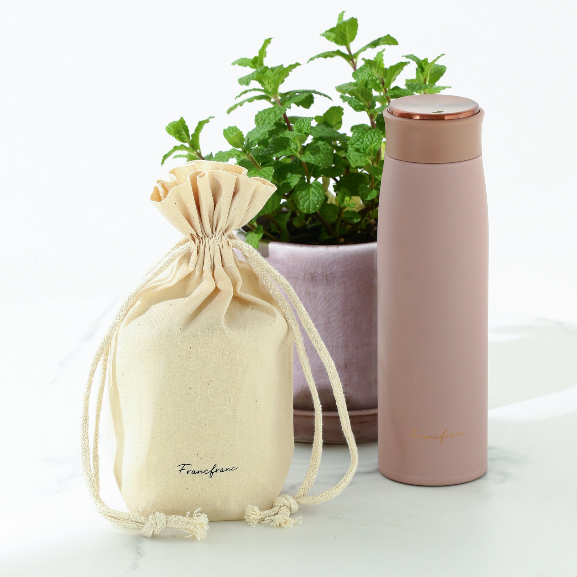 マットな質感の本体とメタリックなフタのコントラストが目を引く、スタイリッシュなスープジャーです。真空二重構造になっており、保温保冷が可能です(保温:56℃以上6時間・保冷:11℃以下6時間)。朝入れたご飯も昼間まで温かさをキープするので、すぐに美味しく食べることが出来ます。また、冷やしたフルーツや冷製パスタなども昼間まで温度を保ってくれます。冷たい物も美味しい温度で楽しめます。容量が500mlあるので、パスタや丼などこれ1つでランチが済ませられるサイズ。内側には汚れを落としやすいミラー加工を施してお手入れをスムーズに。底面には滑り止めもついていて機能性も抜群です。倒れにくく、オフィスのデスクでも静かに置けます。パッキン付きのフタなので持ち運びも安心です。全体がマットで落ち着いているので、メタリックがアクセントになります。さりげなく入った上品なフォントのロゴは、フタの上部とリンクしたカラーで、統一感がありお洒落です。持ち運びに便利な巾着がセットになっています。使い終わったら洗って繰り返し使用できるので、環境にも配慮しています。