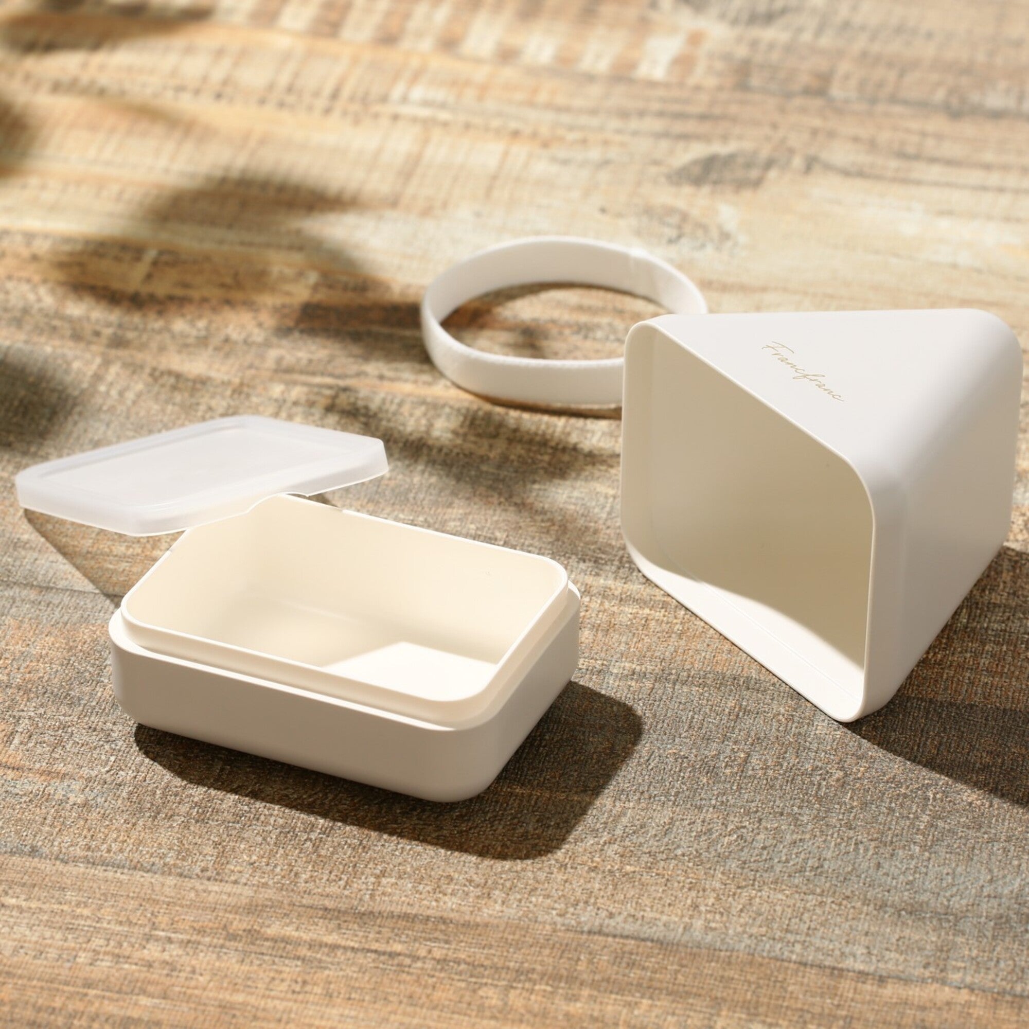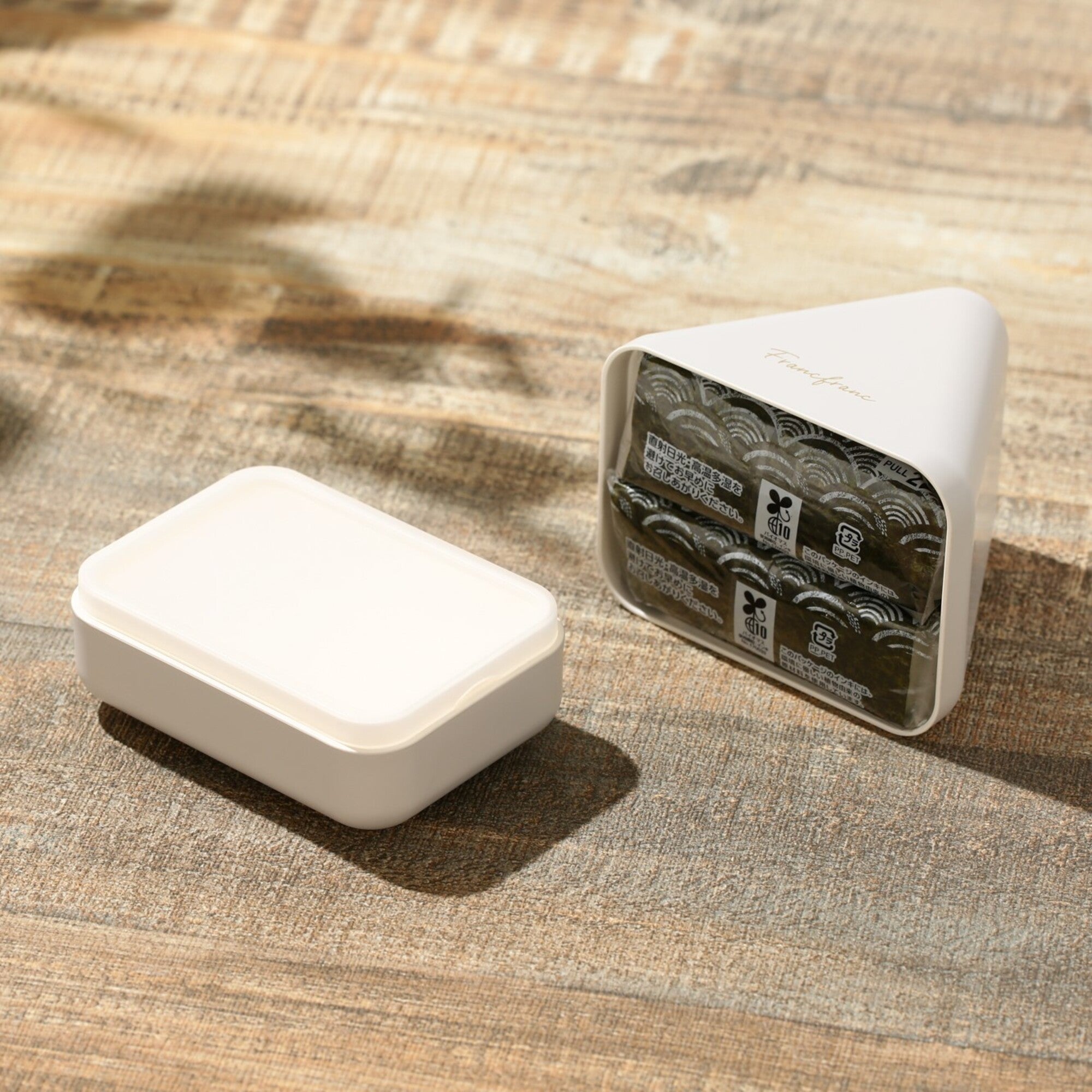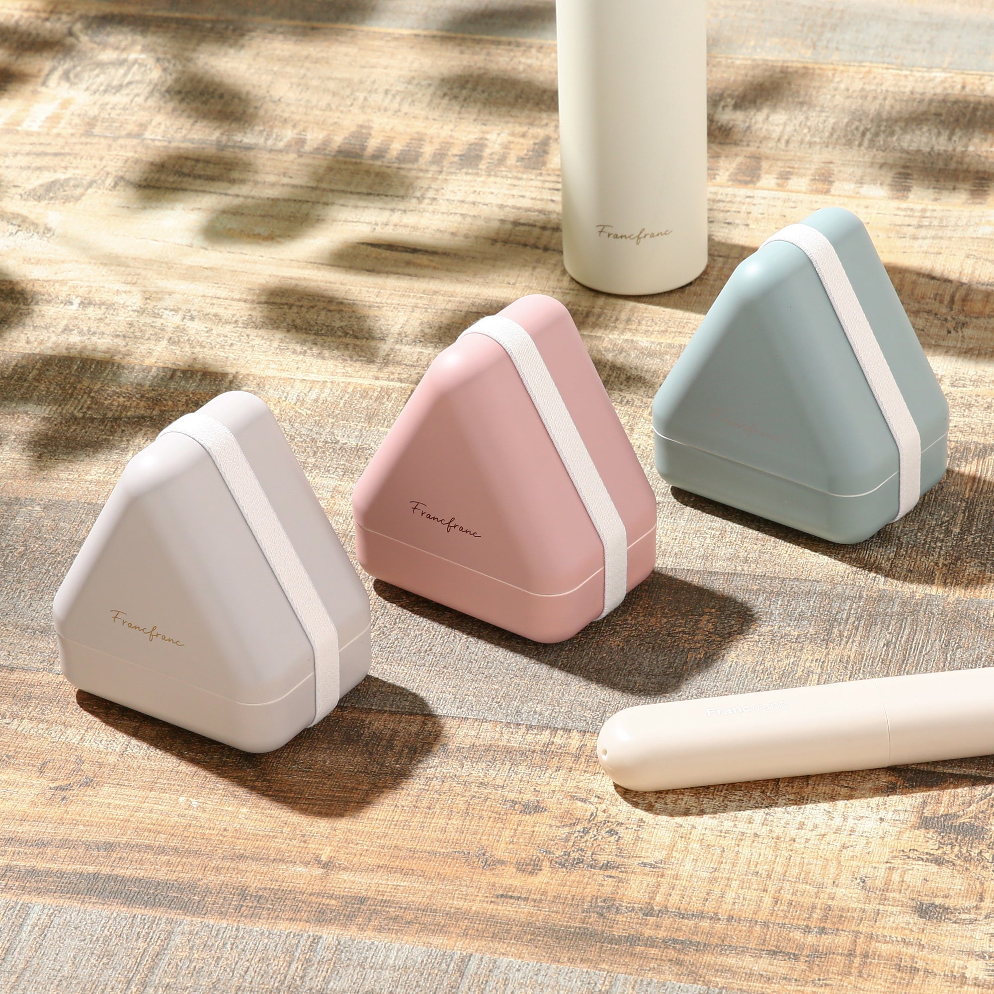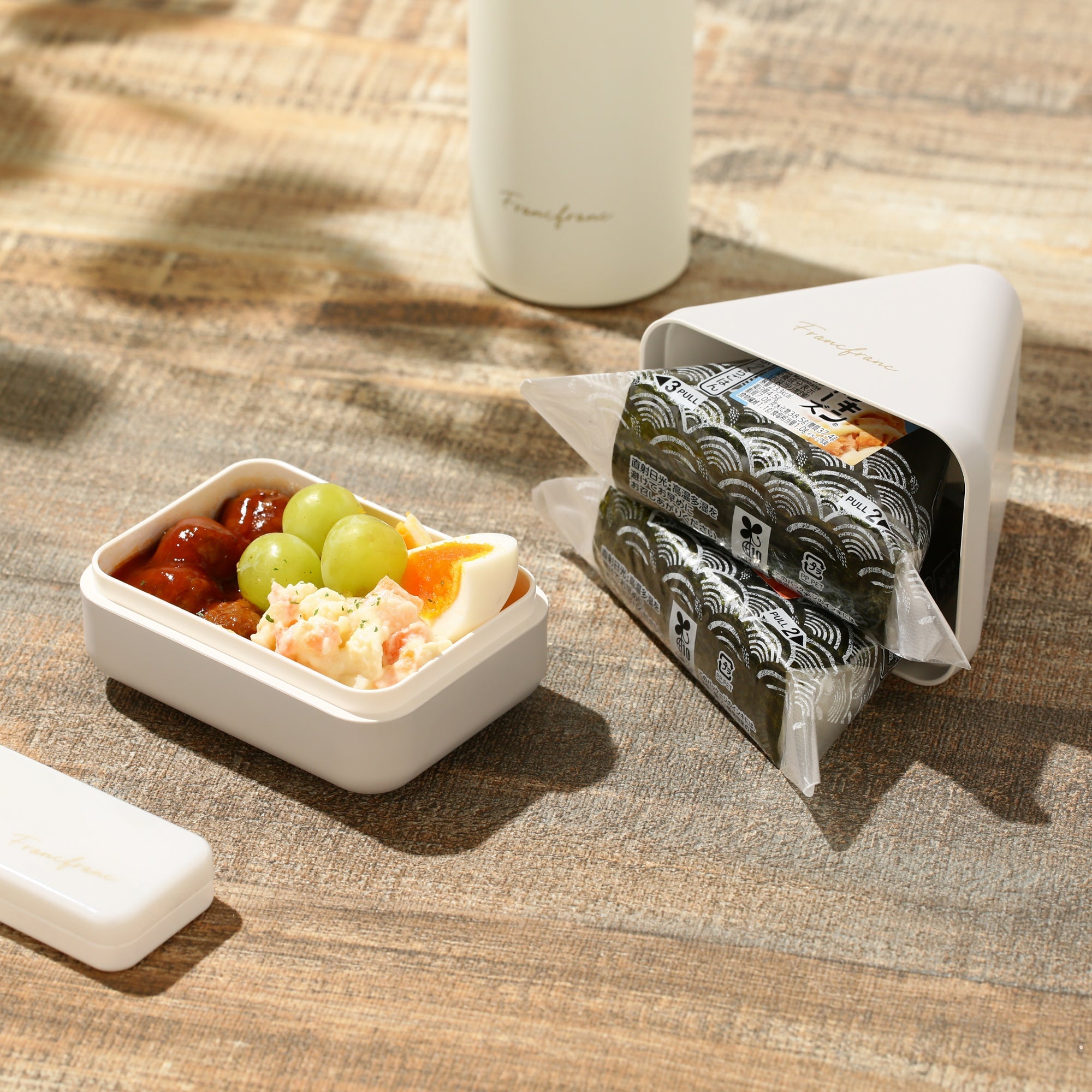 上段はおにぎり、下段にはおかずを入れるのにぴったりなフォルムのランチボックスです。市販のおにぎり2個がすっぽり納まるサイズの上段とおかずが入れやすい長方形の下段で無駄のないデザイン。おにぎりボックスに入れておけば形が崩れる心配もなく、散らかりがちなかばんの中でも安心です。中蓋で仕切れるので、おかずの味がおにぎりに移らないのも嬉しいポイント。付属のゴムで留めると三角形が特徴的なかわいらしいフォルムに。コンパクトでかさばらないので学校や会社のランチにはもちろん、ピクニックにも最適です。ロゴ ランチ箸&スプーンやロゴ スープジャーとカラーやロゴを揃えているので、合わせての使用もおすすめです。