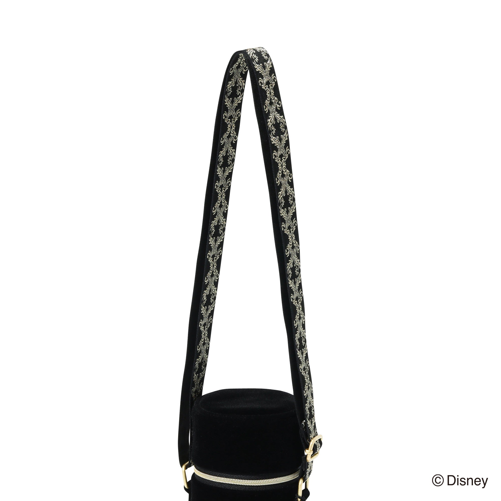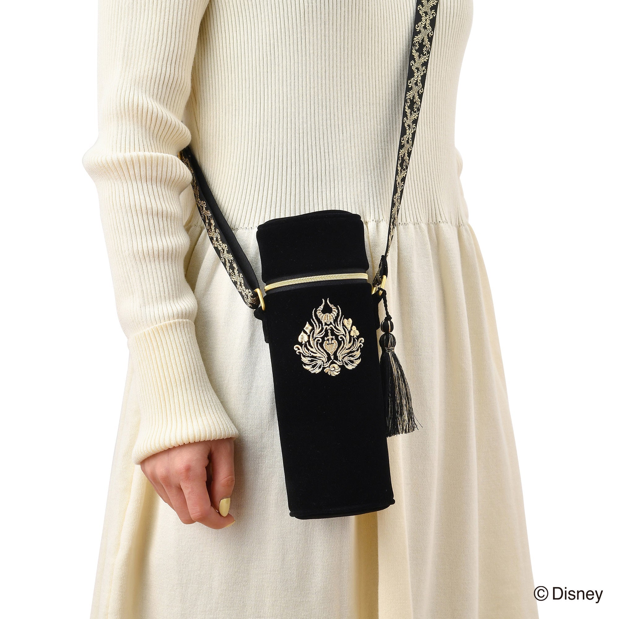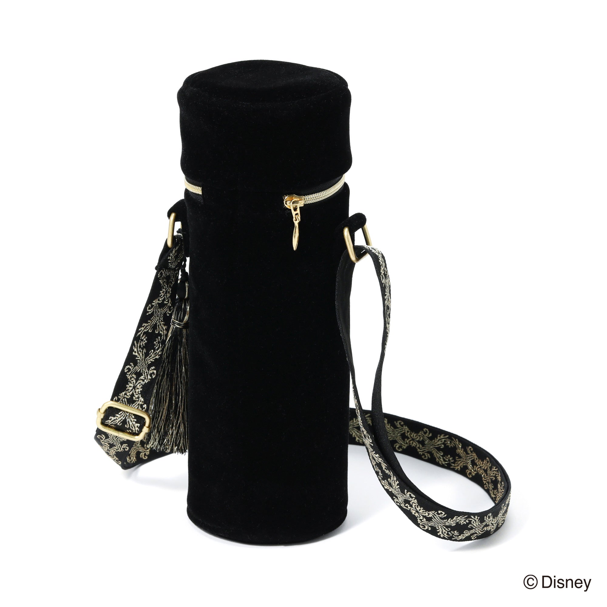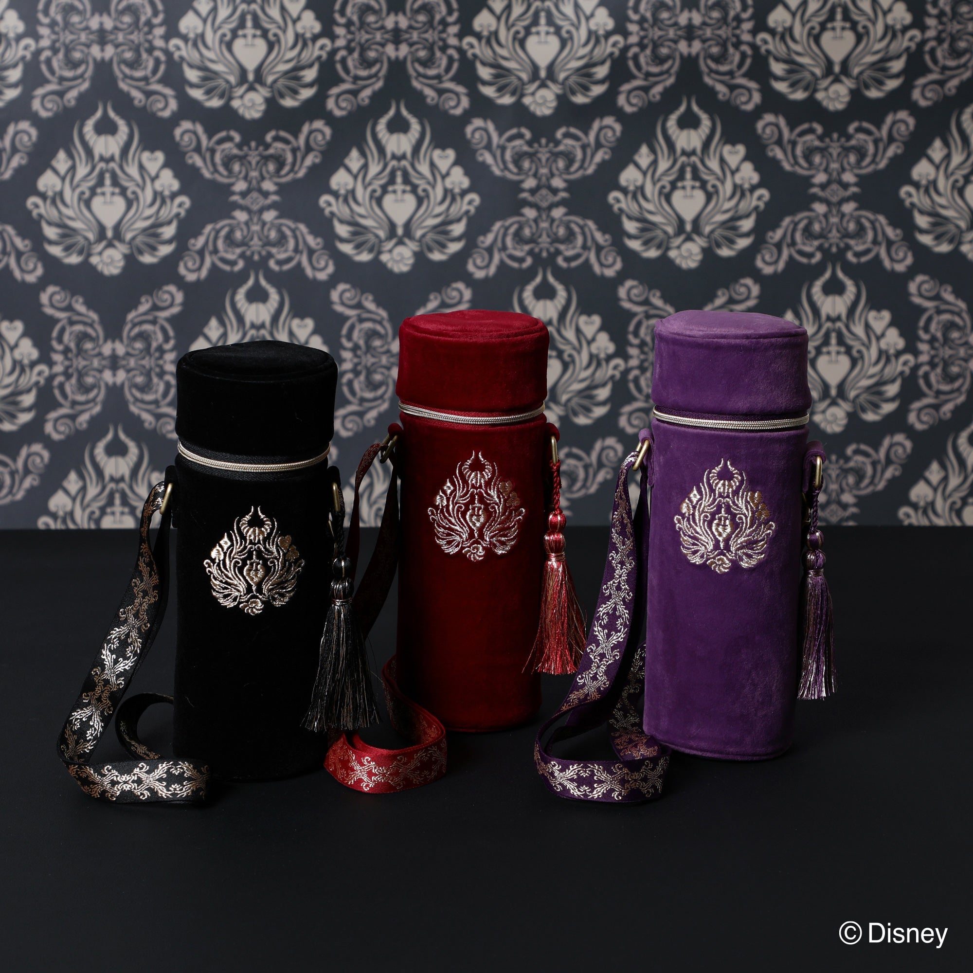 「VILLAINS NIGHT by Francfranc」のオリジナルエンブレムの刺繍を施したボトルホルダーです。随所にゴールドを散りばめた高貴で高級感のあるデザイン。オーナメント柄でゴシック風にすることで普段使いもしやすいように仕上げました。500mlのペットボトルにちょうどいいサイズ感で普段使いはもちろん、パーク内でもバッグに入らない飲み物をお洒落に持ち運べます。別売りのバッグと合わせたカラー展開でセット使いもおすすめです。