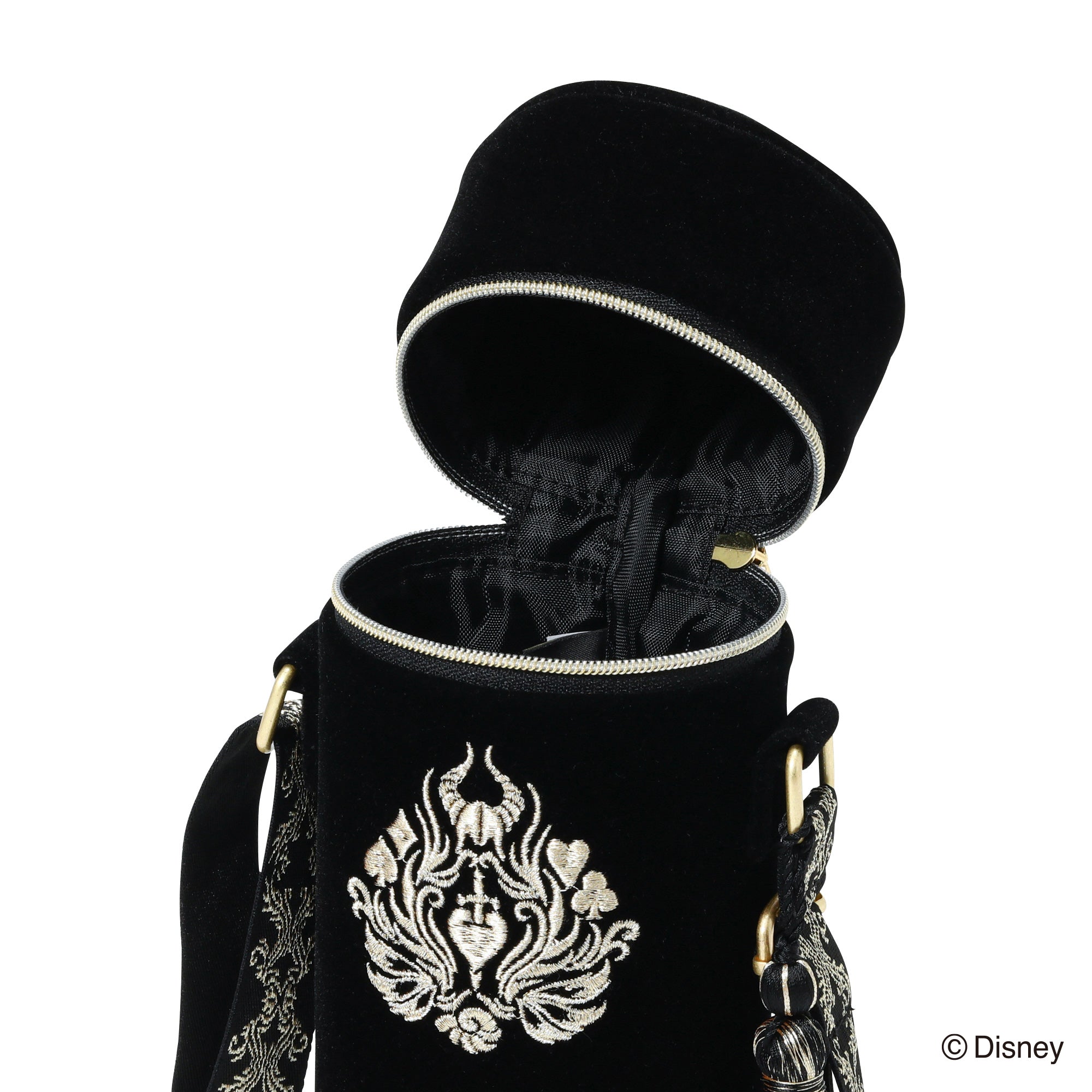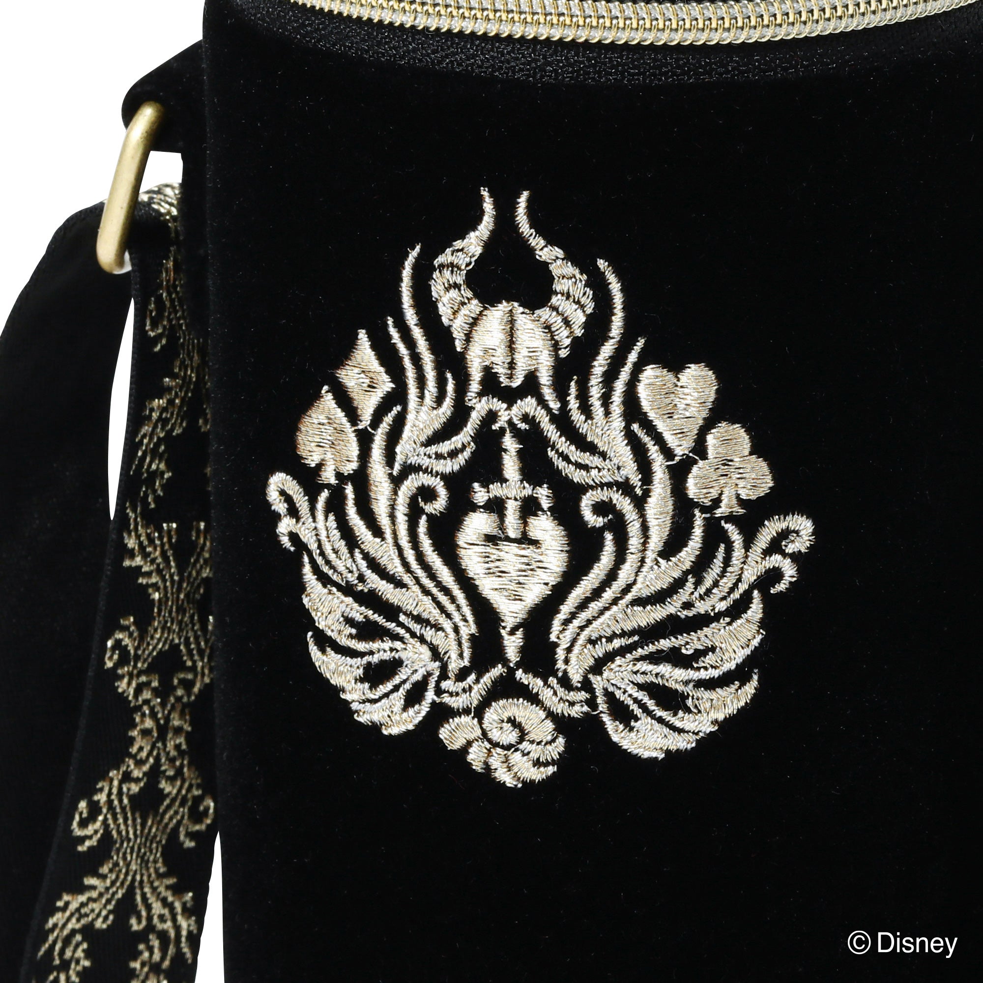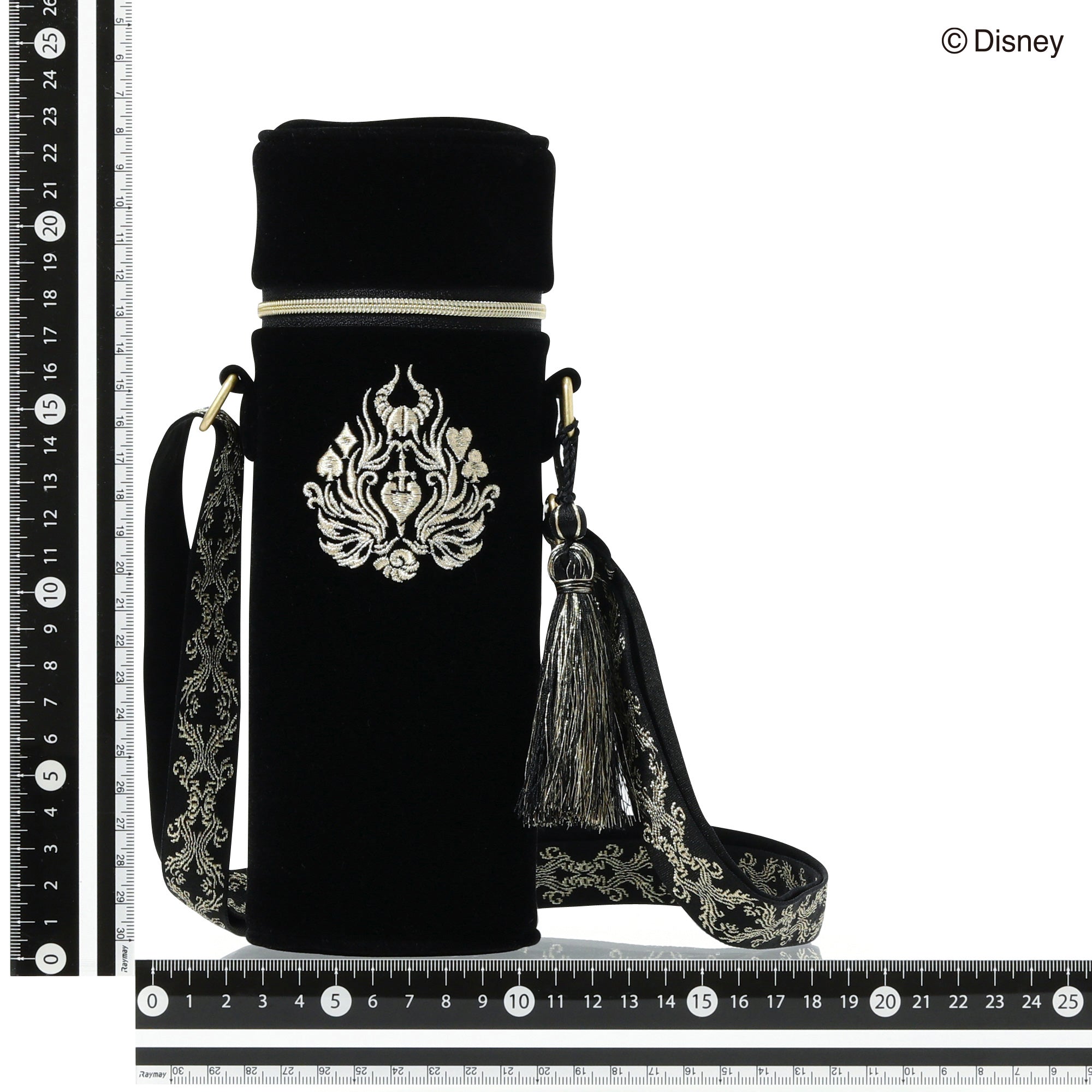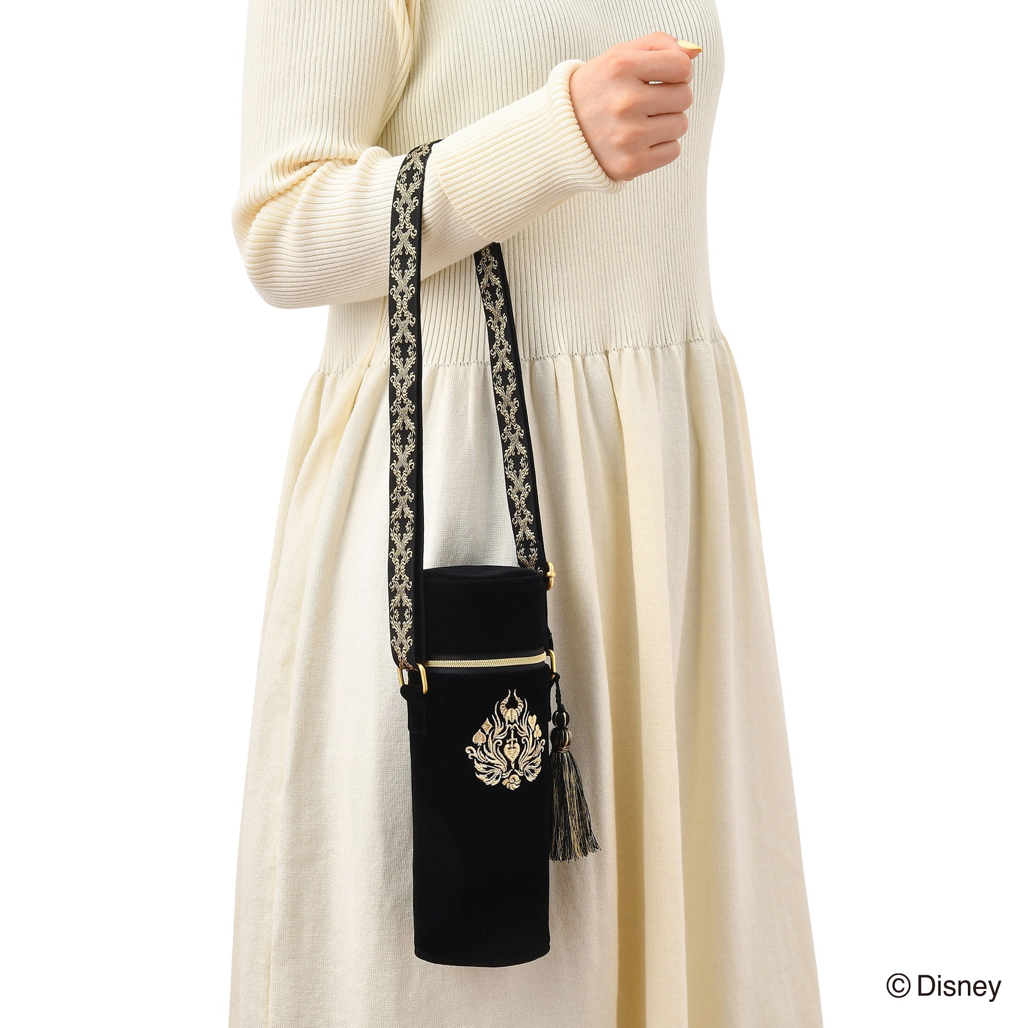 「VILLAINS NIGHT by Francfranc」のオリジナルエンブレムの刺繍を施したボトルホルダーです。随所にゴールドを散りばめた高貴で高級感のあるデザイン。オーナメント柄でゴシック風にすることで普段使いもしやすいように仕上げました。500mlのペットボトルにちょうどいいサイズ感で普段使いはもちろん、パーク内でもバッグに入らない飲み物をお洒落に持ち運べます。別売りのバッグと合わせたカラー展開でセット使いもおすすめです。