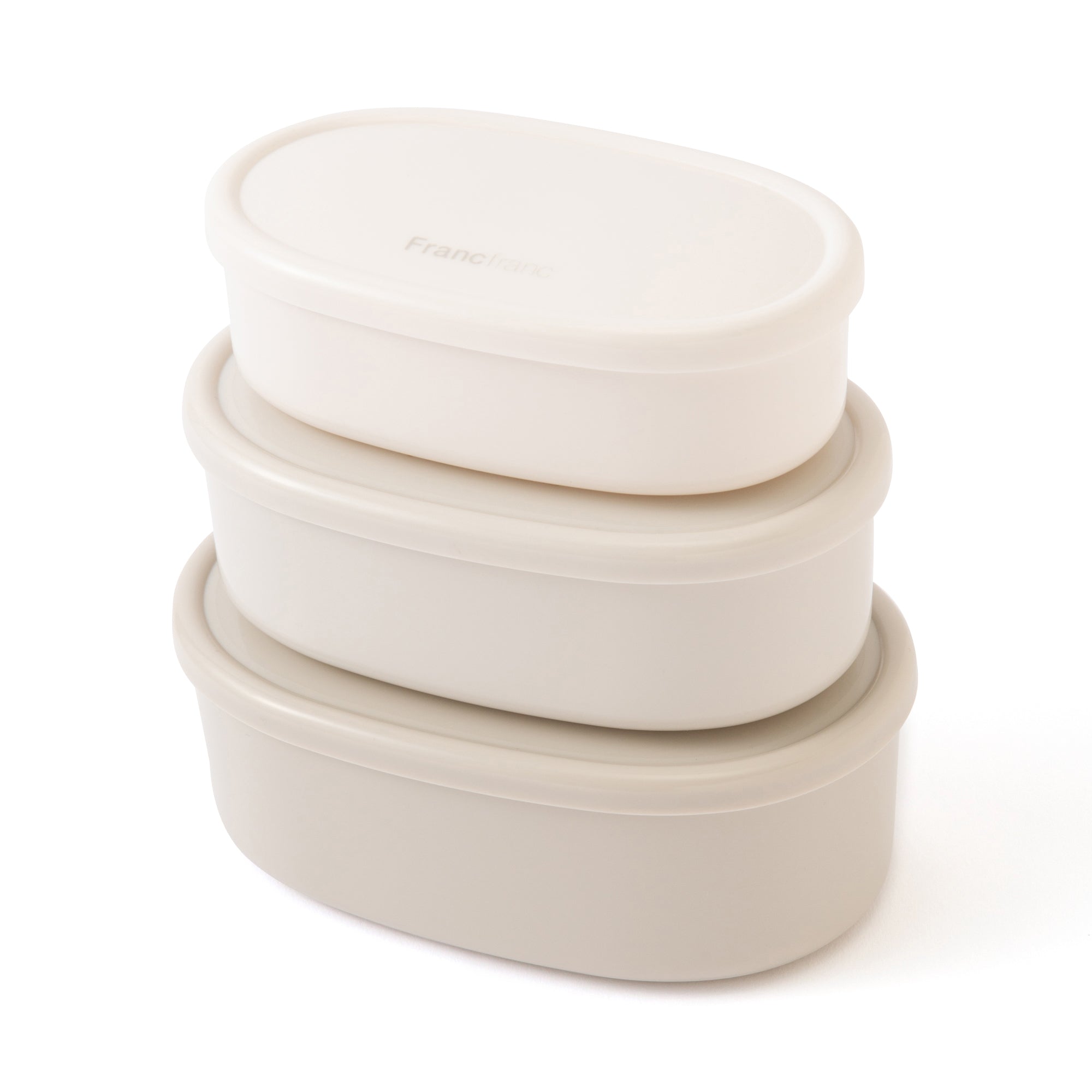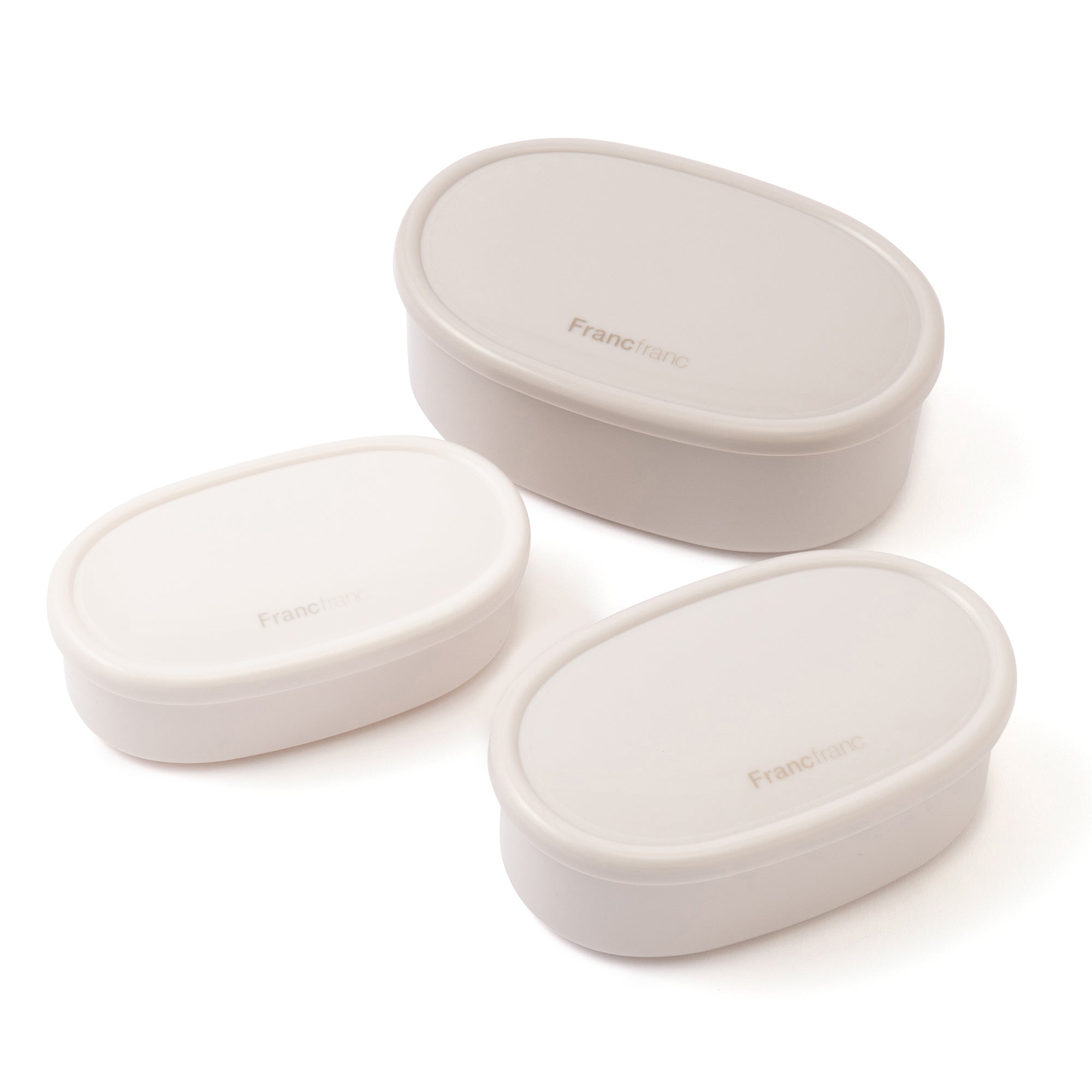 抗菌仕様のフードコンテナ3点セットです。保存容器としてはもちろん、フルーツやおかずなど少量のランチボックスとしての使用もおすすめです。サイズ違いのセットなので幅広い用途でご使用いただけます。使用しないときは1つに収納できるのも嬉しいポイントです。