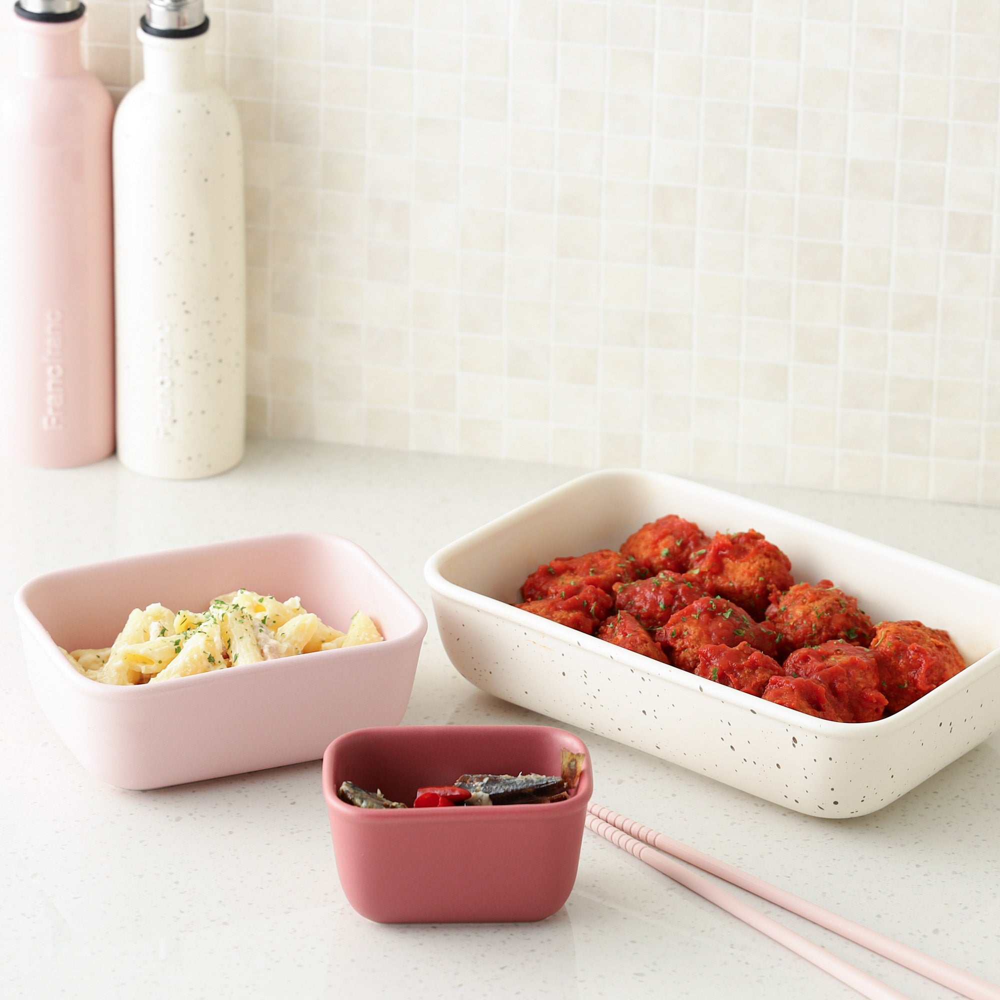 作り置きや保存に便利な、セラミック製のフードコンテナです。秋らしいカラーと陶器ならではの質感で、キッチンをワンランクアップしてくれます。3サイズ展開で組み合わせてスタッキングも可能。冷蔵庫の中もすっきり整頓できます。シリコン製のフタには空気穴がついているため、フタをしたまま電子レンジで温めが可能。おしゃれなデザインなので、そのまま食卓に出しても様になります。機能性とデザイン性を兼ね備え、毎日の食卓をちょっと楽しくしてくれるアイテムです。