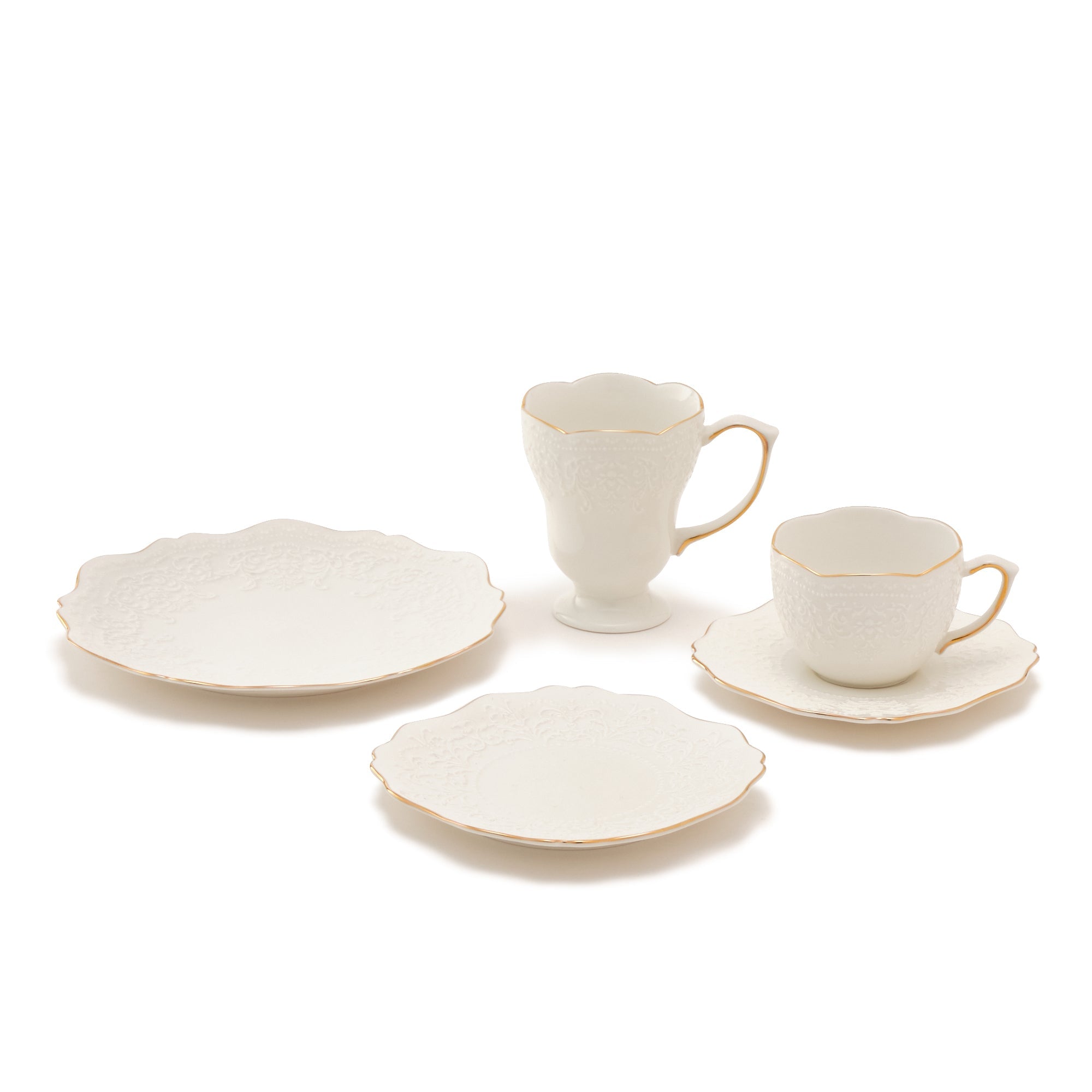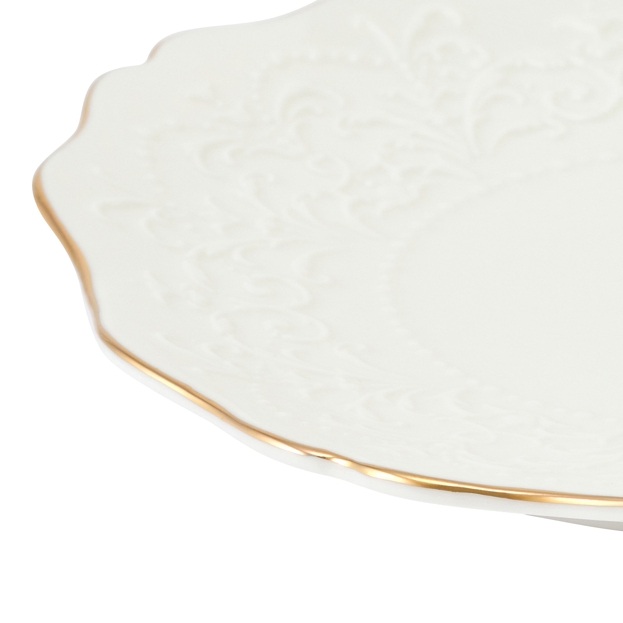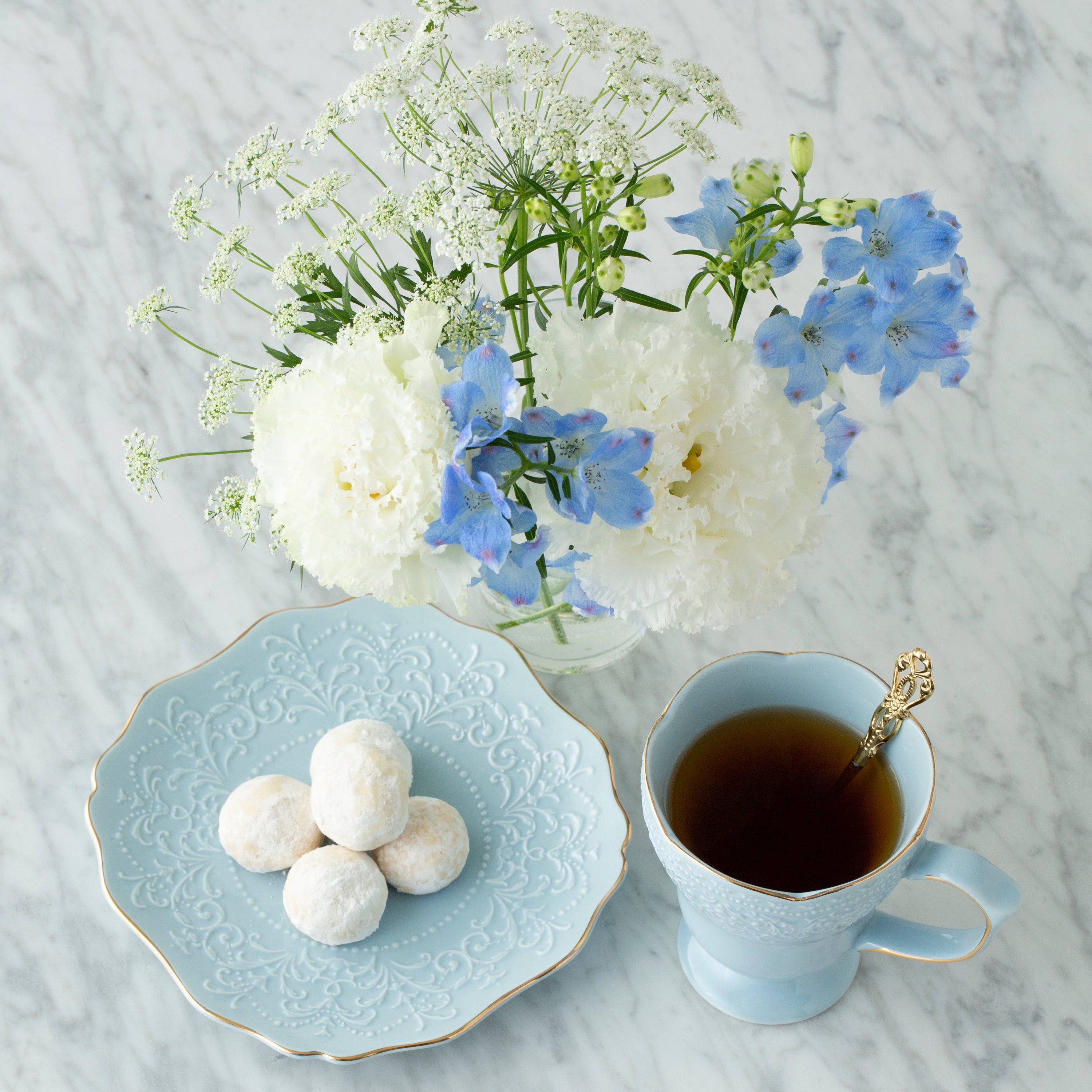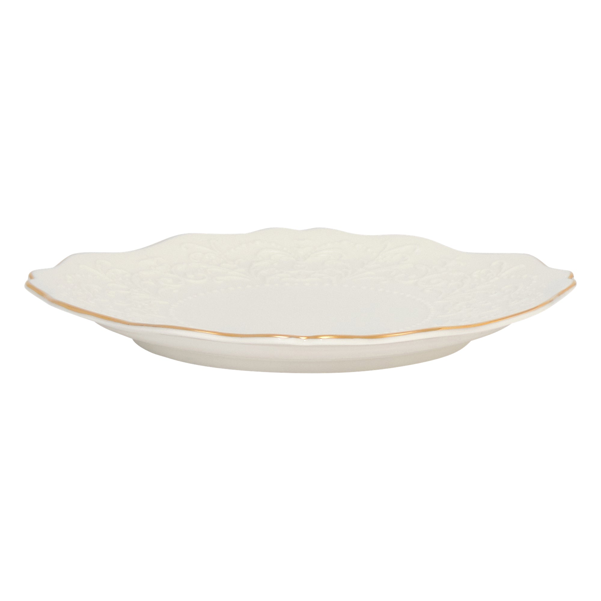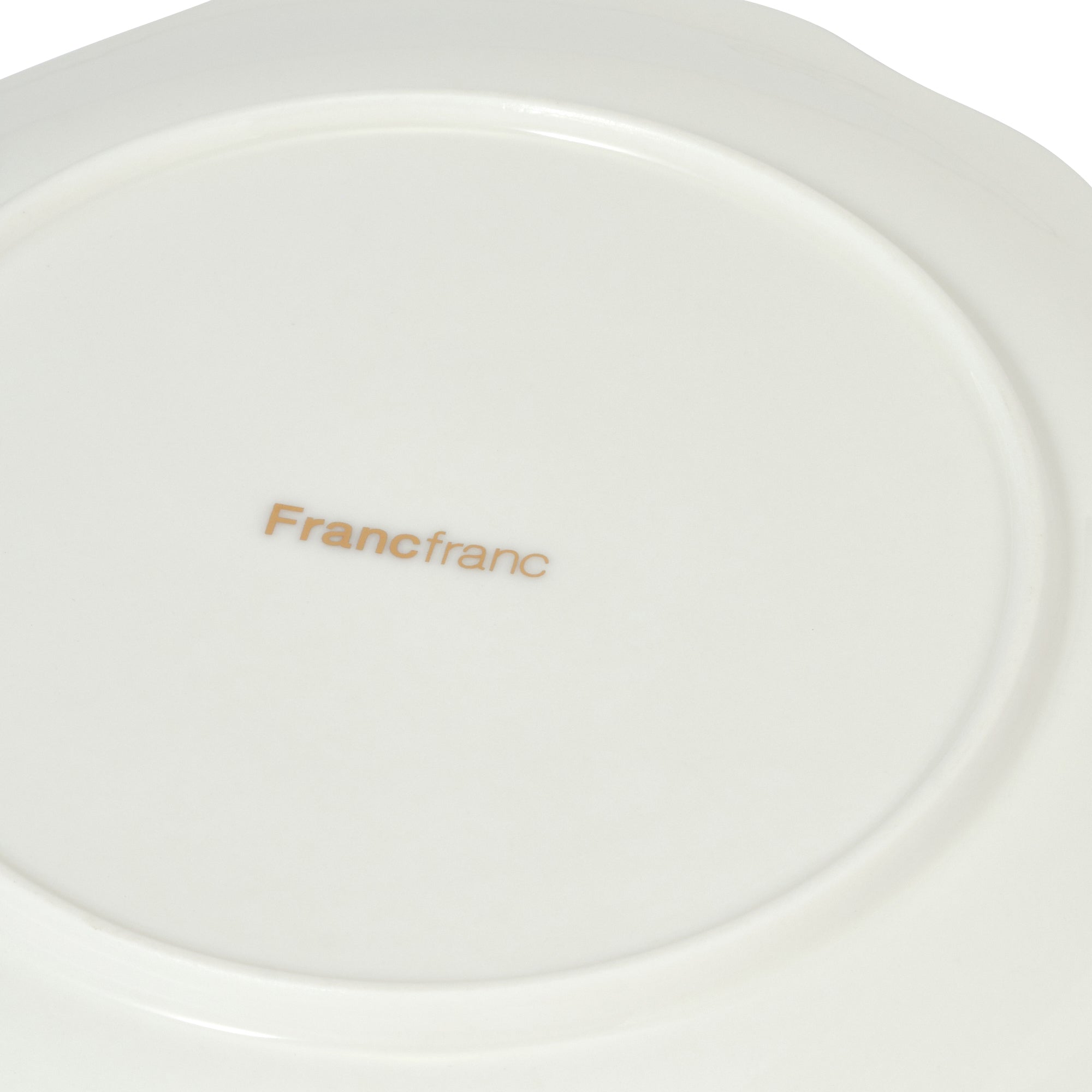 ウェディングベールをイメージしたレリーフ状のアラベスク柄とゴールドリムが繊細かつ上品なプレートです。淡くやさしいホワイトとブルーの色展開で、組み合わせてのブライダルギフトにぴったりです。