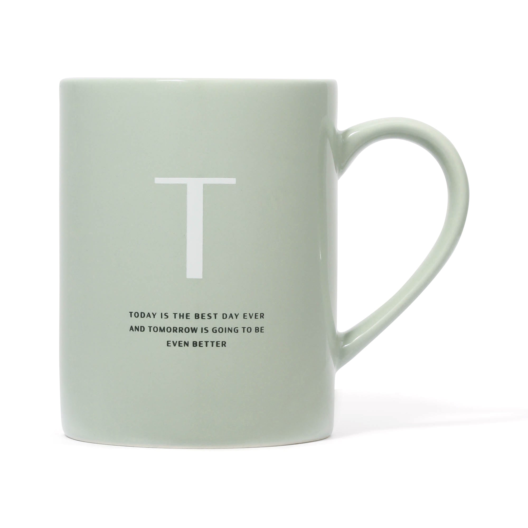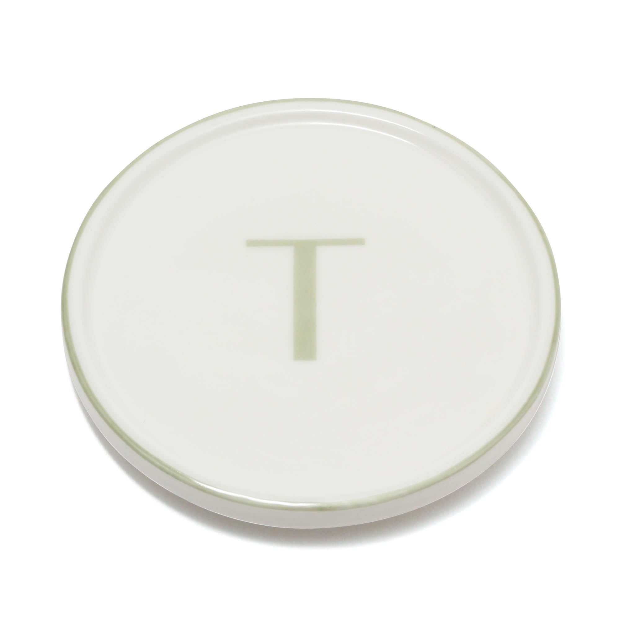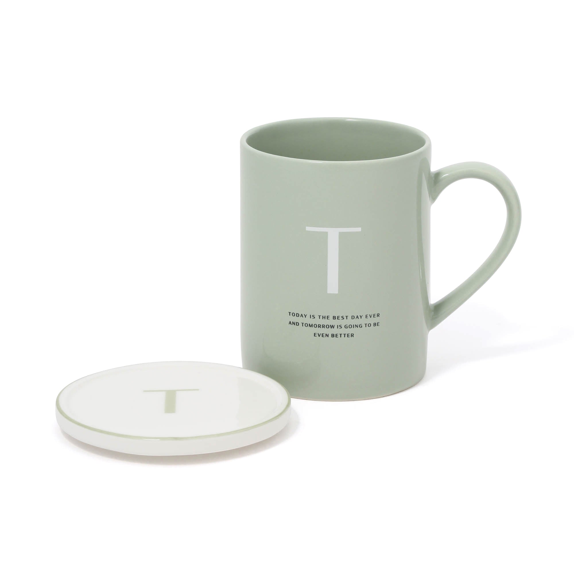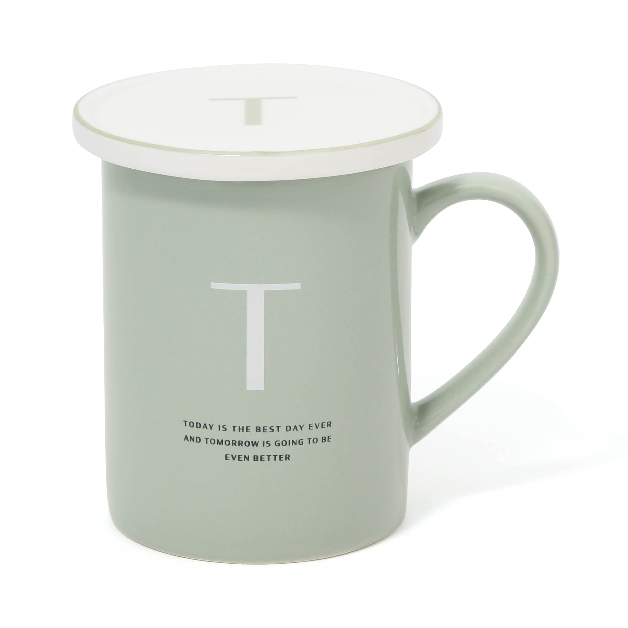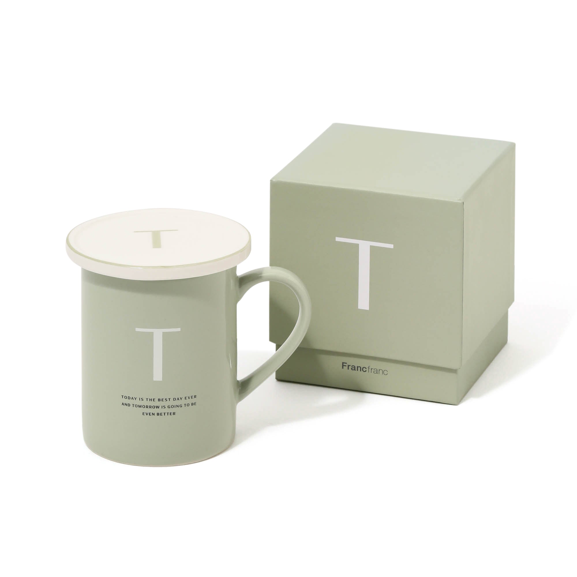 フタ付きのイニシャルマグです。付属のフタはティーパックを乗せたり、裏返してコースターとしても使用していただけます。おそろいのティースプーンとギフトで贈るのもおすすめです。