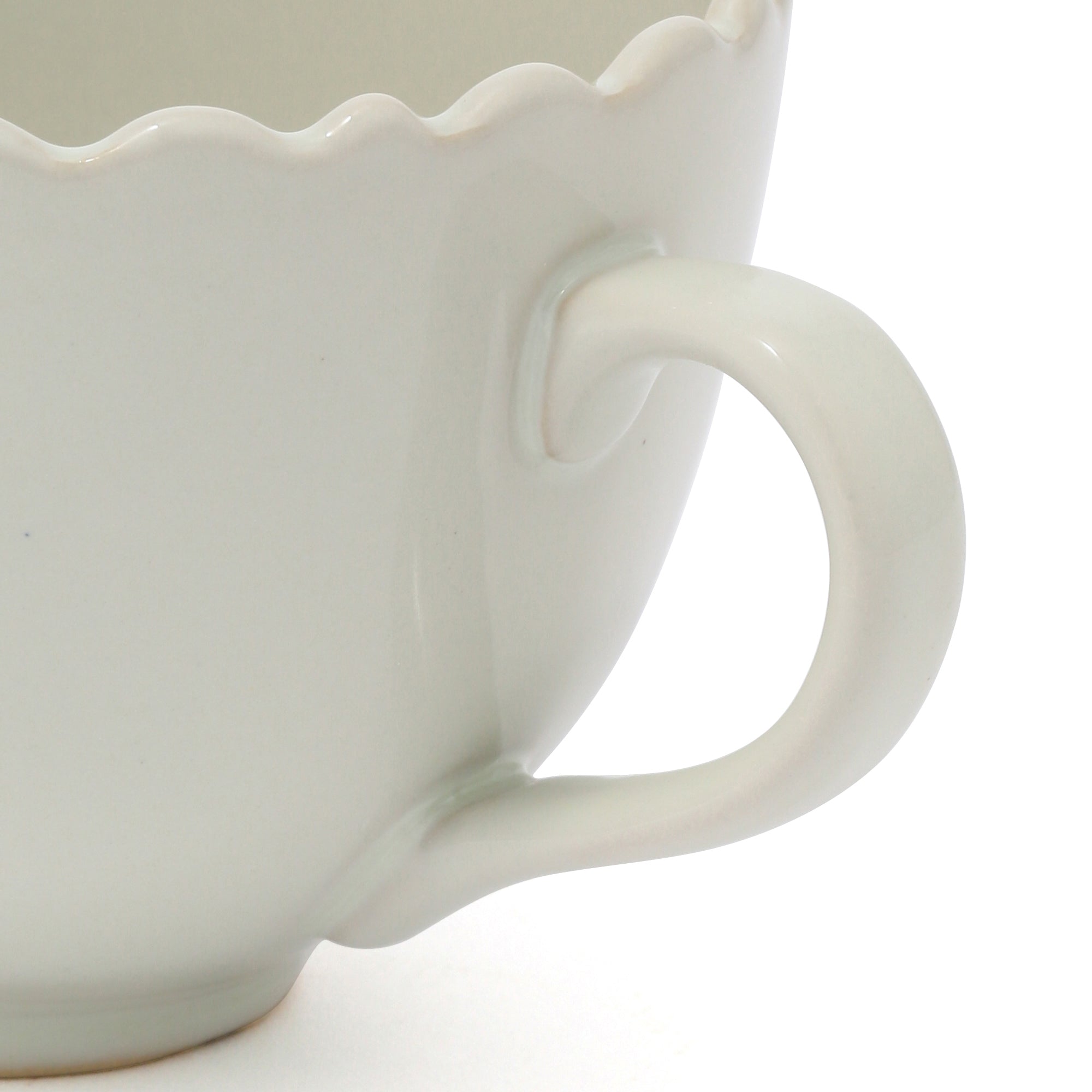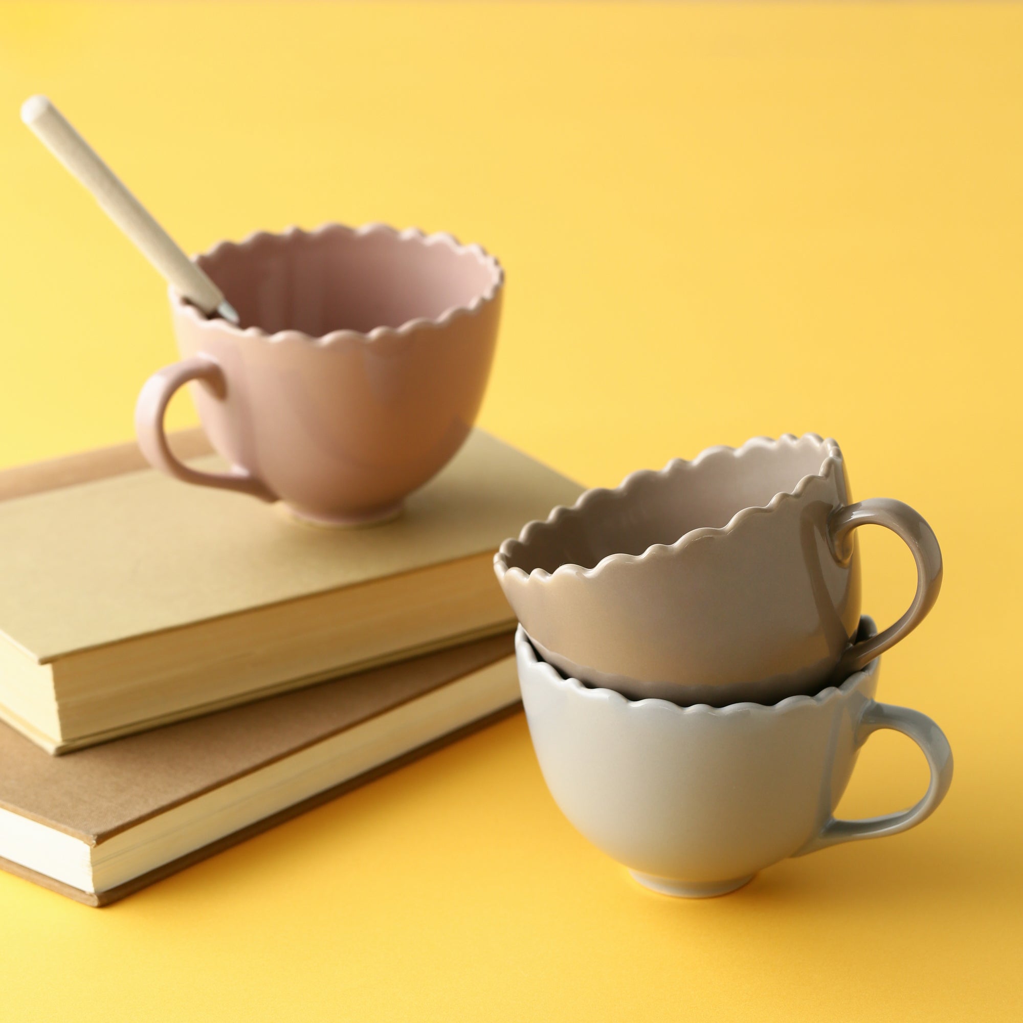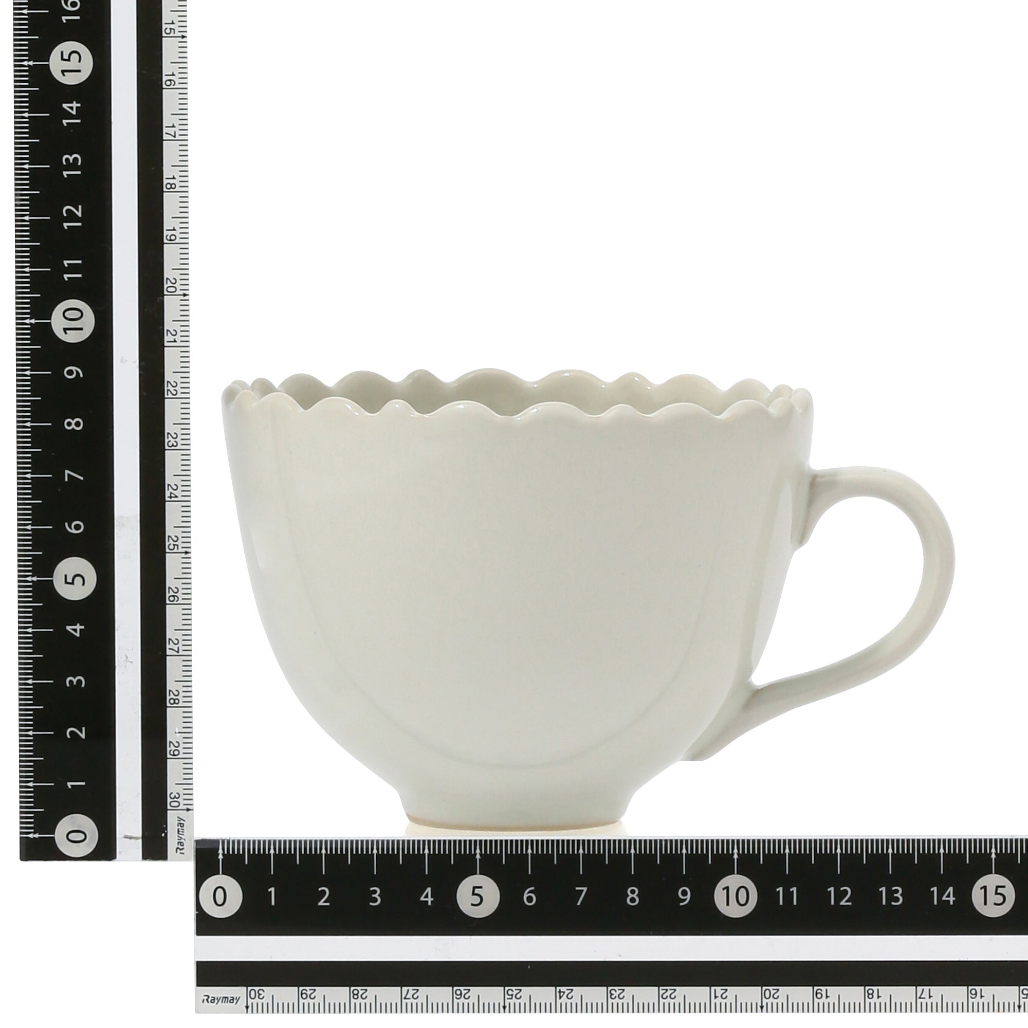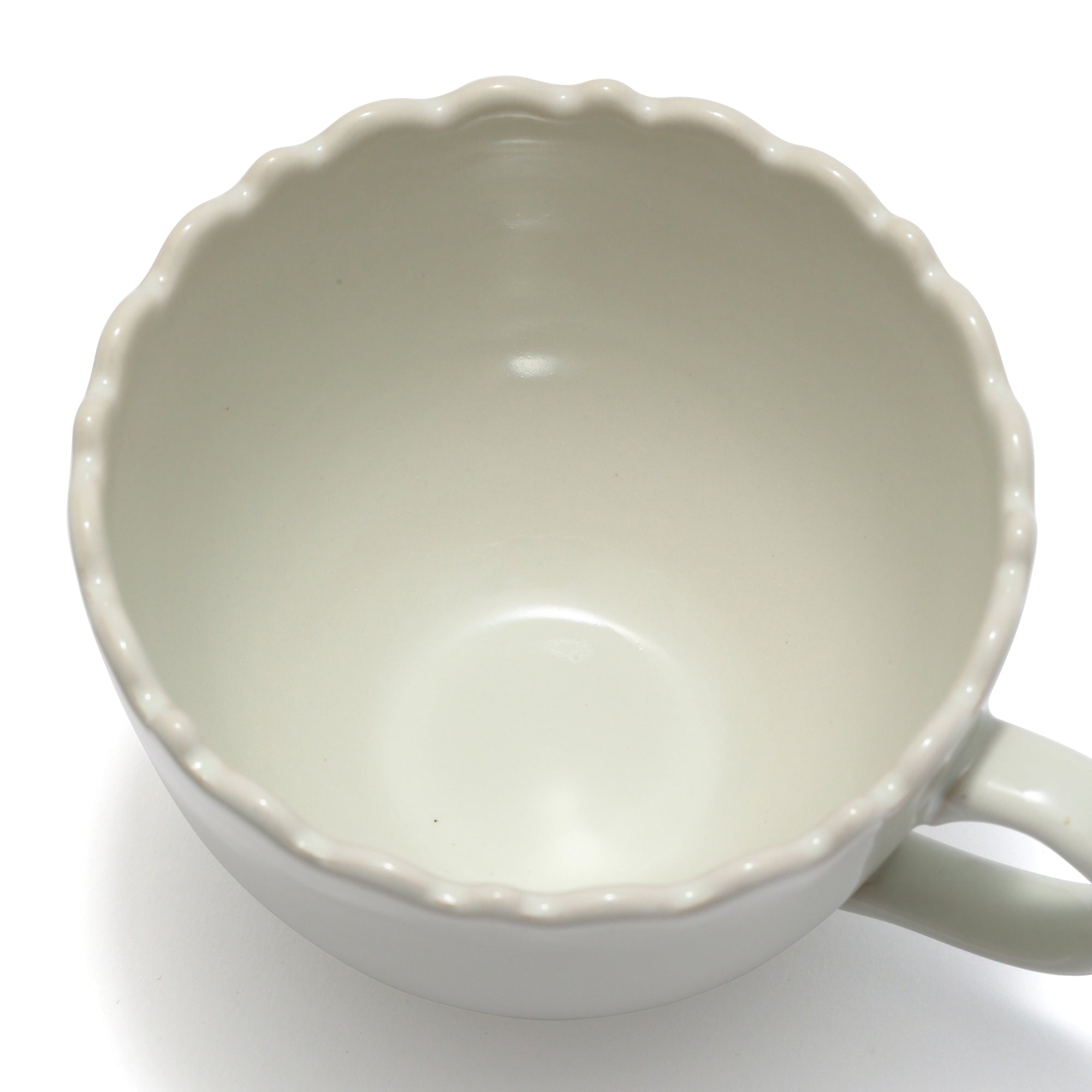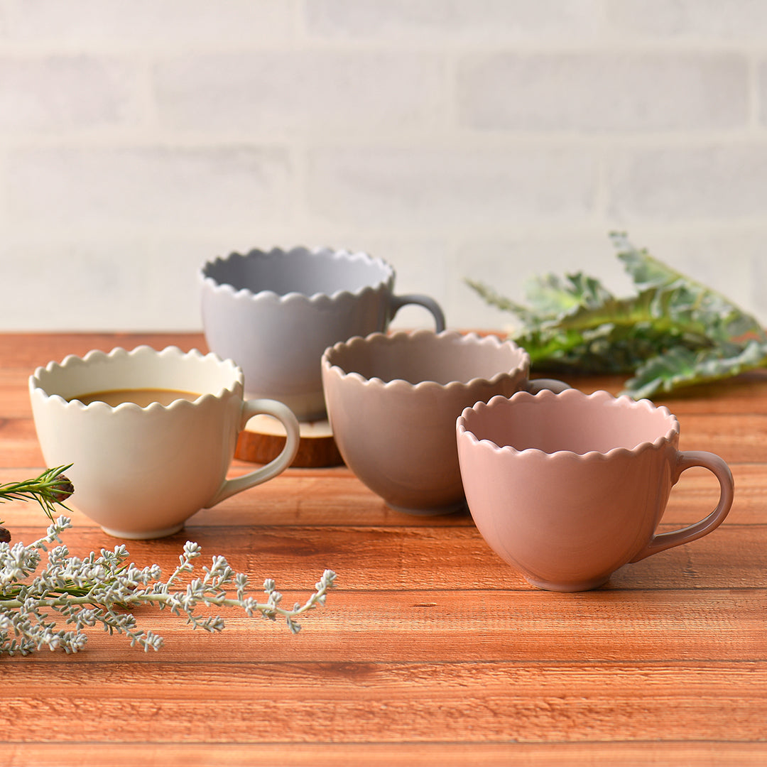 フリル型のリムが可愛らしいスープカップです。シンプルなので、色違いや柄物ともコーディネートしやすいデザイン。スープだけでなく、サラダやデザート、シリアルなどを入れてミニボウルとしてもお使いいただける便利なアイテムです。カップの底部分が小さめなので、ワンプレート皿にのせやすく、プラスするとリッチな一皿に。カップを使わないときは、カトラリーやスティックシュガーを入れてもよく、一口サイズのお菓子を入れると、可愛らしいテーブルに。色違いのカップとあわせて使用すると、カラフルで華やかに。お客様へのカジュアルなおもてなしにもおすすめです。お気に入りのカップで楽しいひと時をお過ごしください。