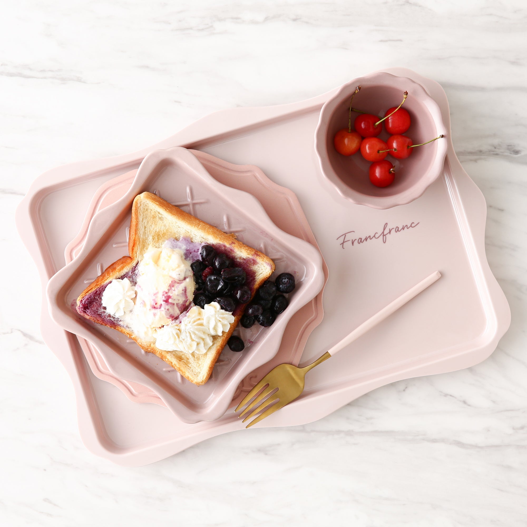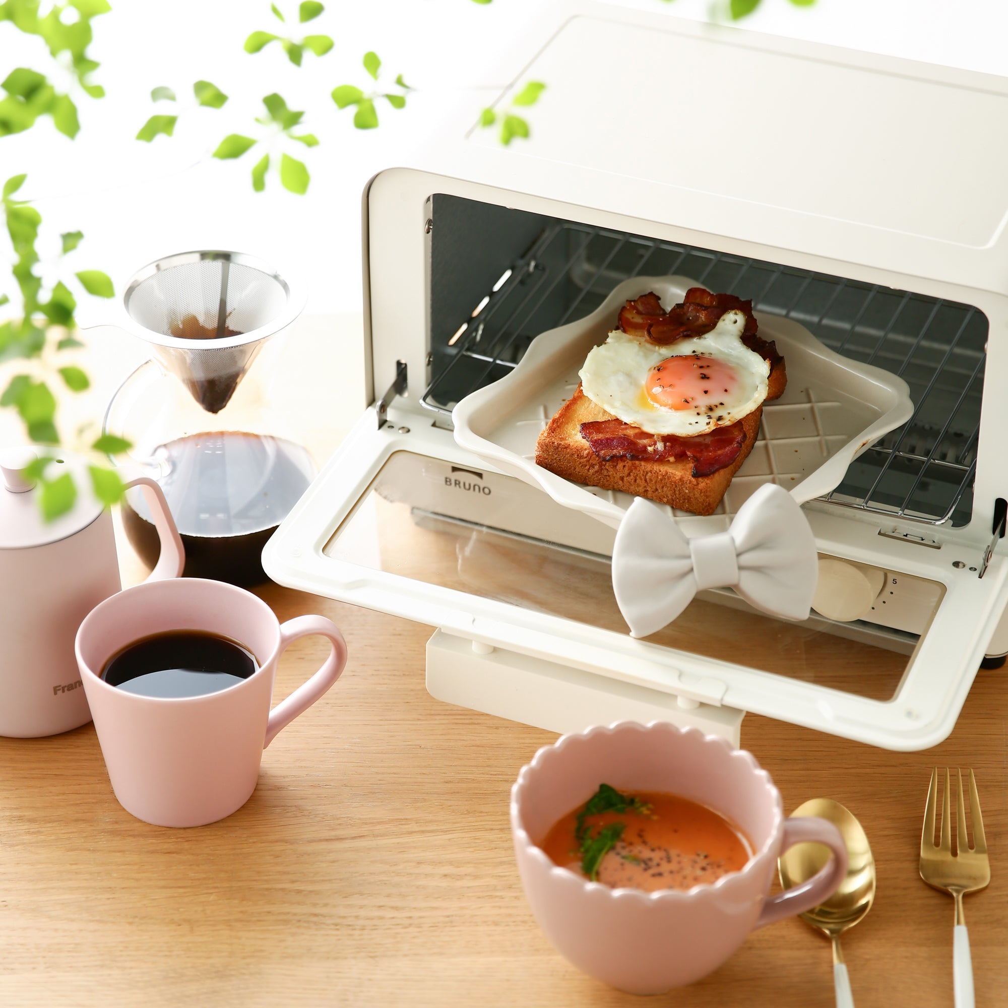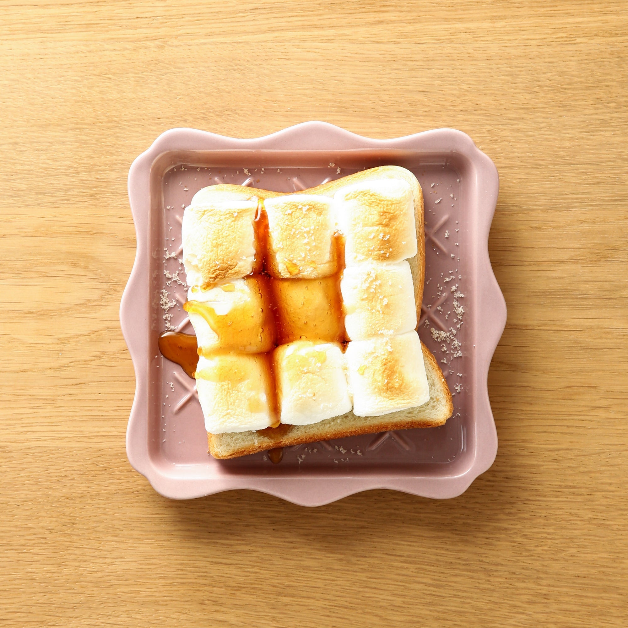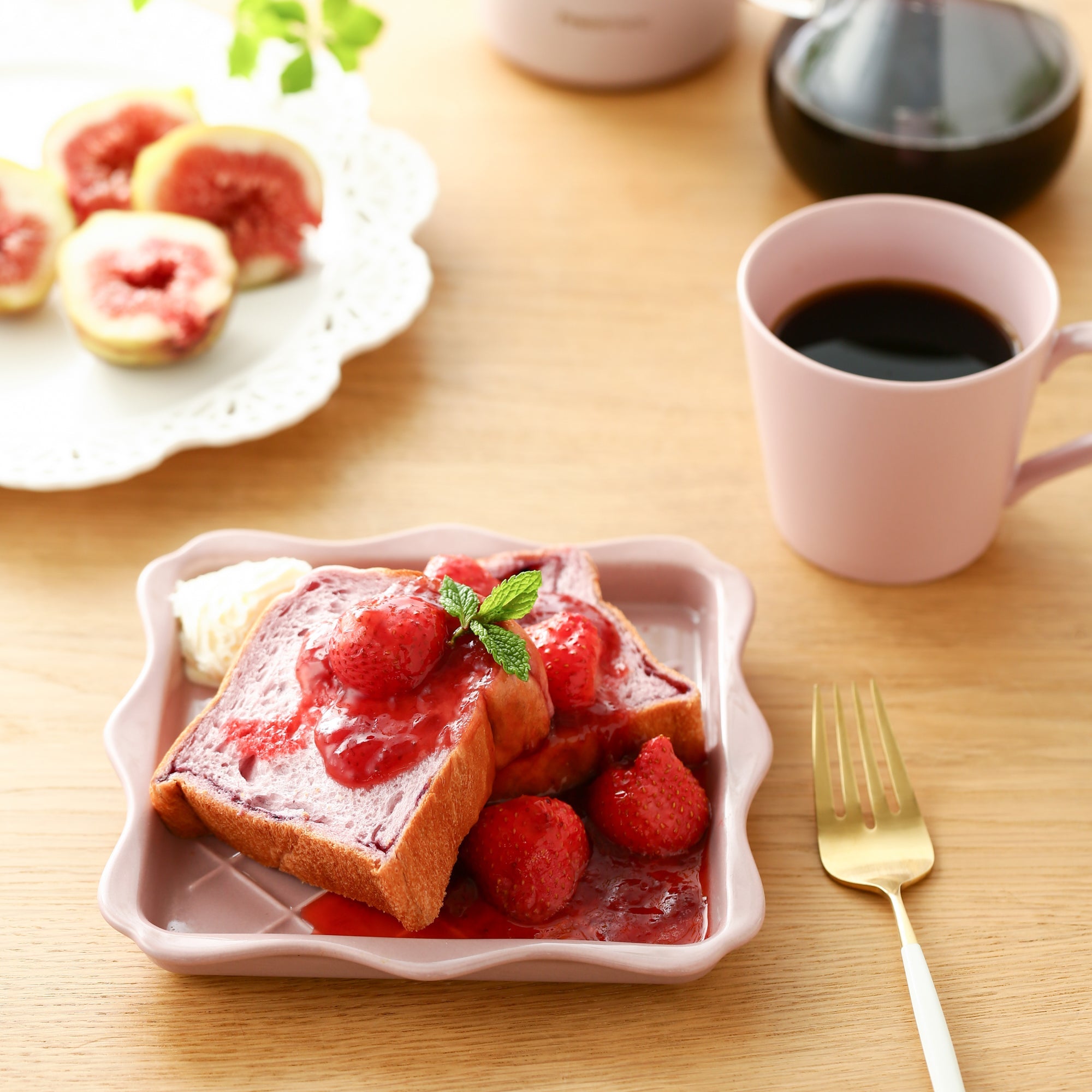 くすみカラーとフリルの形状がかわいい、ちょうど食パンが一枚のる大きさのプレートです。凹凸の模様のおかげで、焼けたトーストの底が、お皿にぴったりとつかないので水蒸気がパンに触れにくく、サクサクの食感そのまま美味しく食べることができます。凹凸を活かして天ぷらなどの、サクサクと食べたい料理をのせるのもおすすめです。オーブン使用可能なので、具沢山トーストをプレート上で作成し、そのまま焼くこともできます。こぼれたチーズなどもエンボスのおかげではがれやすく、洗い物もラクラクです。