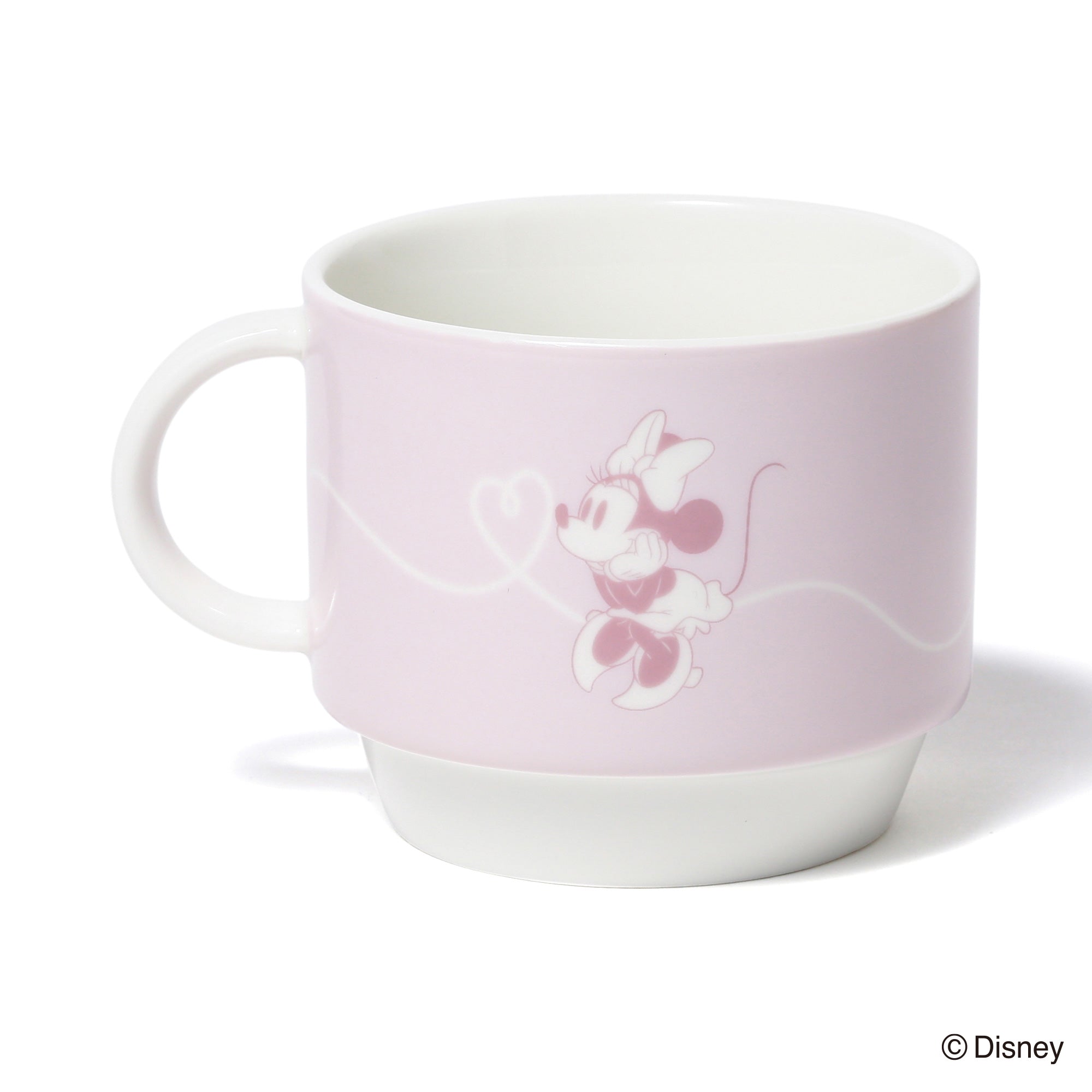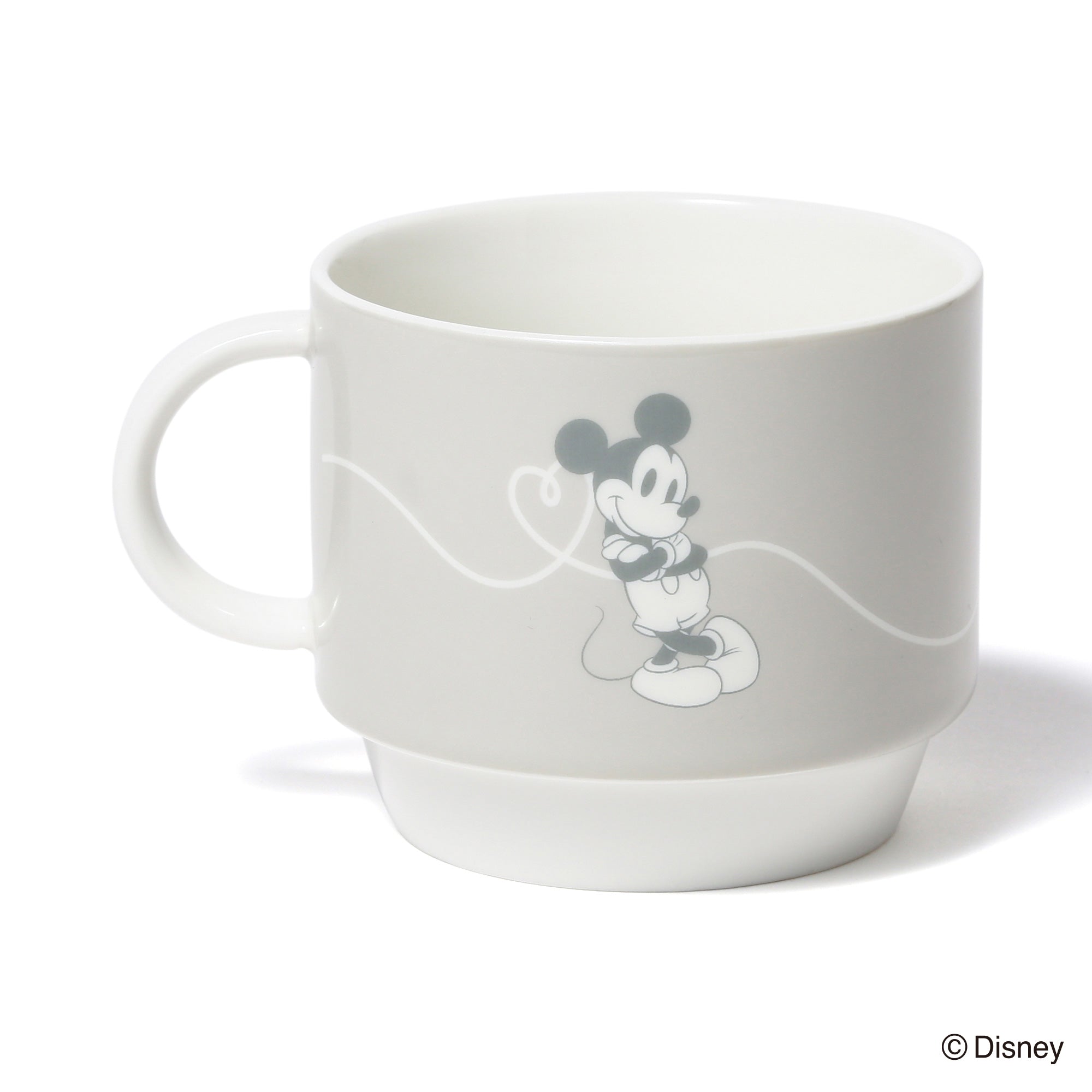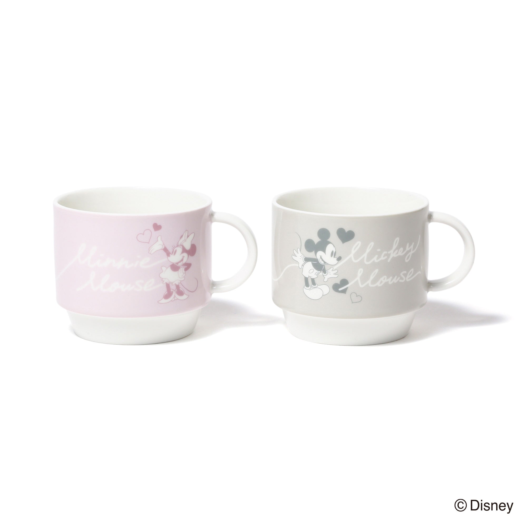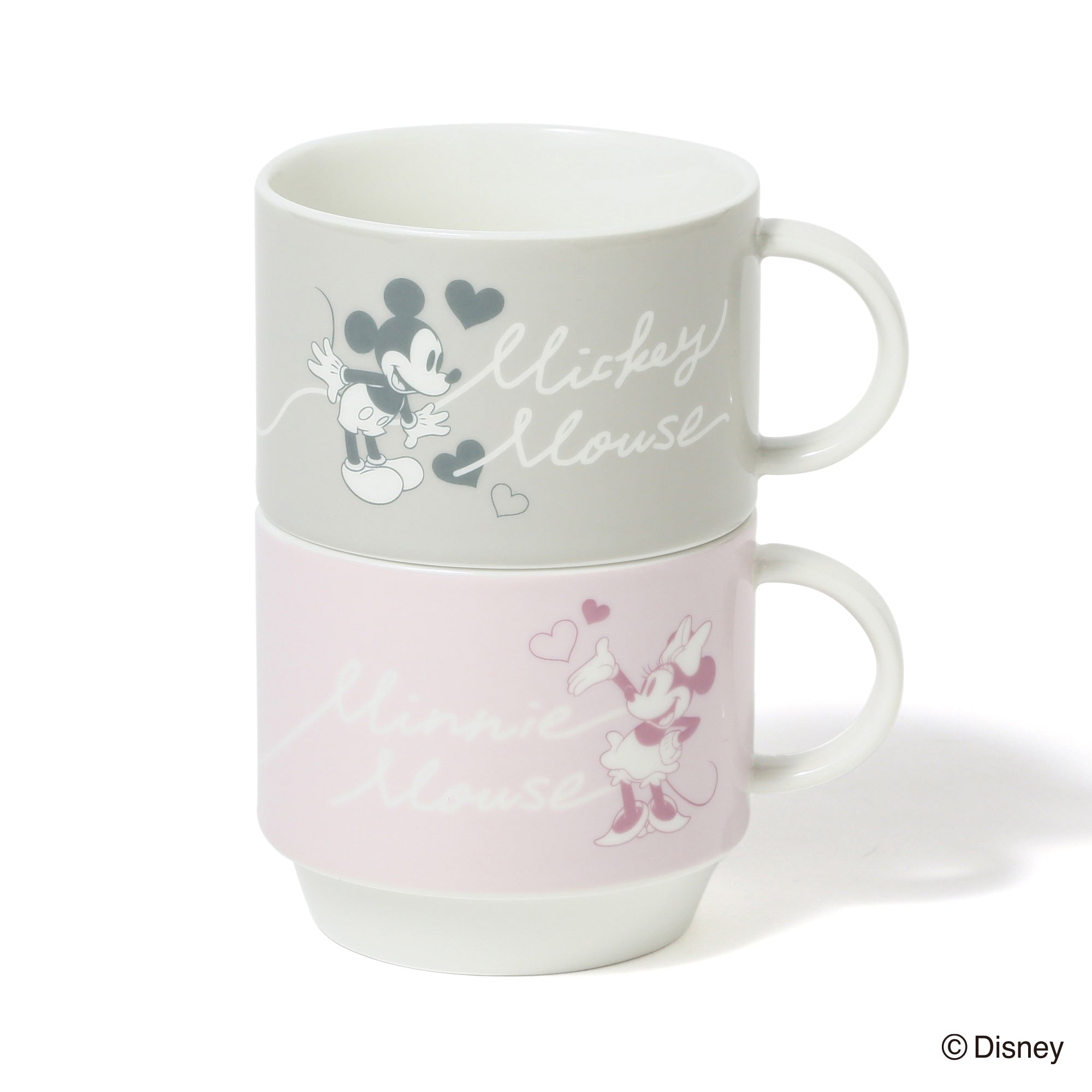 ミッキーマウスとミニーマウスをモチーフにしたかわいらしいデザインのスタッキングマグです。小ぶりで重ねて収納できるので場所を取らず、普段使いにぴったりです。マグカップをふたつ重ねるとハートが飛び交うデザインが現れるのがキュート。持ち手も丸く、かわいらしい印象に仕上げました。